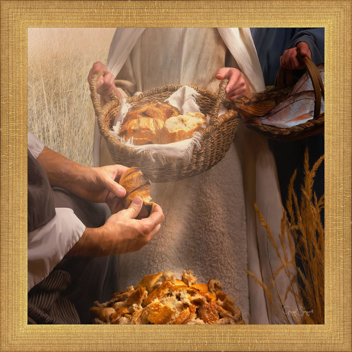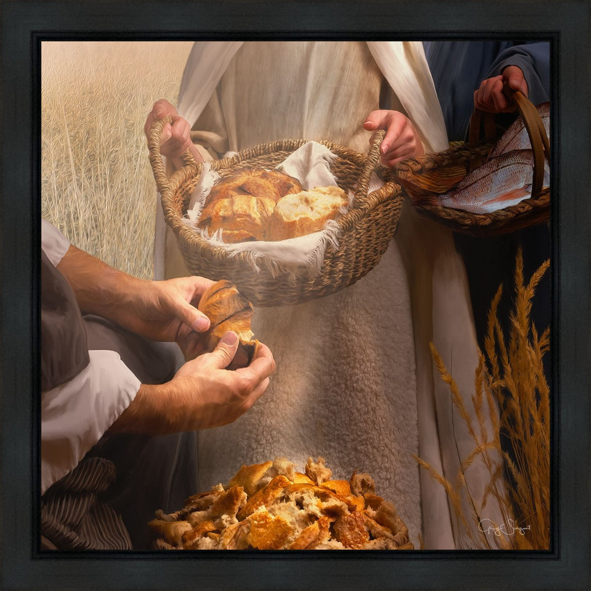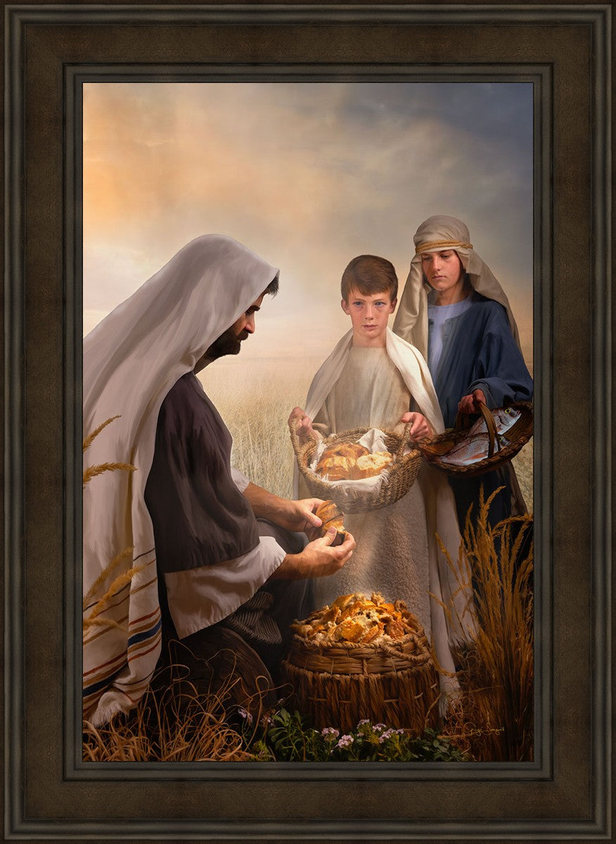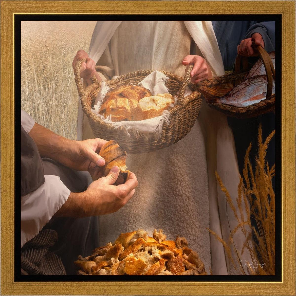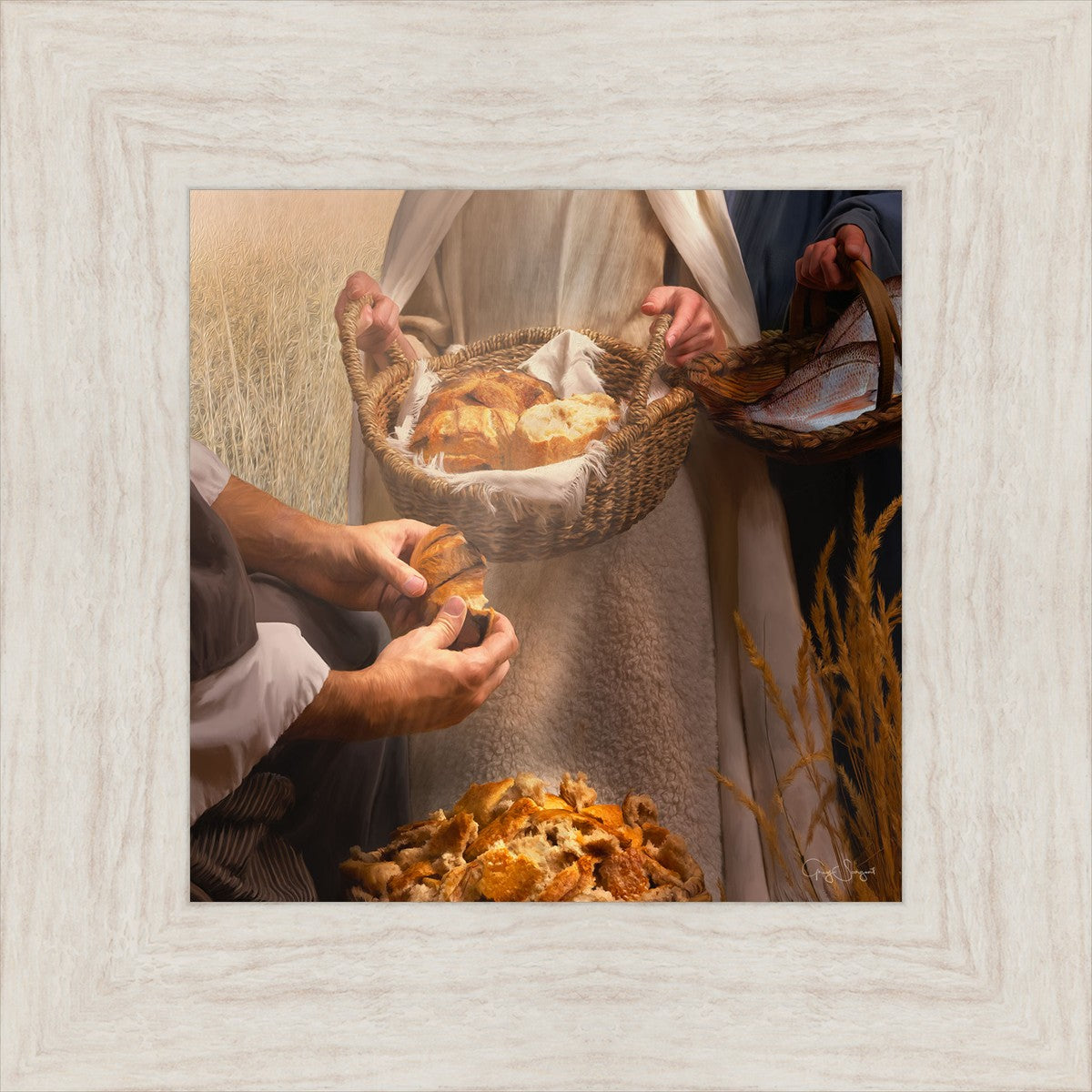 Miracle by the Sea by Greg Sargent features Jesus Christ performing the miracle of turning five loaves and two fish into food for the multitude as two young men gather it all in baskets
