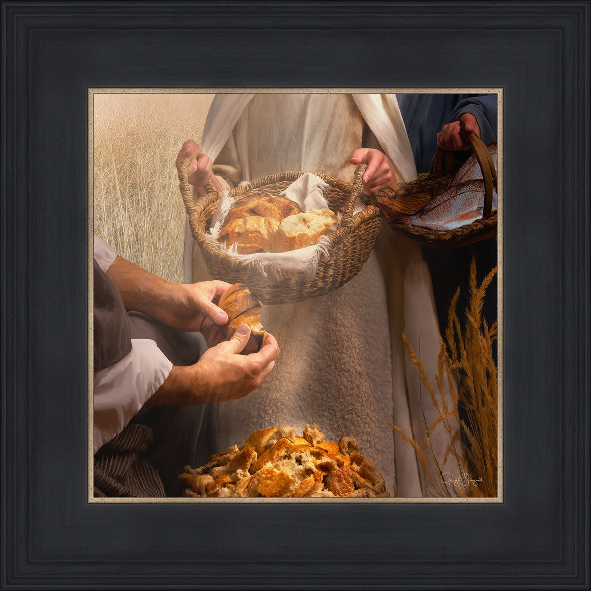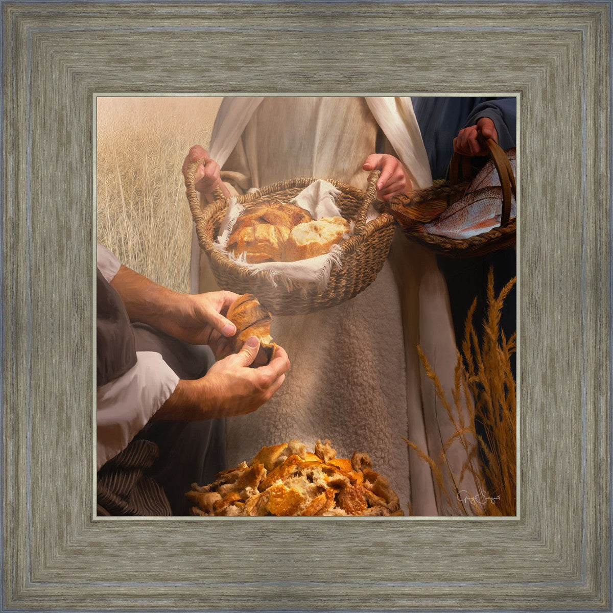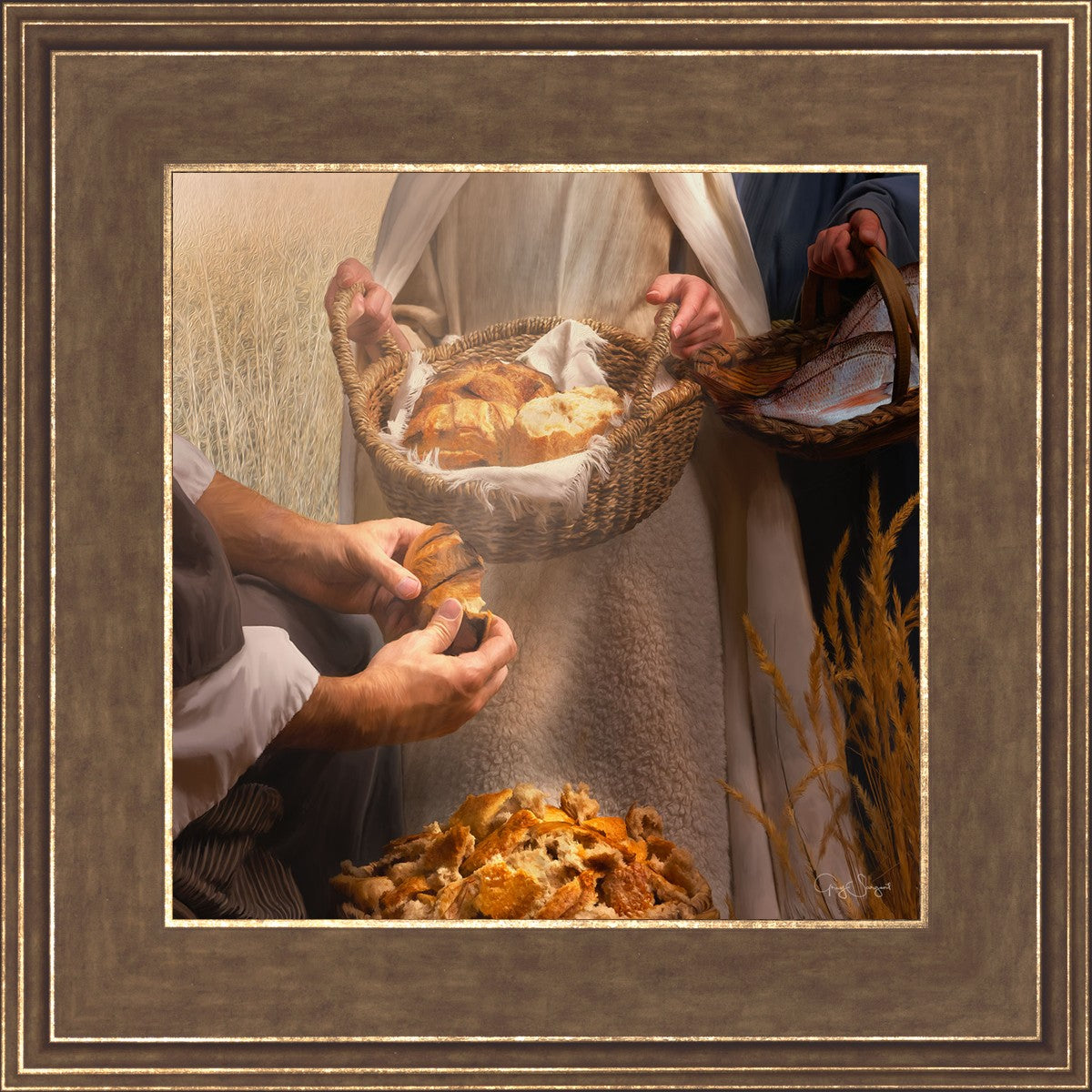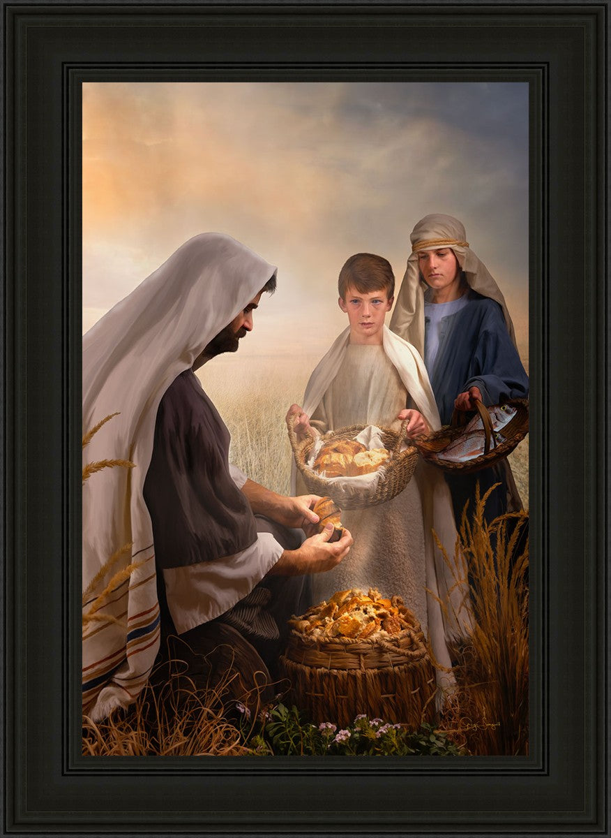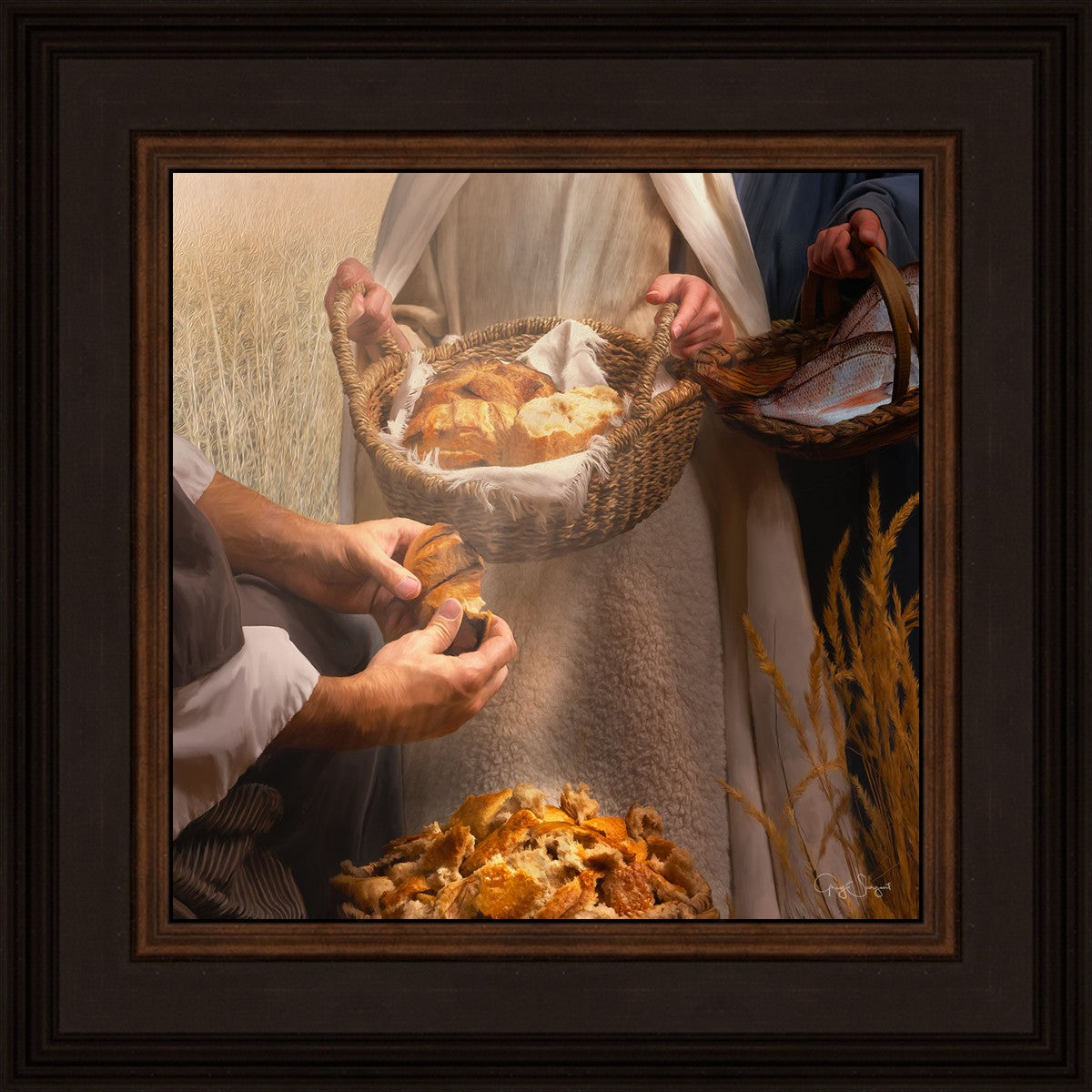Miracle by the Sea by Greg Sargent features Jesus Christ performing the miracle of turning five loaves and two fish into food for the multitude as two young men gather it all in baskets