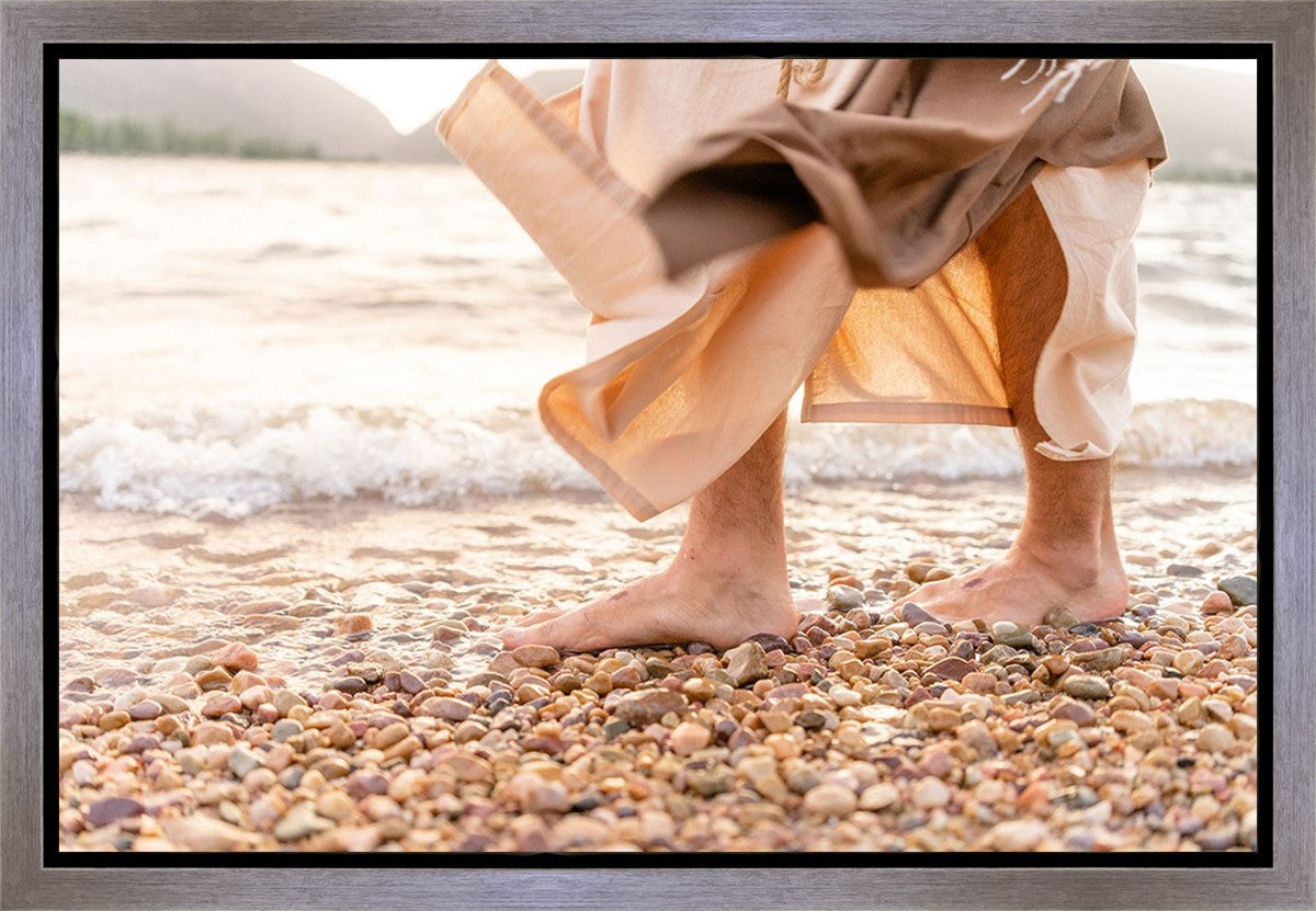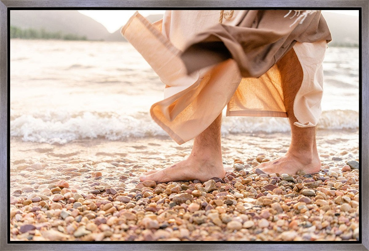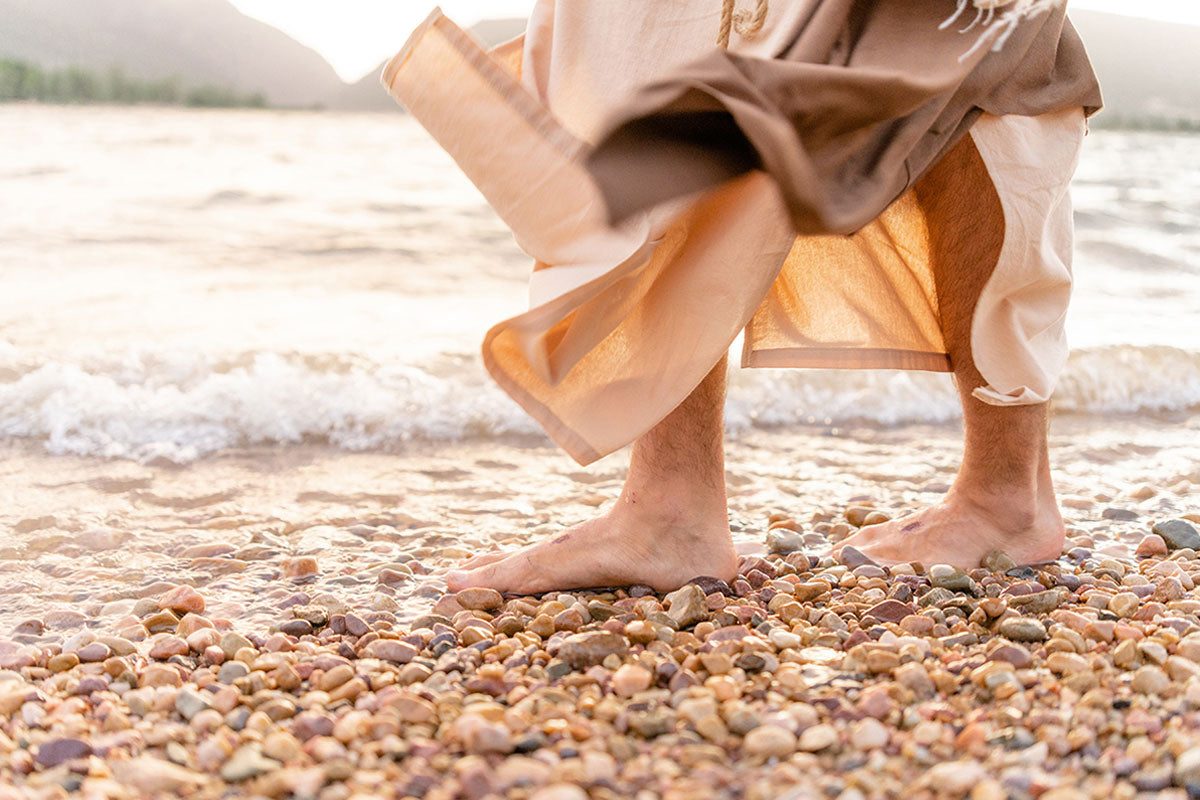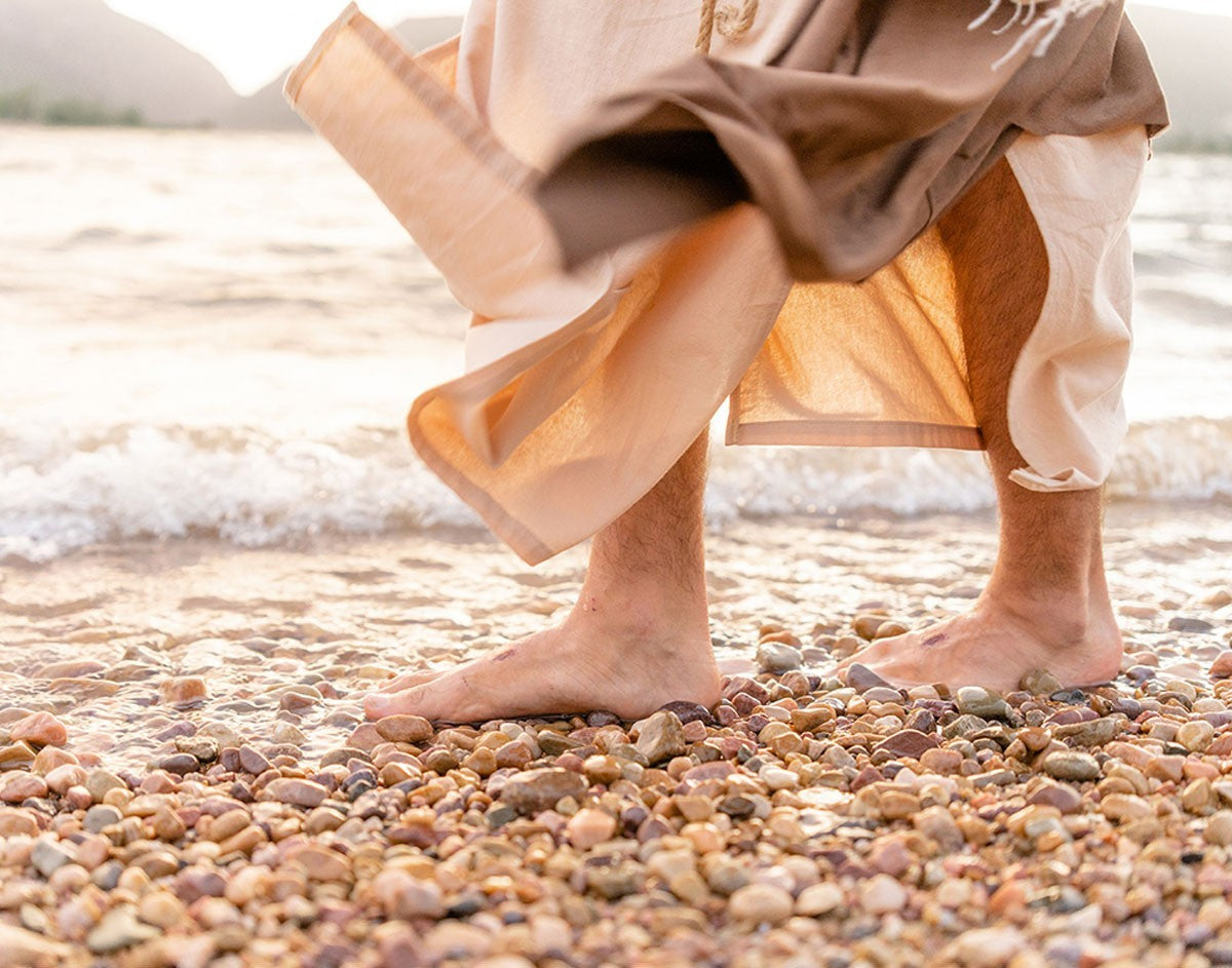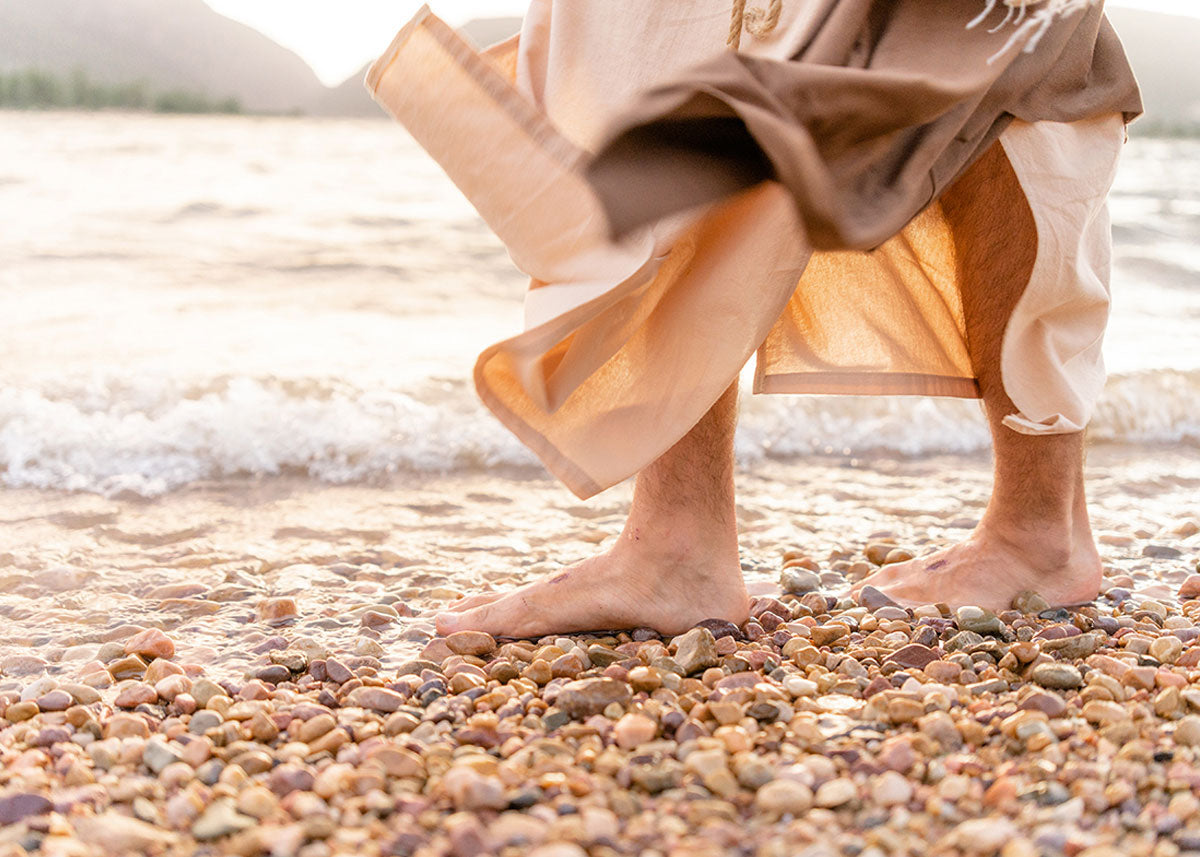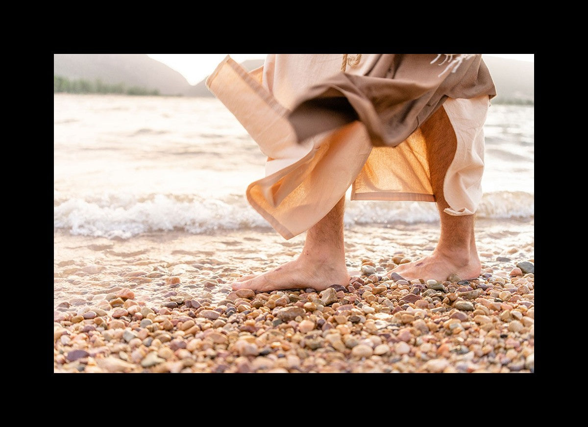 A photograph of a resurrected Jesus Christ walking along the shores of the Galilee Sea.