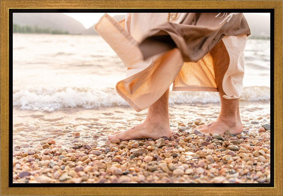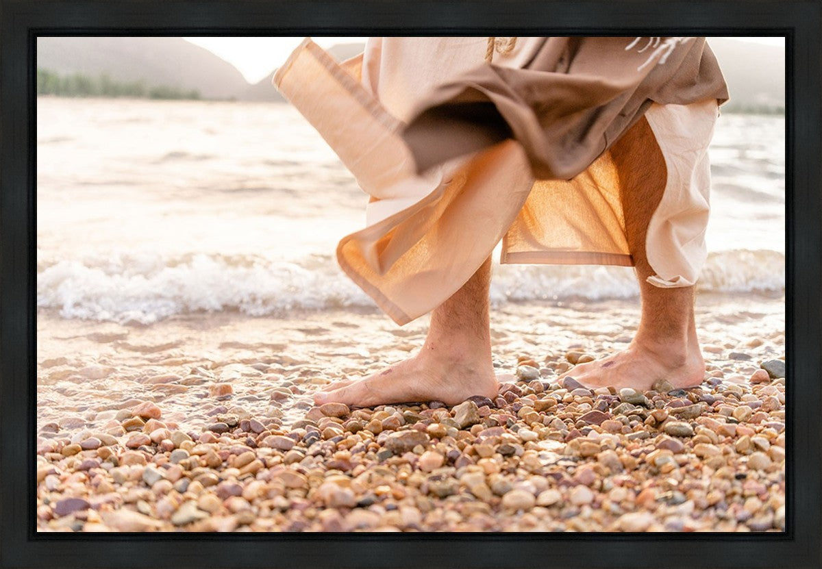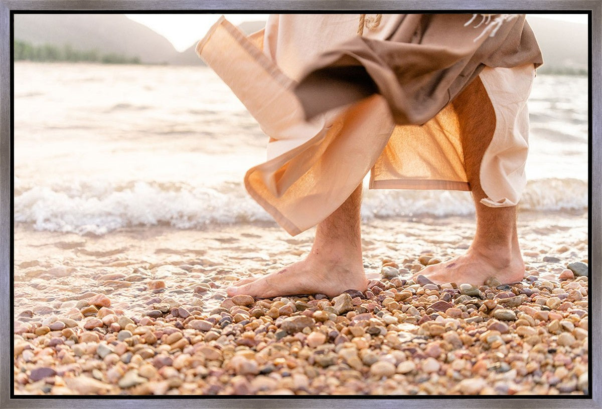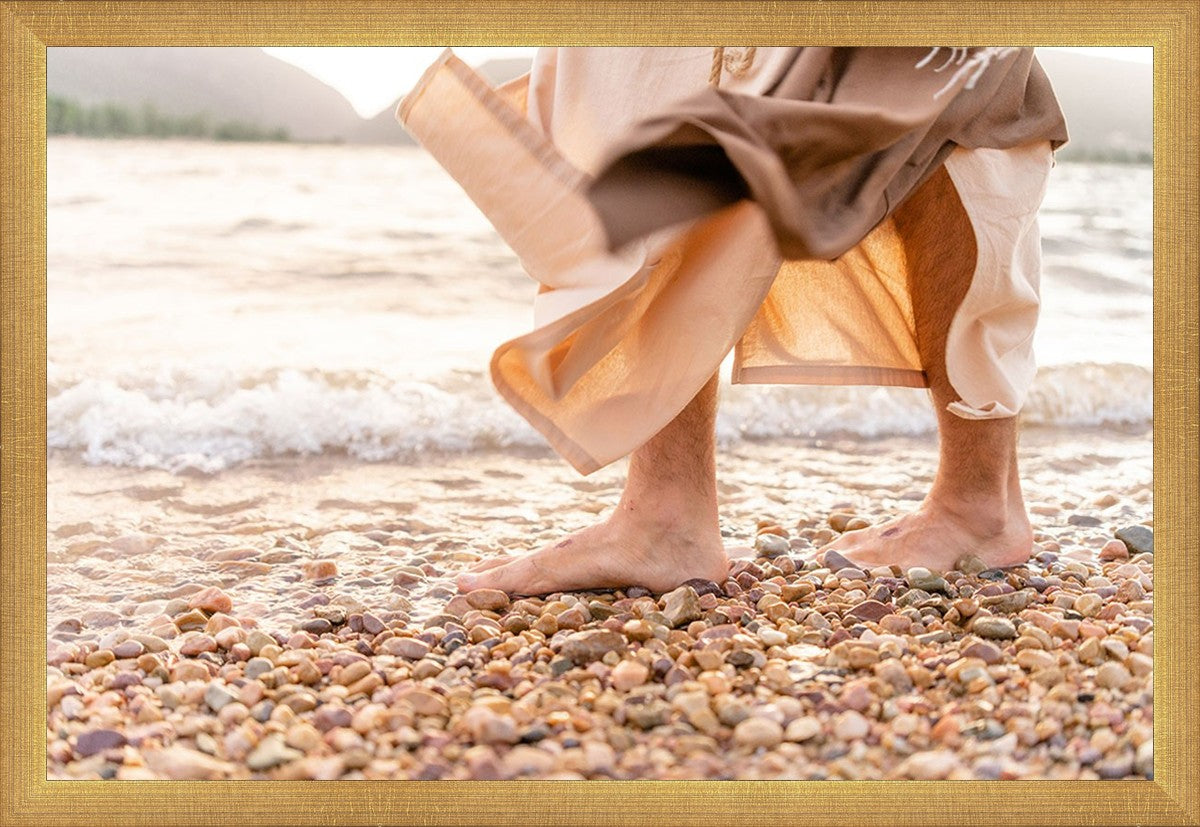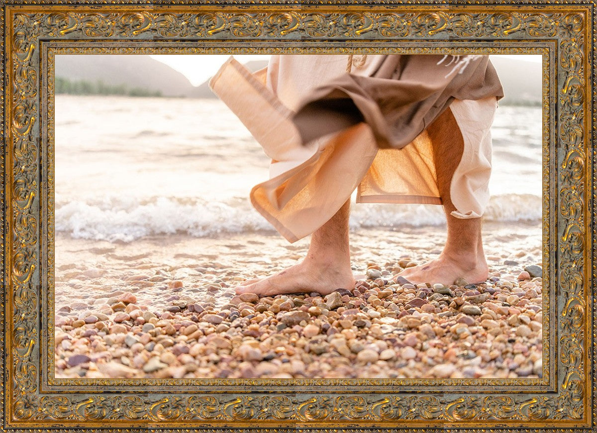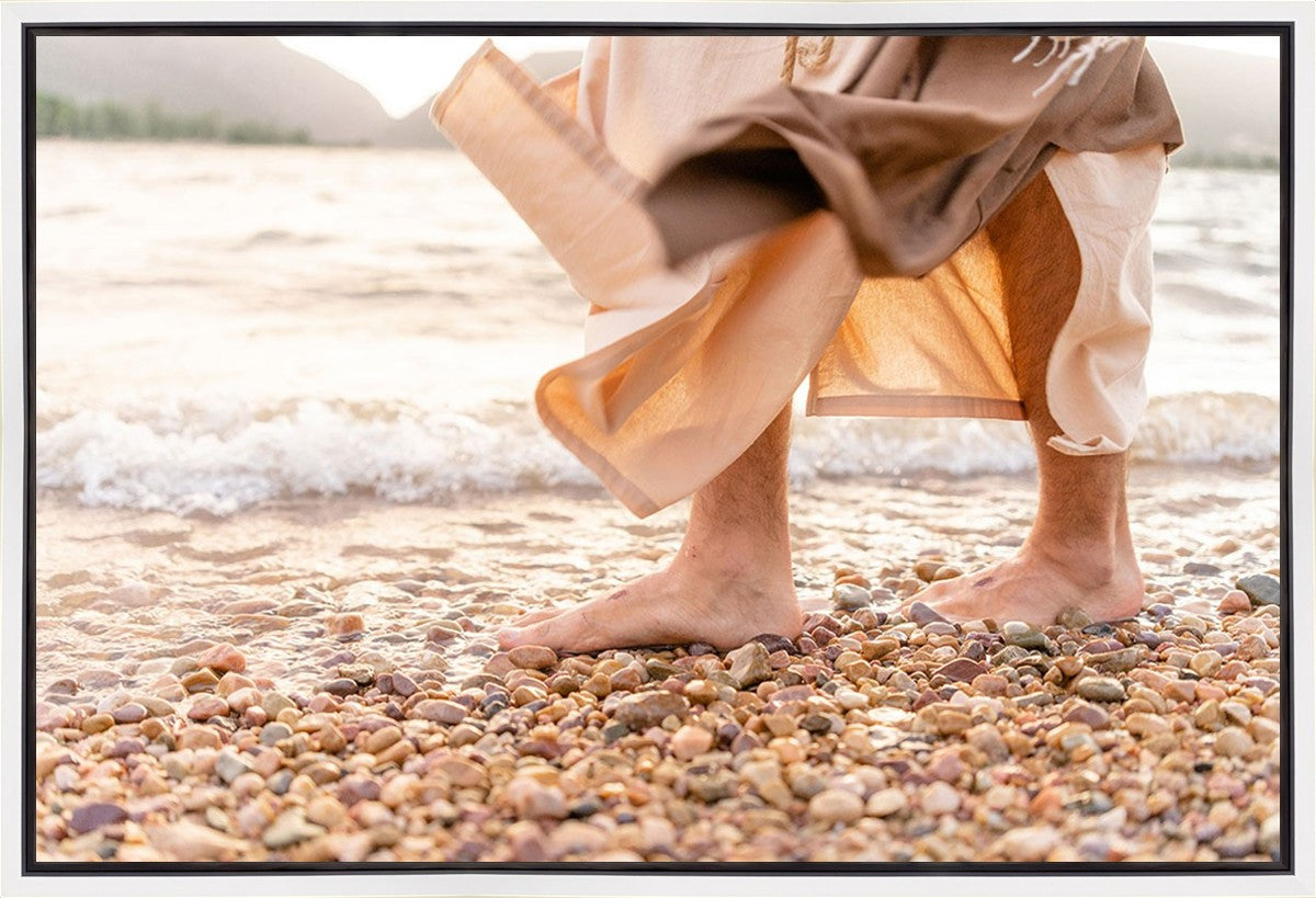 A photograph of a resurrected Jesus Christ walking along the shores of the Galilee Sea.