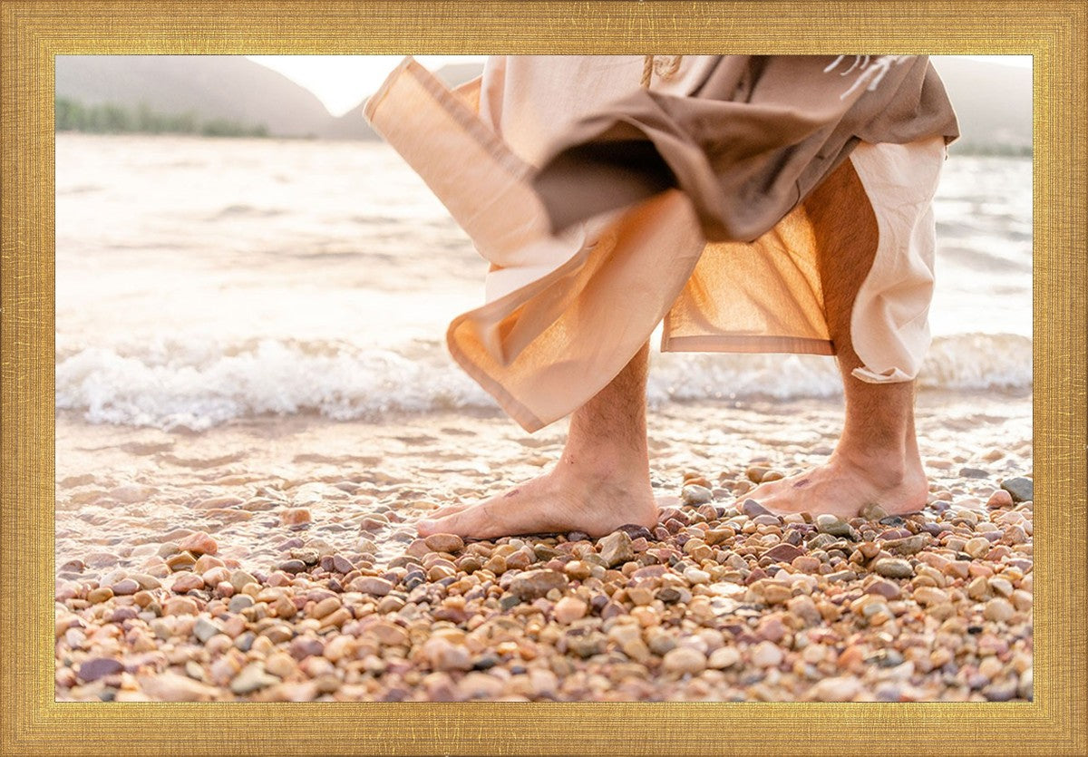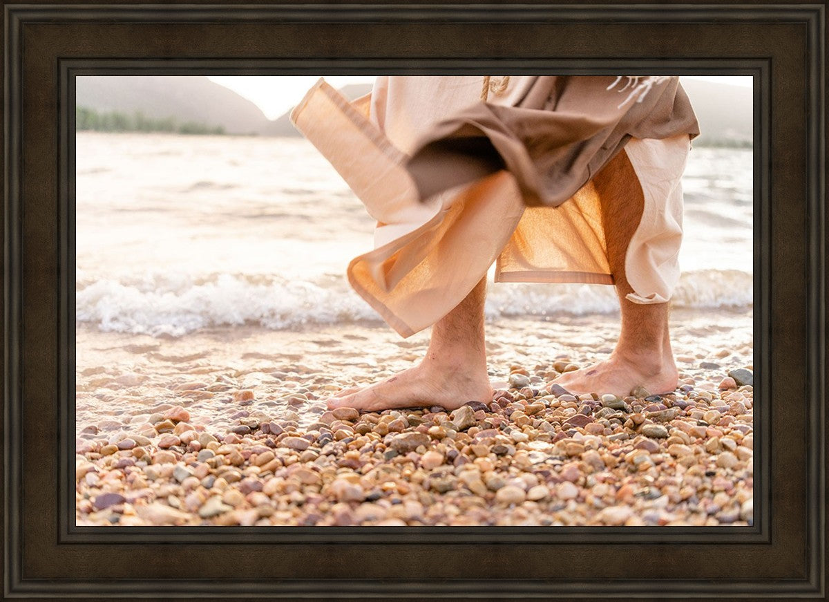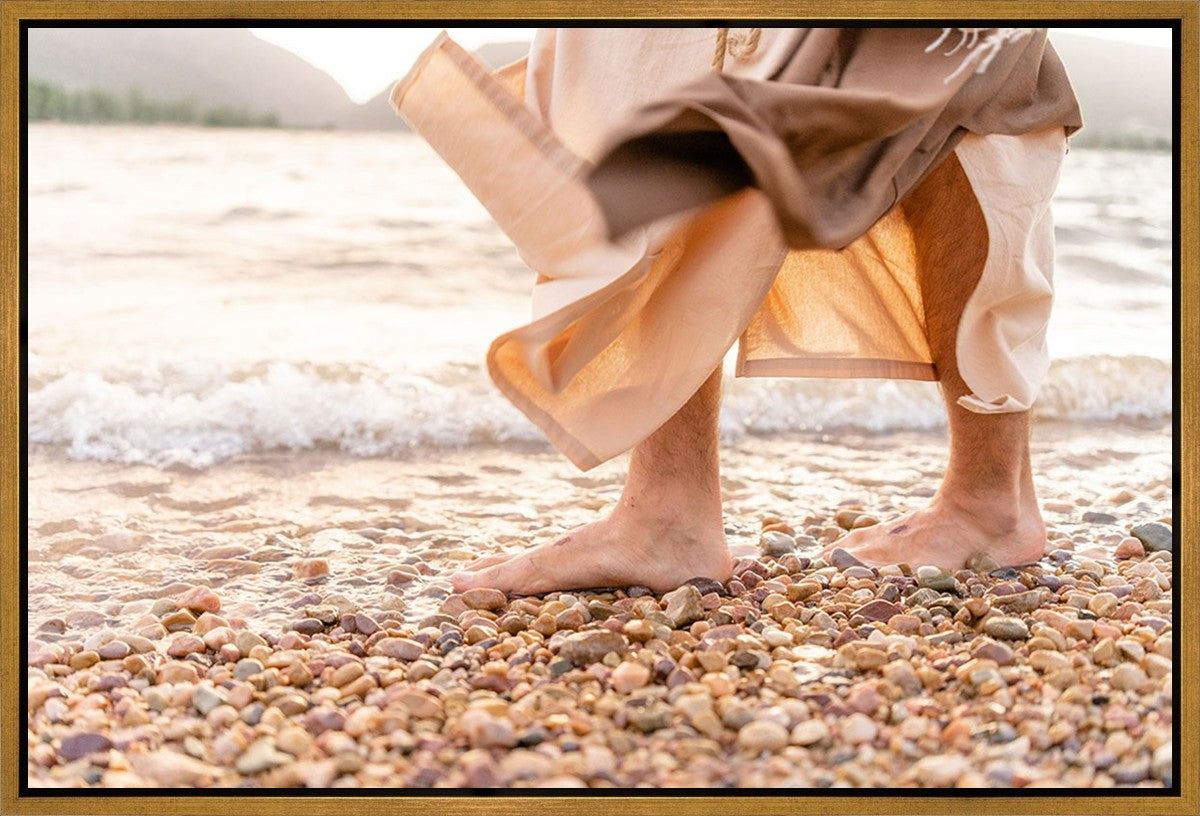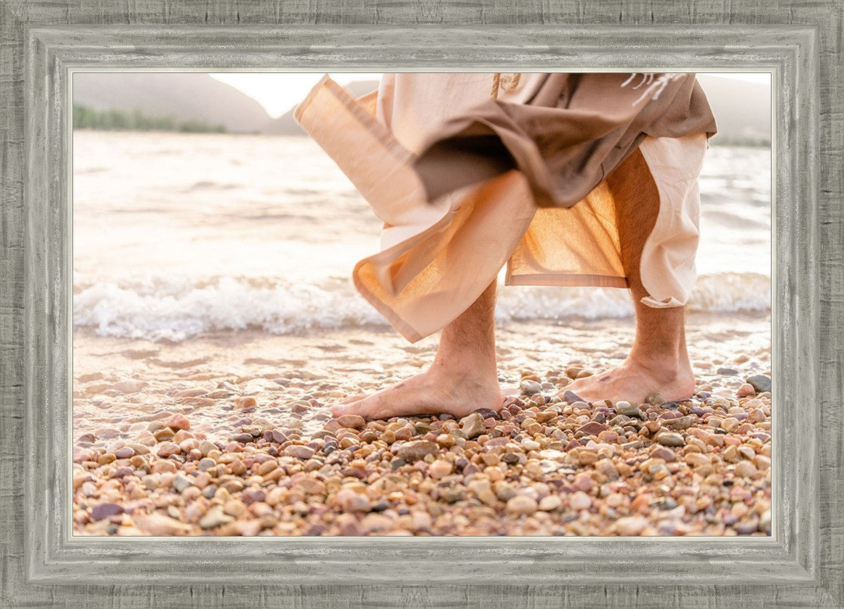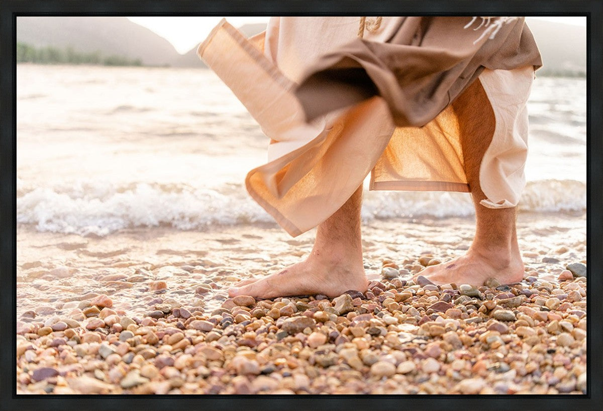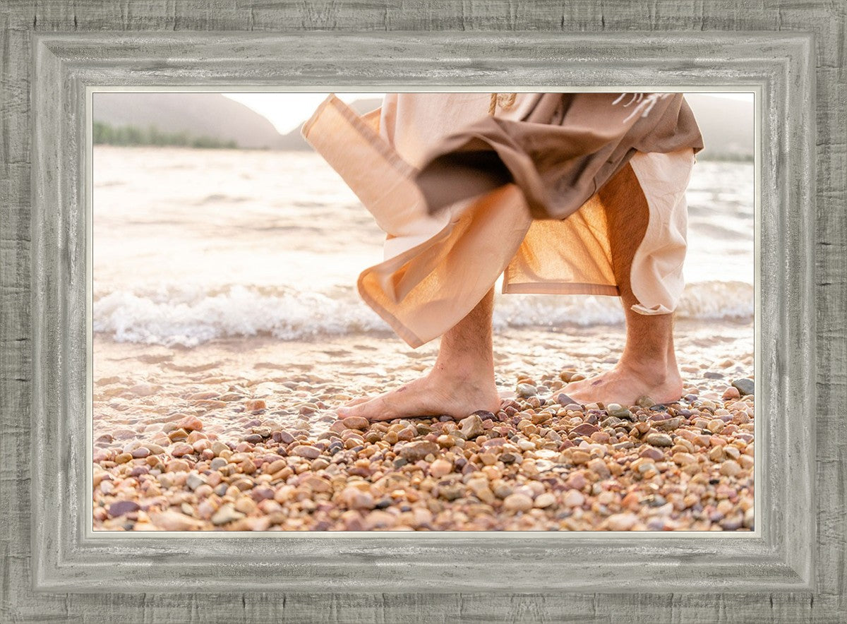 A photograph of a resurrected Jesus Christ walking along the shores of the Galilee Sea.