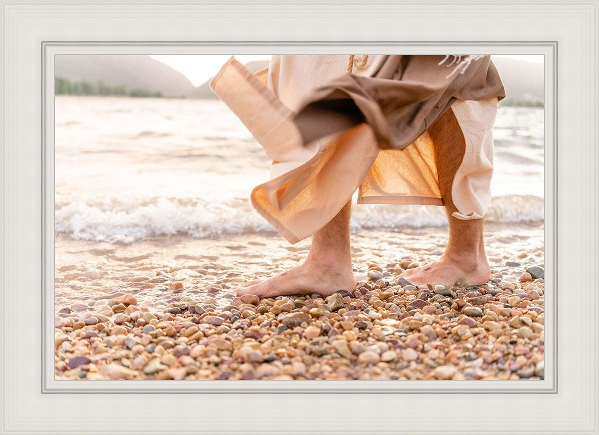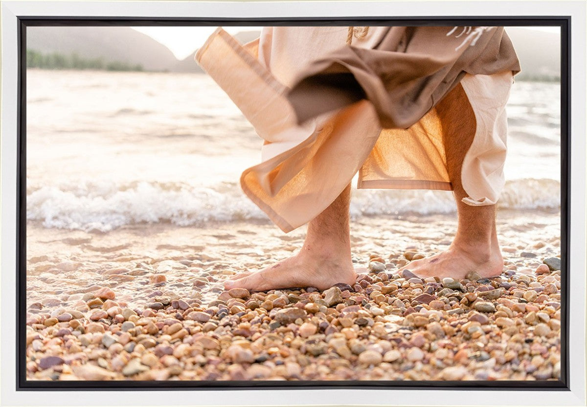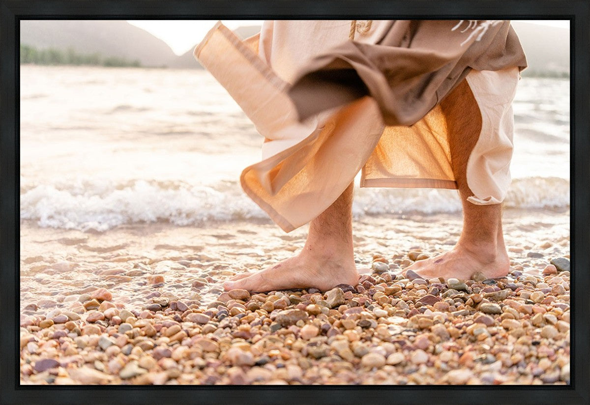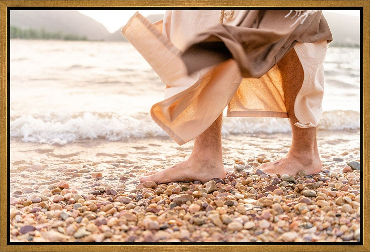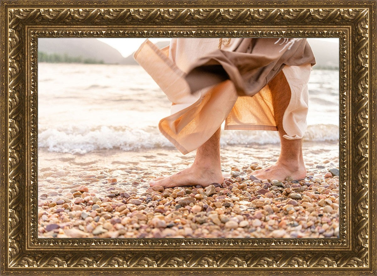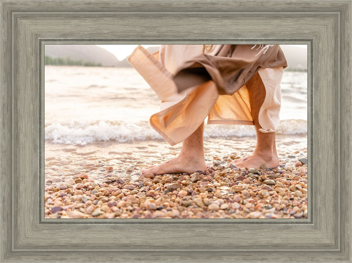 A photograph of a resurrected Jesus Christ walking along the shores of the Galilee Sea.