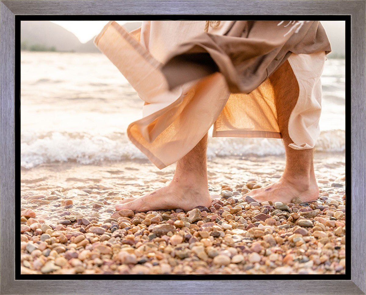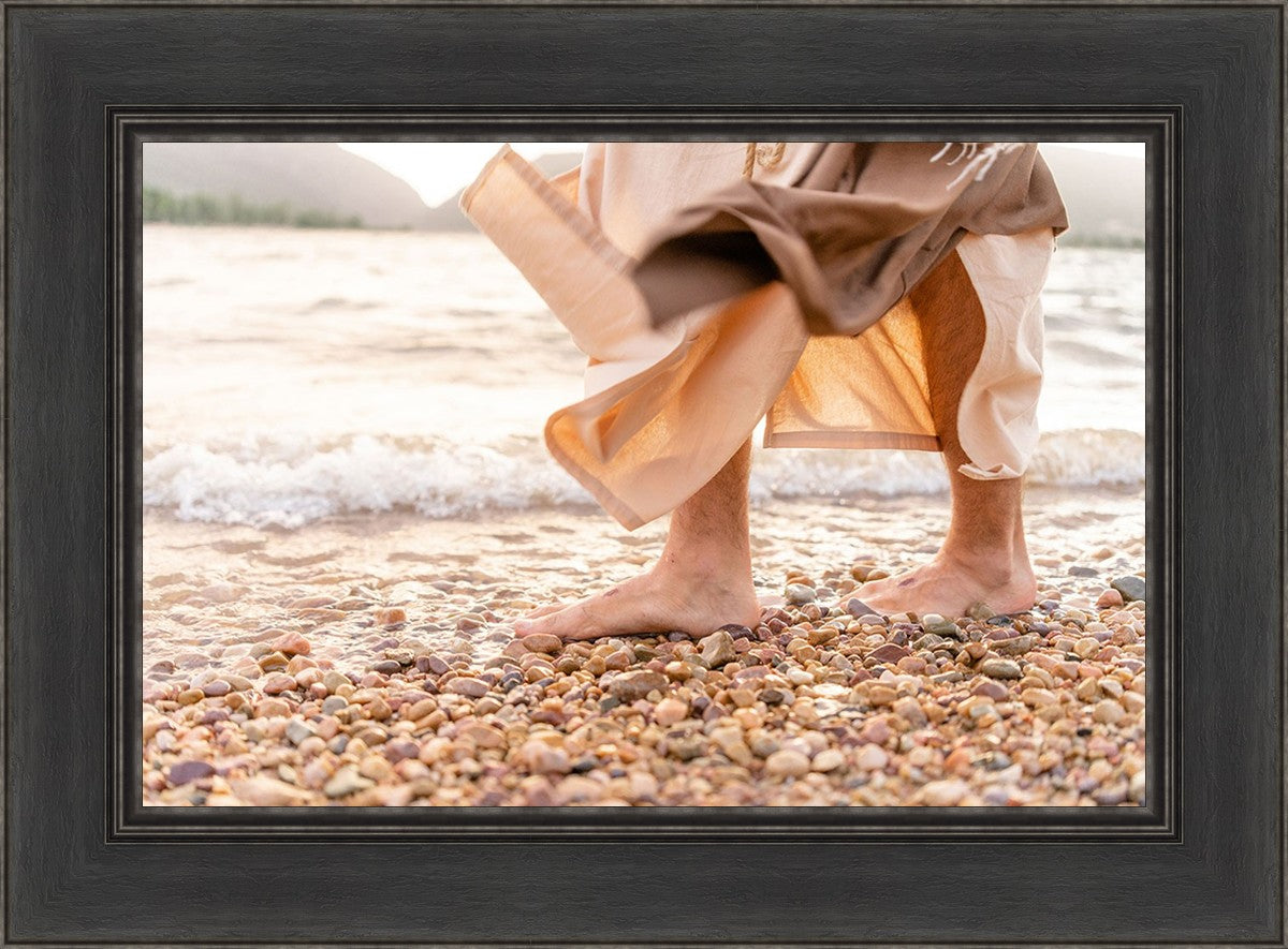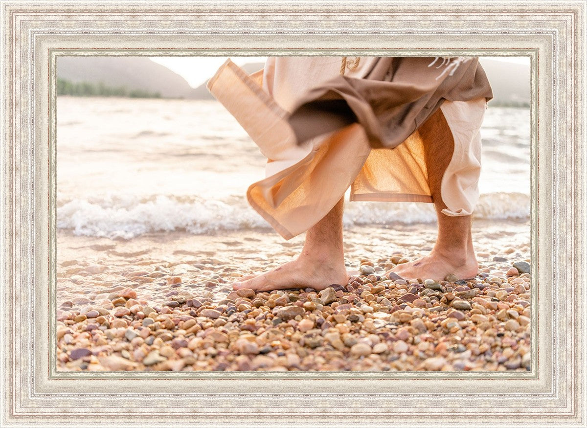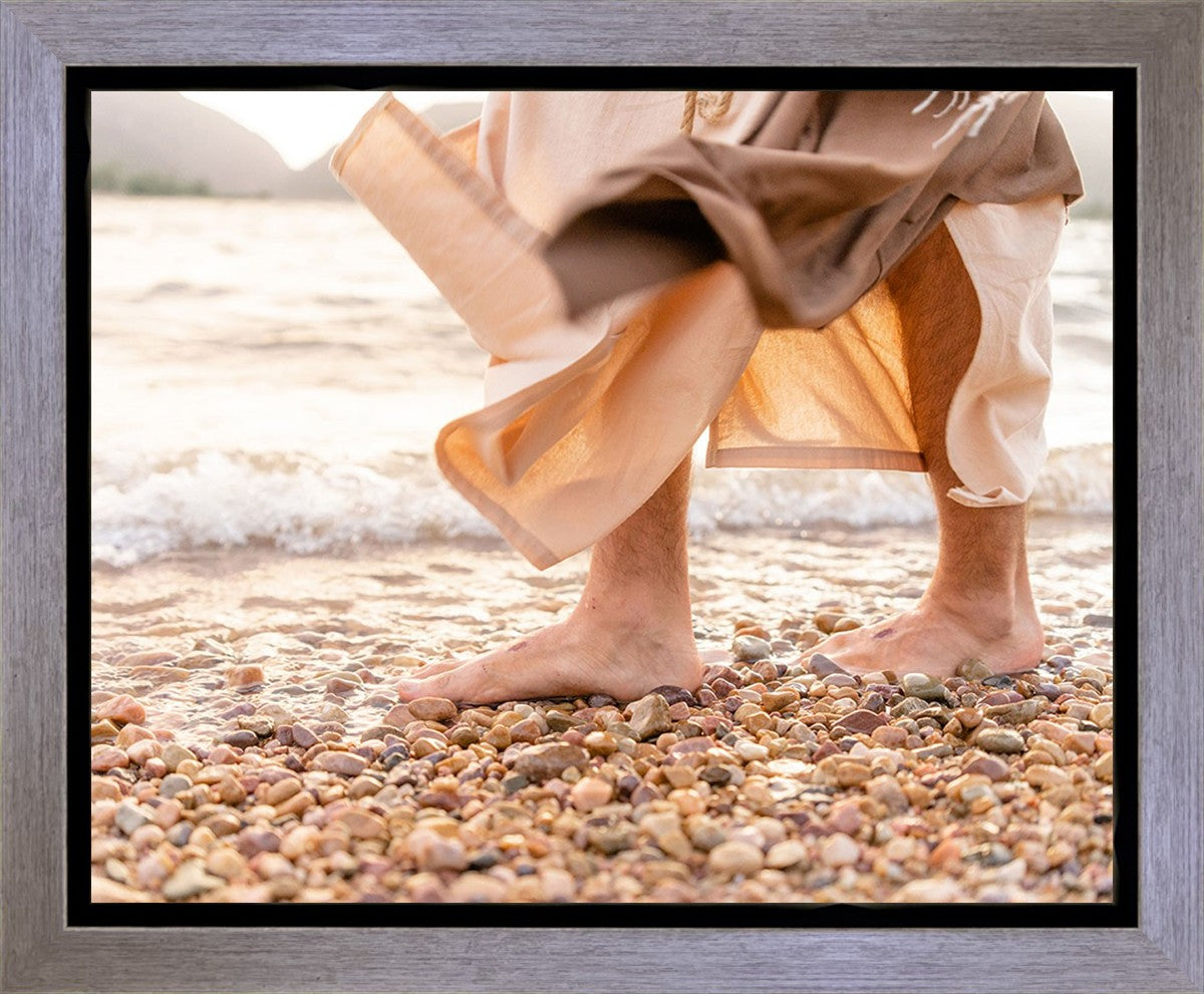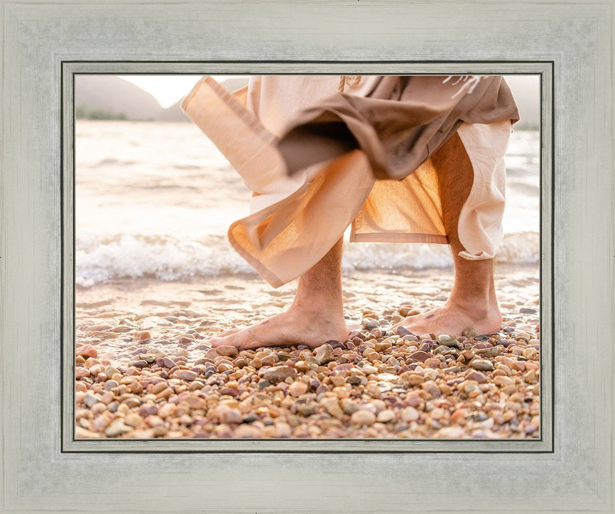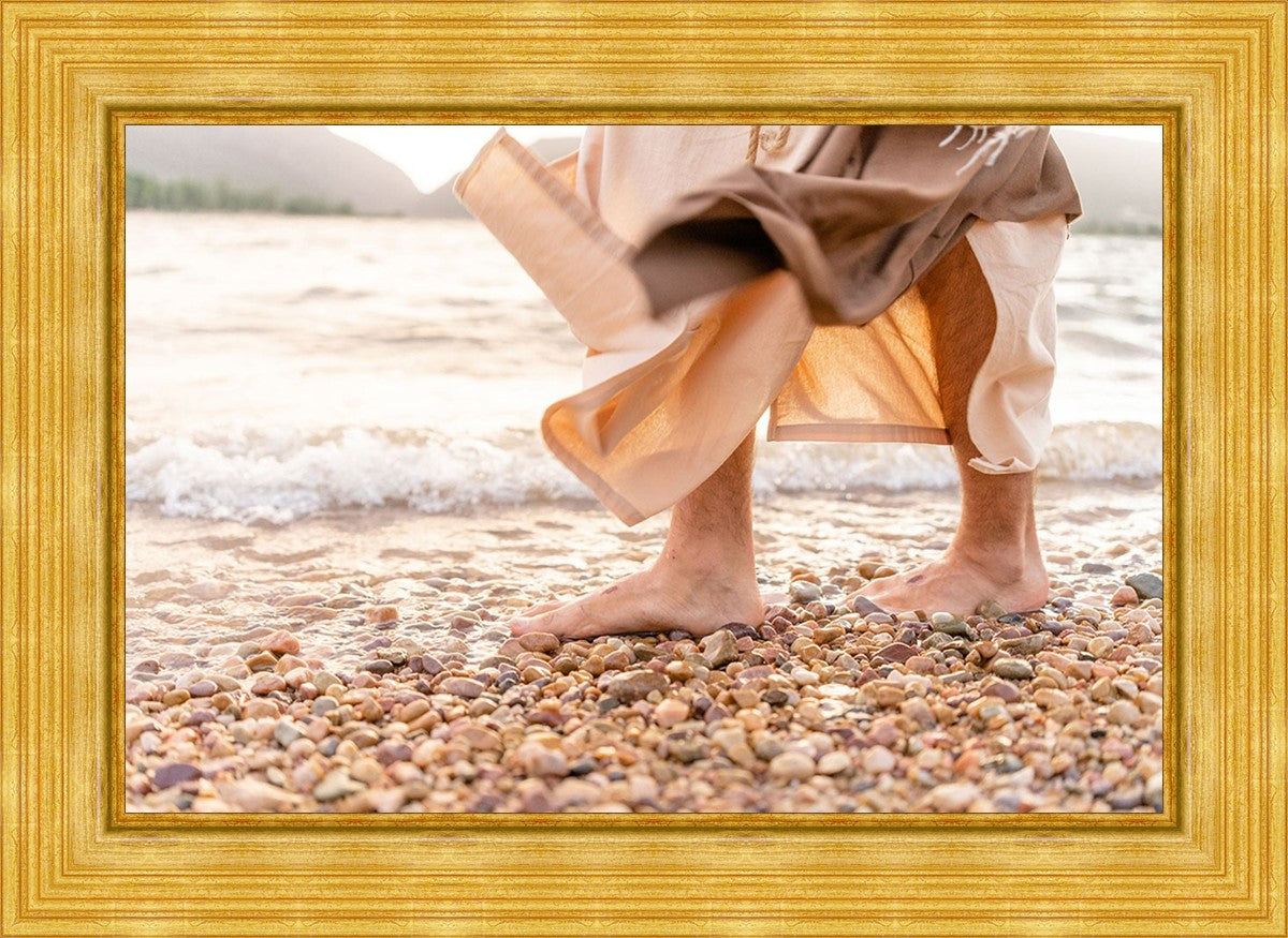 A photograph of a resurrected Jesus Christ walking along the shores of the Galilee Sea.