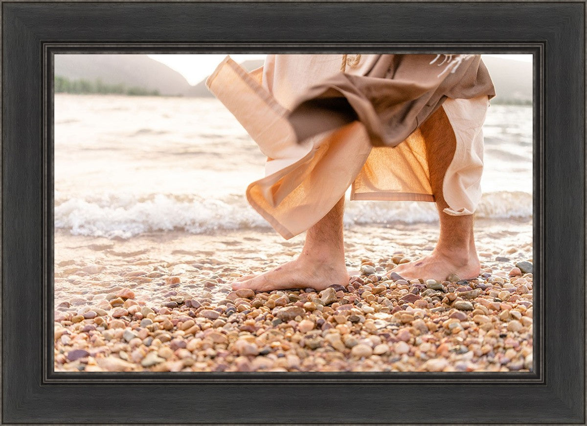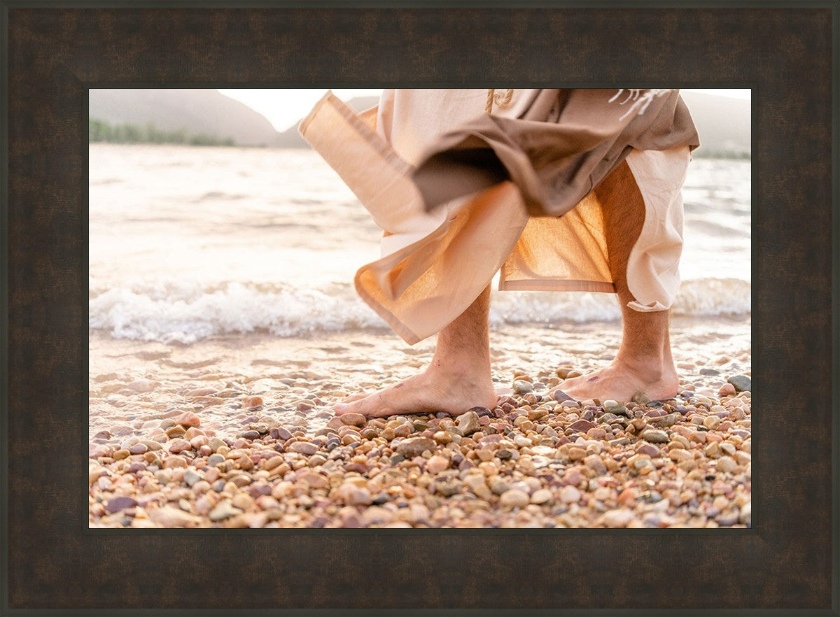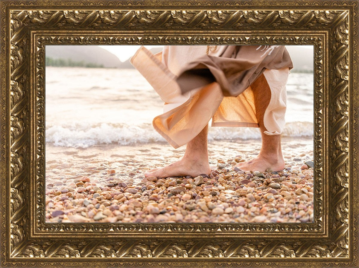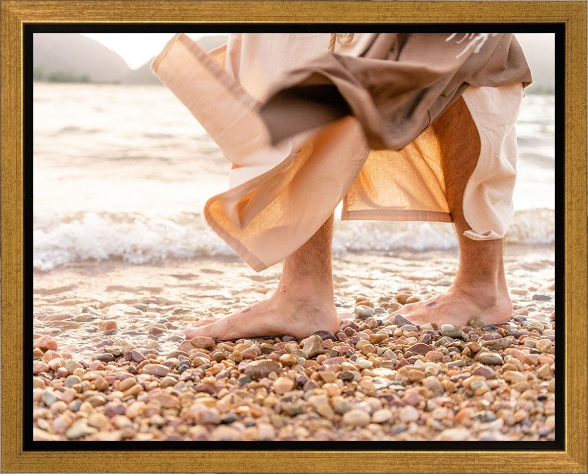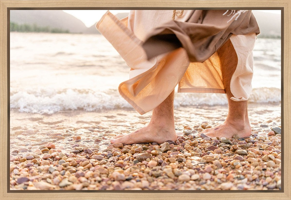 A photograph of a resurrected Jesus Christ walking along the shores of the Galilee Sea.