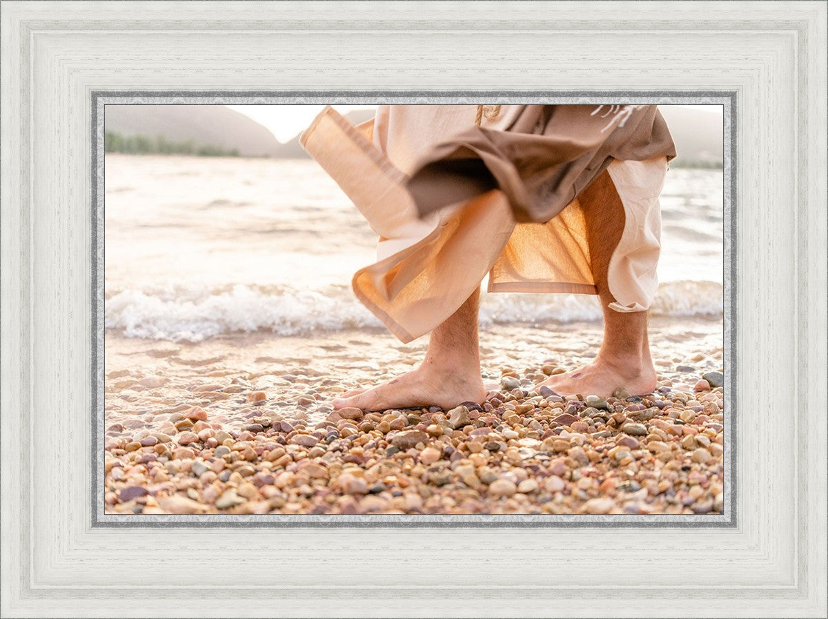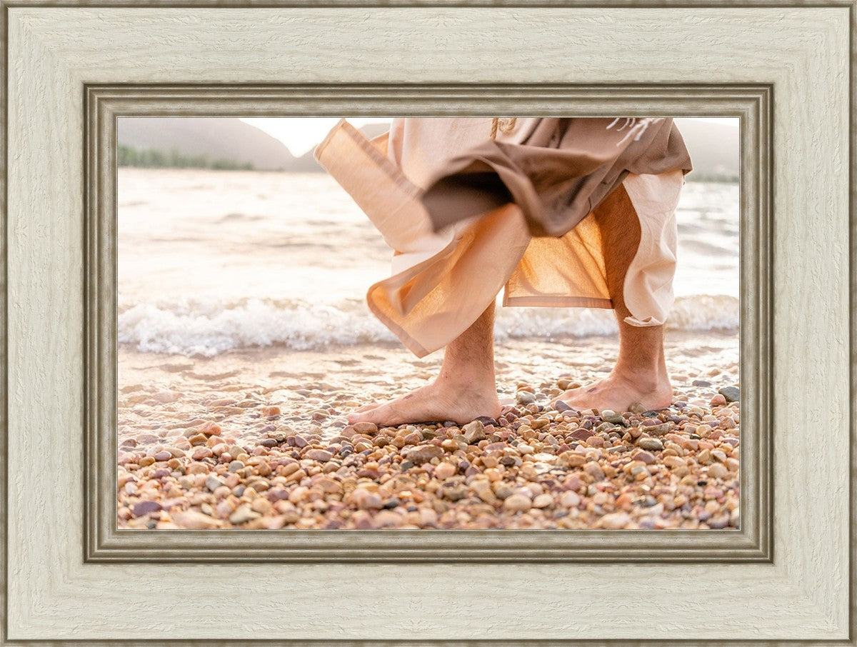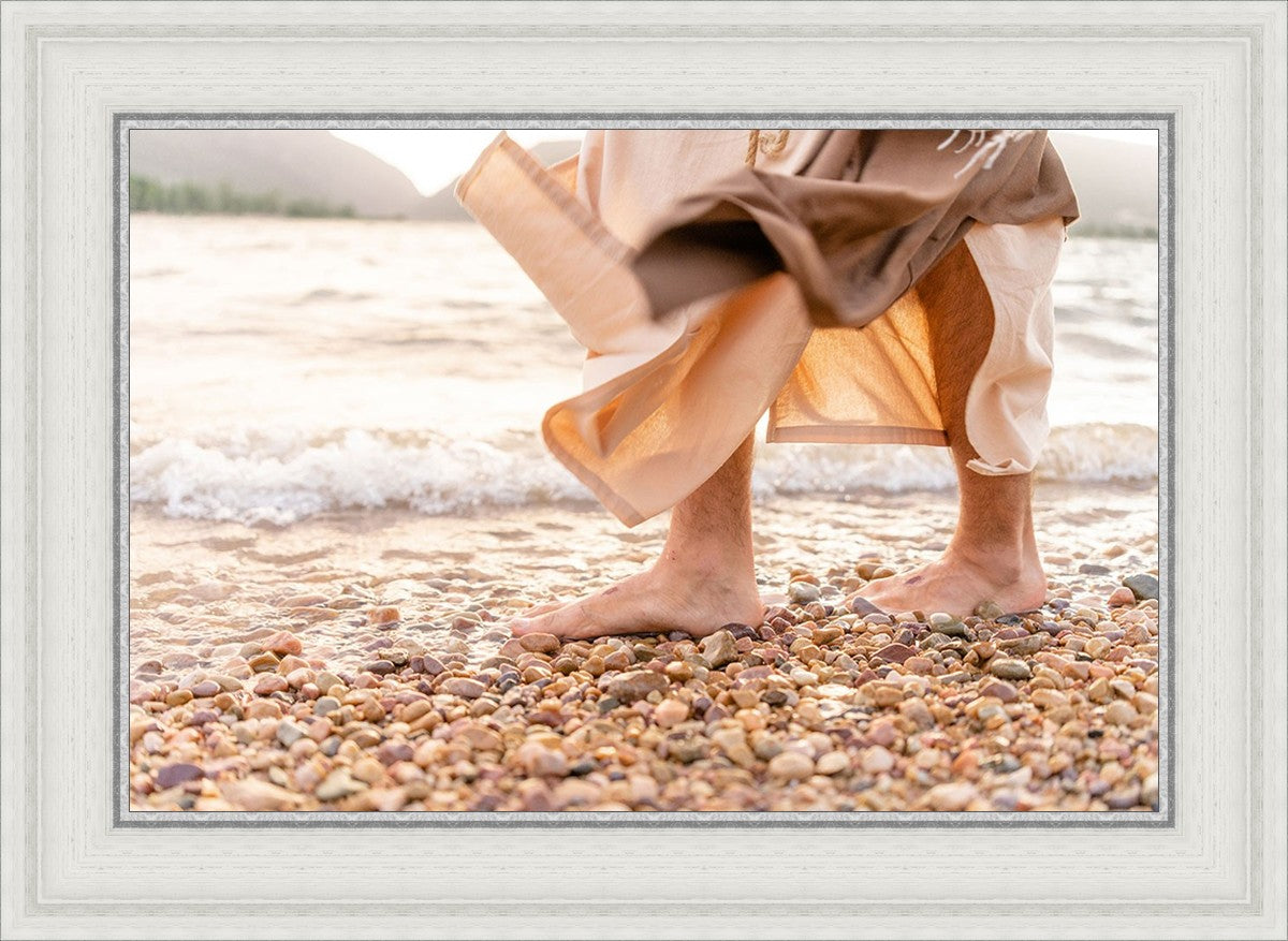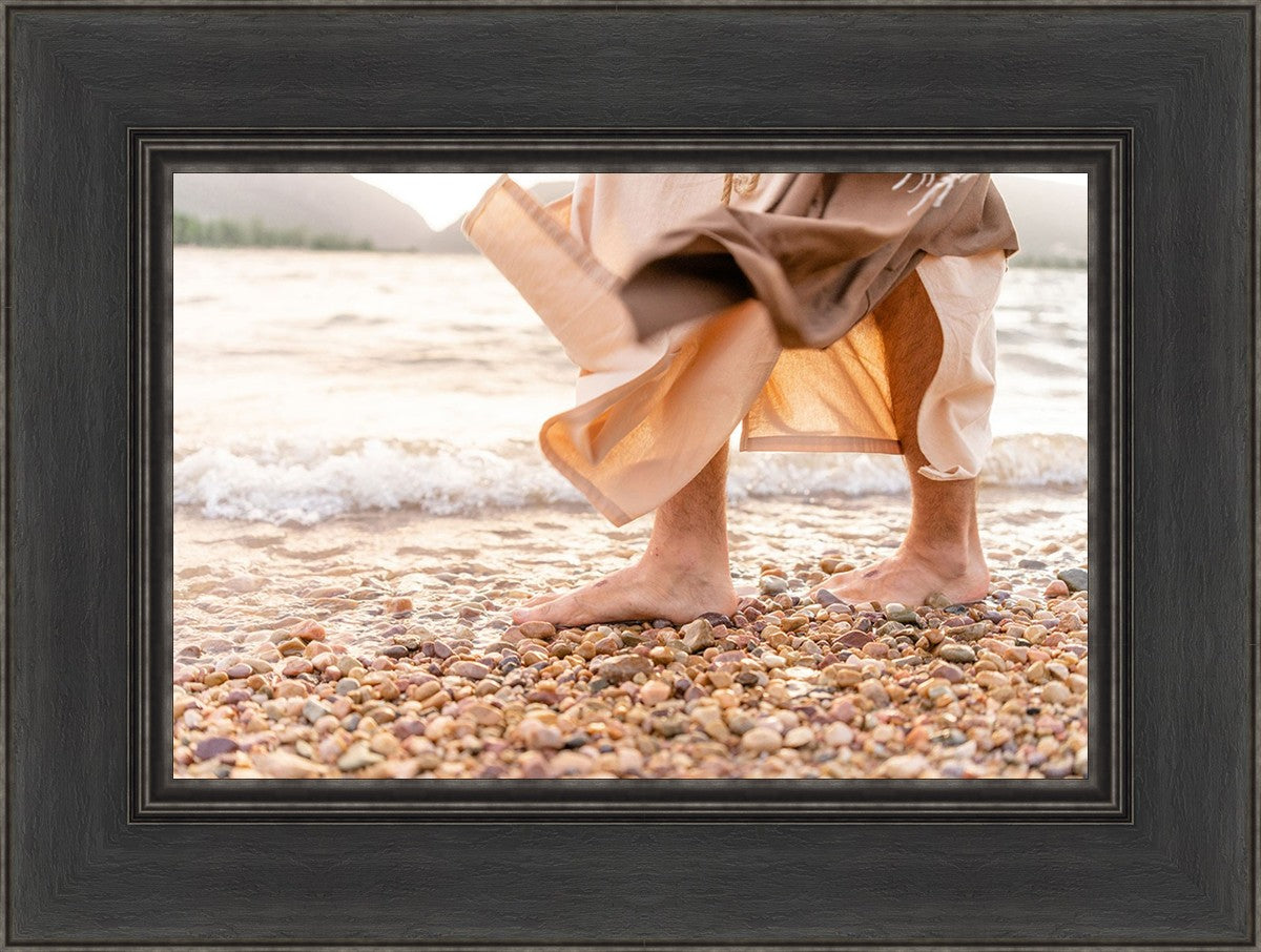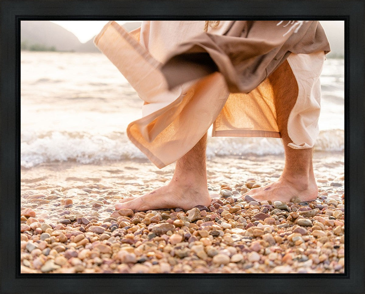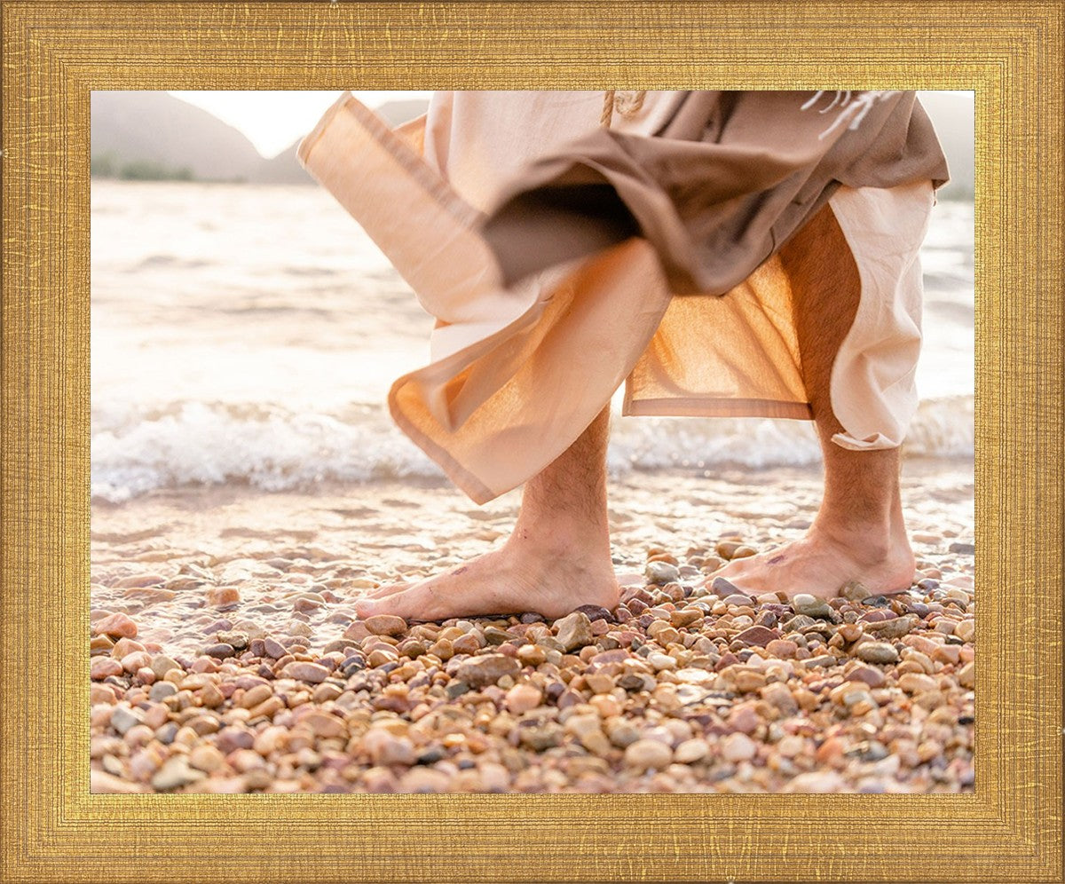 A photograph of a resurrected Jesus Christ walking along the shores of the Galilee Sea.