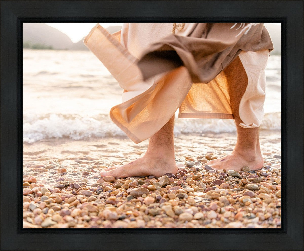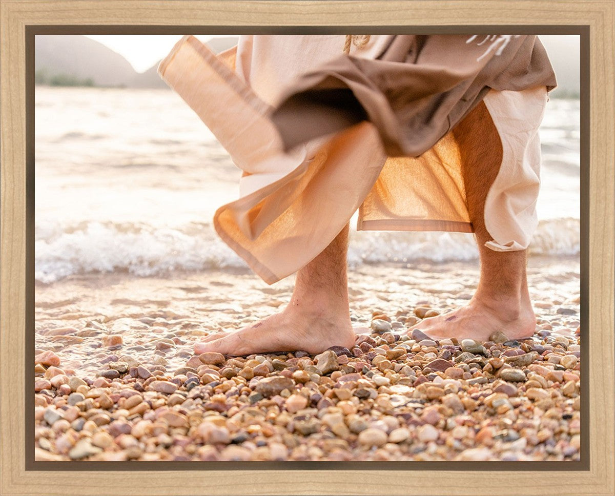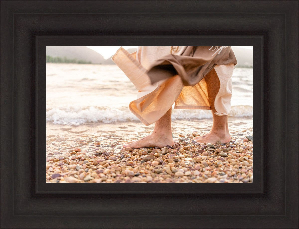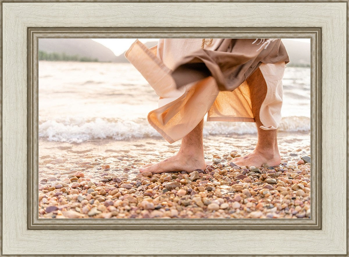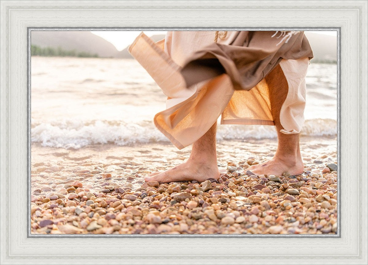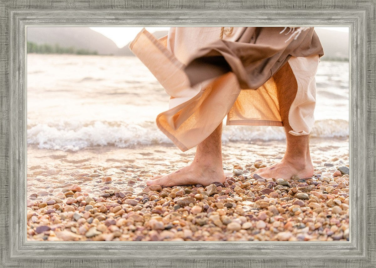 A photograph of a resurrected Jesus Christ walking along the shores of the Galilee Sea.