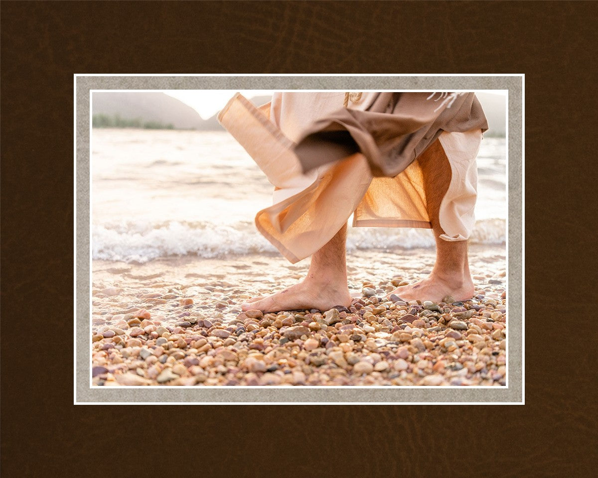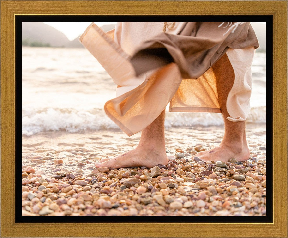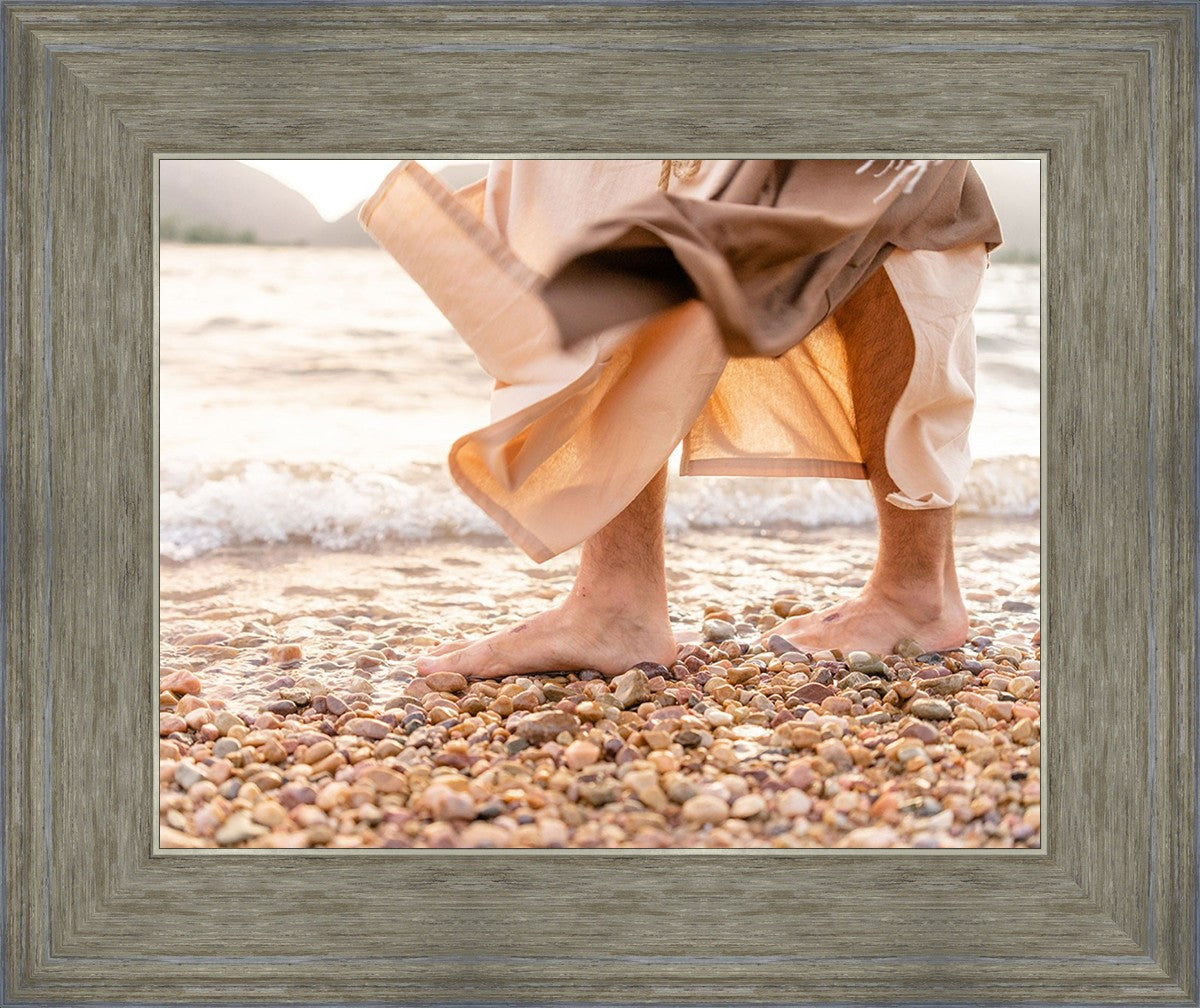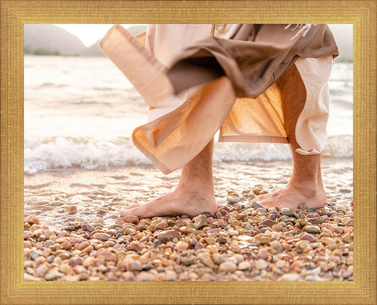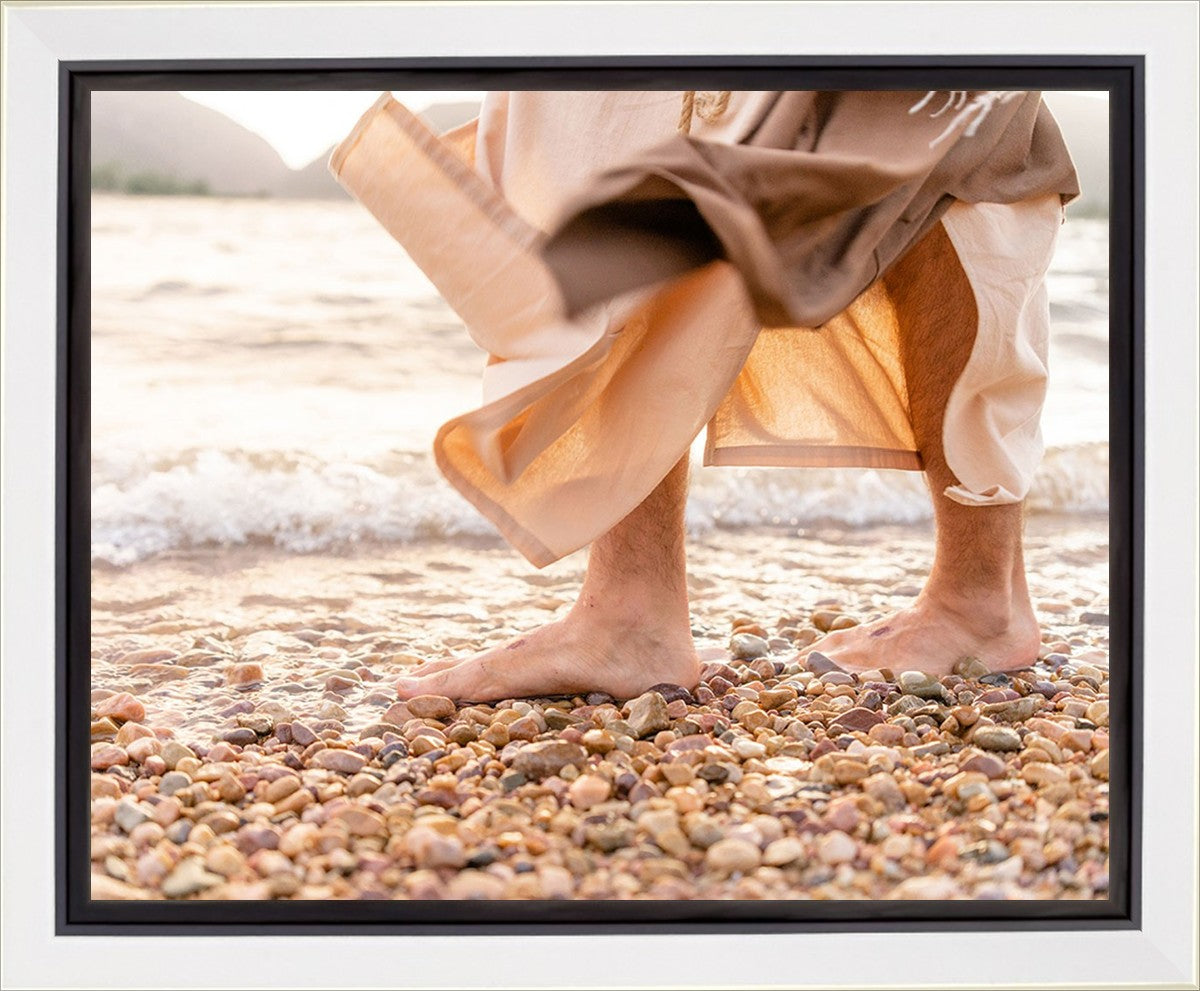 A photograph of a resurrected Jesus Christ walking along the shores of the Galilee Sea.