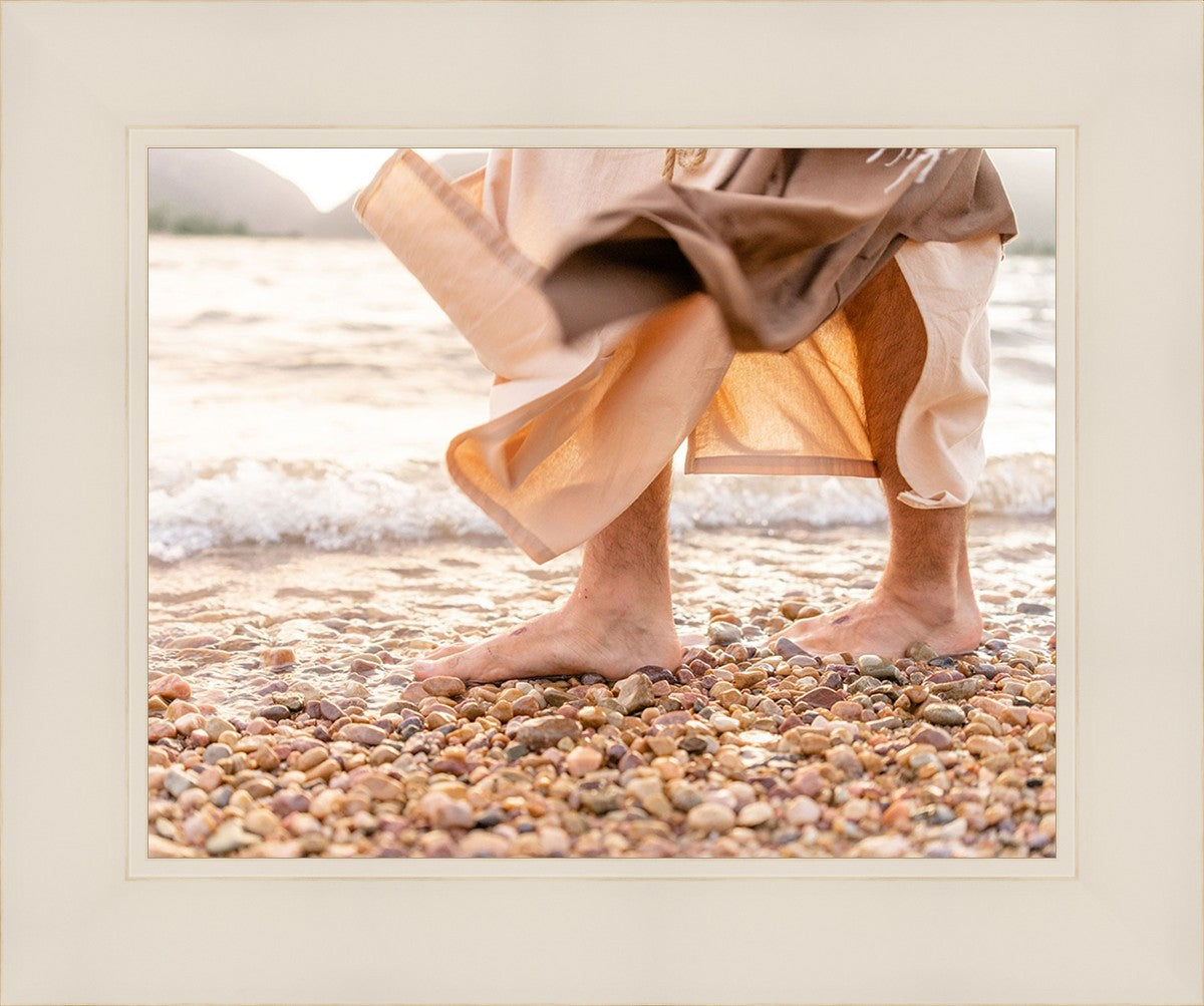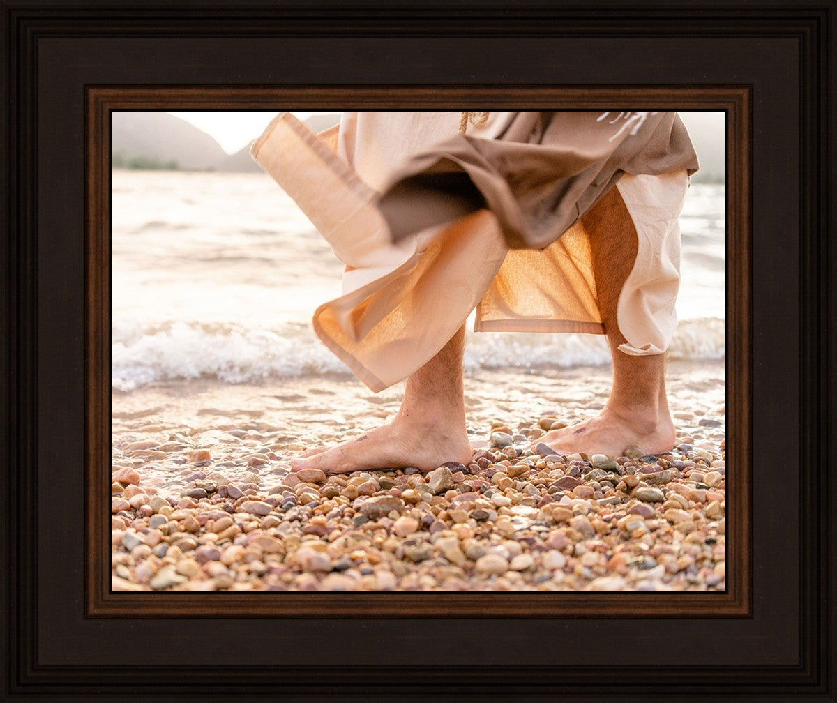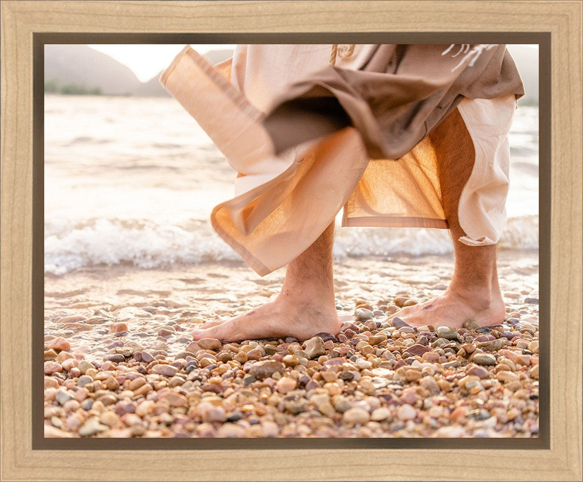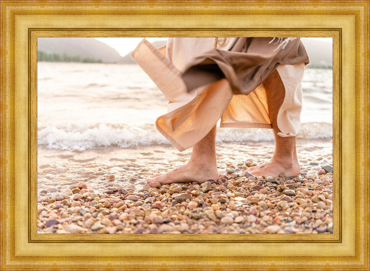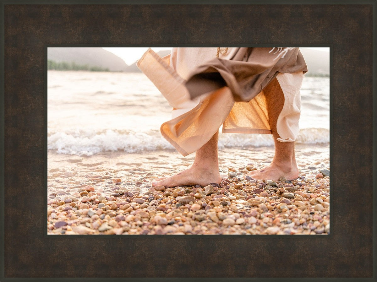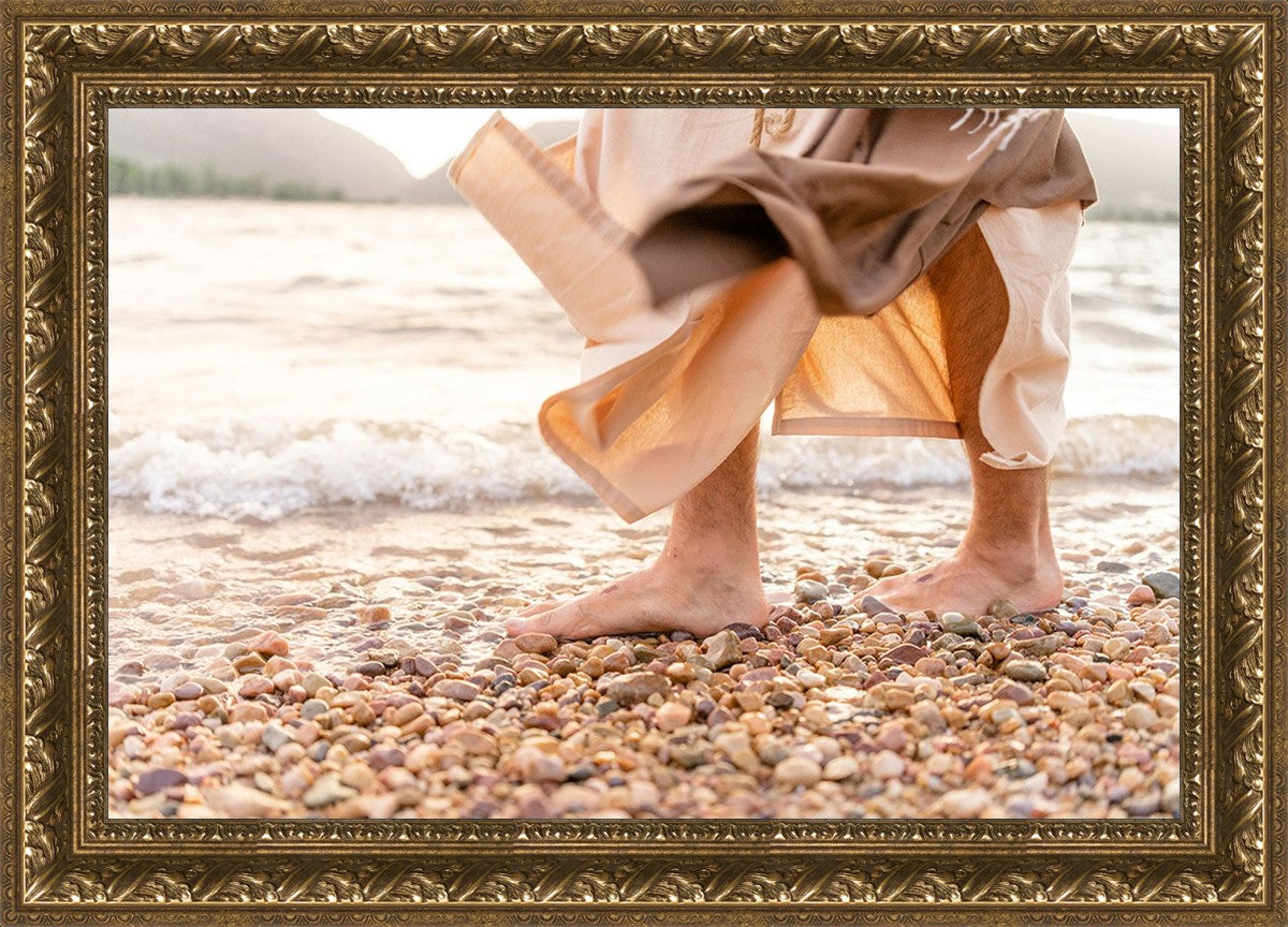 A photograph of a resurrected Jesus Christ walking along the shores of the Galilee Sea.