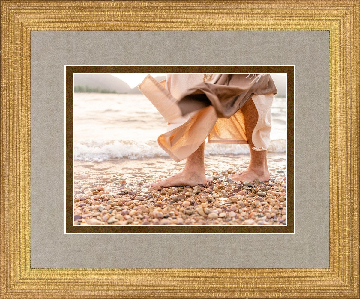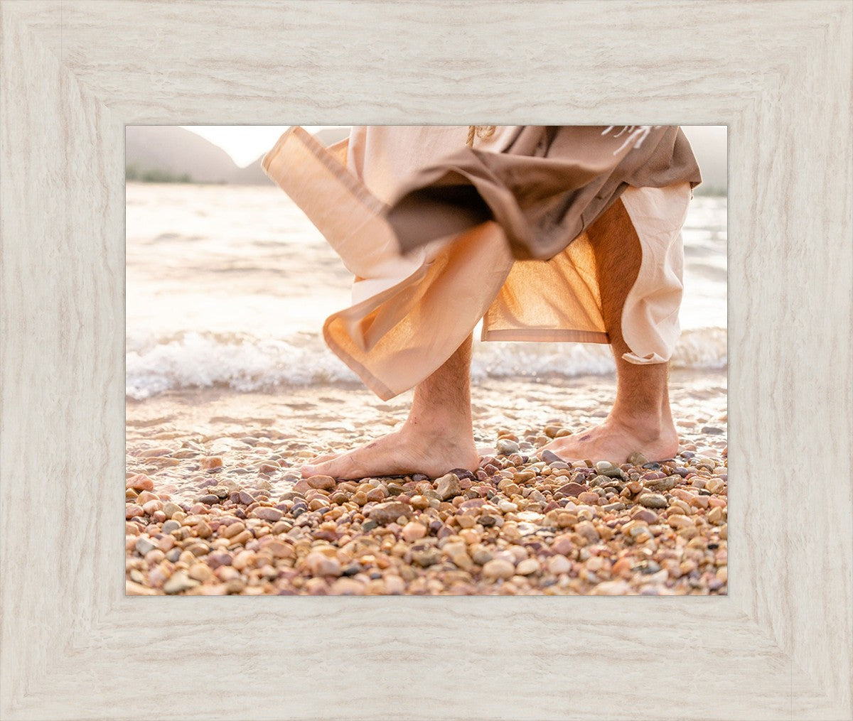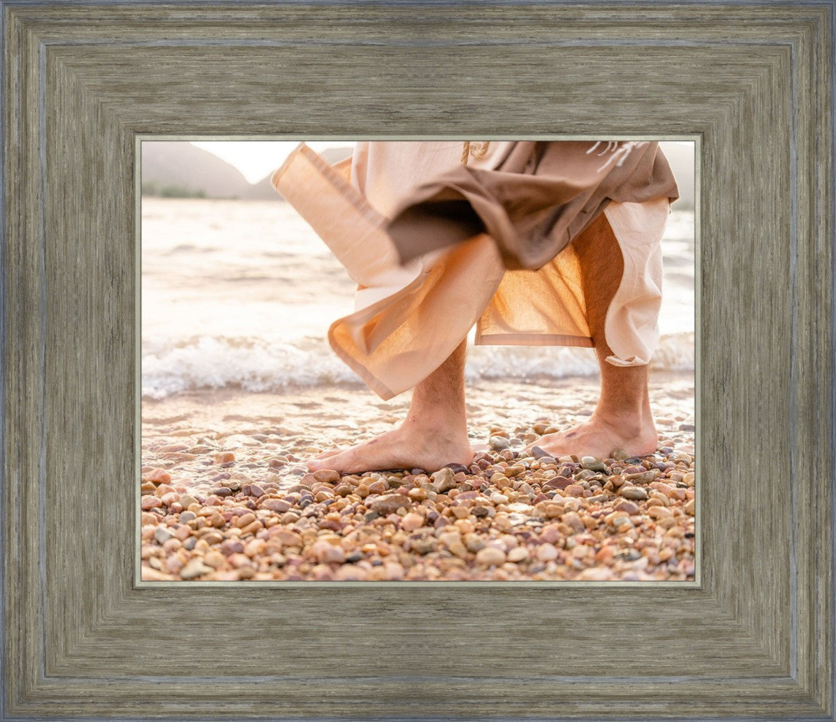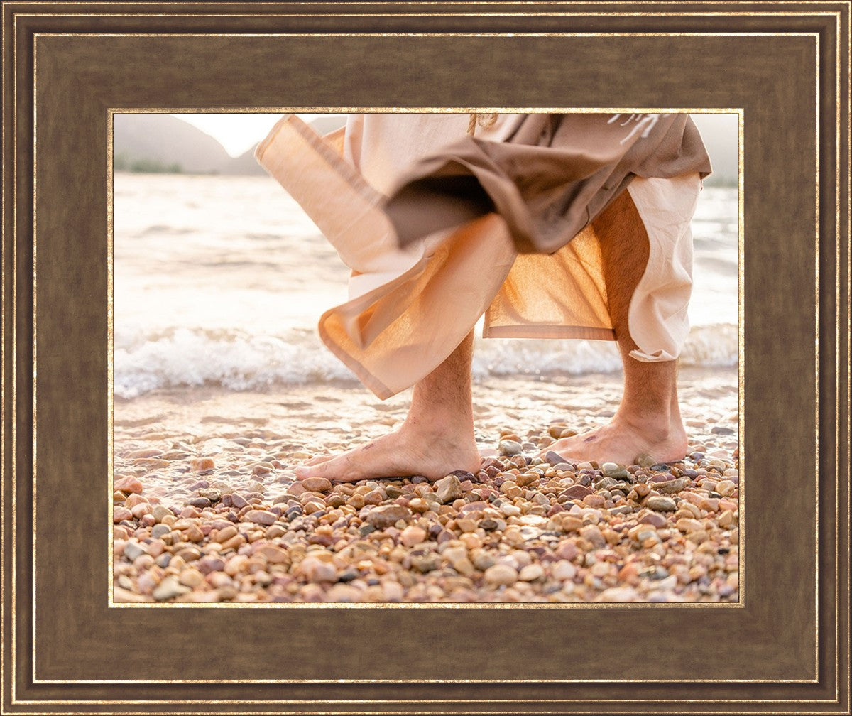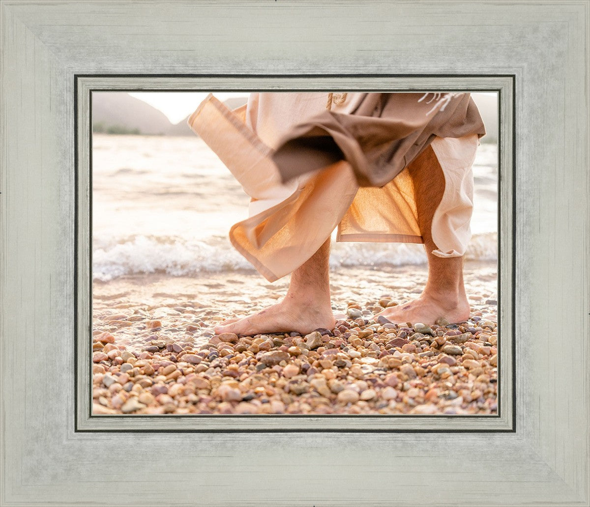 A photograph of a resurrected Jesus Christ walking along the shores of the Galilee Sea.