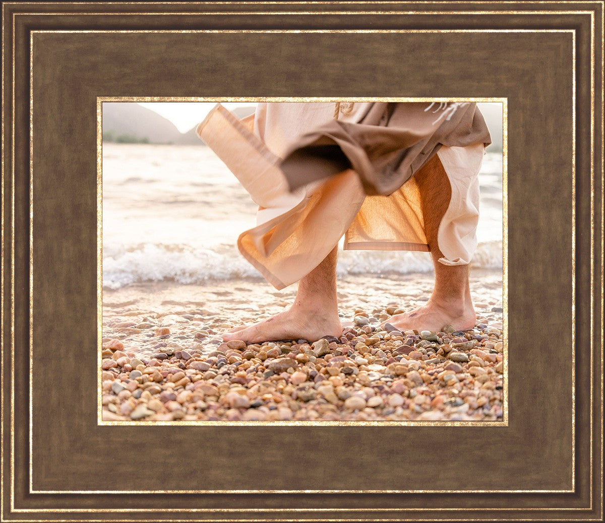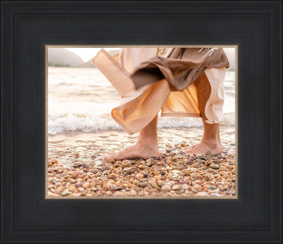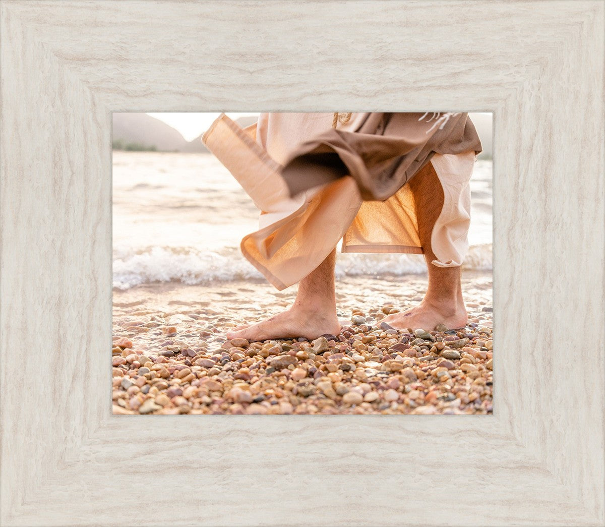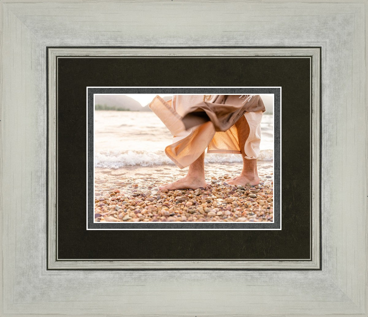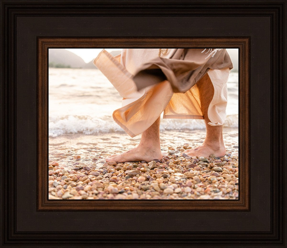 A photograph of a resurrected Jesus Christ walking along the shores of the Galilee Sea.