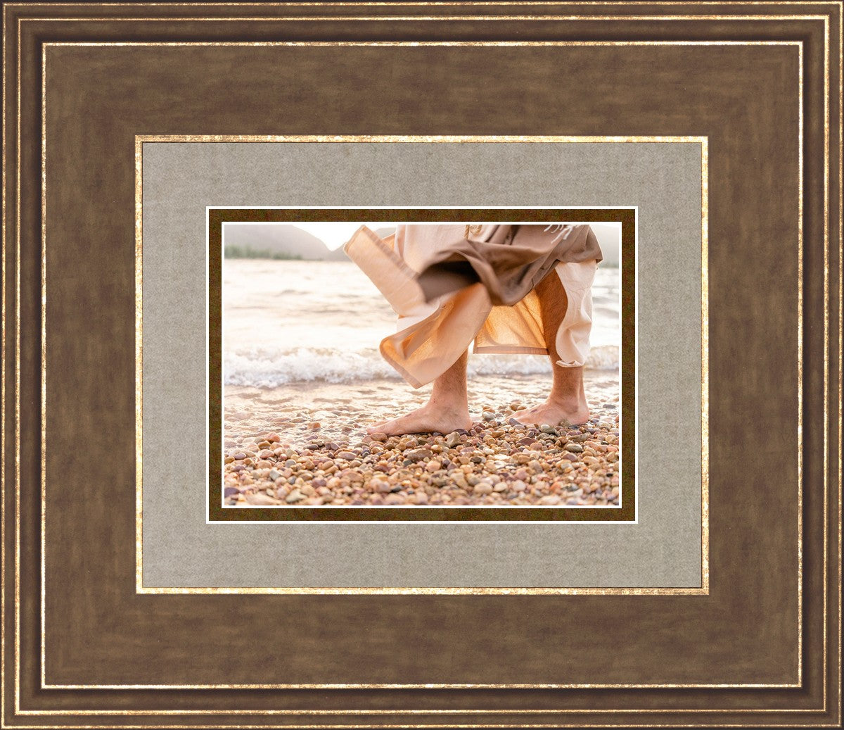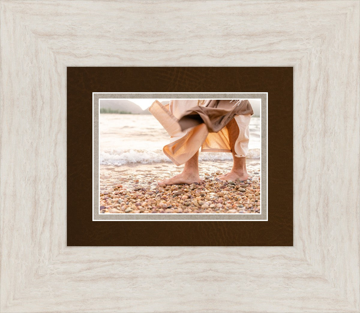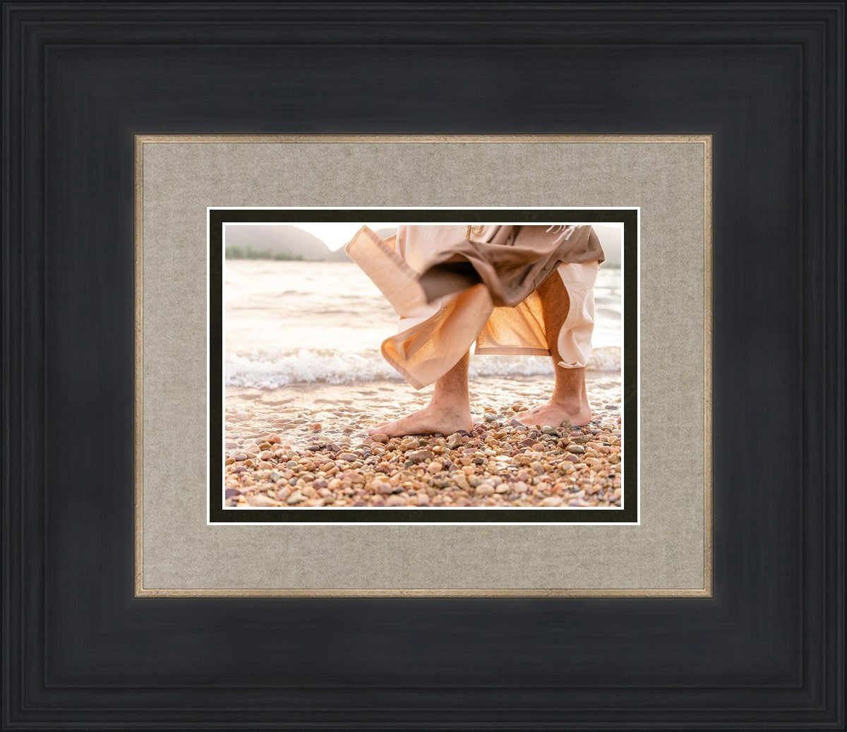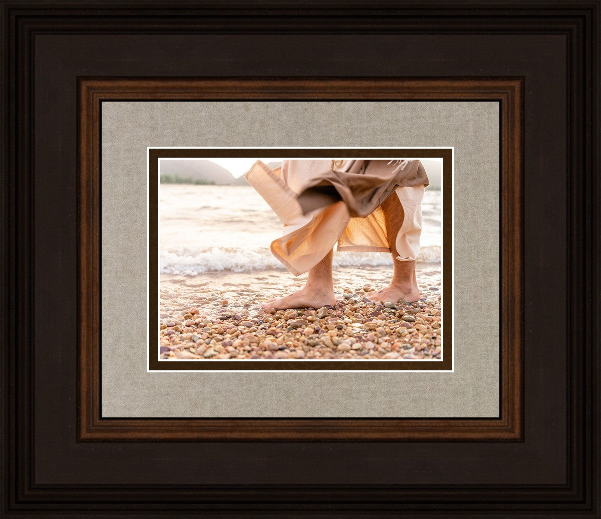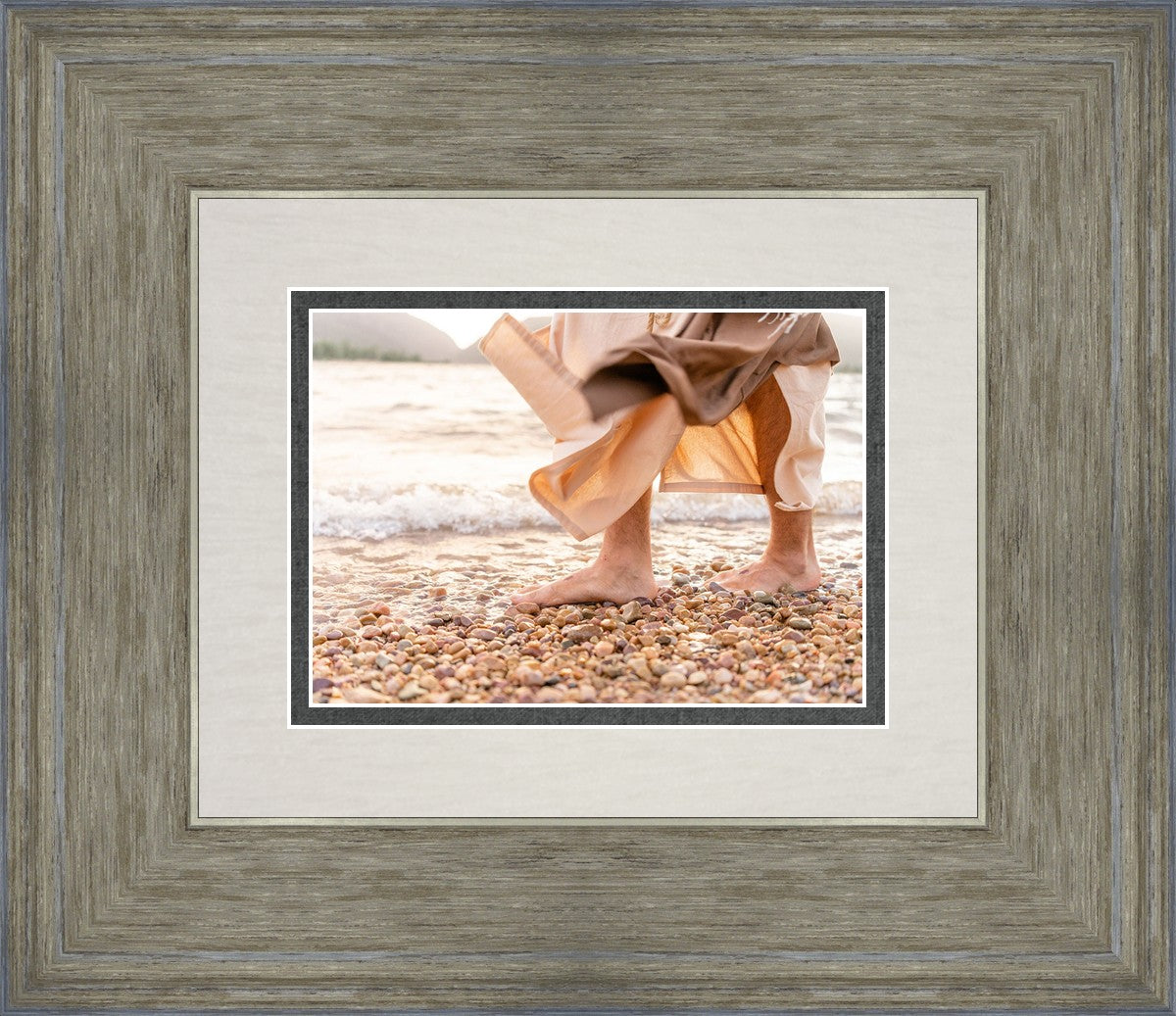 A photograph of a resurrected Jesus Christ walking along the shores of the Galilee Sea.