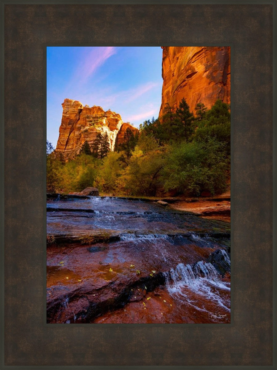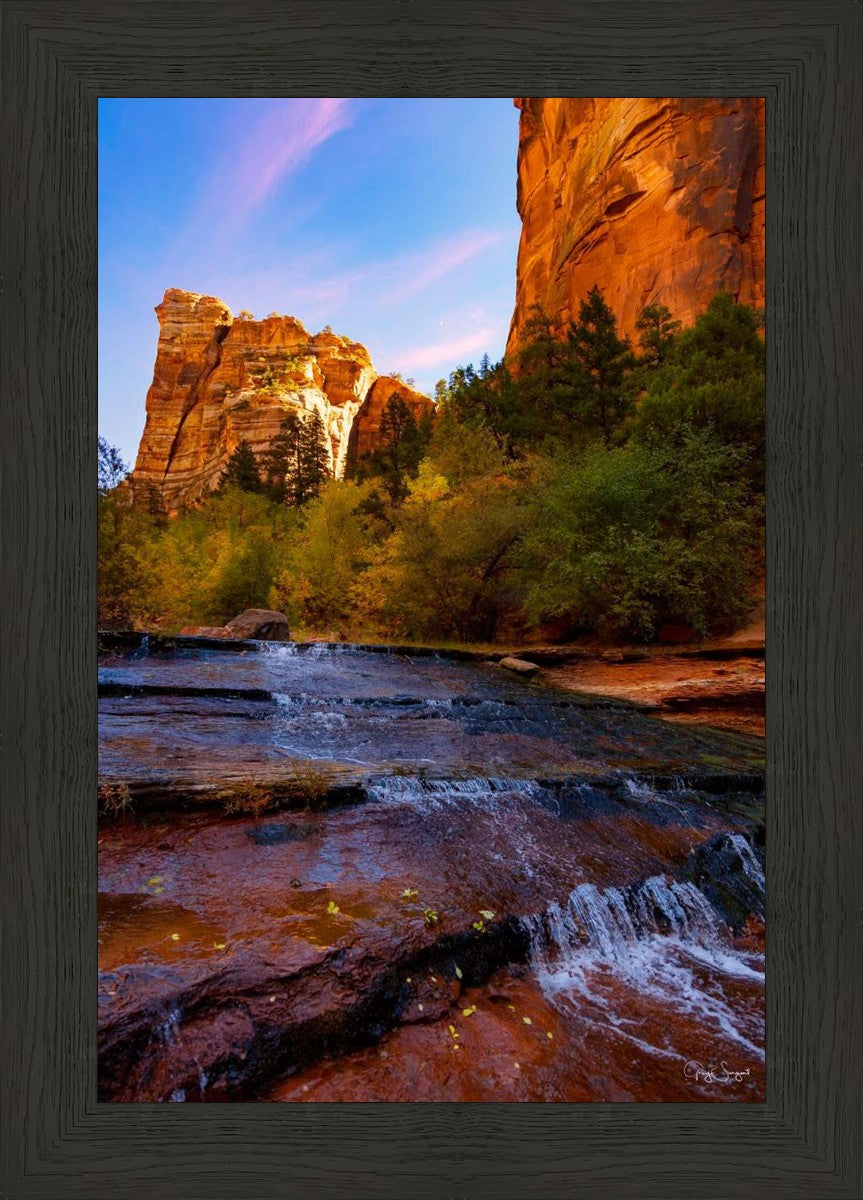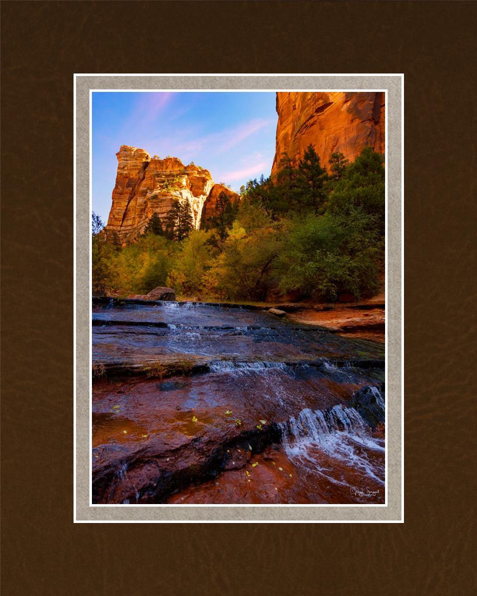 In the shadows, out of the morning sun the light crests a top the nearby cliffs as the water slowly flows over the beautiful red shale.