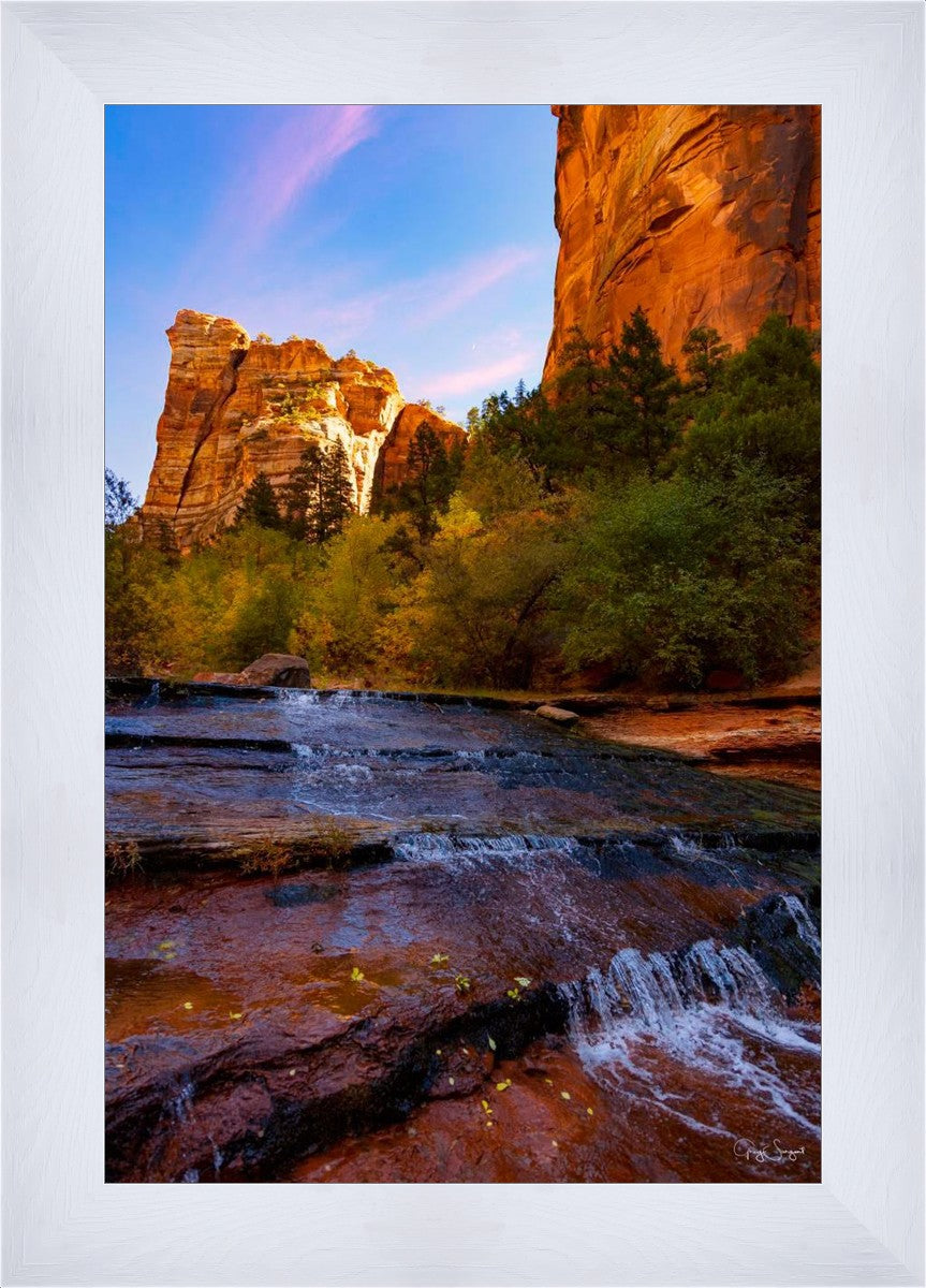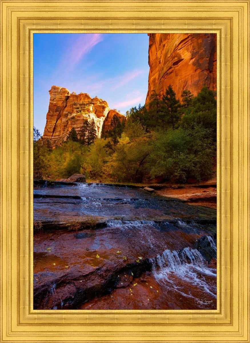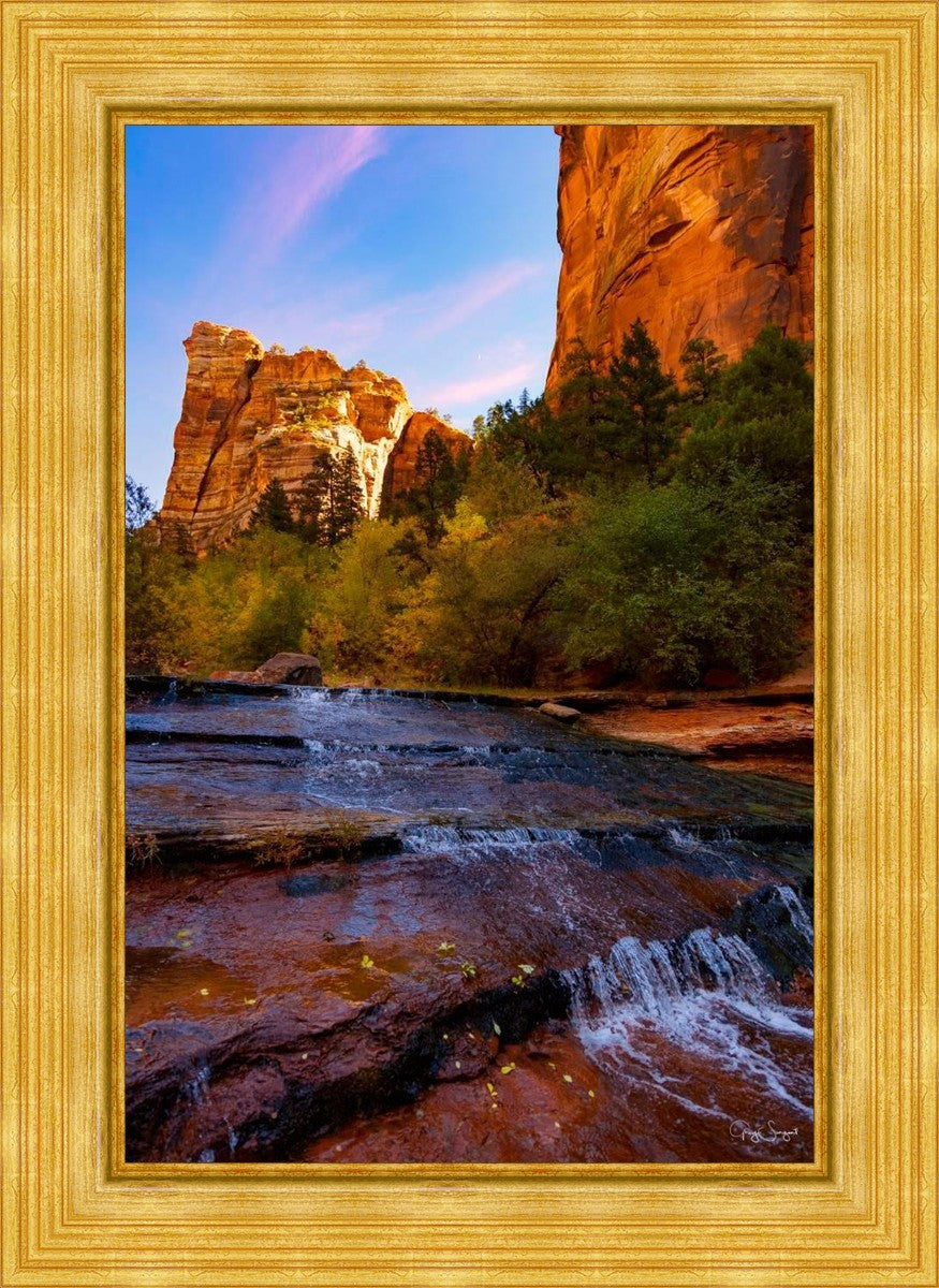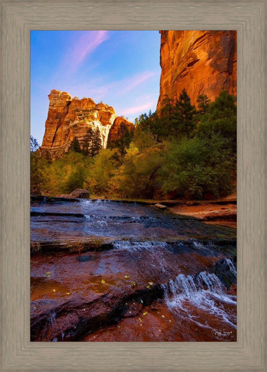 In the shadows, out of the morning sun the light crests a top the nearby cliffs as the water slowly flows over the beautiful red shale.