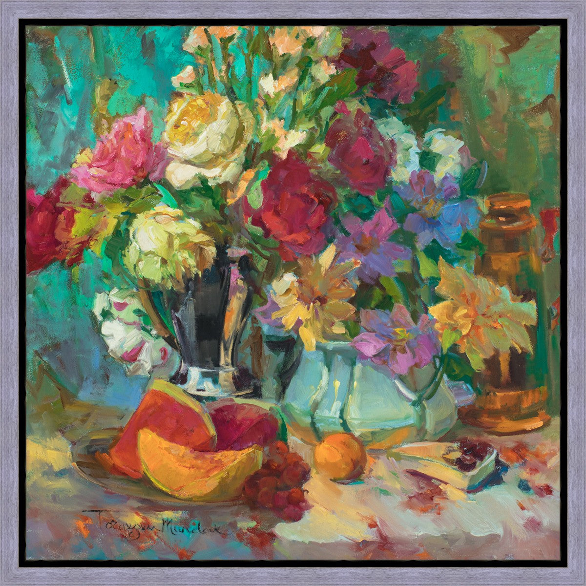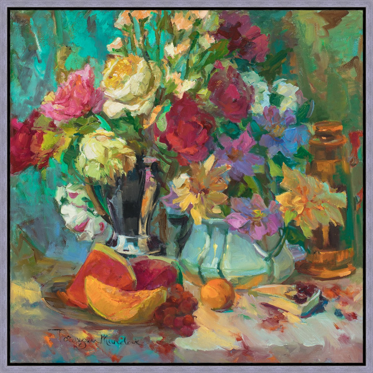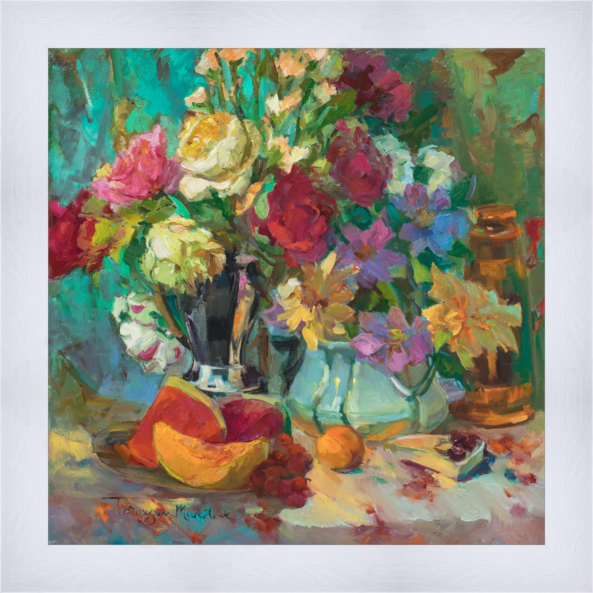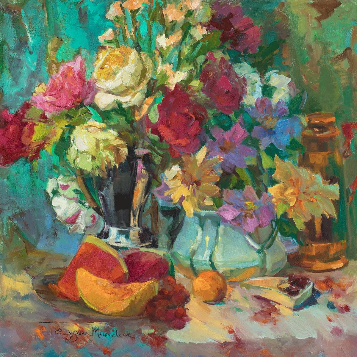My artistic training has concentrated on making colors sing. The blues against the oranges, the warm centers of the flowers making the few petals jump, and the subtle shifts in the qualities of the whites allow for sophisticated color theory. This opulent breakfast set up showcases color, brushstroke, and harmony. It makes the viewer want to be in the picture, to touch the objects, and to be a part of a lovely moment. It is meant to raise the spirits and gladden the heart.