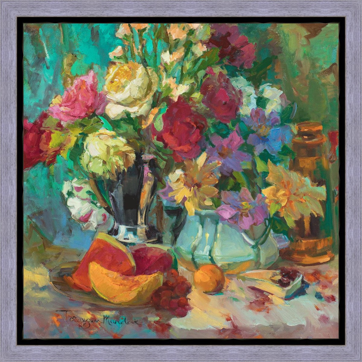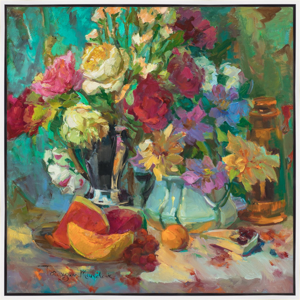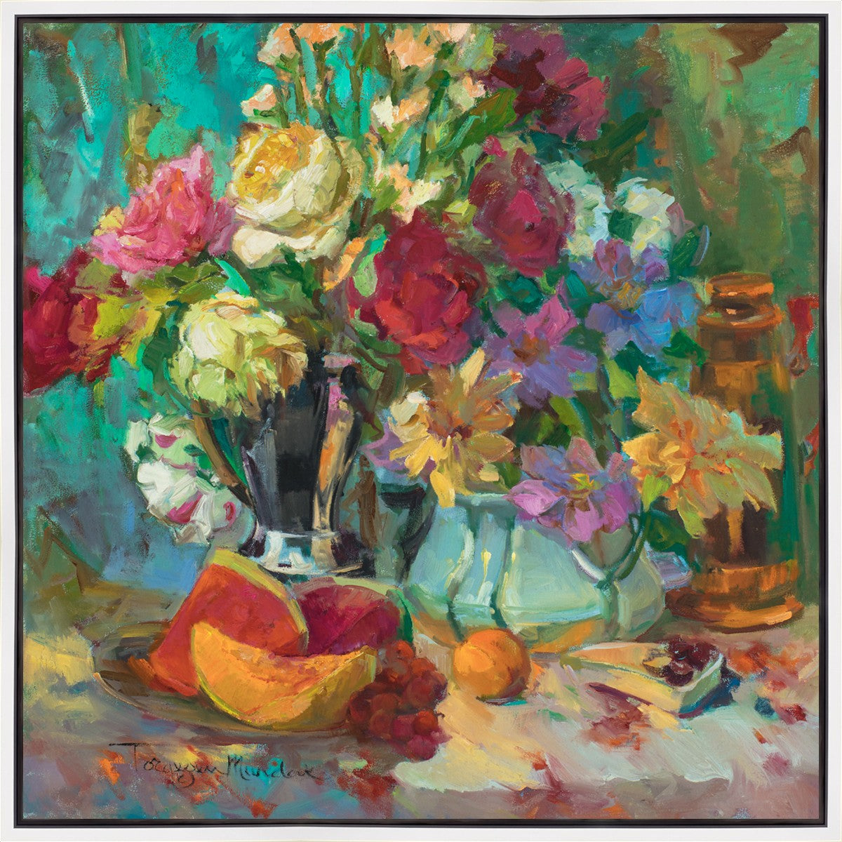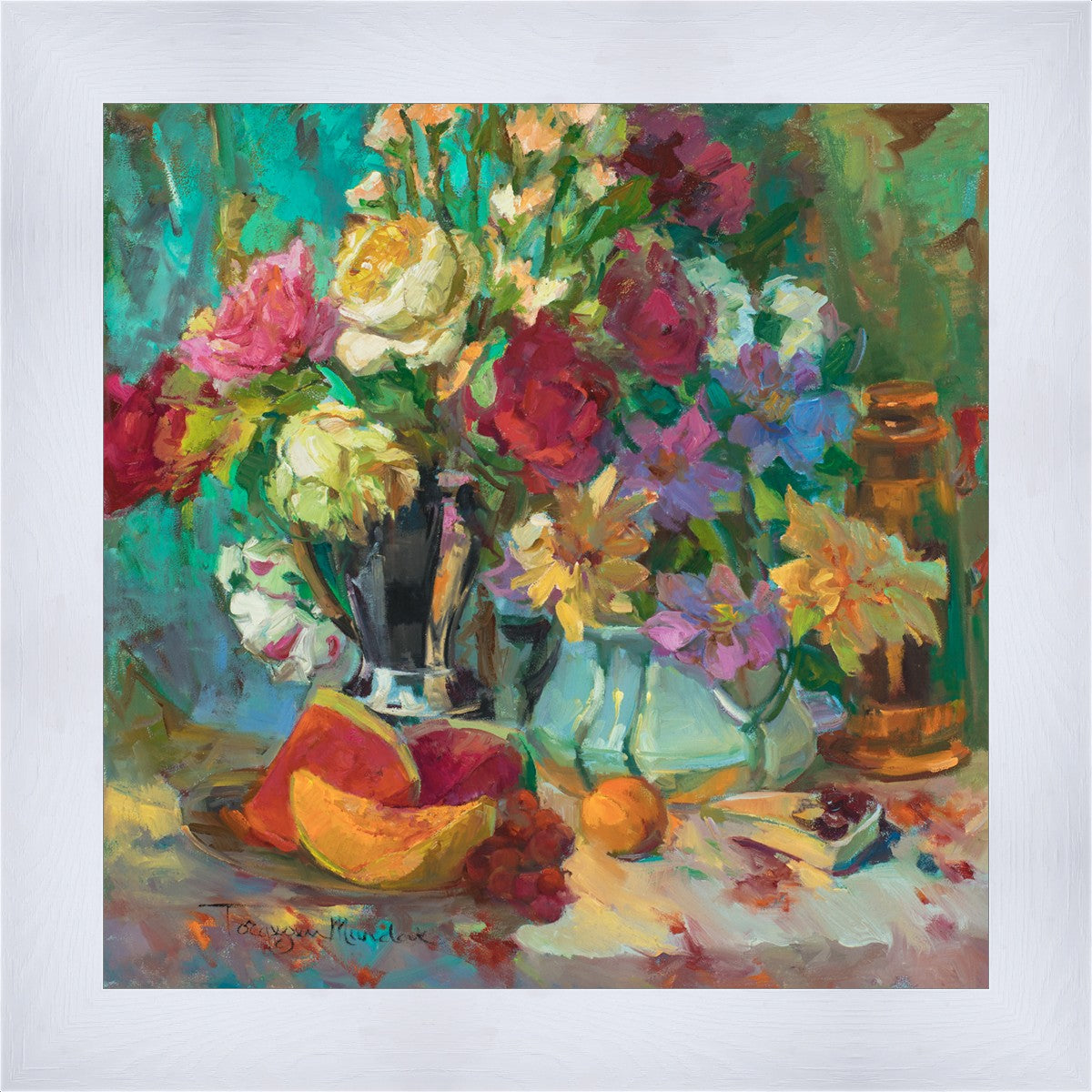 My artistic training has concentrated on making colors sing. The blues against the oranges, the warm centers of the flowers making the few petals jump, and the subtle shifts in the qualities of the whites allow for sophisticated color theory. This opulent breakfast set up showcases color, brushstroke, and harmony. It makes the viewer want to be in the picture, to touch the objects, and to be a part of a lovely moment. It is meant to raise the spirits and gladden the heart.