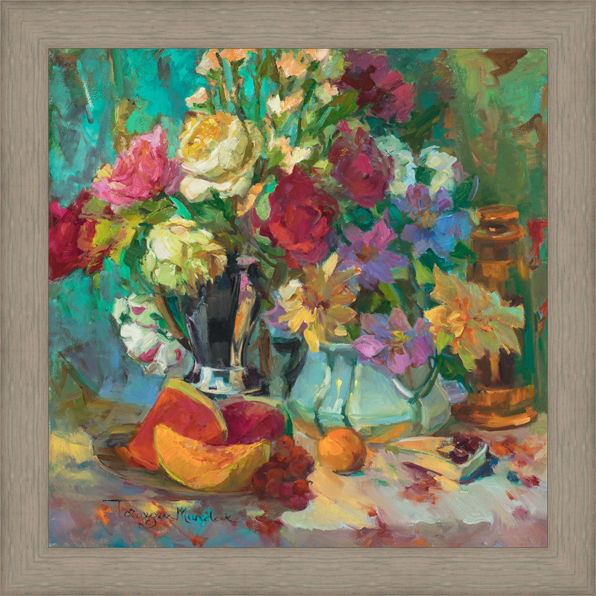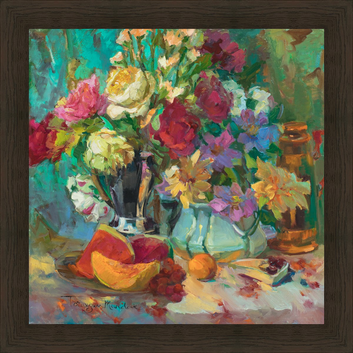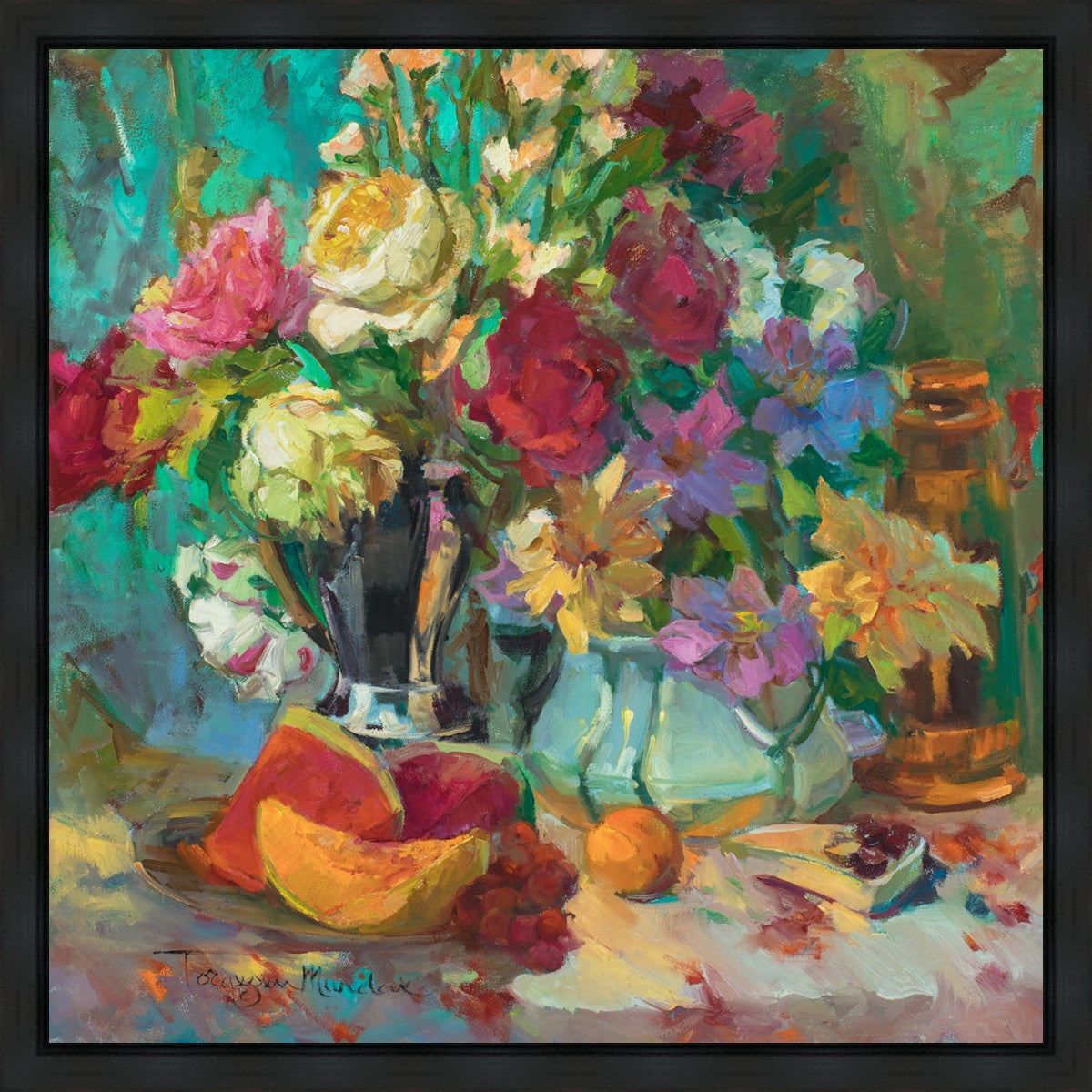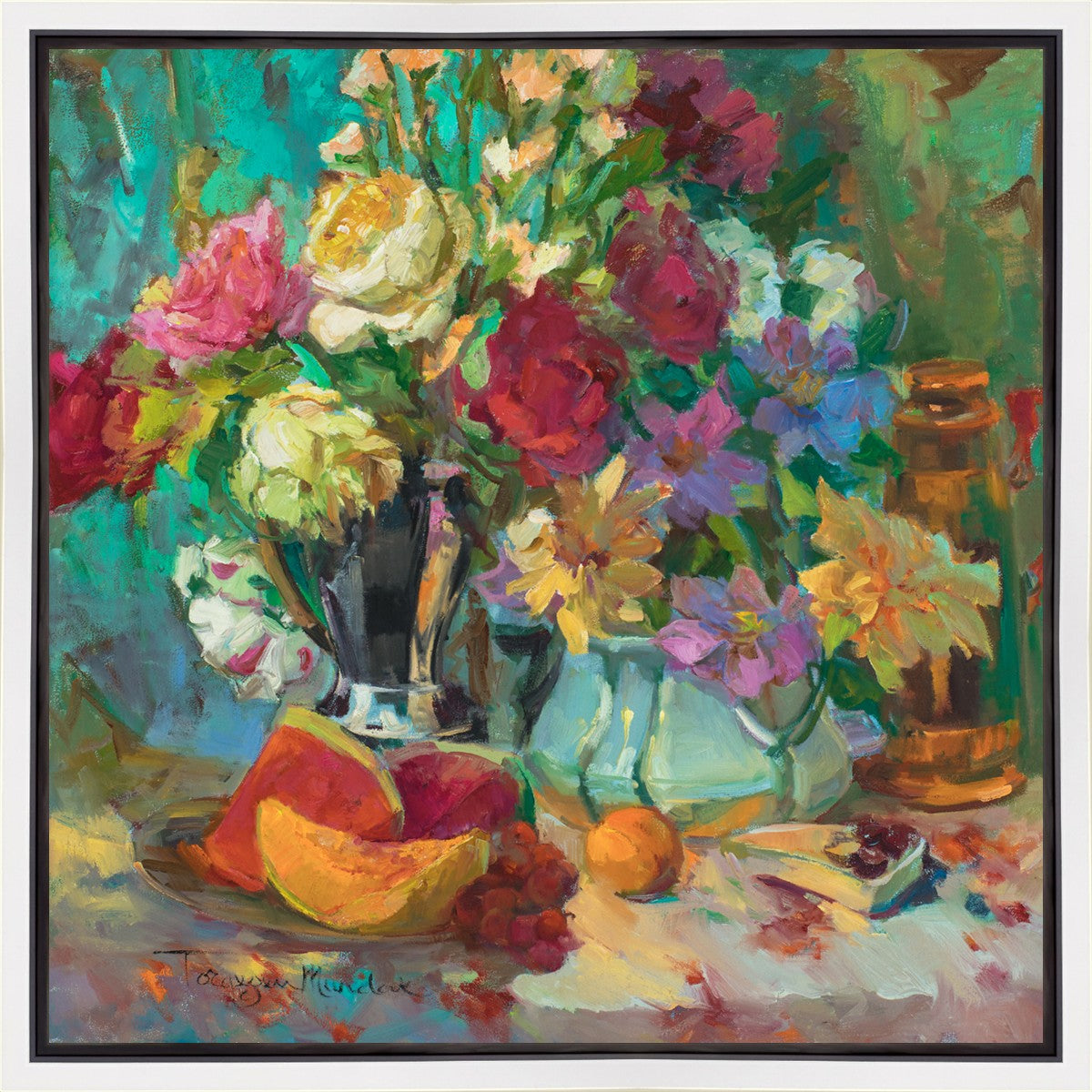 My artistic training has concentrated on making colors sing. The blues against the oranges, the warm centers of the flowers making the few petals jump, and the subtle shifts in the qualities of the whites allow for sophisticated color theory. This opulent breakfast set up showcases color, brushstroke, and harmony. It makes the viewer want to be in the picture, to touch the objects, and to be a part of a lovely moment. It is meant to raise the spirits and gladden the heart.