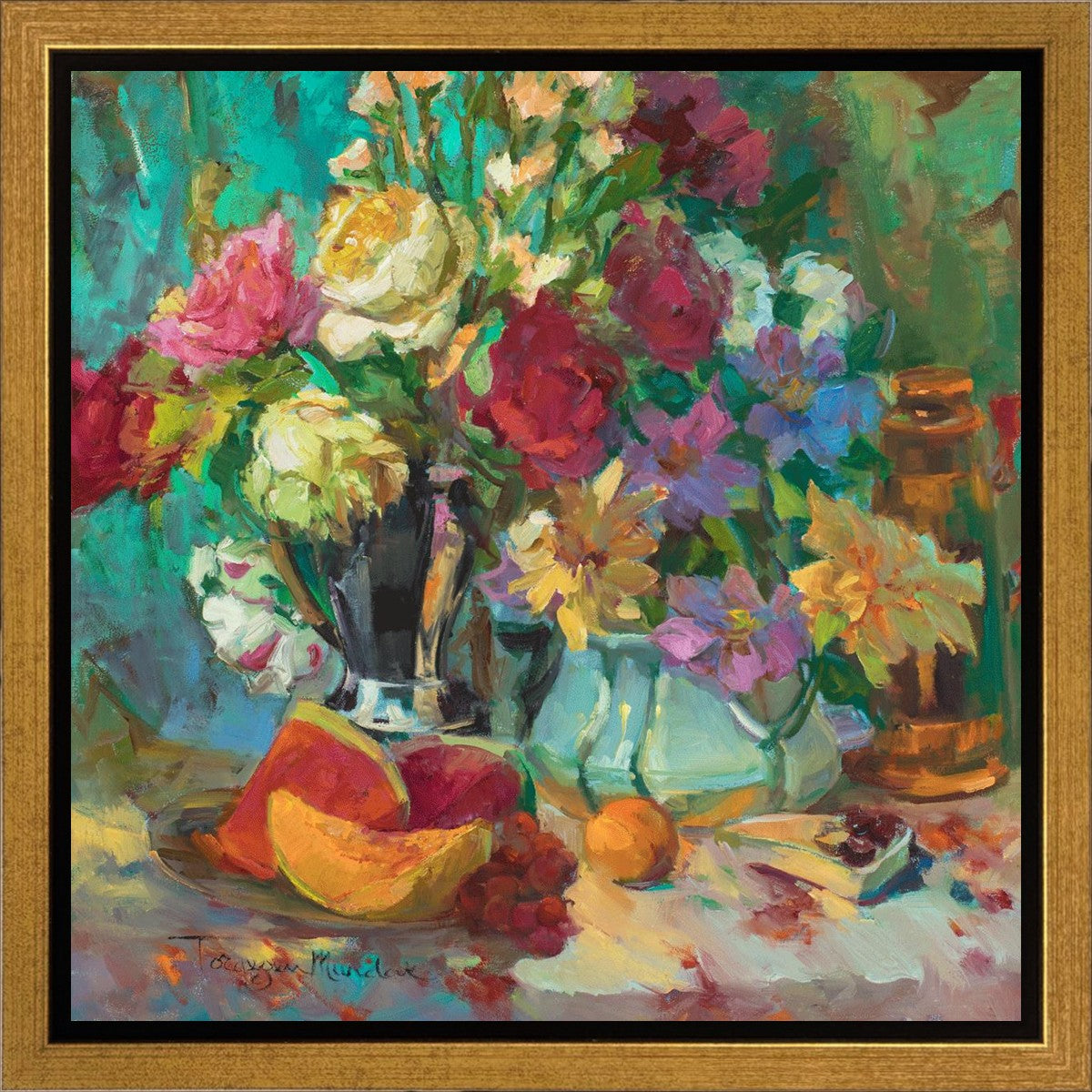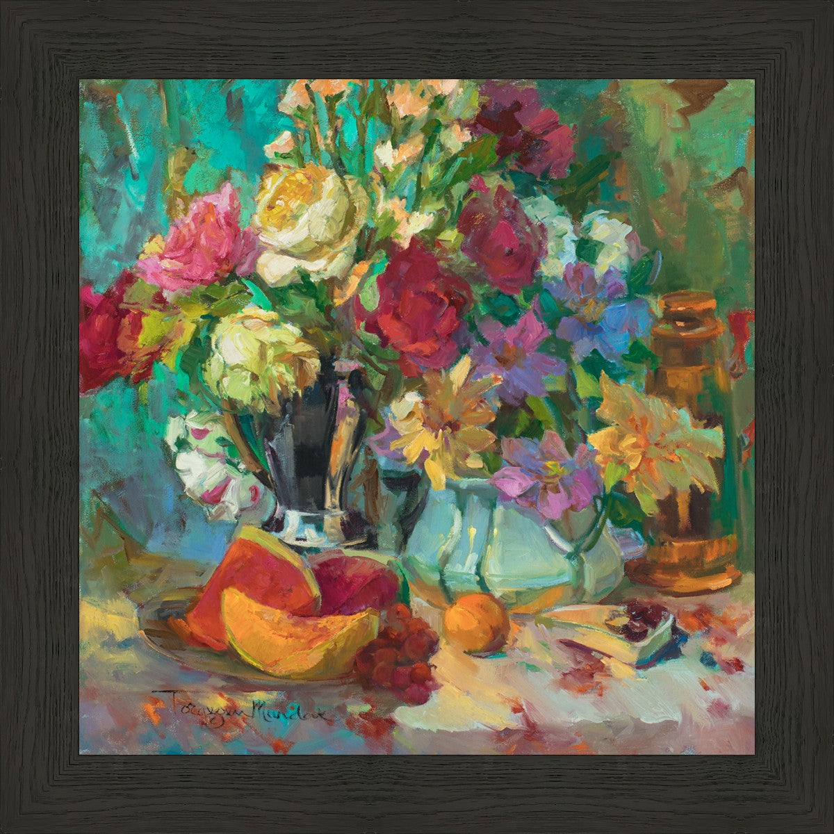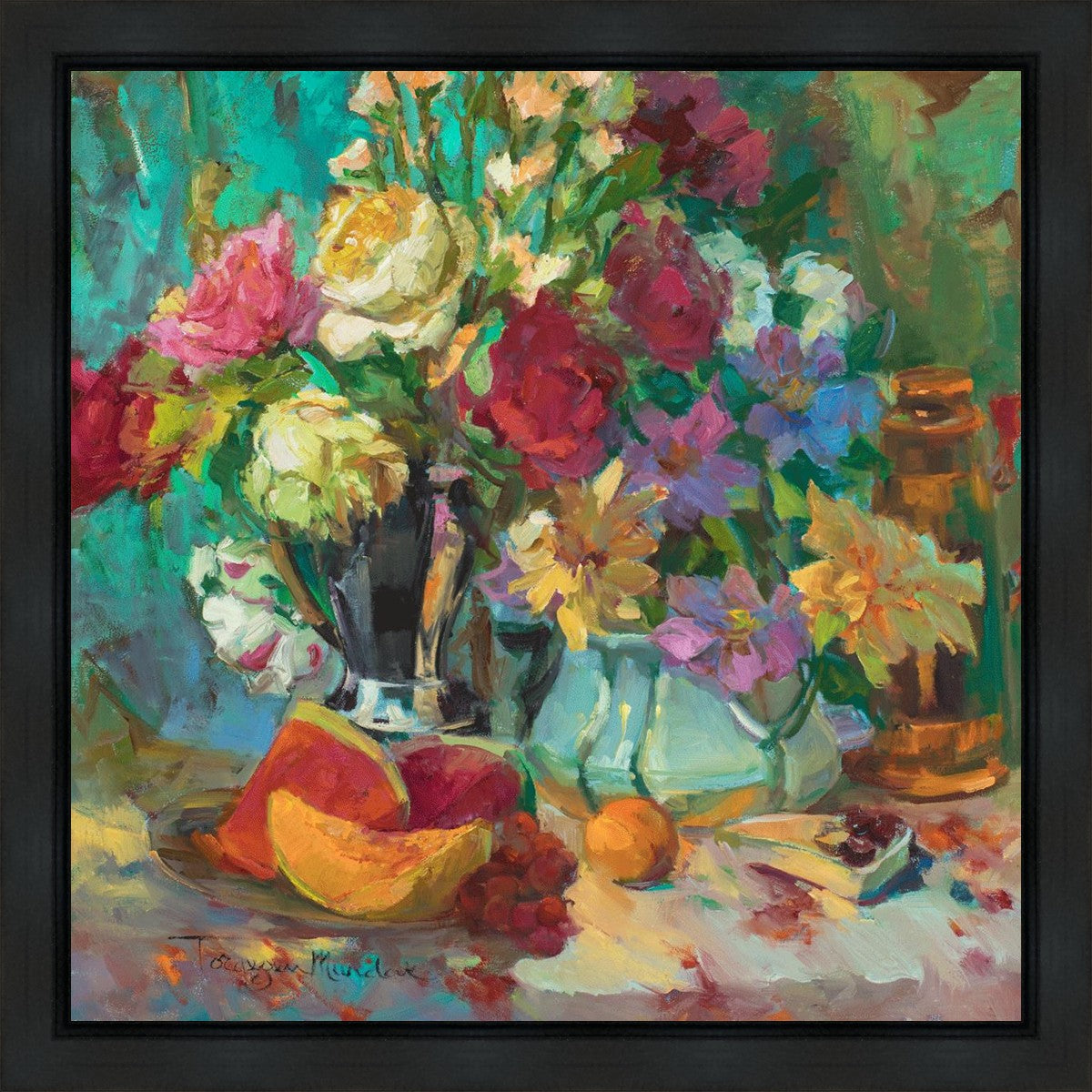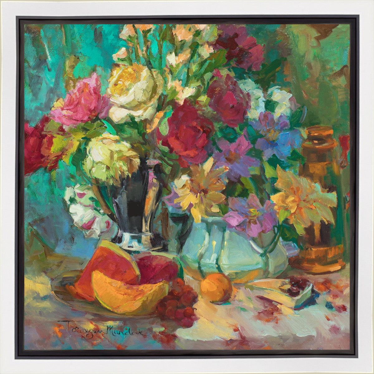 My artistic training has concentrated on making colors sing. The blues against the oranges, the warm centers of the flowers making the few petals jump, and the subtle shifts in the qualities of the whites allow for sophisticated color theory. This opulent breakfast set up showcases color, brushstroke, and harmony. It makes the viewer want to be in the picture, to touch the objects, and to be a part of a lovely moment. It is meant to raise the spirits and gladden the heart.