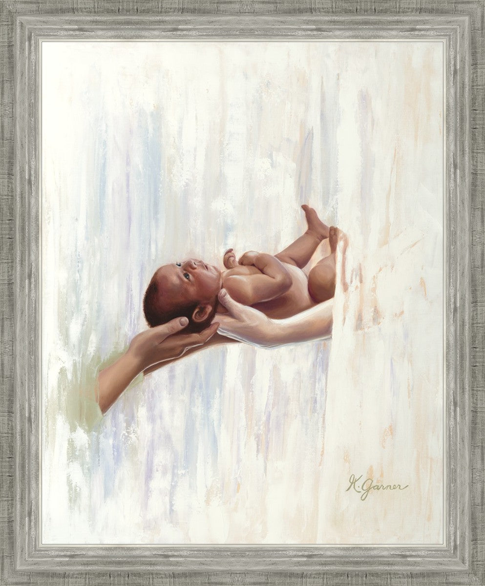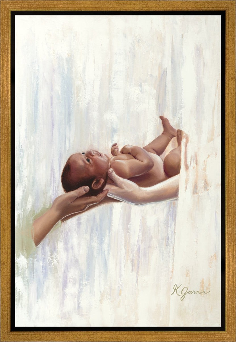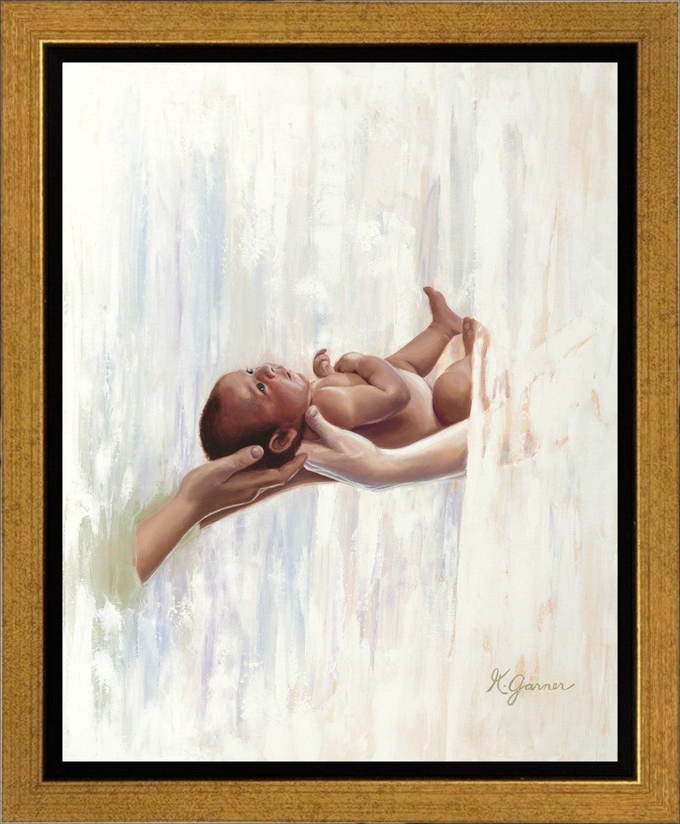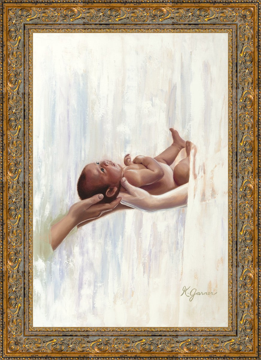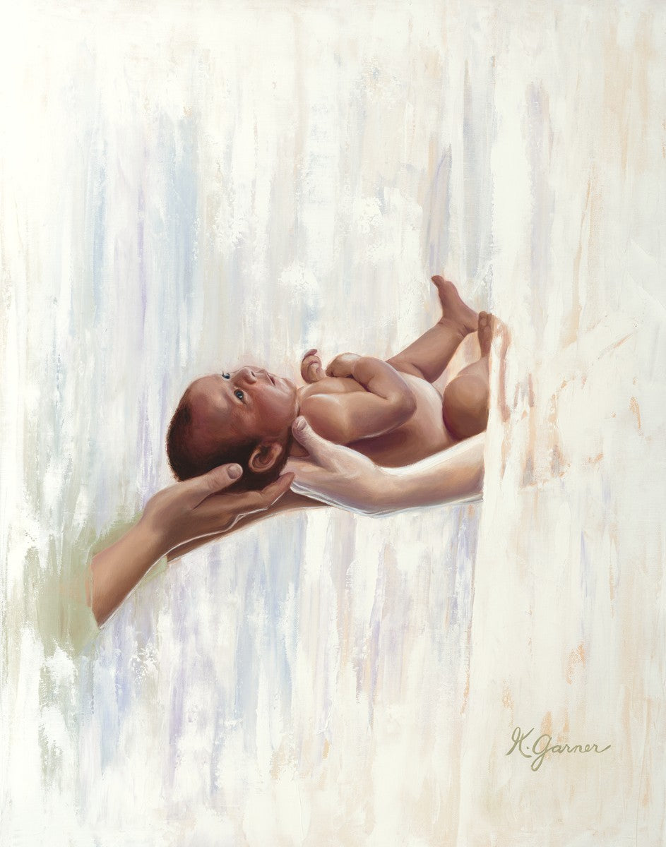 "Mother to Mother" by Katie Garner depicts a touching scene of a heavenly mother passing a child through the veil to an earthly mother, symbolizing the bond between heaven and earth. This heartfelt artwork captures the essence of maternal love, spiritual connection, and the eternal journey of motherhood, resonating with viewers seeking comfort and hope.