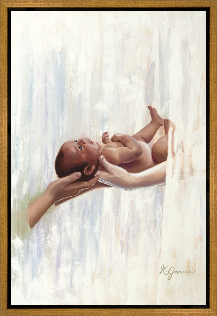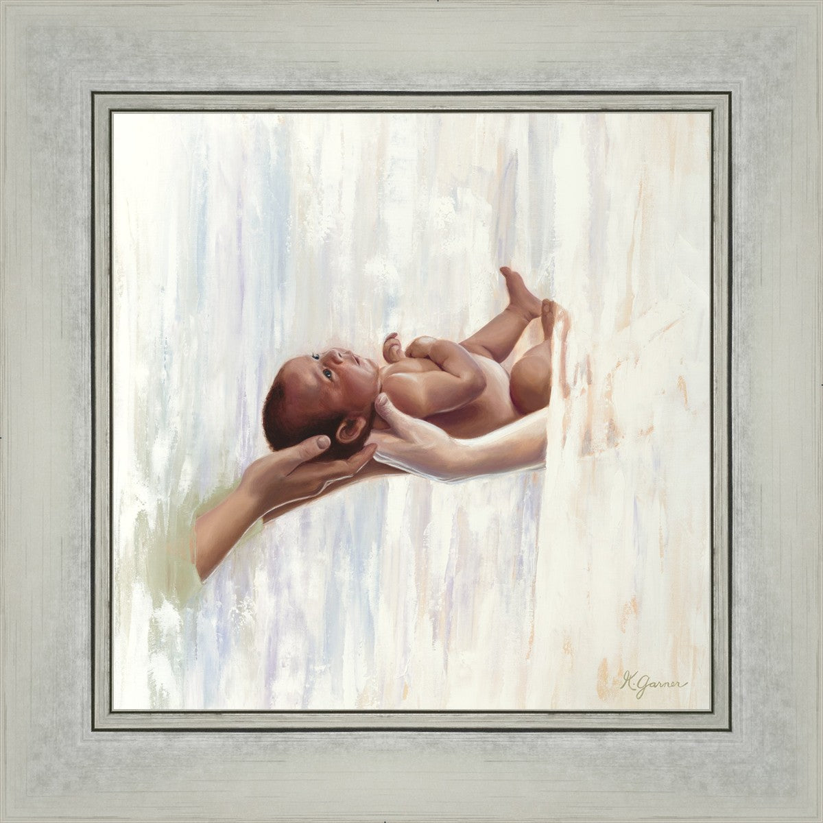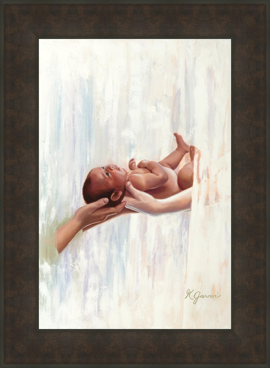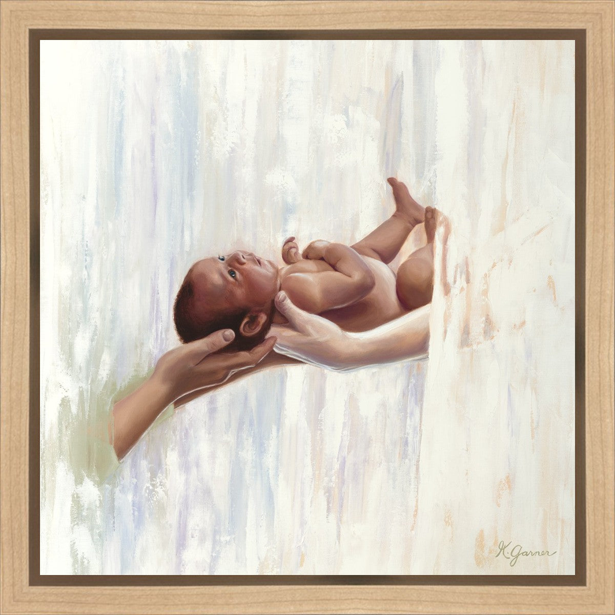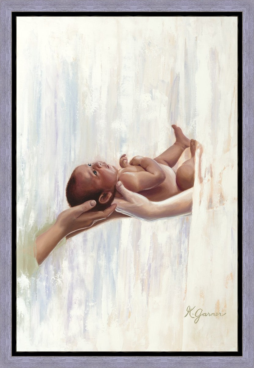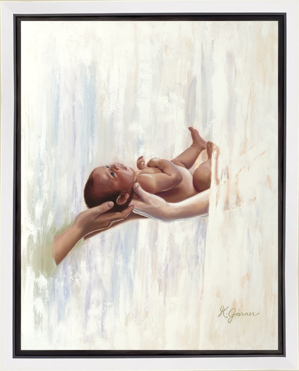 "Mother to Mother" by Katie Garner depicts a touching scene of a heavenly mother passing a child through the veil to an earthly mother, symbolizing the bond between heaven and earth. This heartfelt artwork captures the essence of maternal love, spiritual connection, and the eternal journey of motherhood, resonating with viewers seeking comfort and hope.