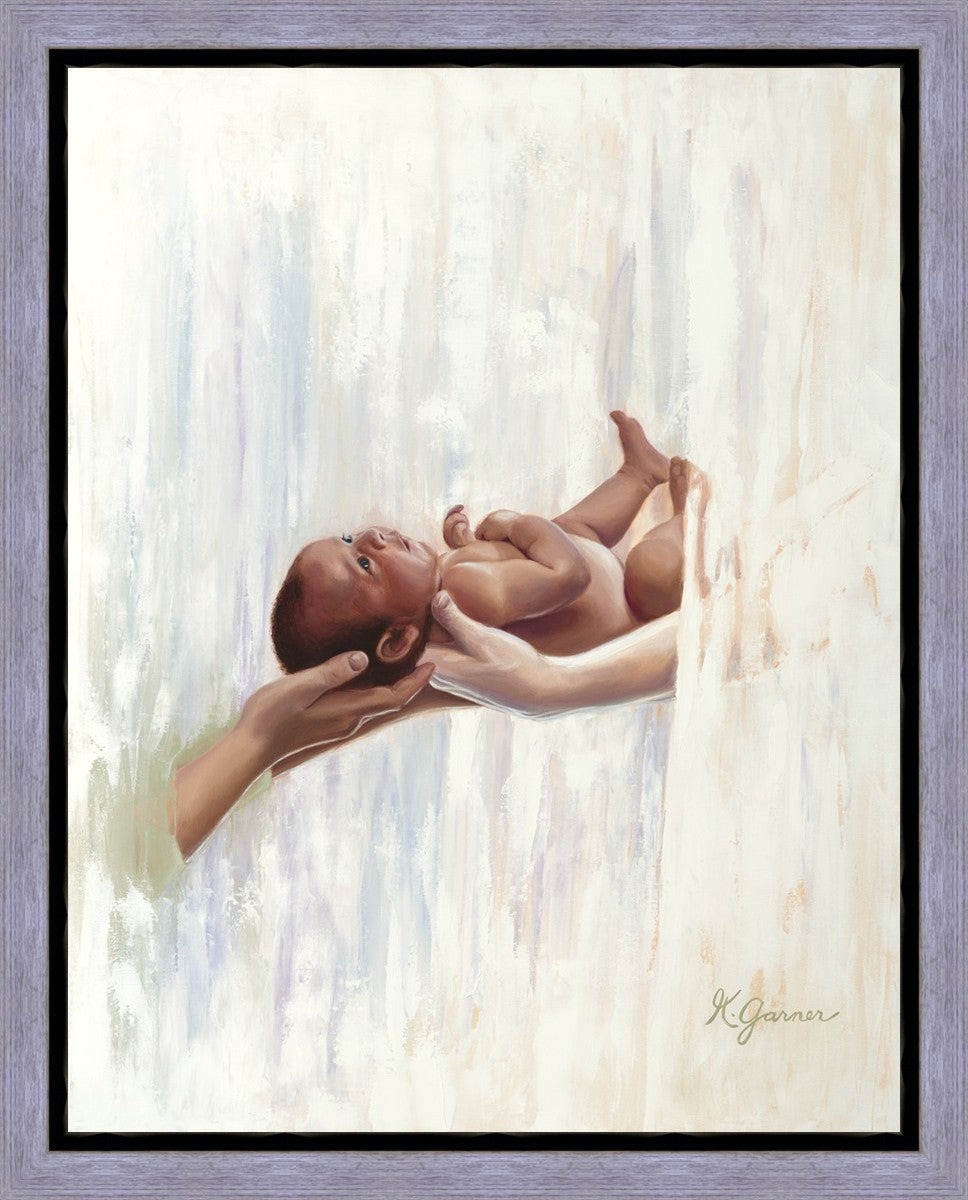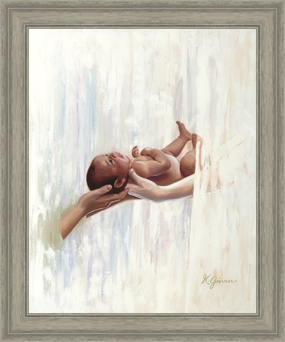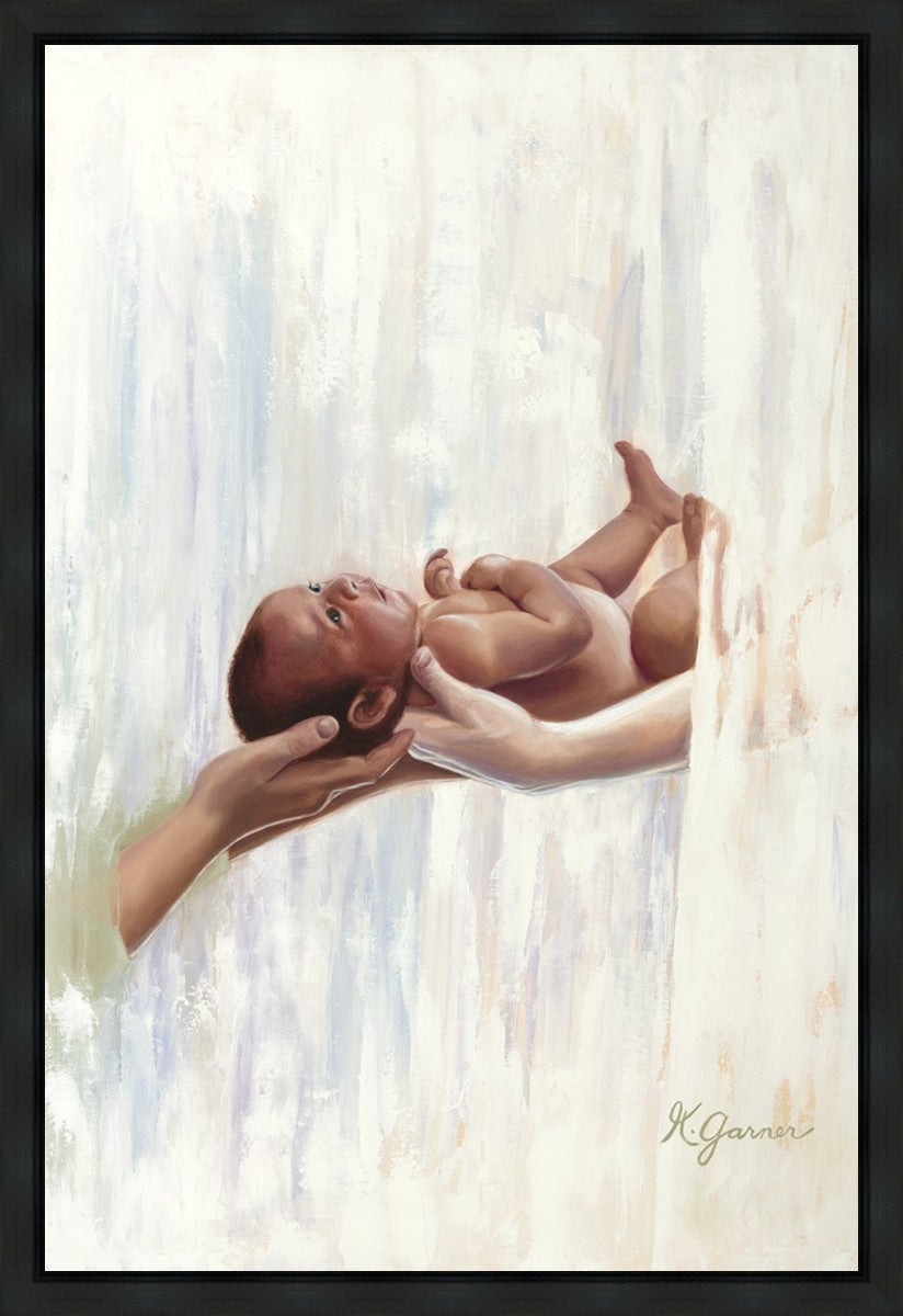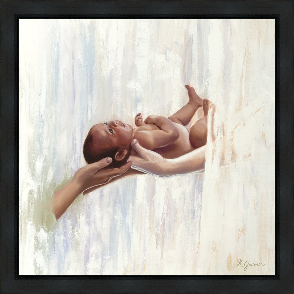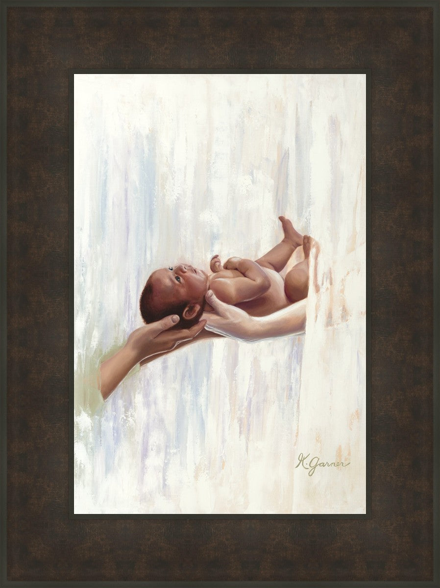 "Mother to Mother" by Katie Garner depicts a touching scene of a heavenly mother passing a child through the veil to an earthly mother, symbolizing the bond between heaven and earth. This heartfelt artwork captures the essence of maternal love, spiritual connection, and the eternal journey of motherhood, resonating with viewers seeking comfort and hope.