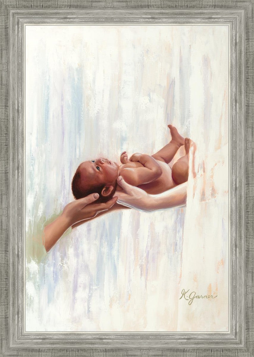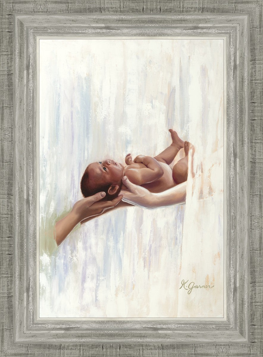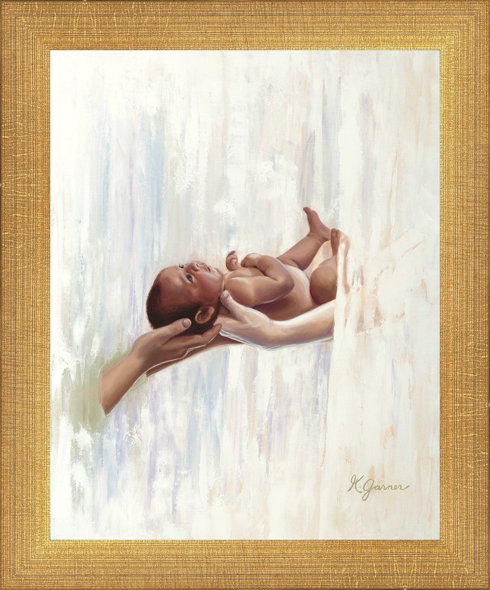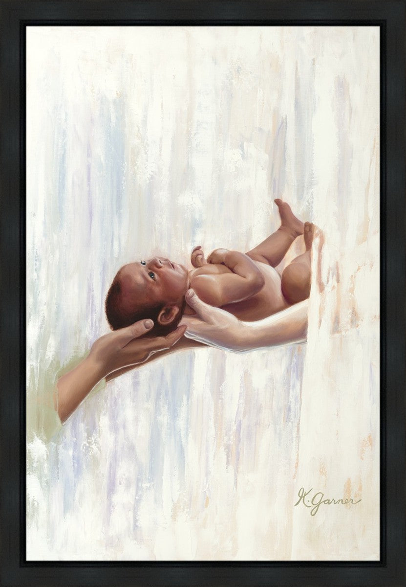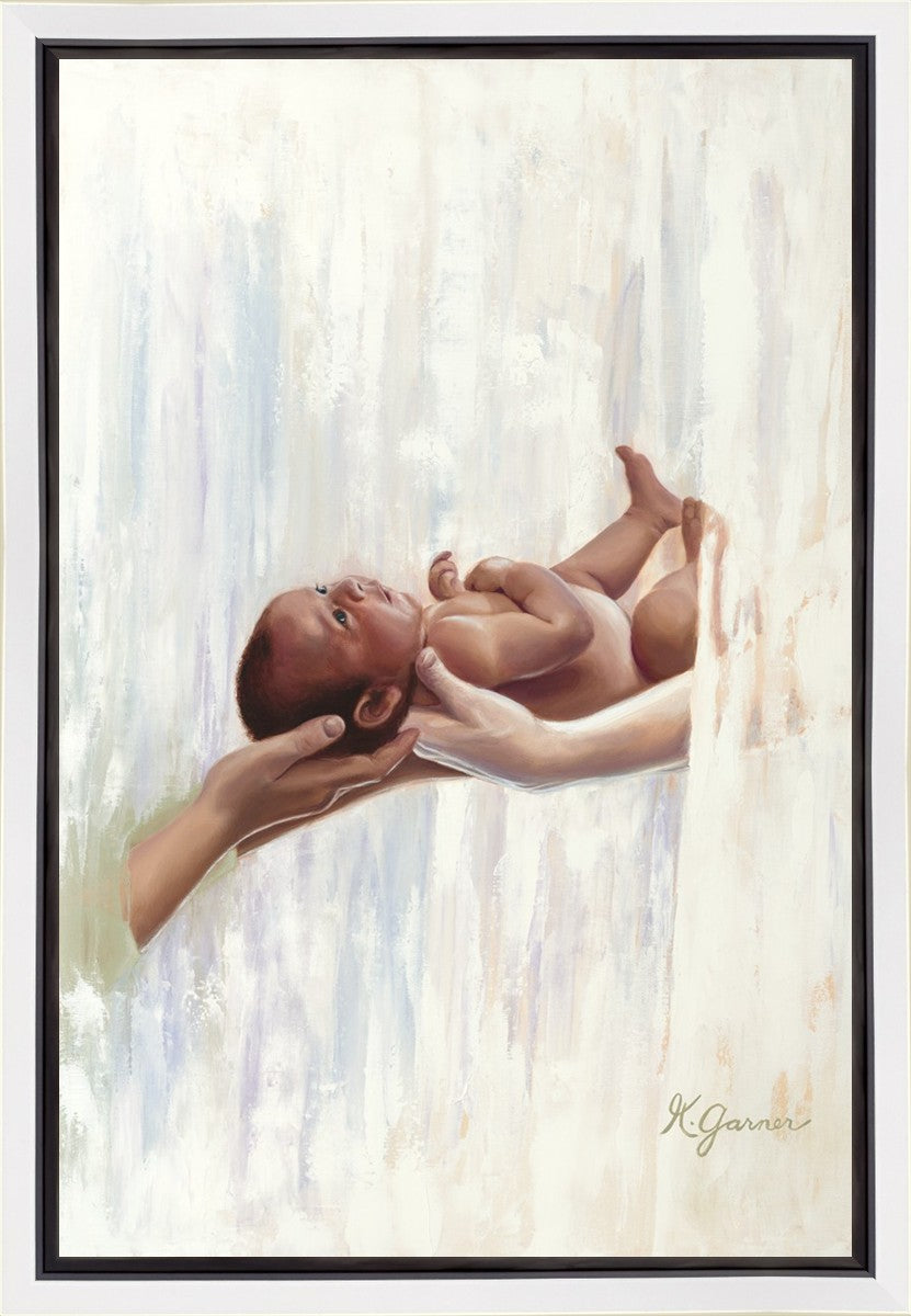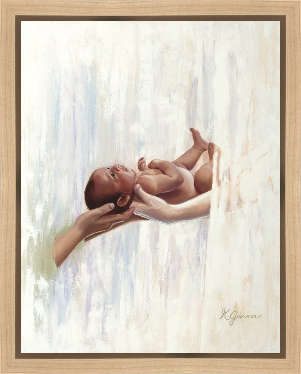 "Mother to Mother" by Katie Garner depicts a touching scene of a heavenly mother passing a child through the veil to an earthly mother, symbolizing the bond between heaven and earth. This heartfelt artwork captures the essence of maternal love, spiritual connection, and the eternal journey of motherhood, resonating with viewers seeking comfort and hope.
