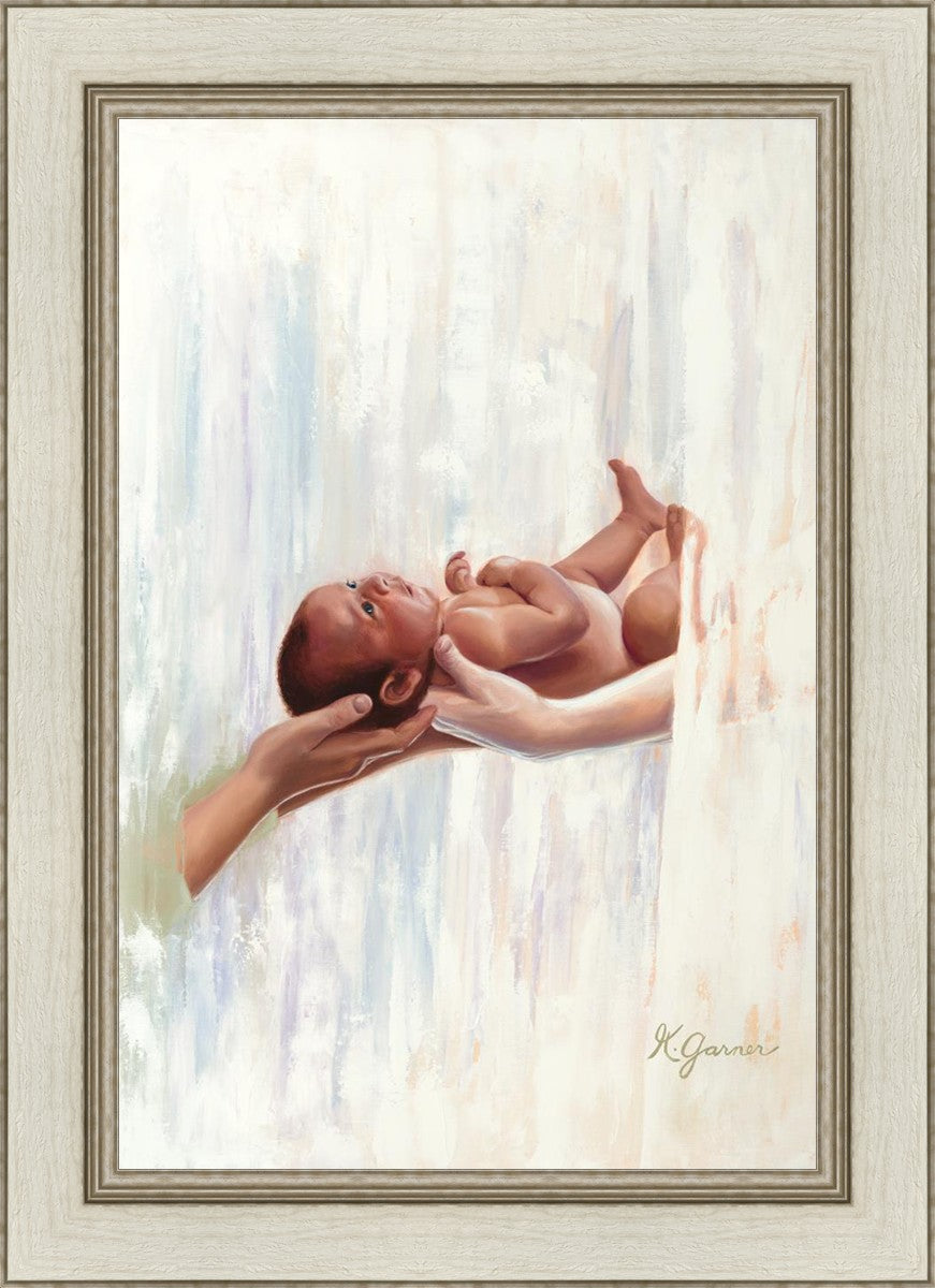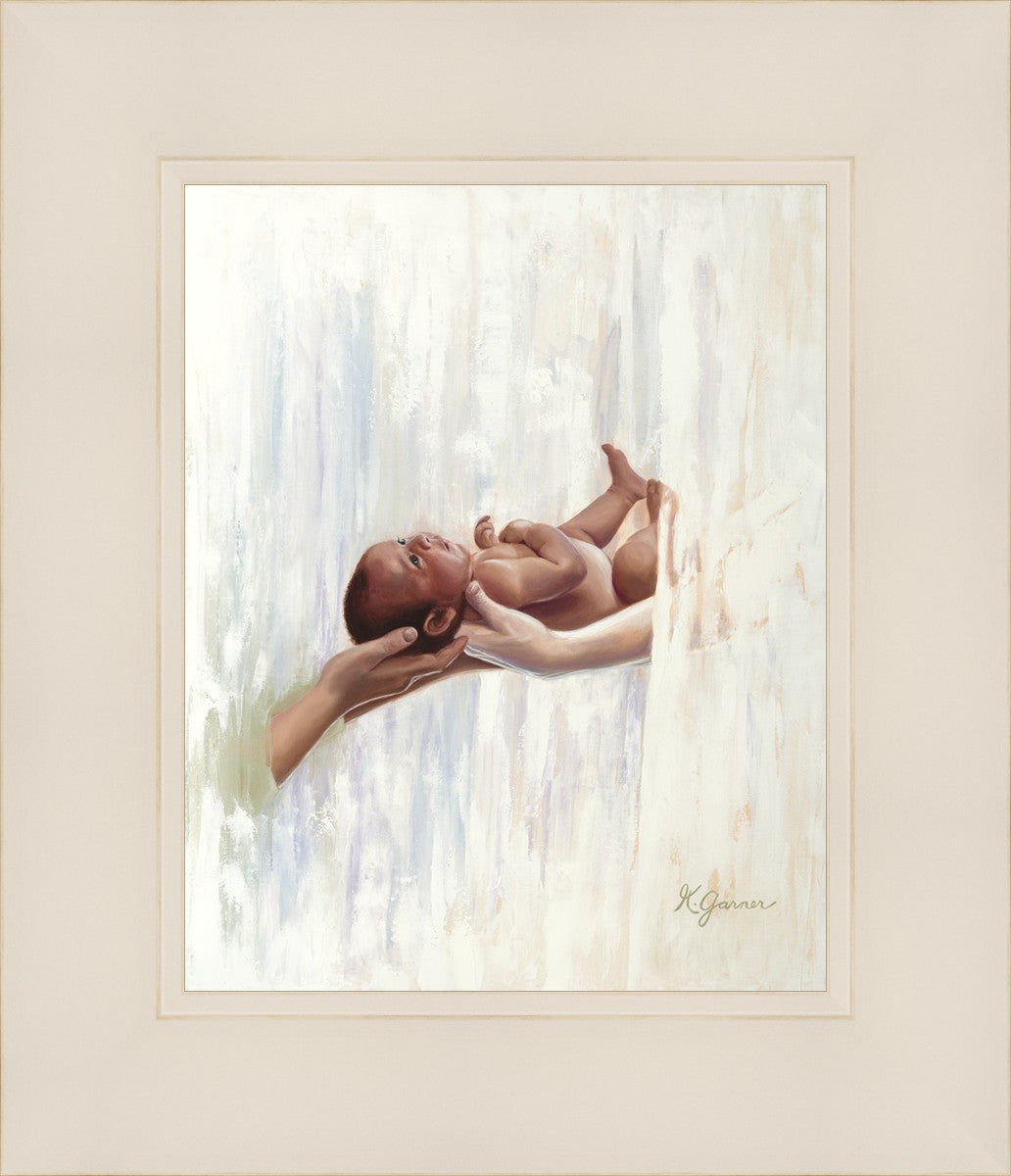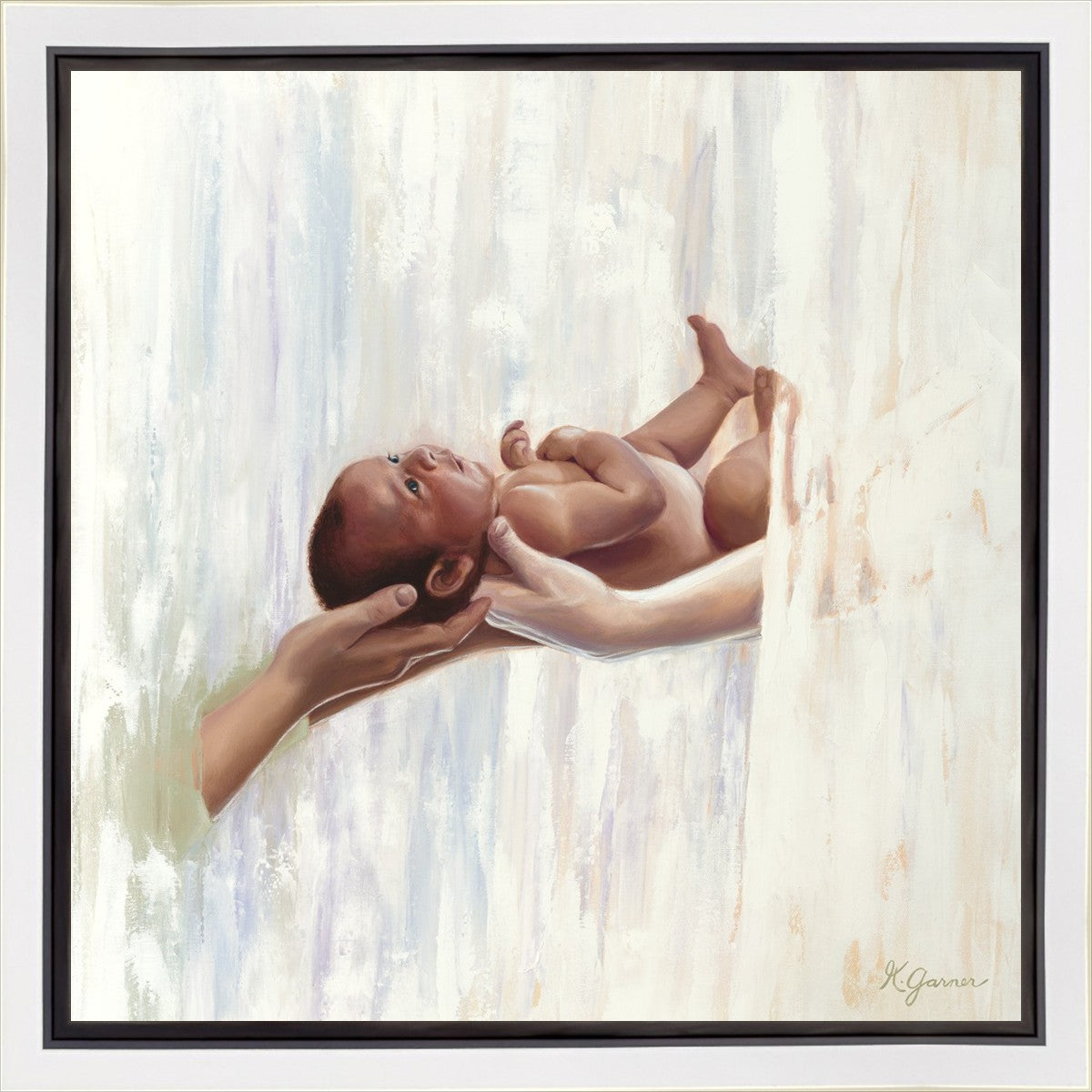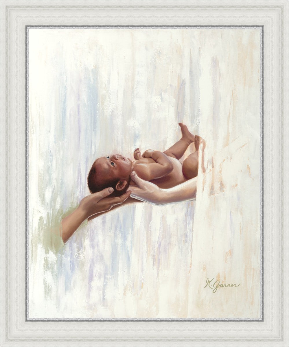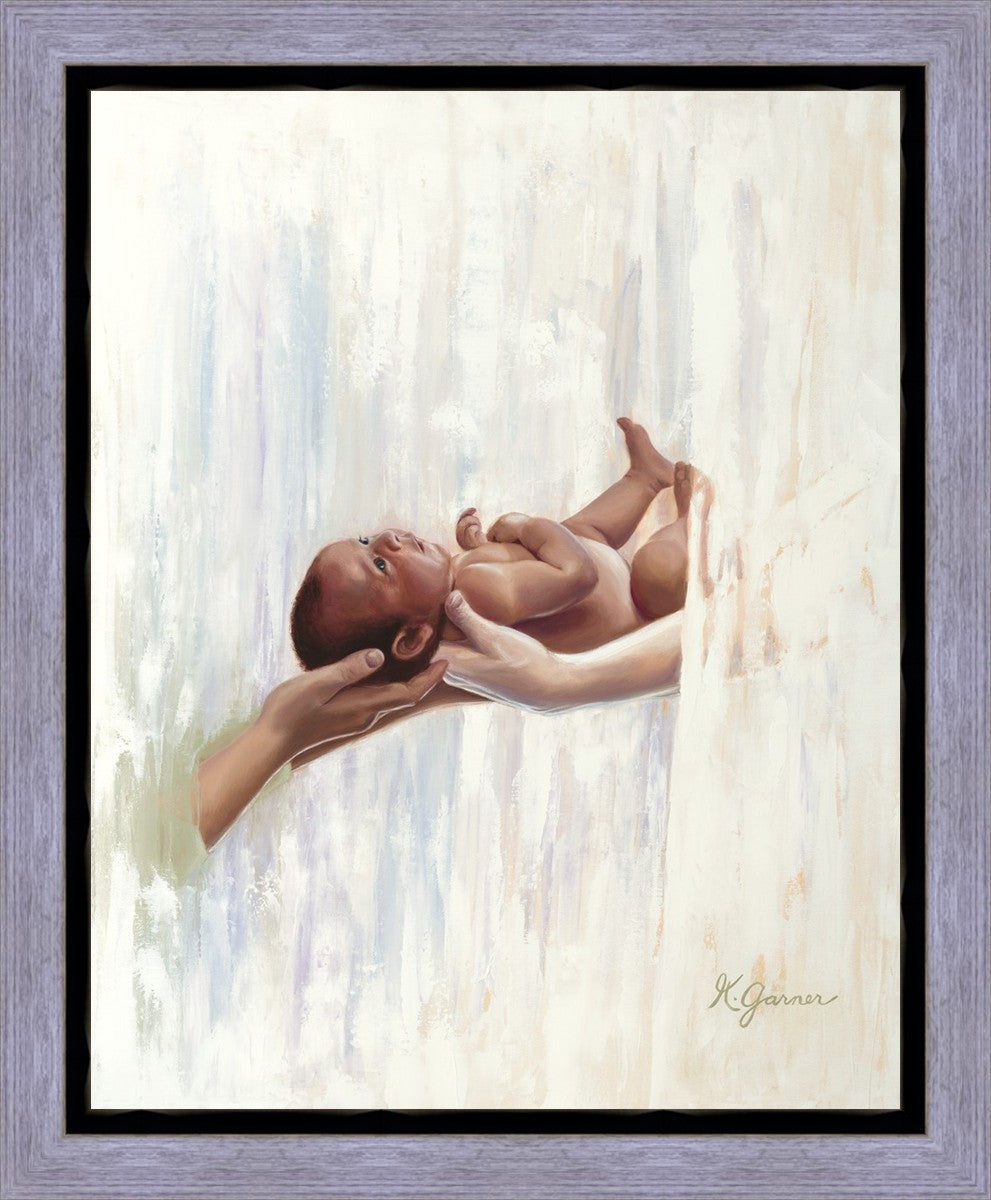 "Mother to Mother" by Katie Garner depicts a touching scene of a heavenly mother passing a child through the veil to an earthly mother, symbolizing the bond between heaven and earth. This heartfelt artwork captures the essence of maternal love, spiritual connection, and the eternal journey of motherhood, resonating with viewers seeking comfort and hope.