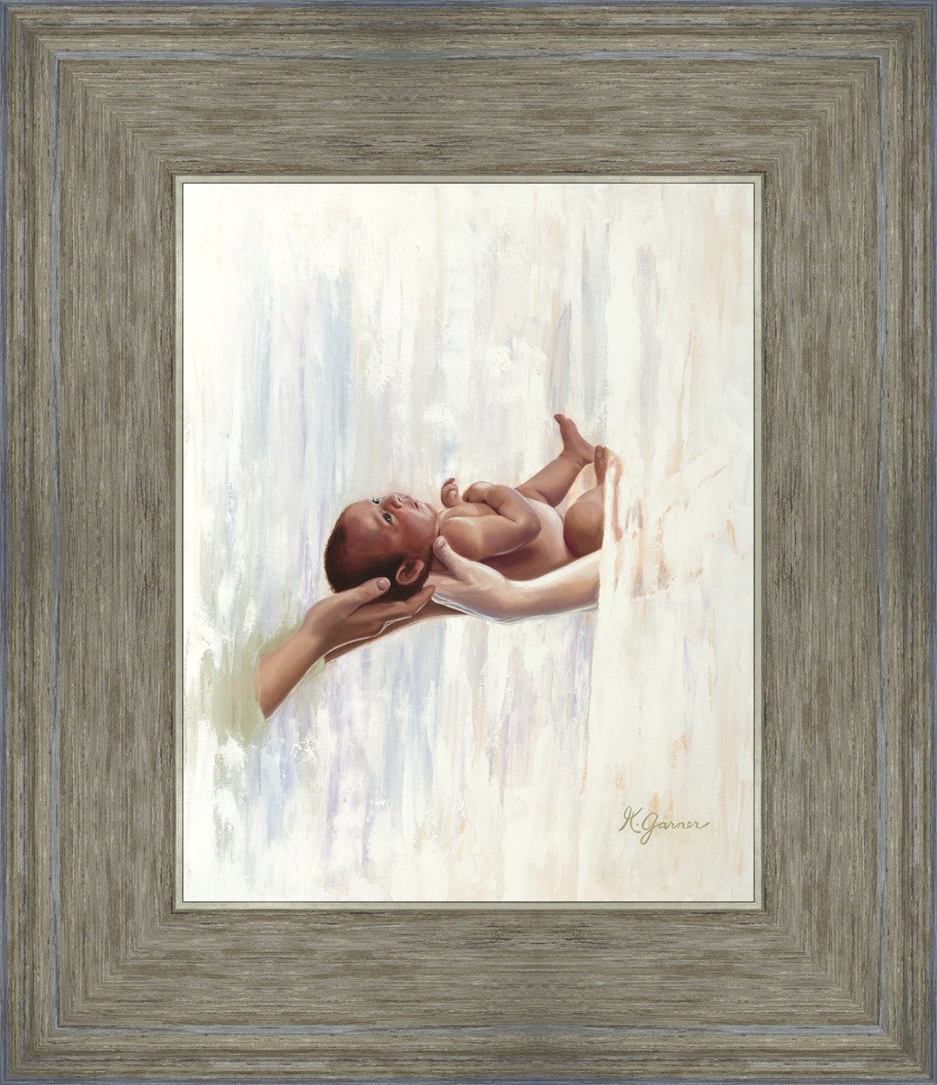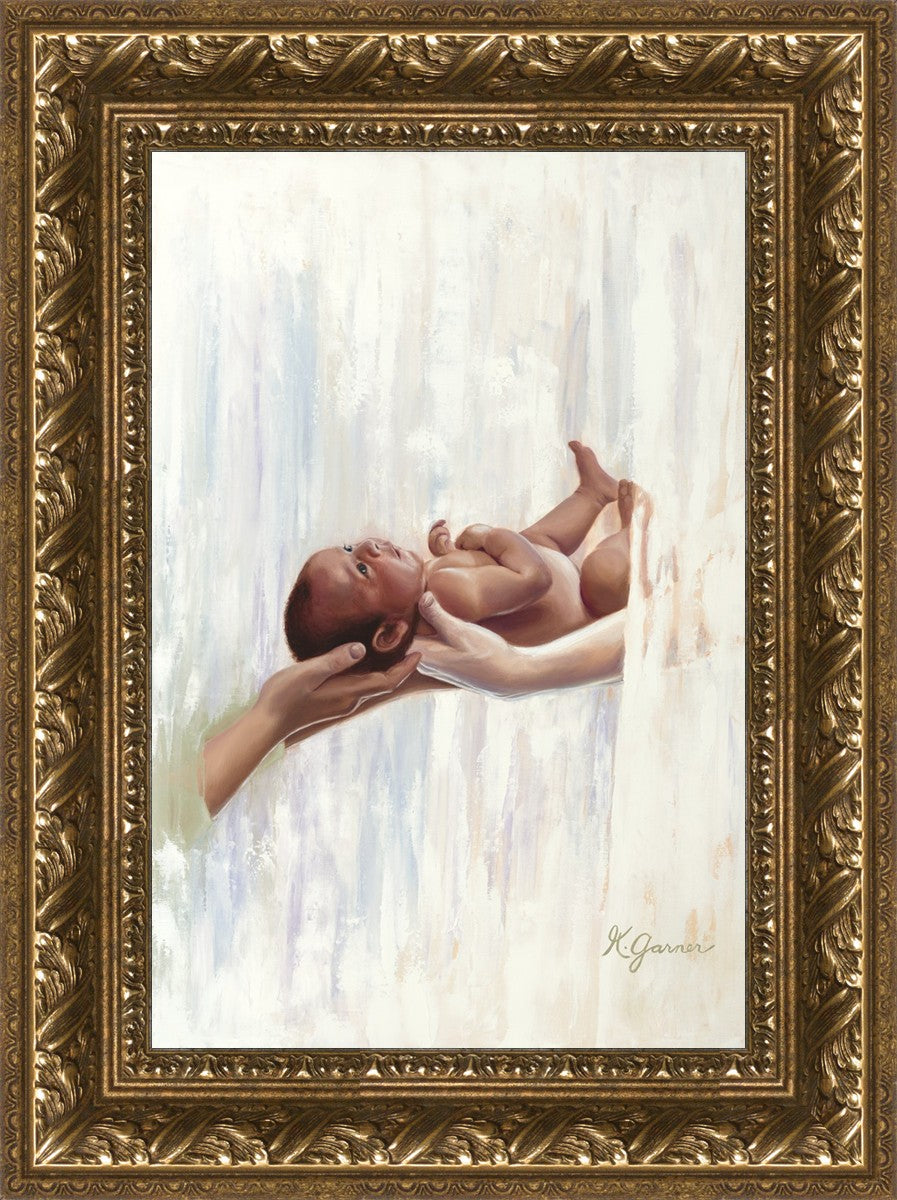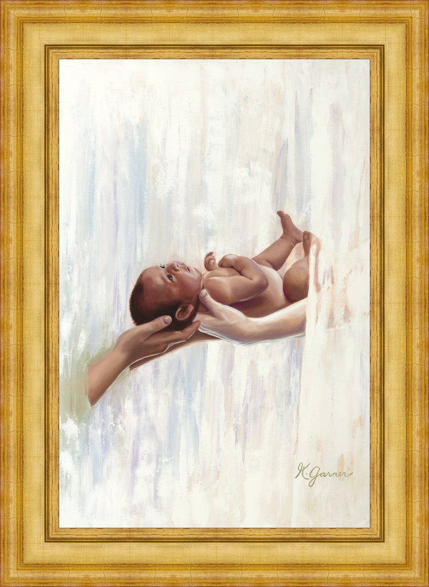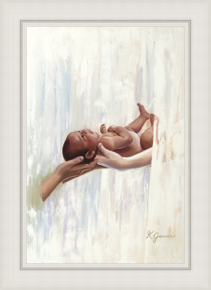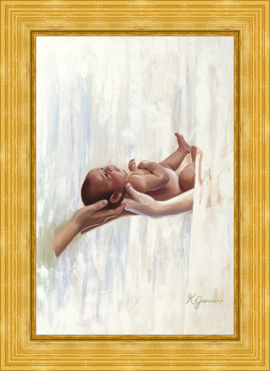 "Mother to Mother" by Katie Garner depicts a touching scene of a heavenly mother passing a child through the veil to an earthly mother, symbolizing the bond between heaven and earth. This heartfelt artwork captures the essence of maternal love, spiritual connection, and the eternal journey of motherhood, resonating with viewers seeking comfort and hope.