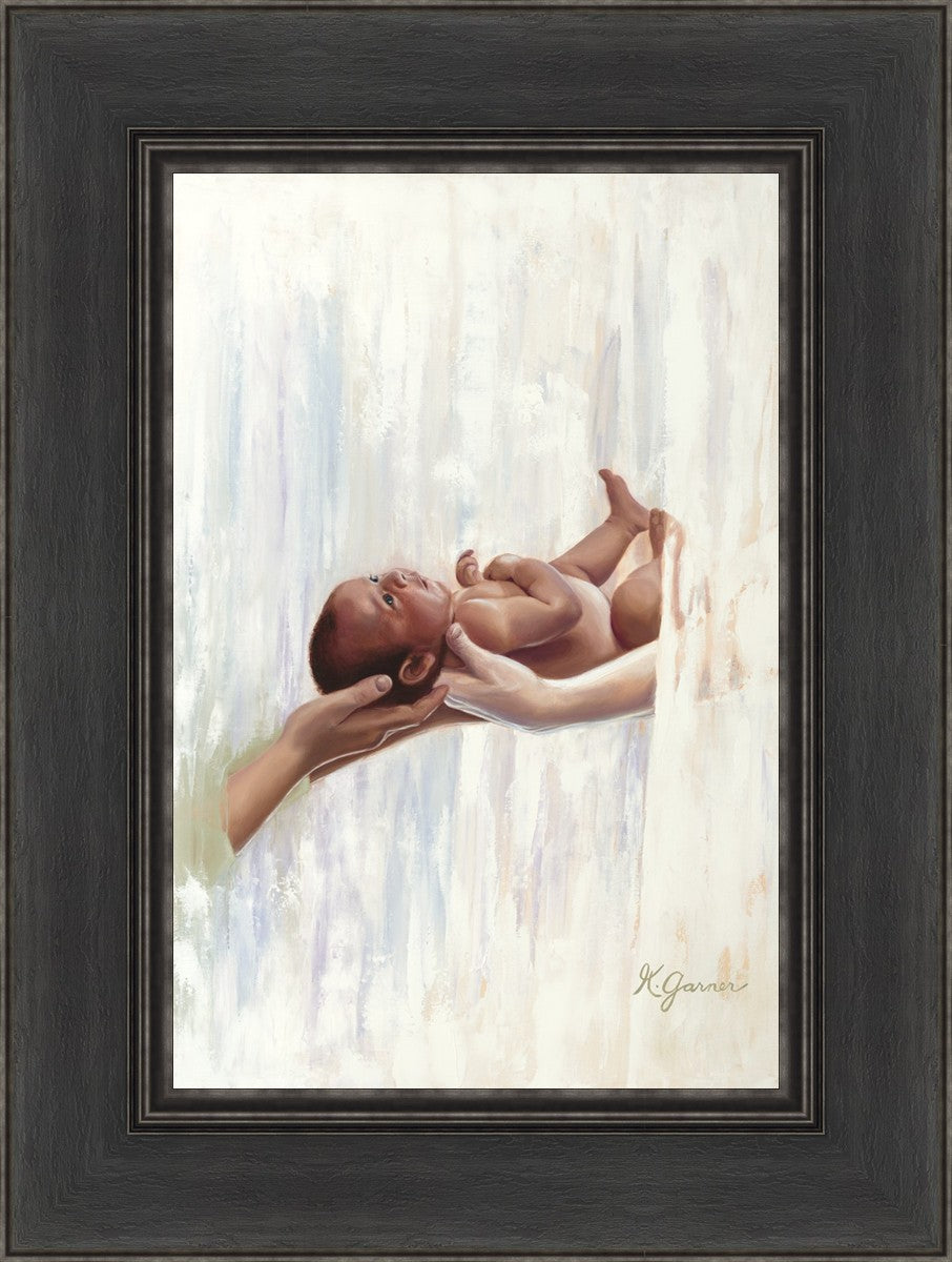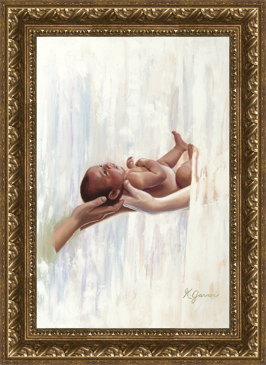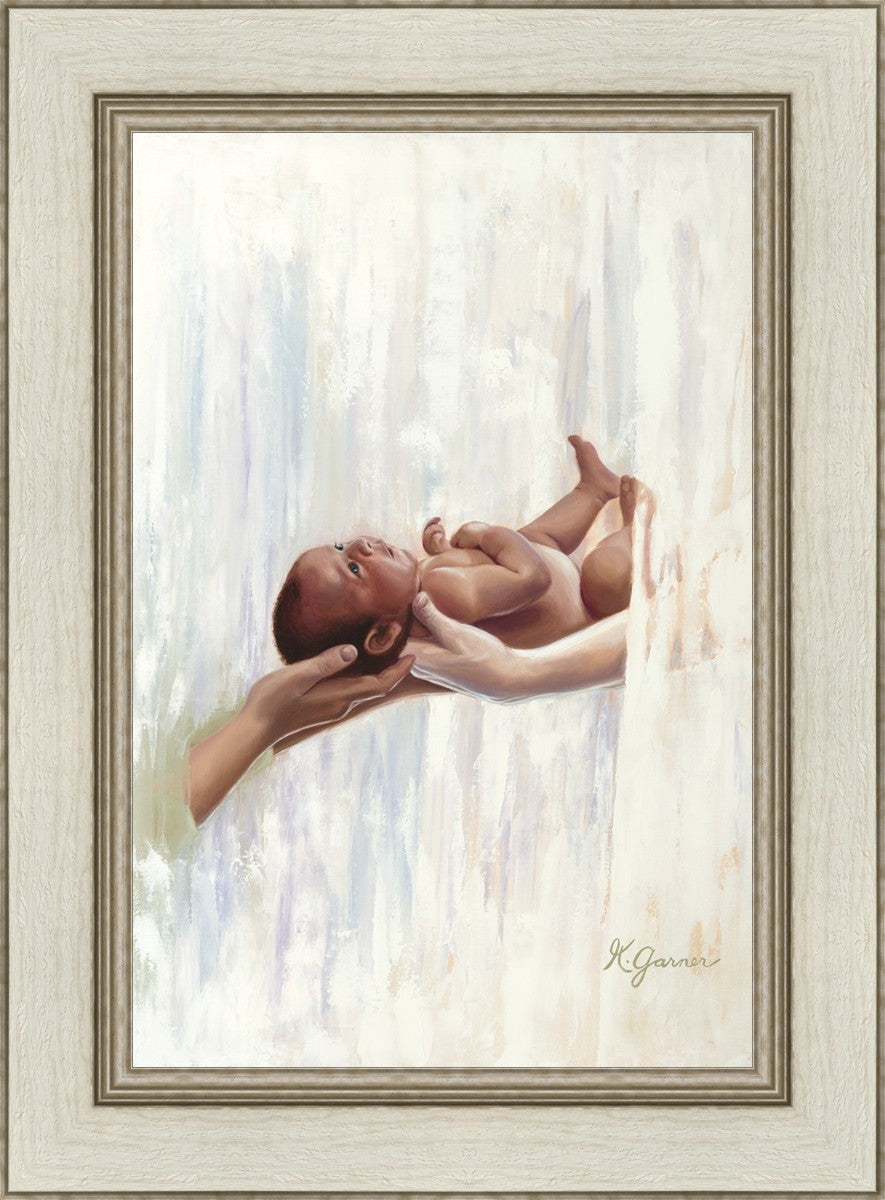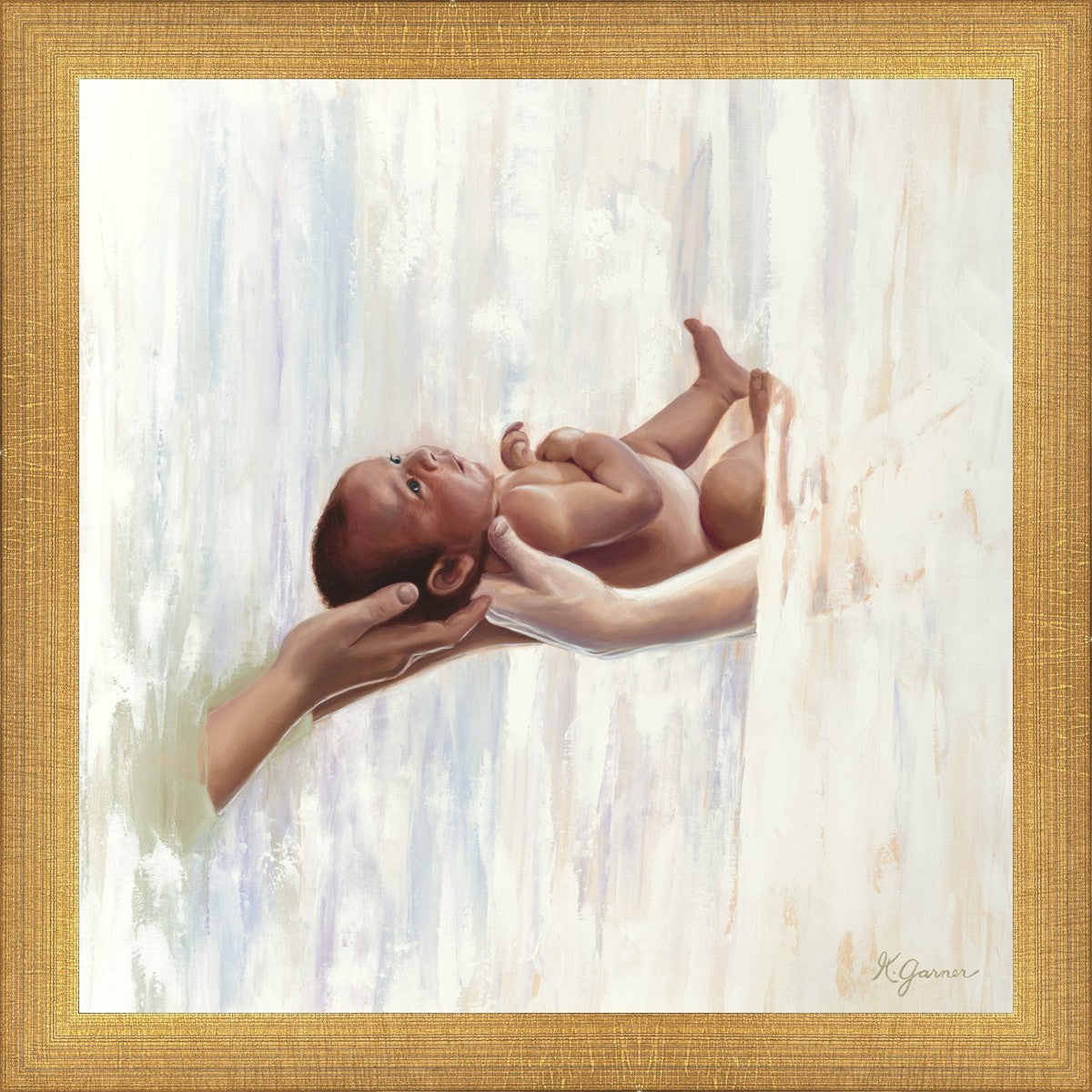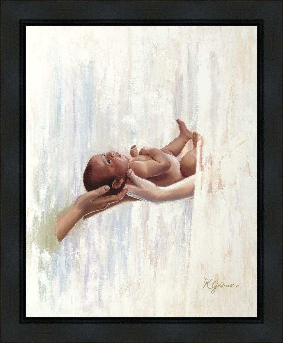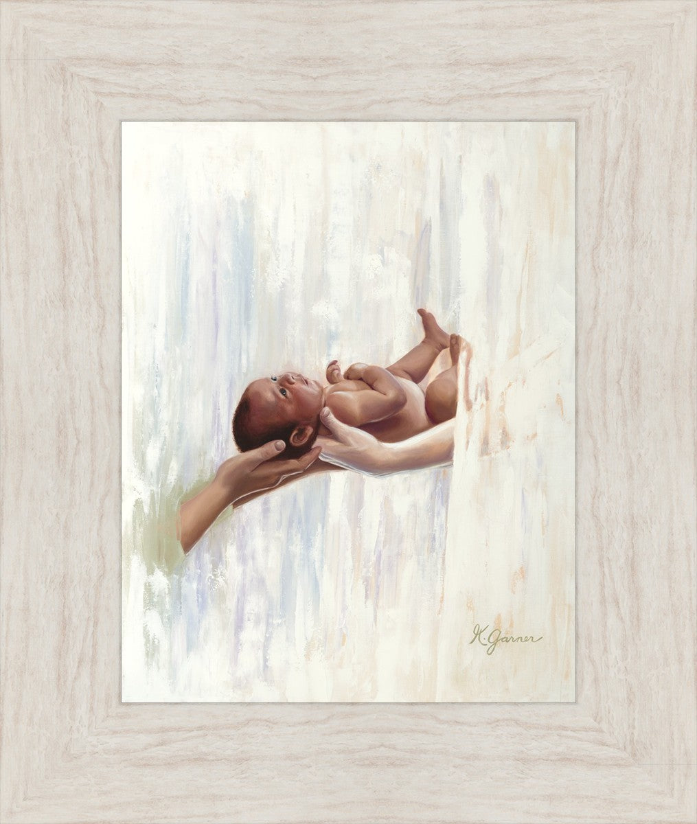 "Mother to Mother" by Katie Garner depicts a touching scene of a heavenly mother passing a child through the veil to an earthly mother, symbolizing the bond between heaven and earth. This heartfelt artwork captures the essence of maternal love, spiritual connection, and the eternal journey of motherhood, resonating with viewers seeking comfort and hope.