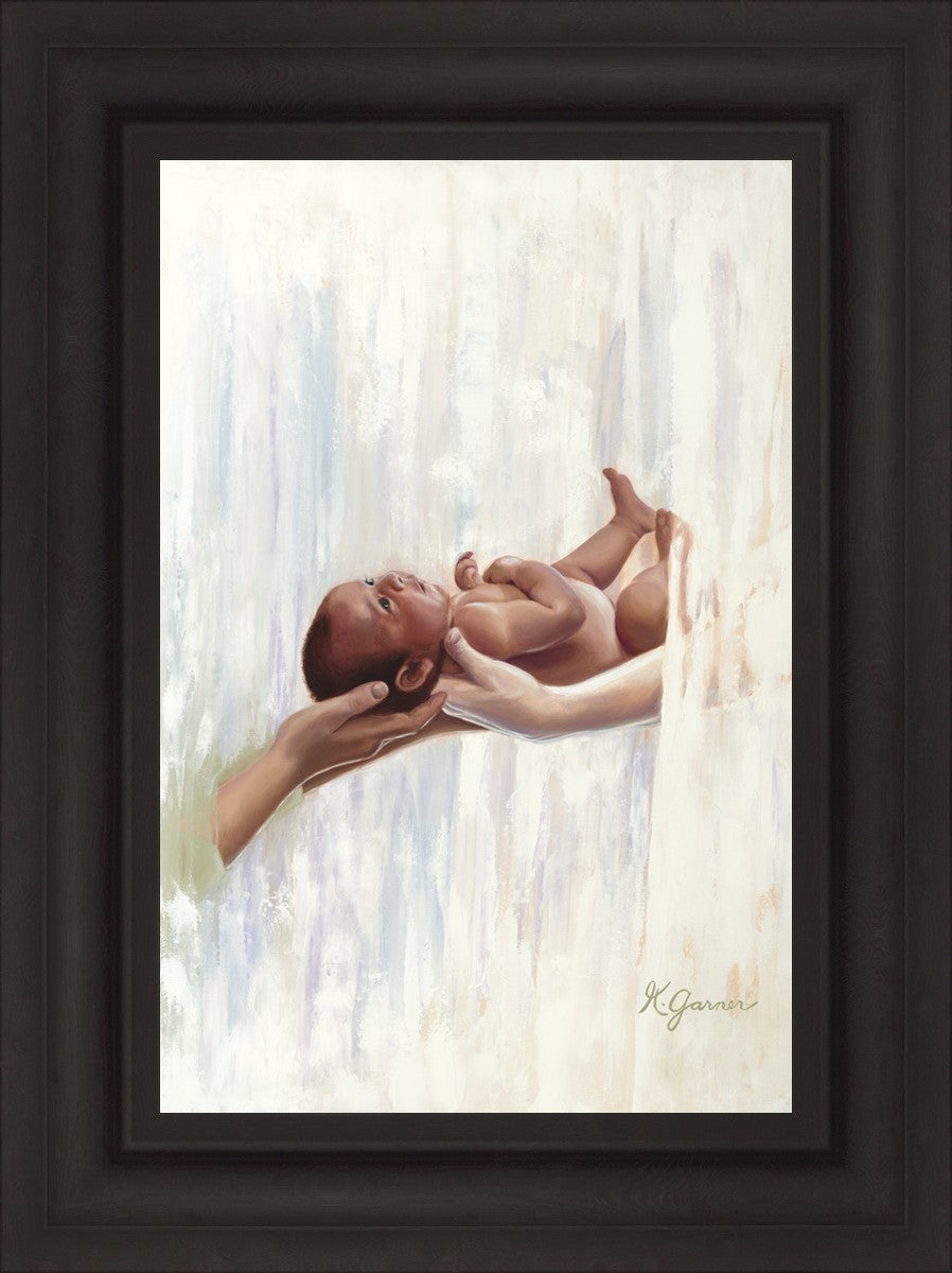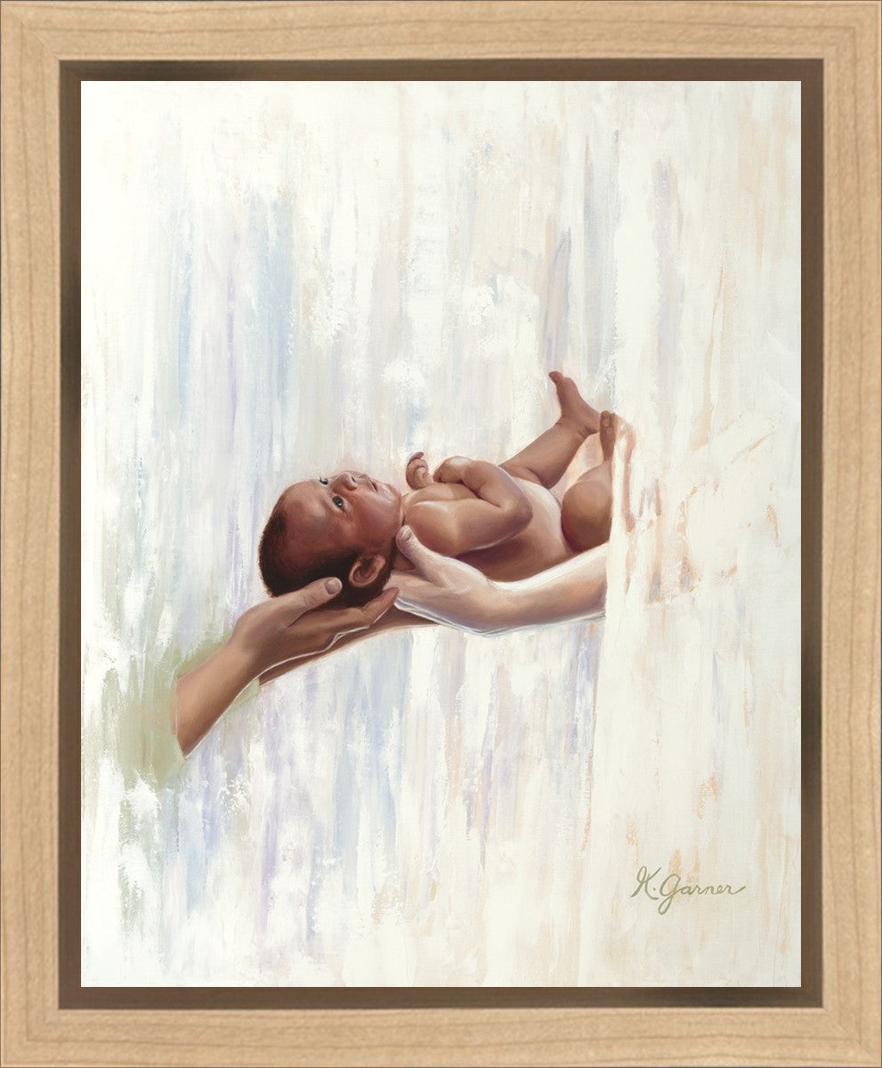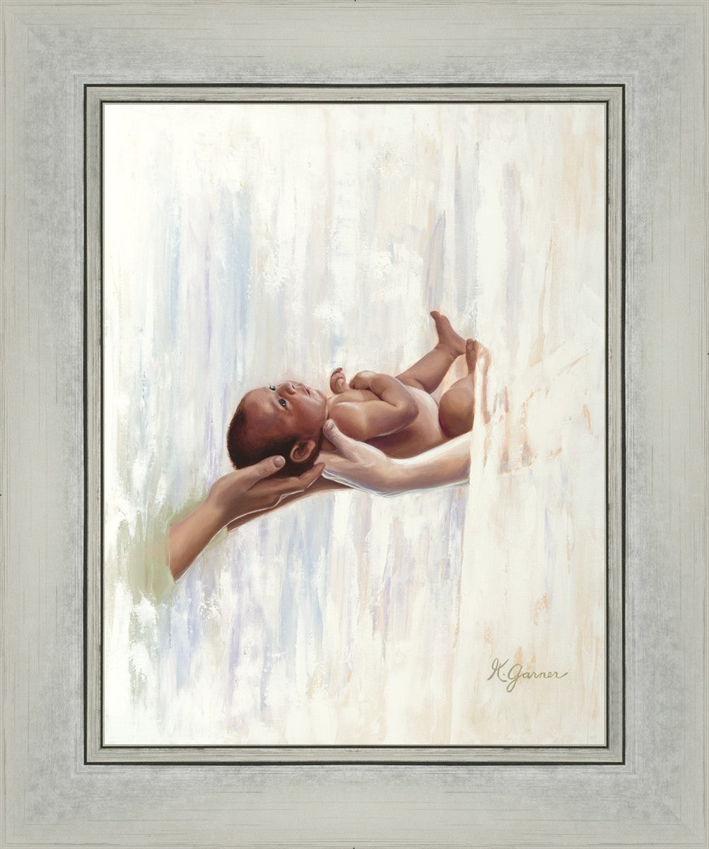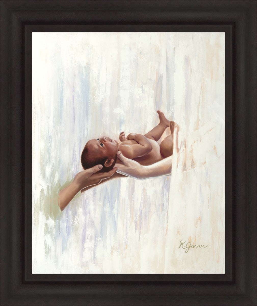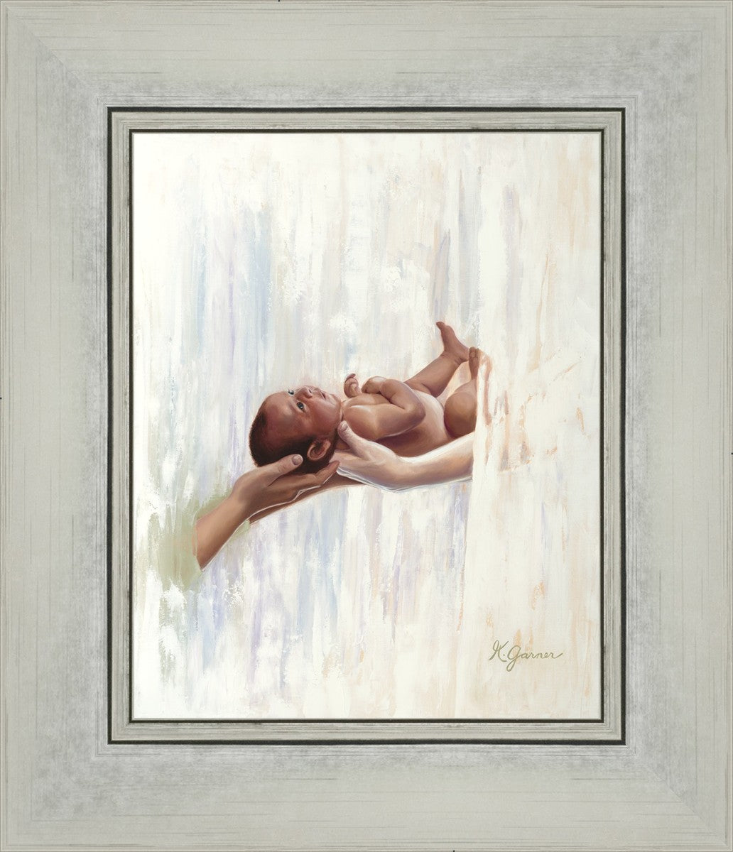 "Mother to Mother" by Katie Garner depicts a touching scene of a heavenly mother passing a child through the veil to an earthly mother, symbolizing the bond between heaven and earth. This heartfelt artwork captures the essence of maternal love, spiritual connection, and the eternal journey of motherhood, resonating with viewers seeking comfort and hope.