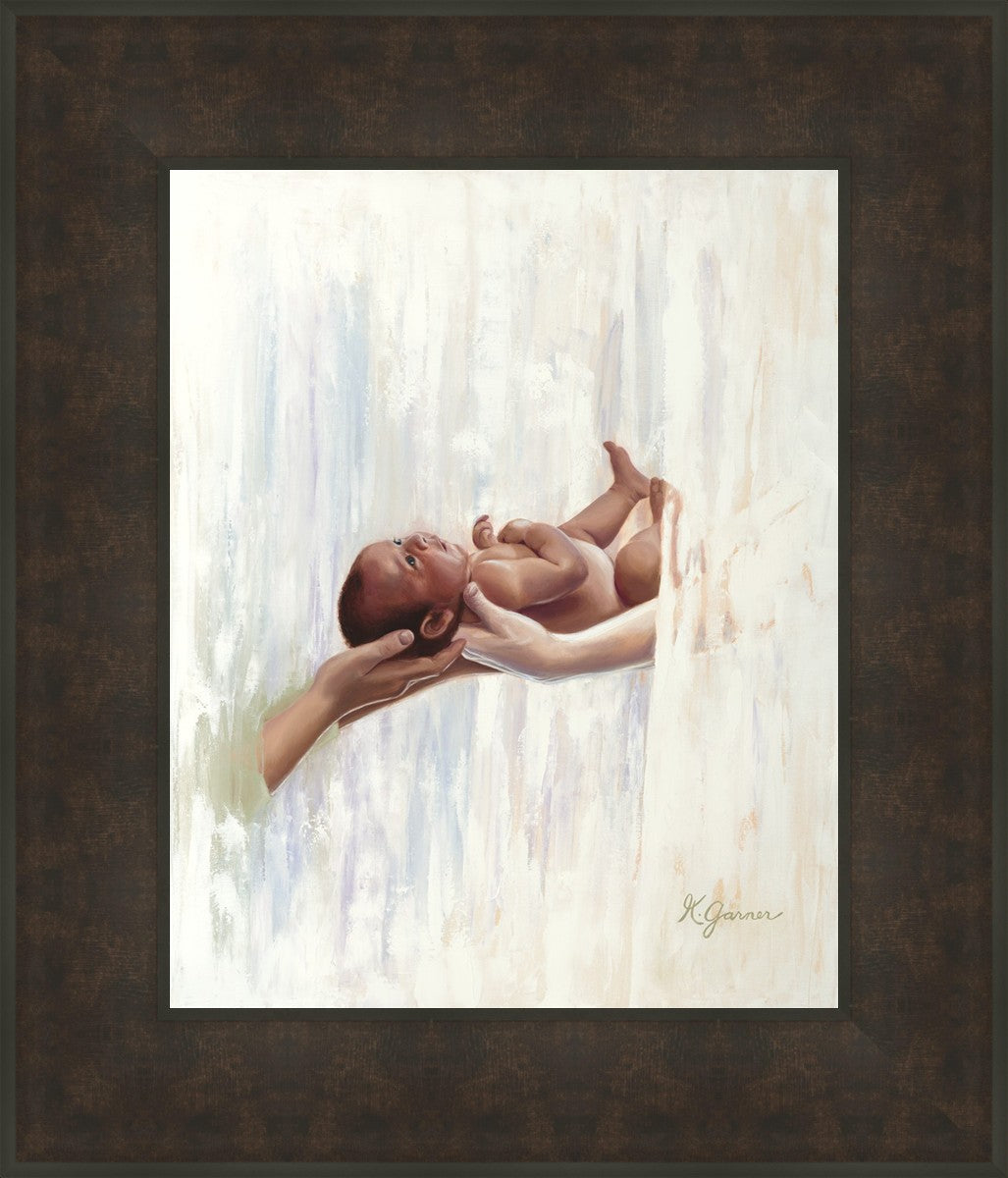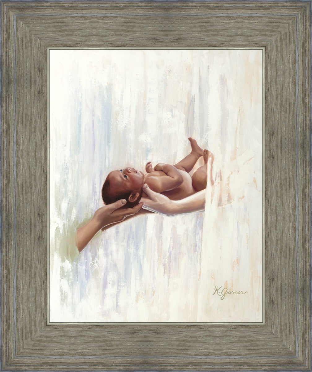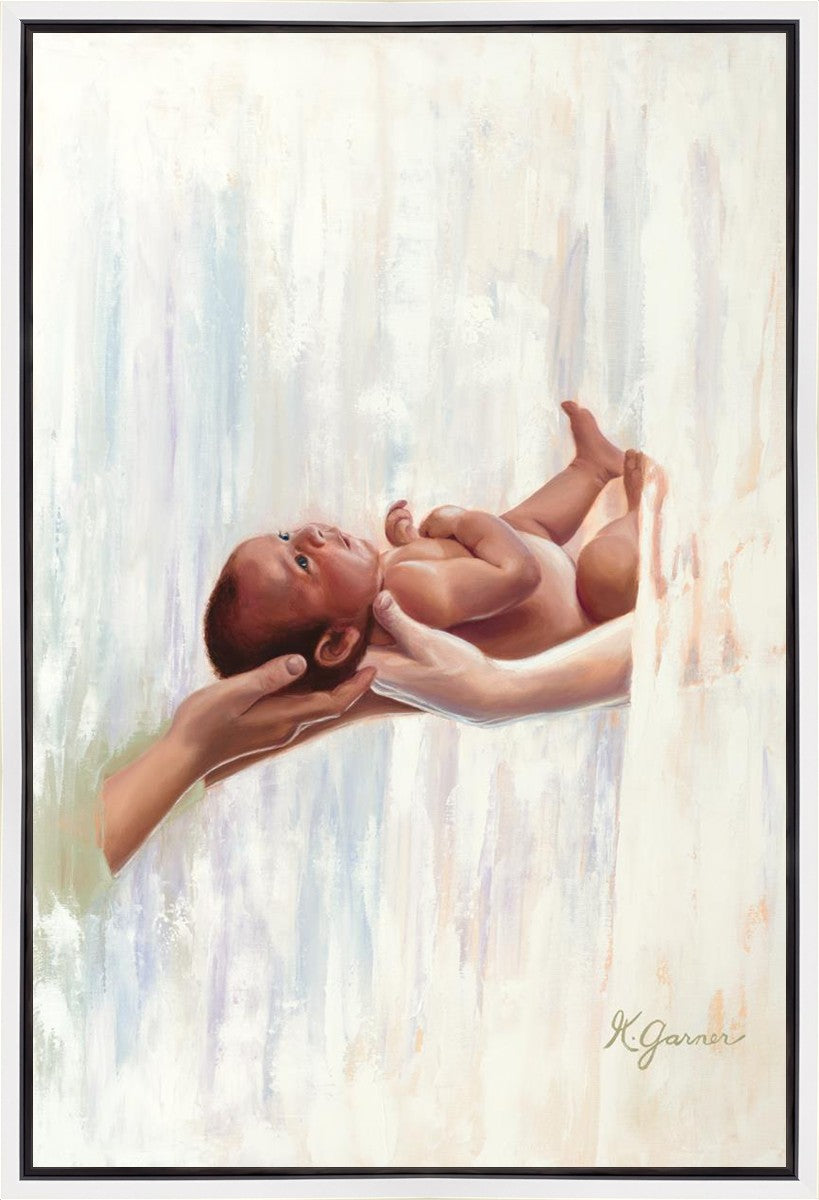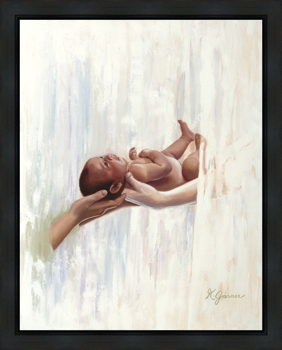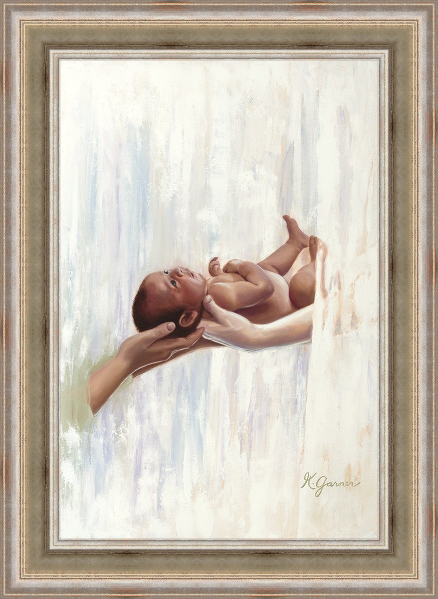 "Mother to Mother" by Katie Garner depicts a touching scene of a heavenly mother passing a child through the veil to an earthly mother, symbolizing the bond between heaven and earth. This heartfelt artwork captures the essence of maternal love, spiritual connection, and the eternal journey of motherhood, resonating with viewers seeking comfort and hope.