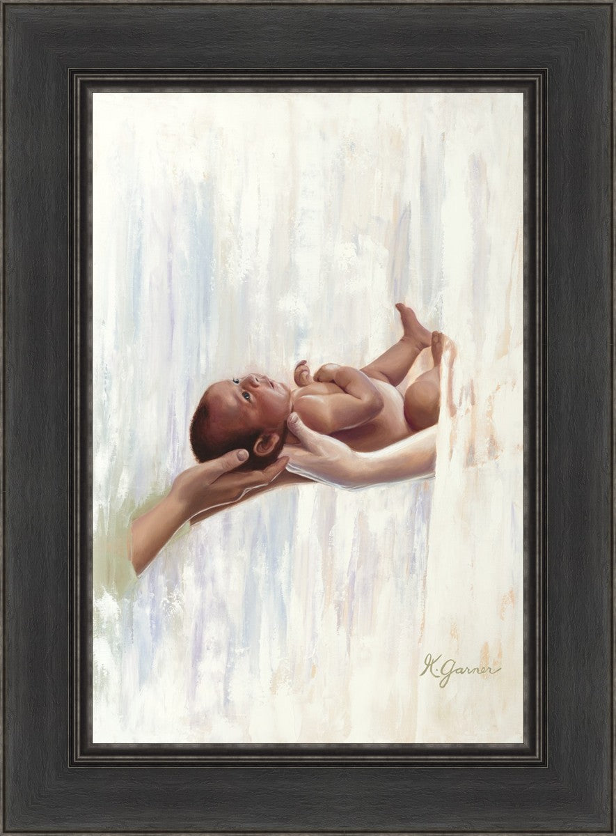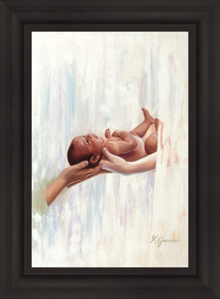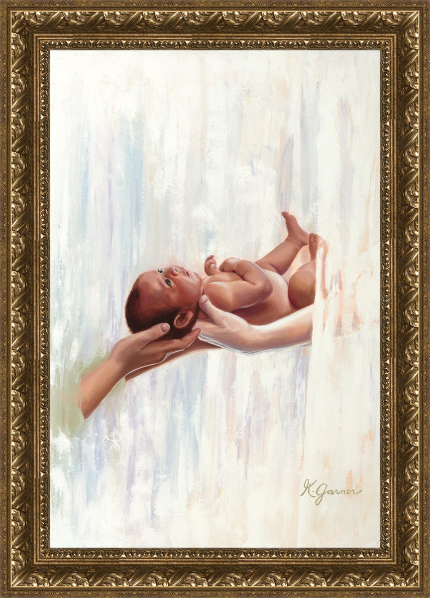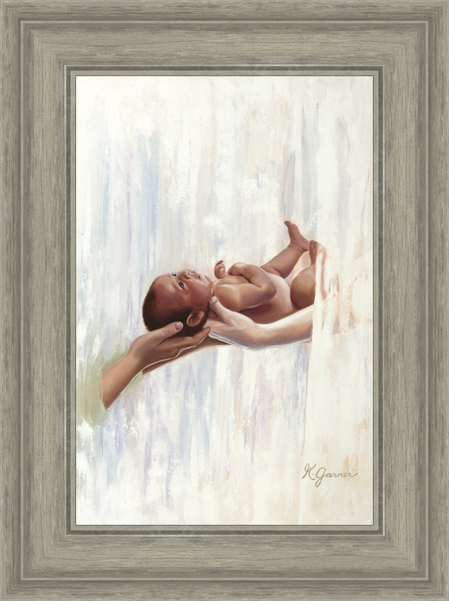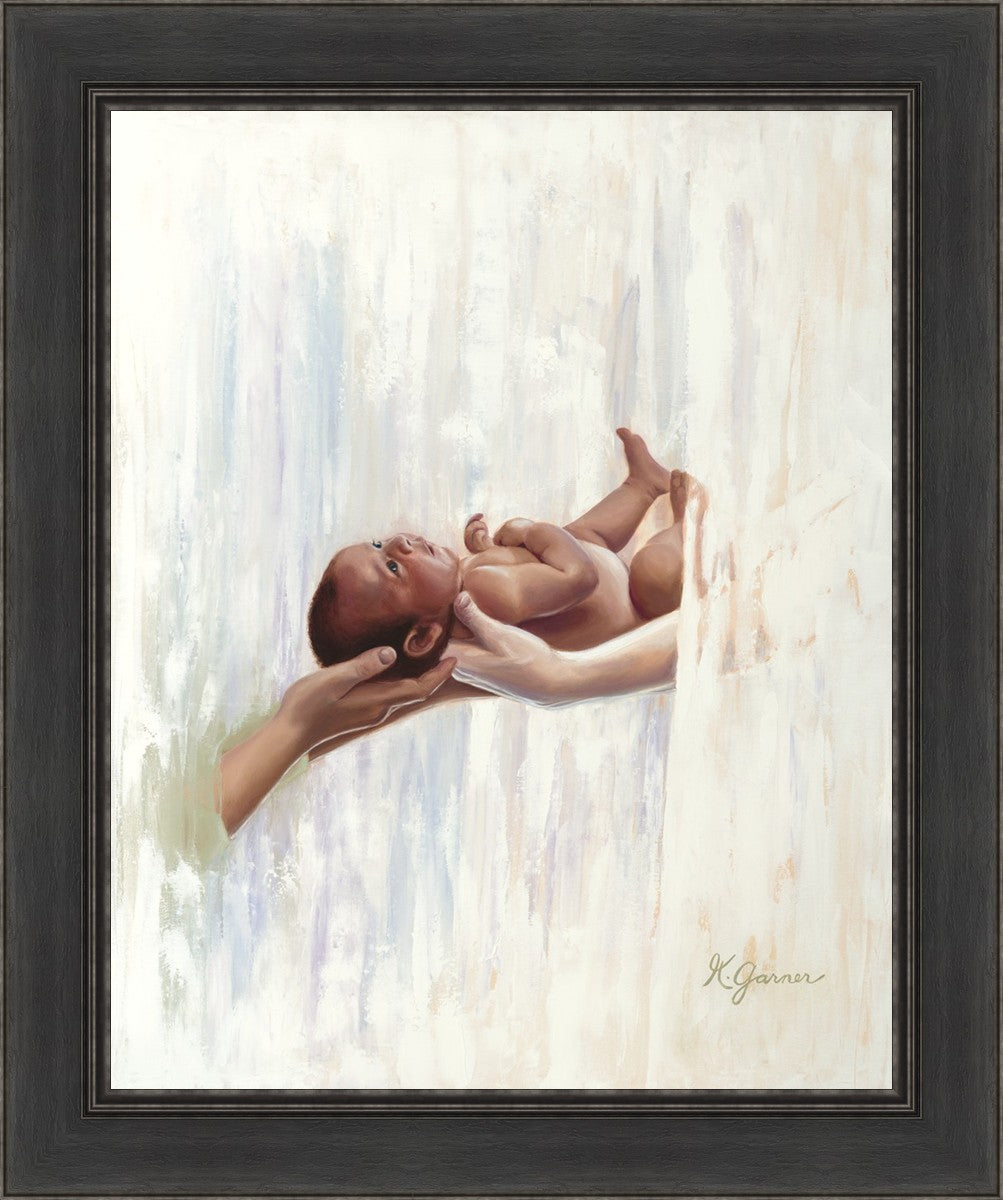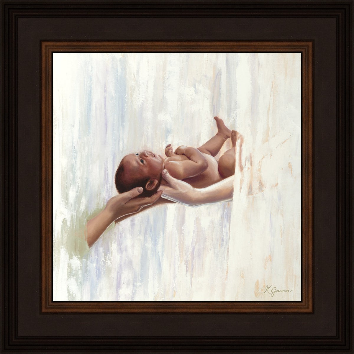 "Mother to Mother" by Katie Garner depicts a touching scene of a heavenly mother passing a child through the veil to an earthly mother, symbolizing the bond between heaven and earth. This heartfelt artwork captures the essence of maternal love, spiritual connection, and the eternal journey of motherhood, resonating with viewers seeking comfort and hope.