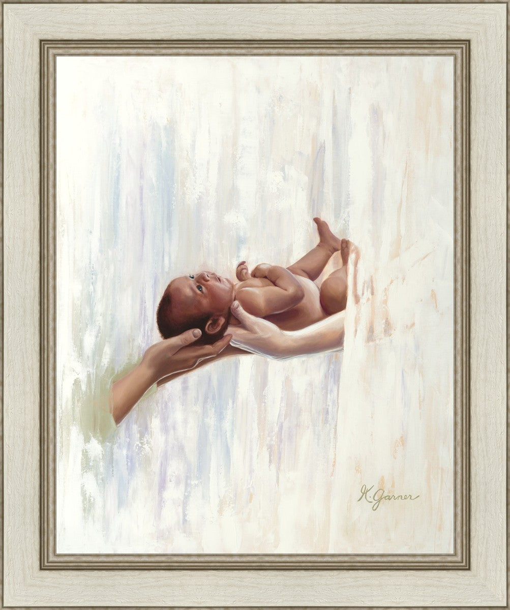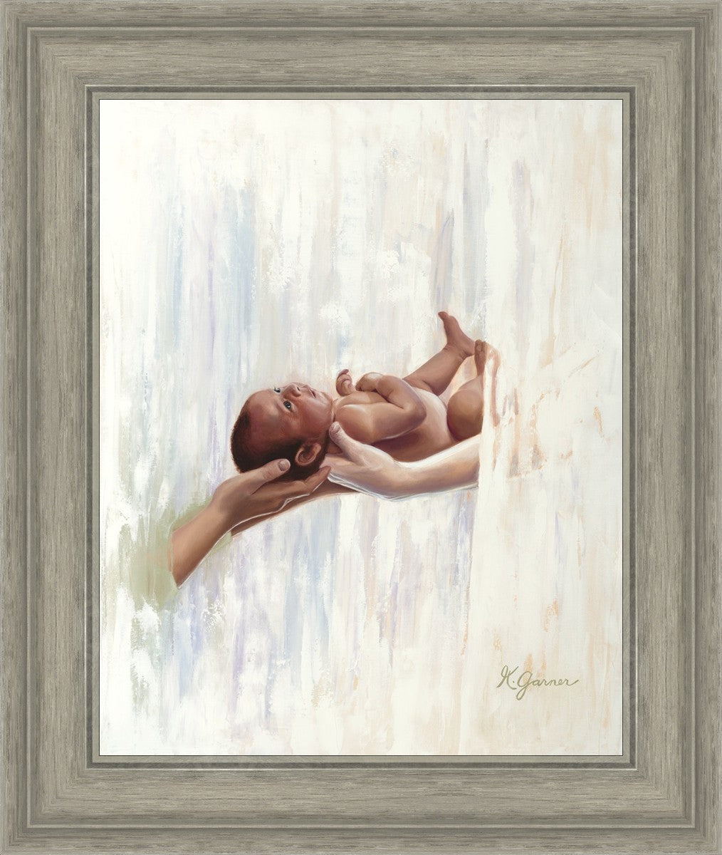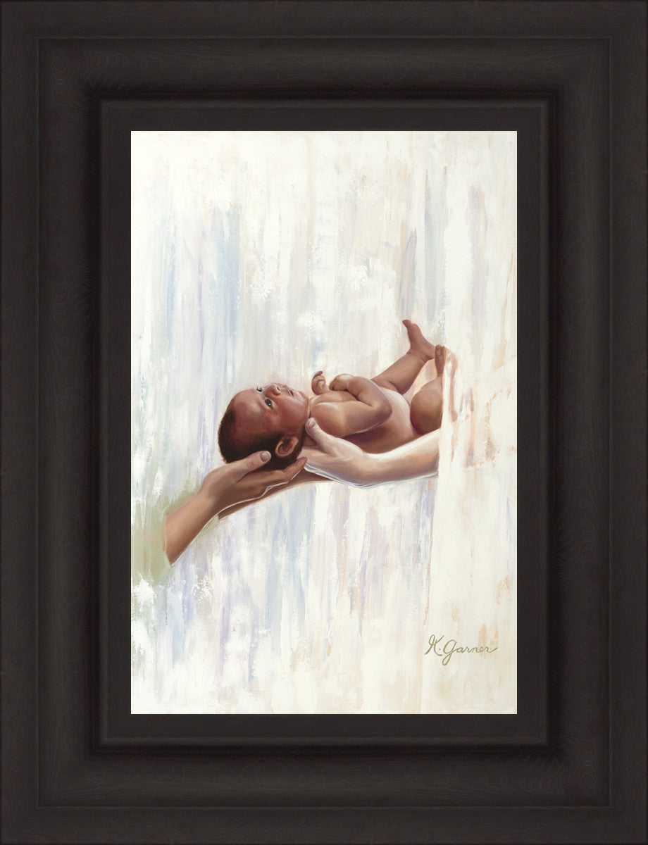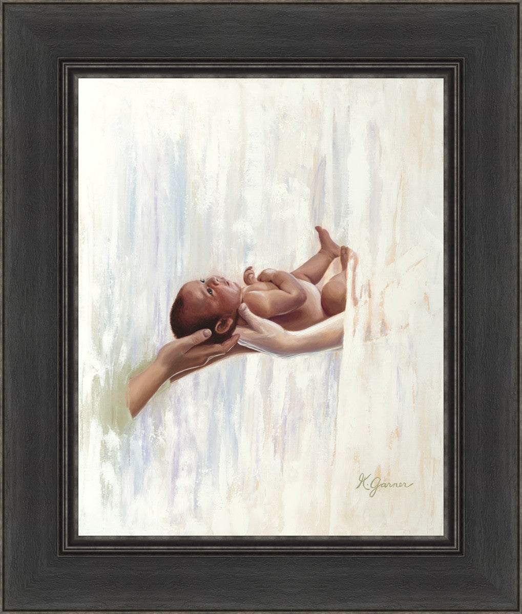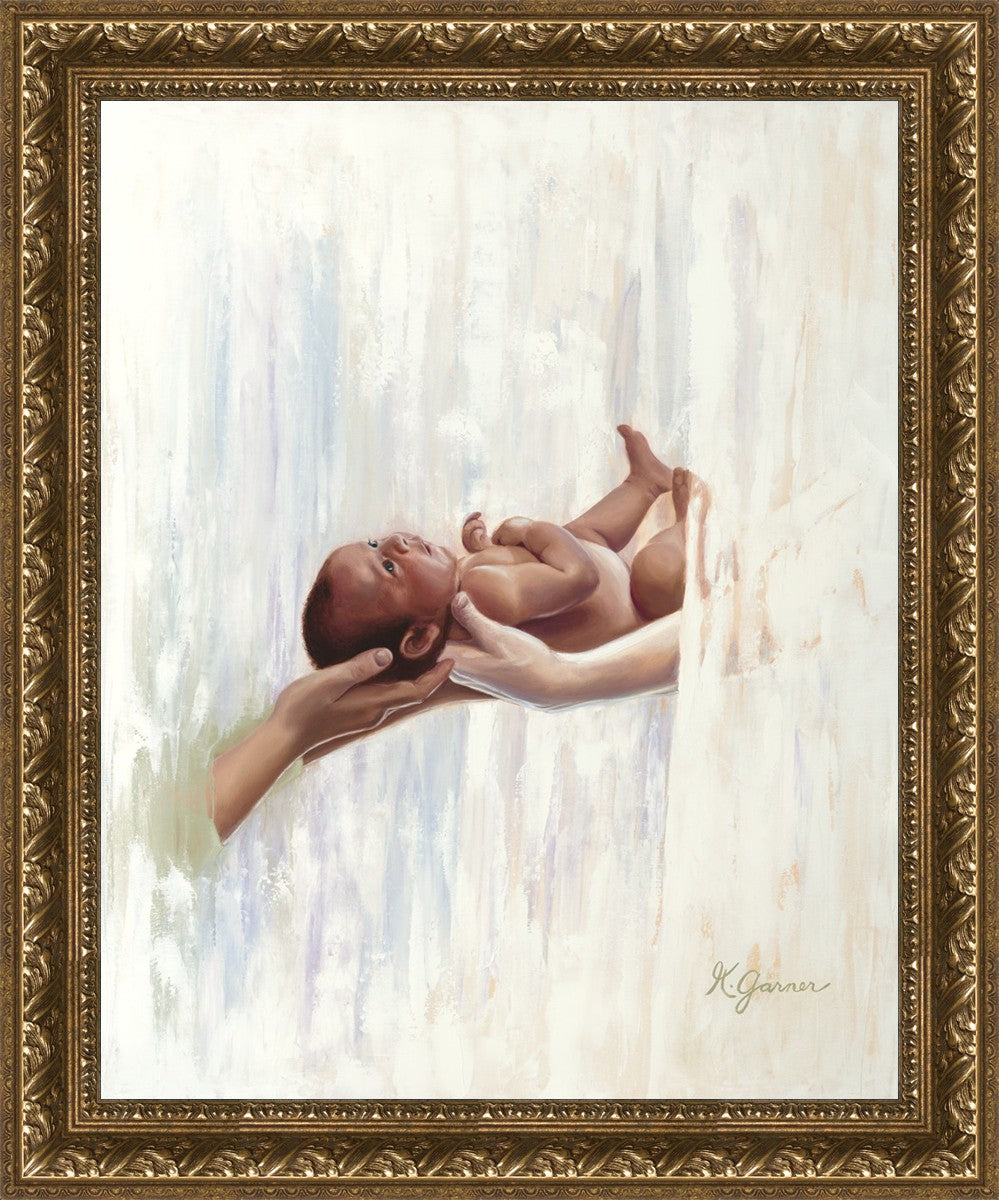 "Mother to Mother" by Katie Garner depicts a touching scene of a heavenly mother passing a child through the veil to an earthly mother, symbolizing the bond between heaven and earth. This heartfelt artwork captures the essence of maternal love, spiritual connection, and the eternal journey of motherhood, resonating with viewers seeking comfort and hope.