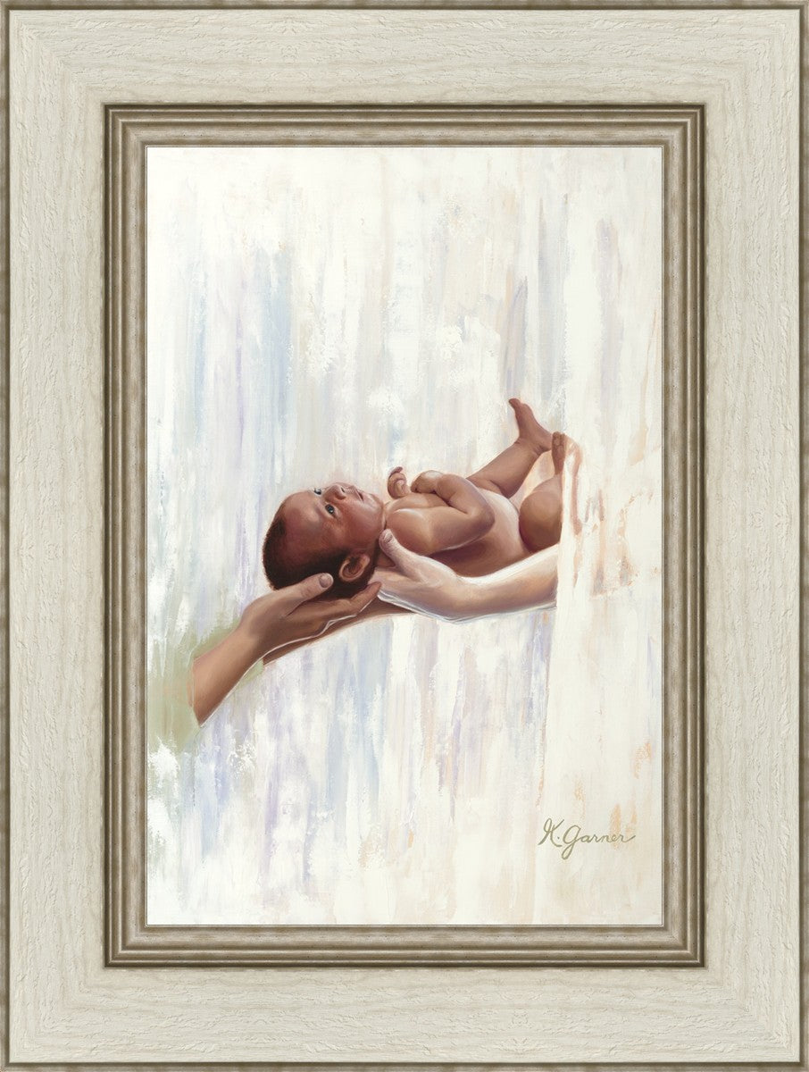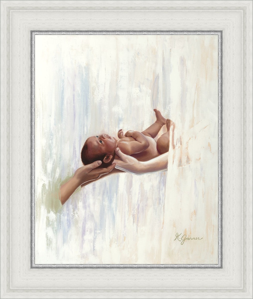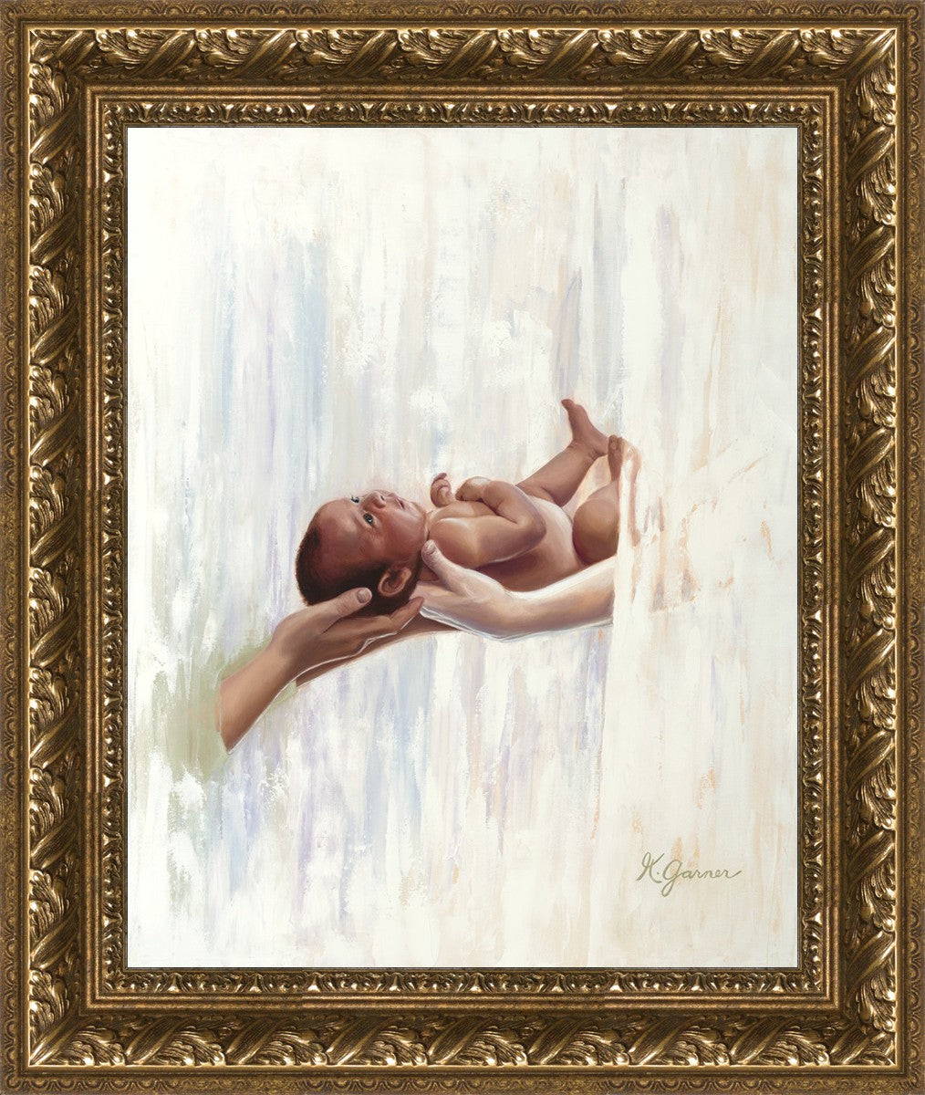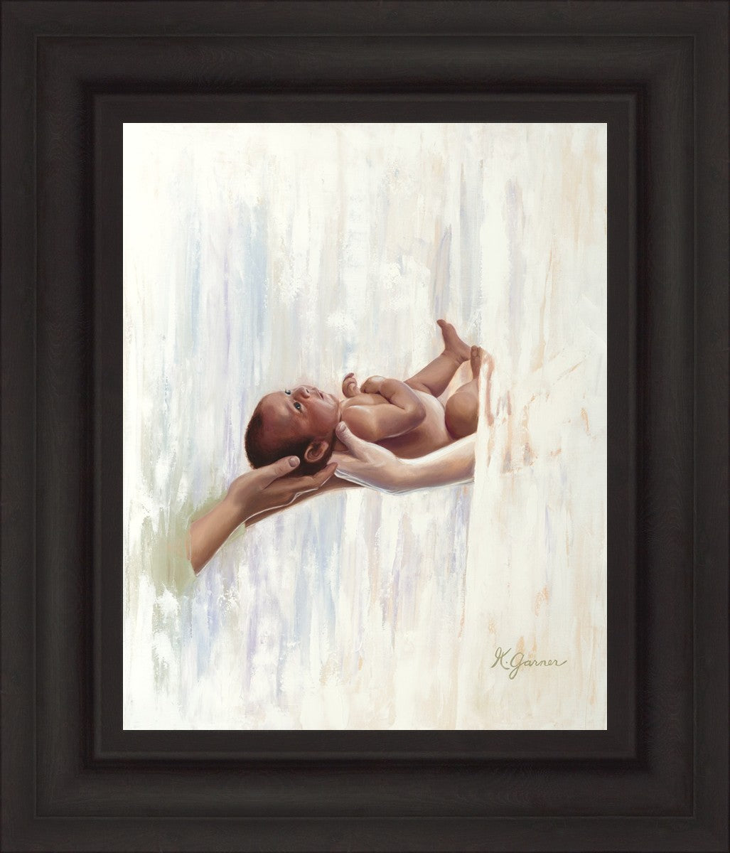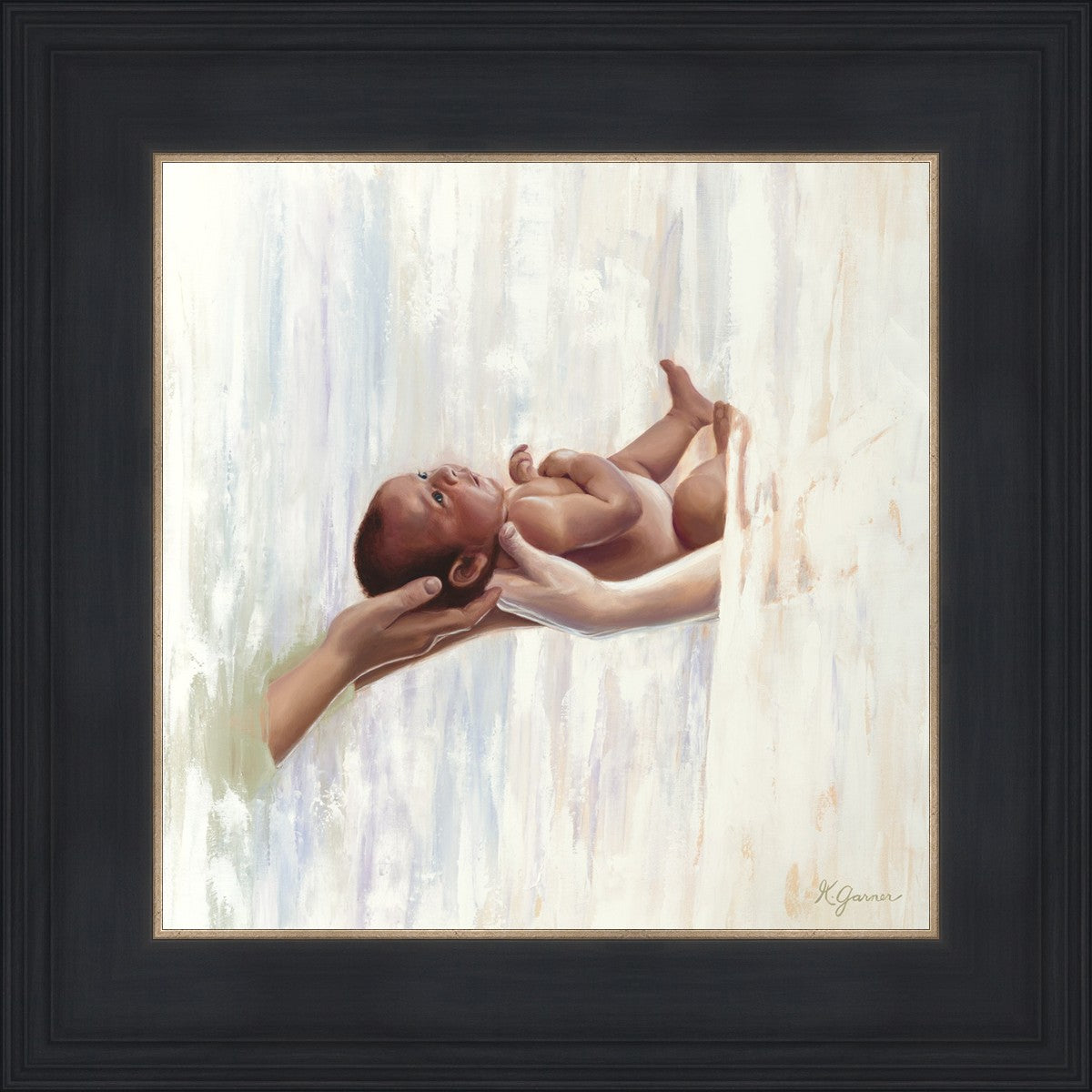 "Mother to Mother" by Katie Garner depicts a touching scene of a heavenly mother passing a child through the veil to an earthly mother, symbolizing the bond between heaven and earth. This heartfelt artwork captures the essence of maternal love, spiritual connection, and the eternal journey of motherhood, resonating with viewers seeking comfort and hope.