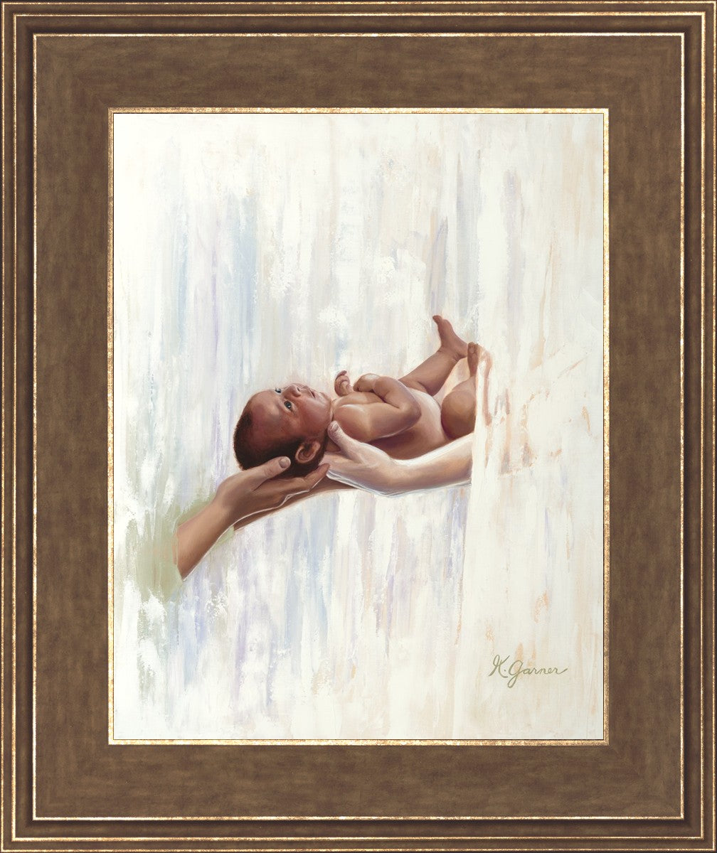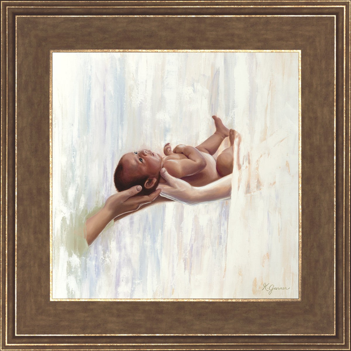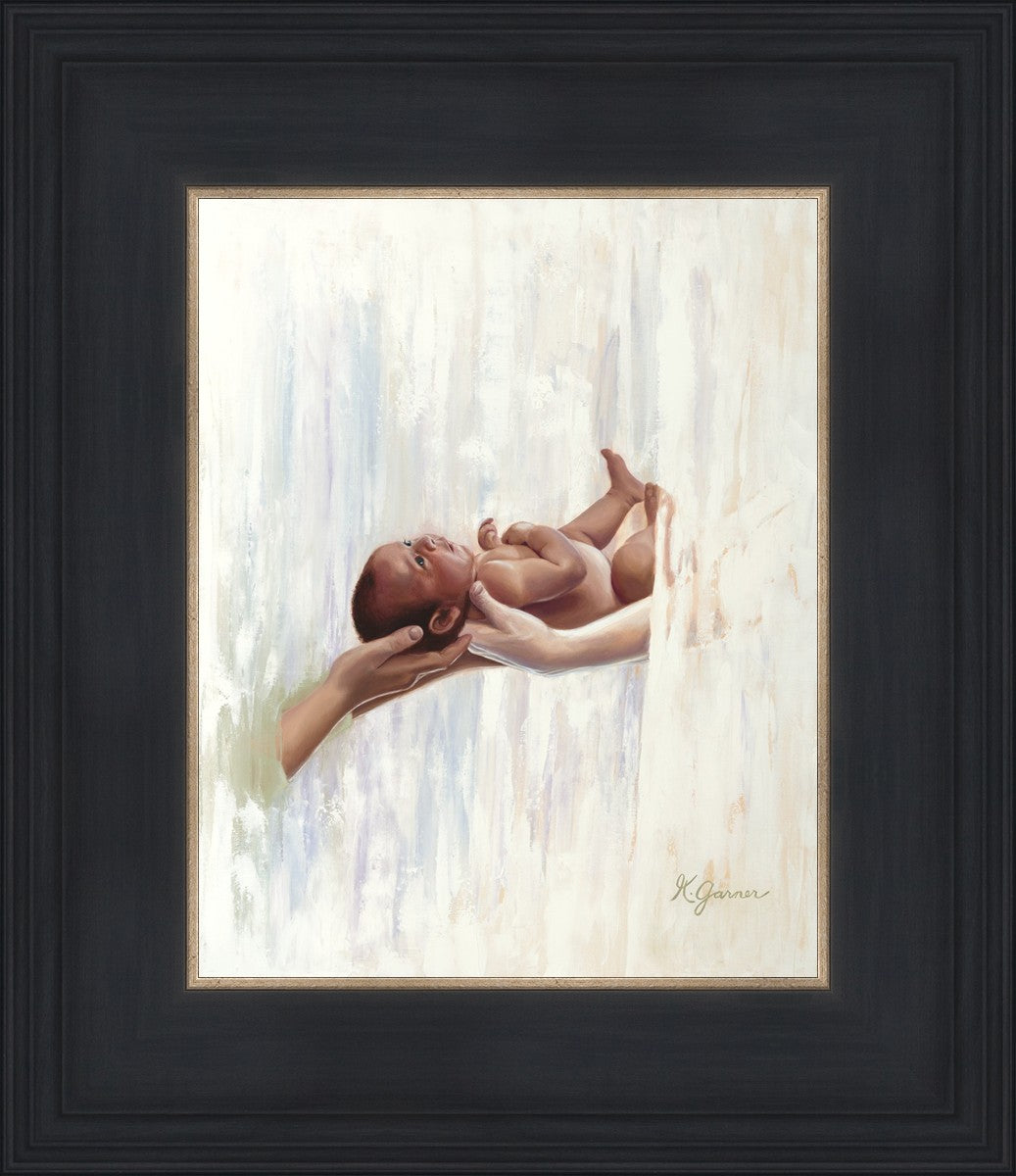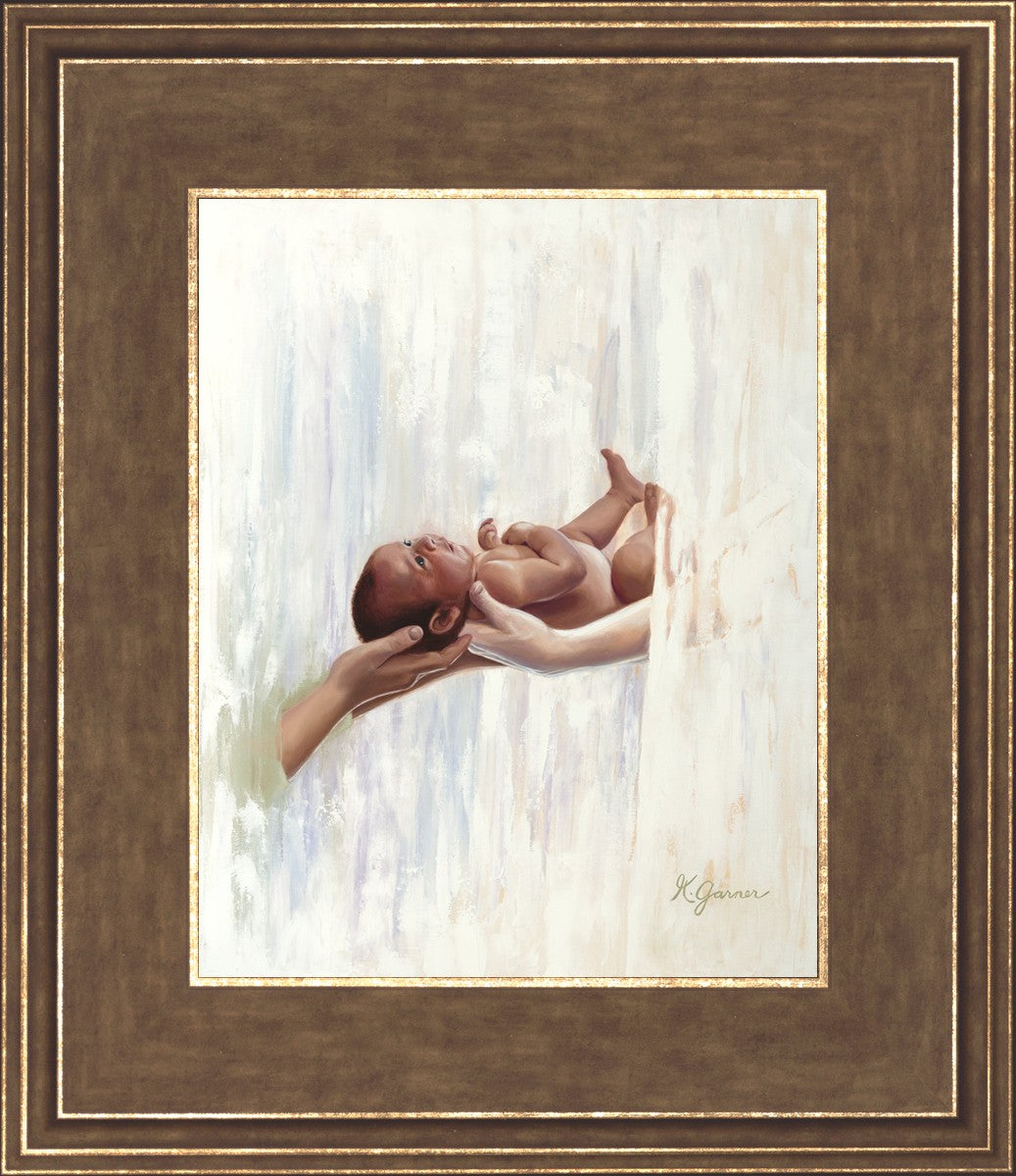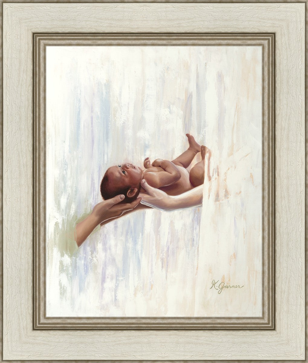 "Mother to Mother" by Katie Garner depicts a touching scene of a heavenly mother passing a child through the veil to an earthly mother, symbolizing the bond between heaven and earth. This heartfelt artwork captures the essence of maternal love, spiritual connection, and the eternal journey of motherhood, resonating with viewers seeking comfort and hope.