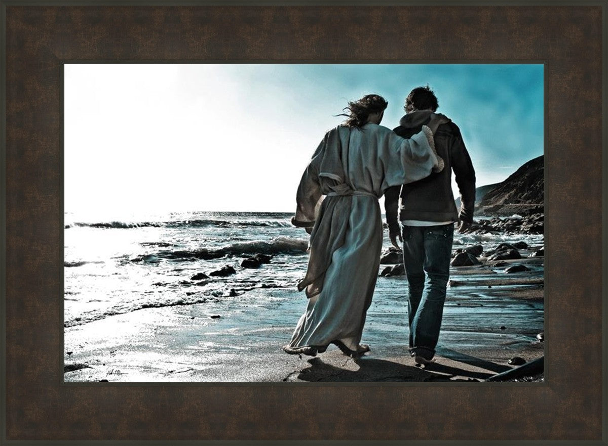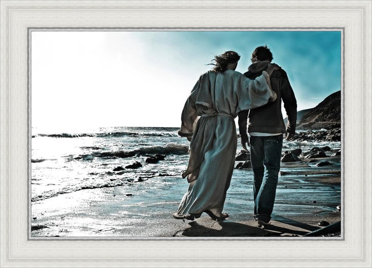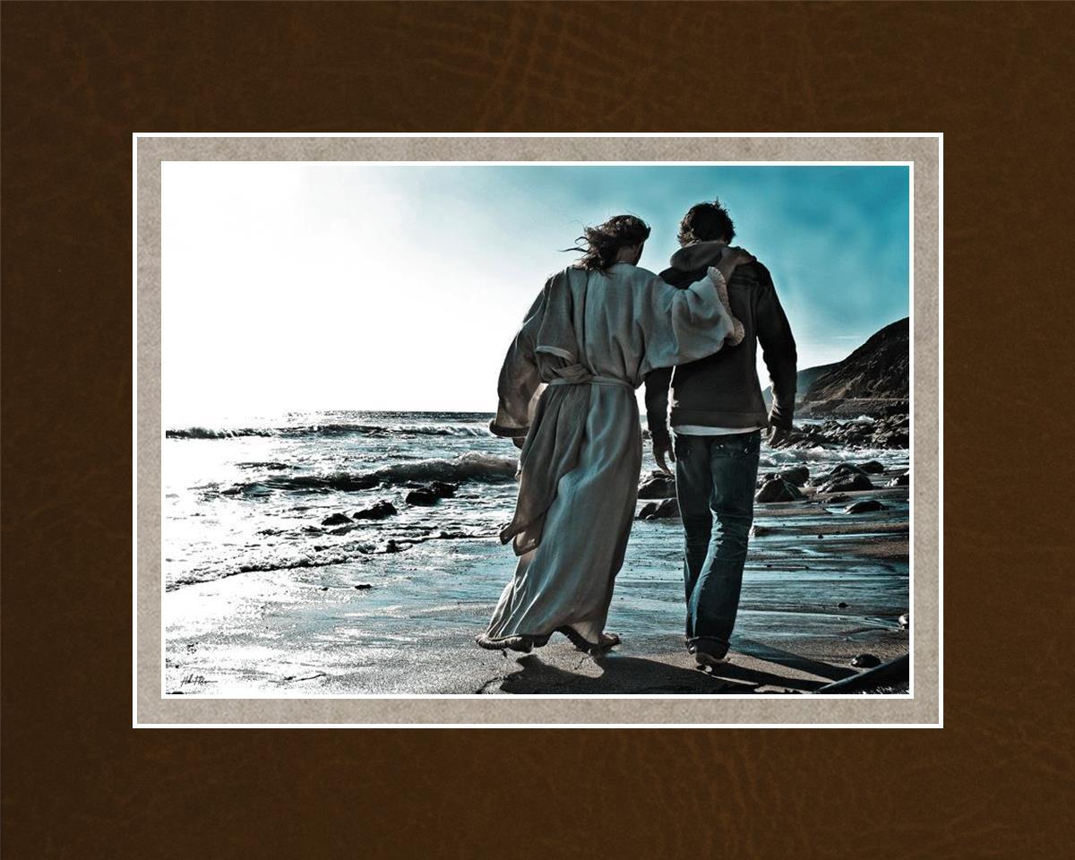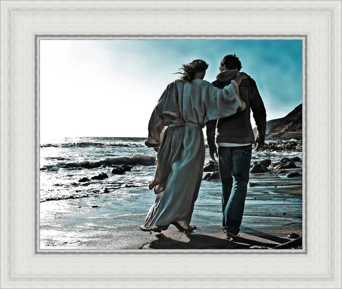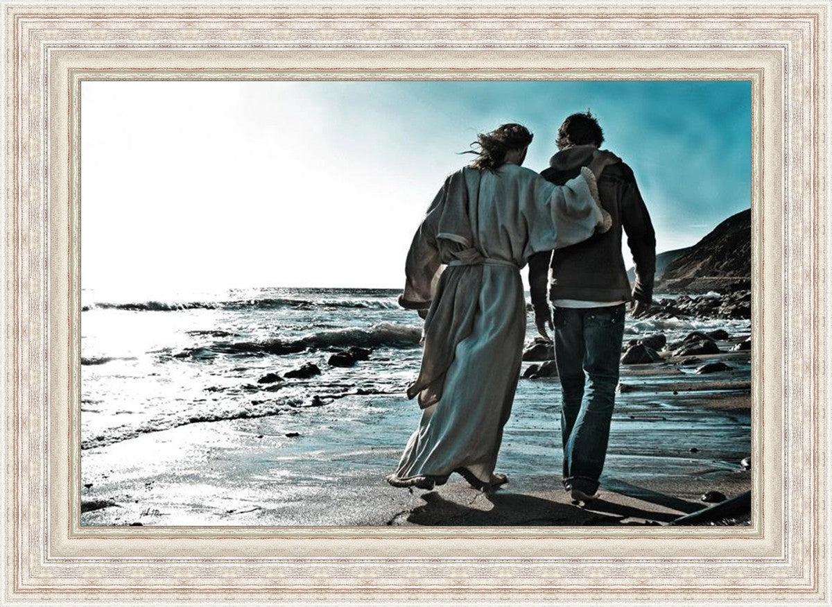 "My Friend" by Helen Thomas Robinson is a captivating photograph portraying Jesus Christ dressed in a robe, walking on the beach with his arm on the shoulder of a friend. This heartwarming image captures the essence of Jesus as our friend.