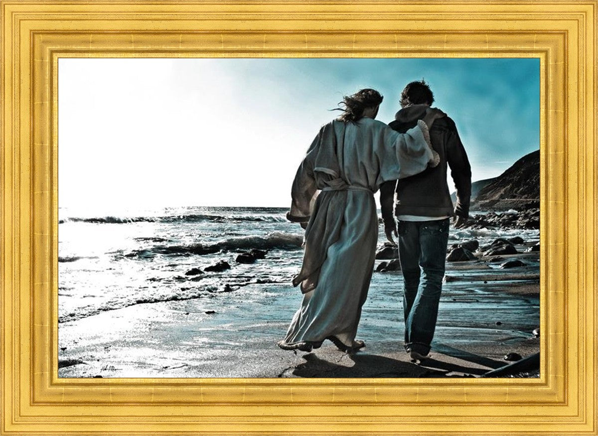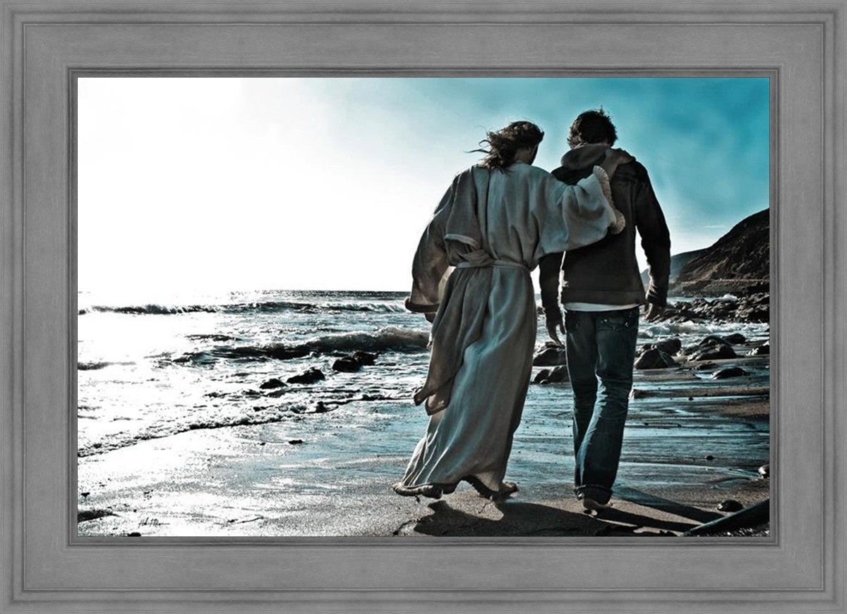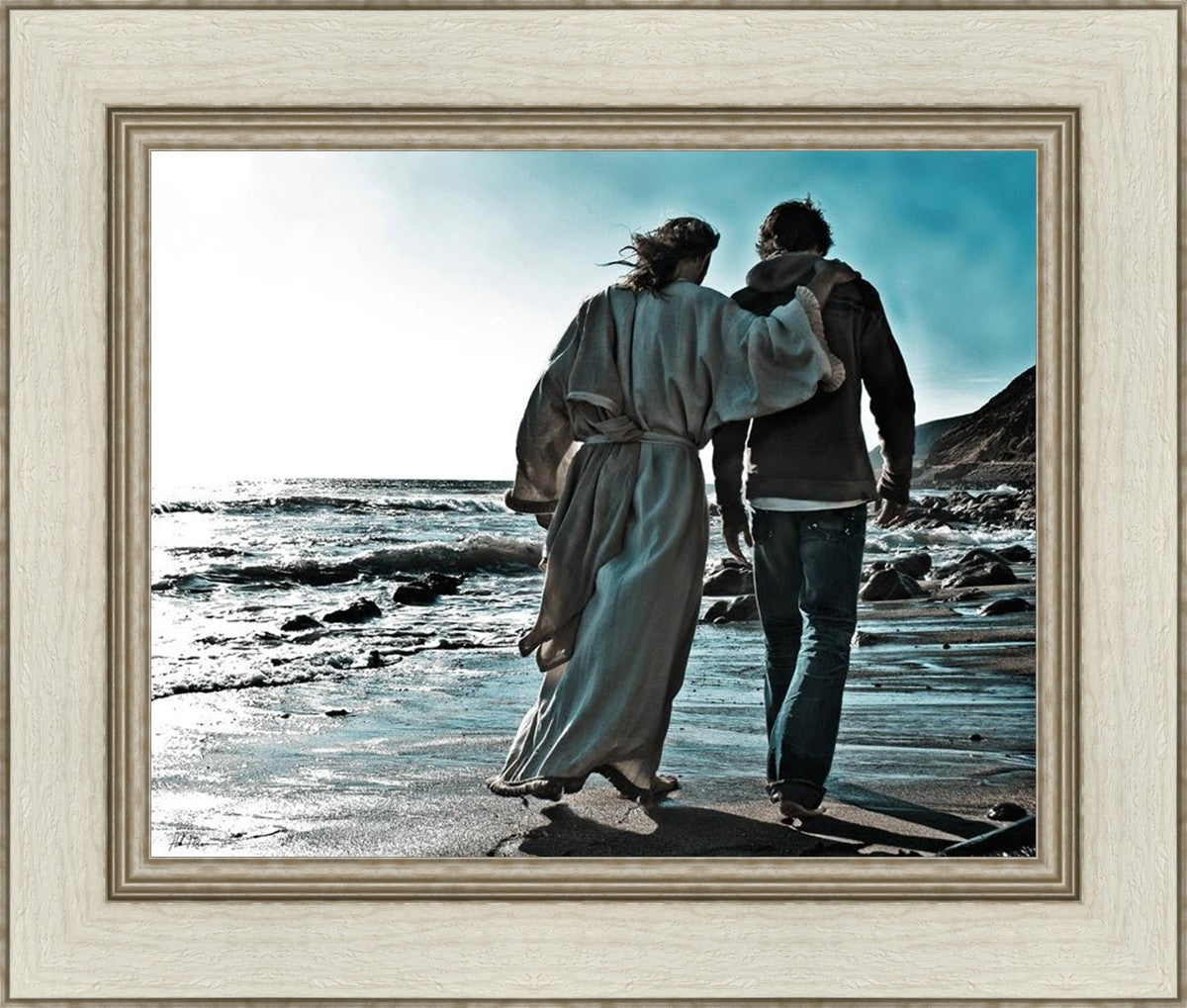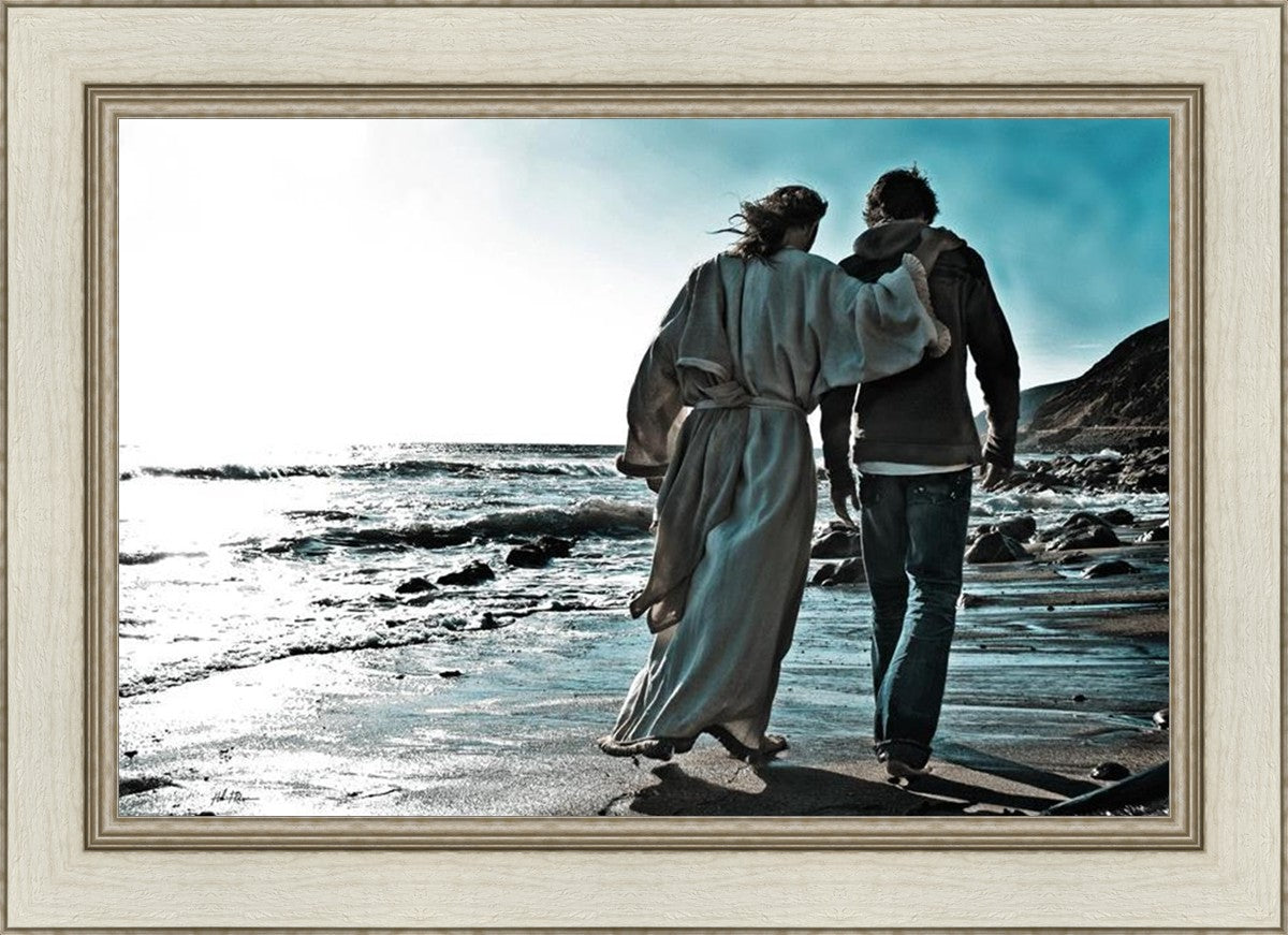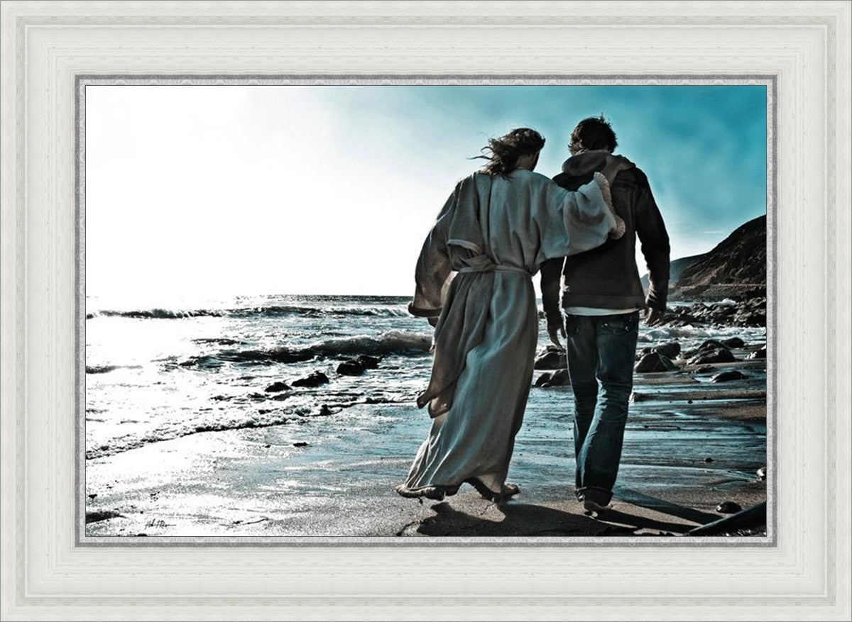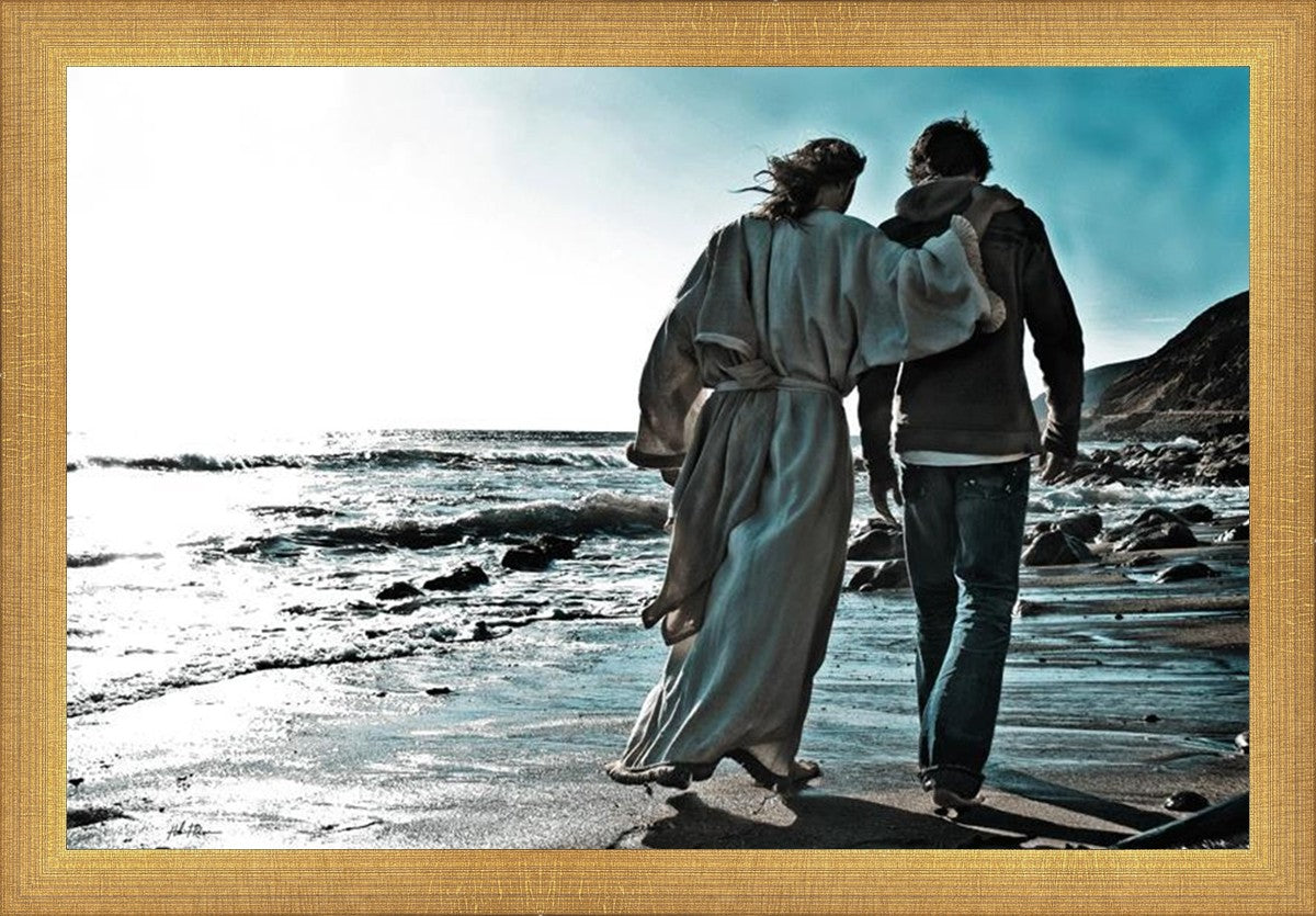 "My Friend" by Helen Thomas Robinson is a captivating photograph portraying Jesus Christ dressed in a robe, walking on the beach with his arm on the shoulder of a friend. This heartwarming image captures the essence of Jesus as our friend.