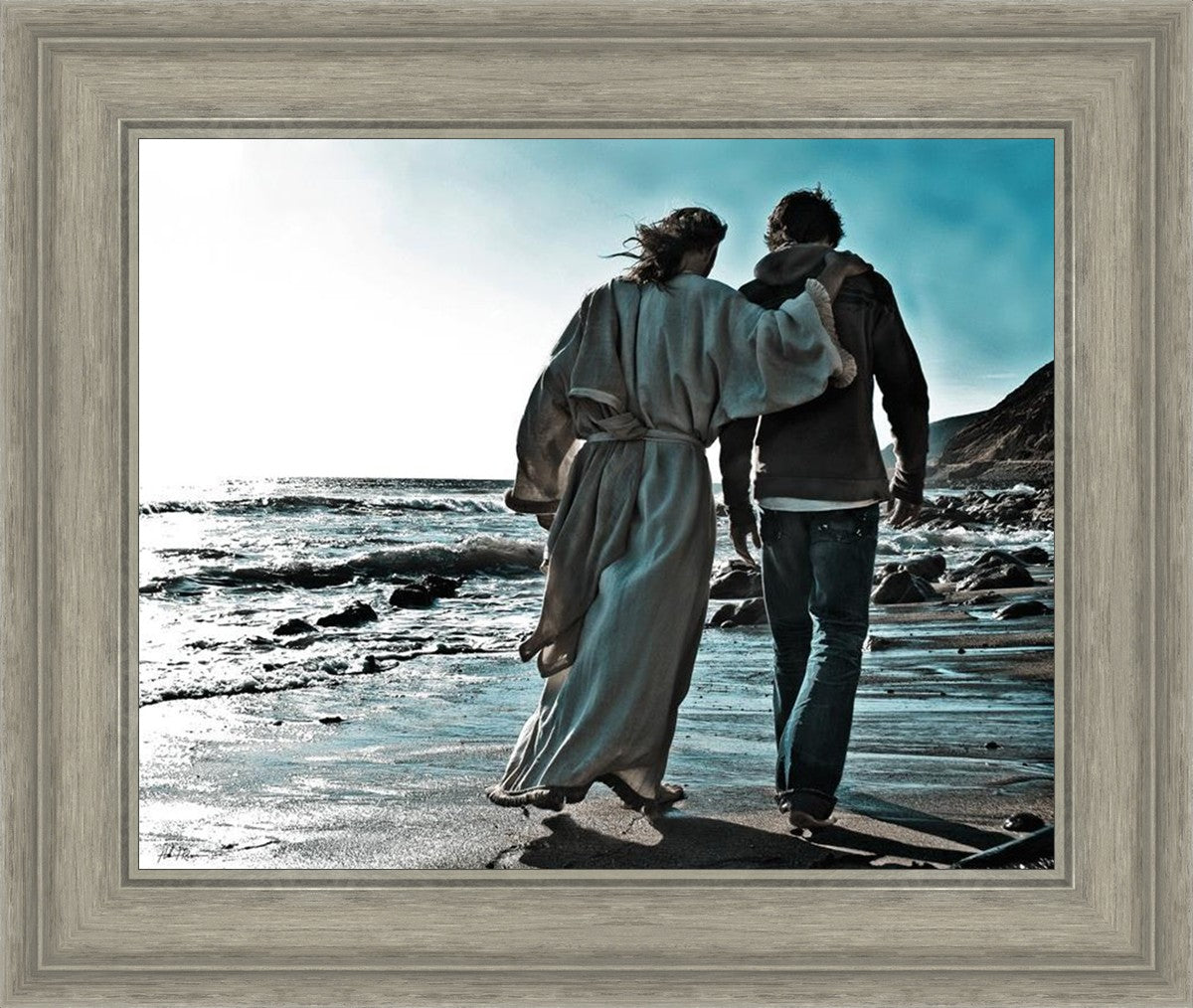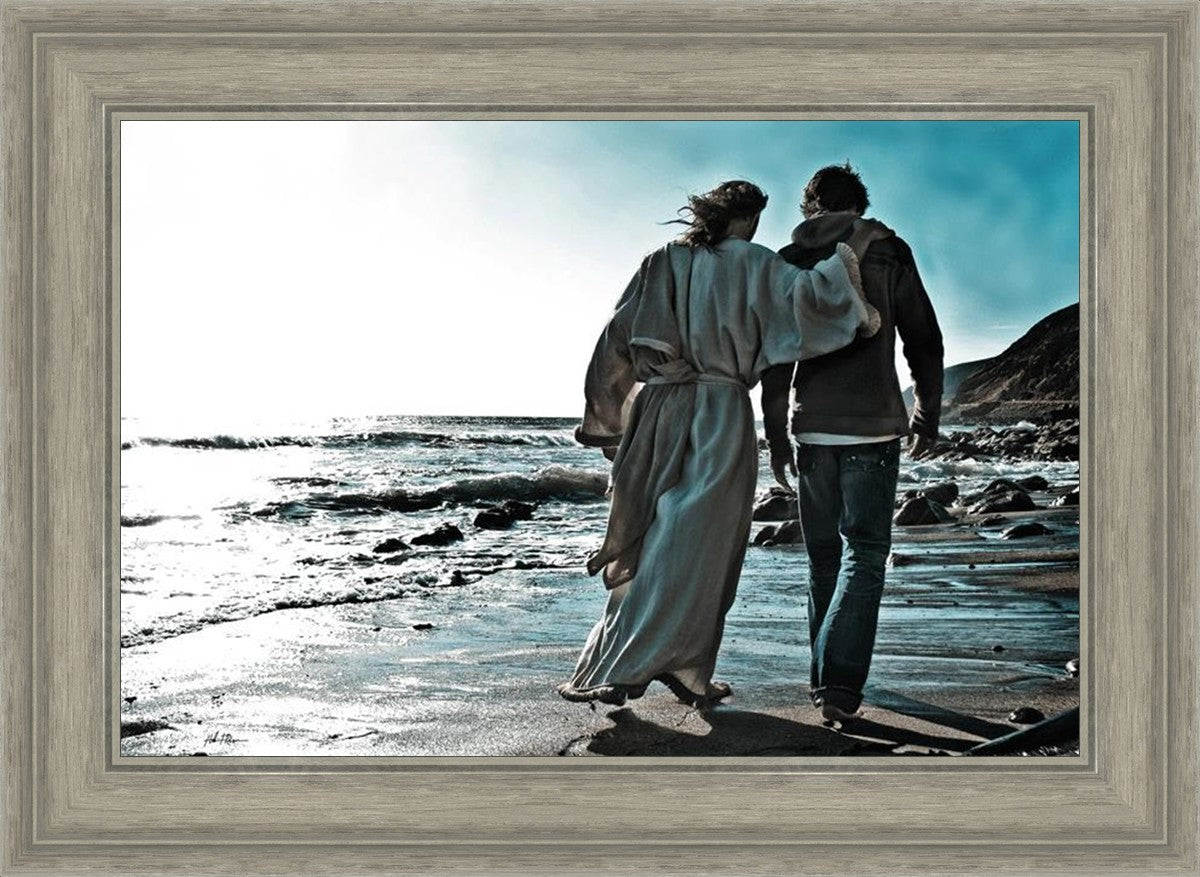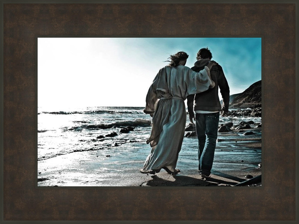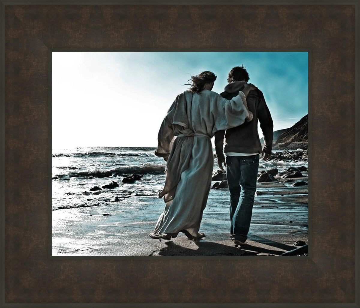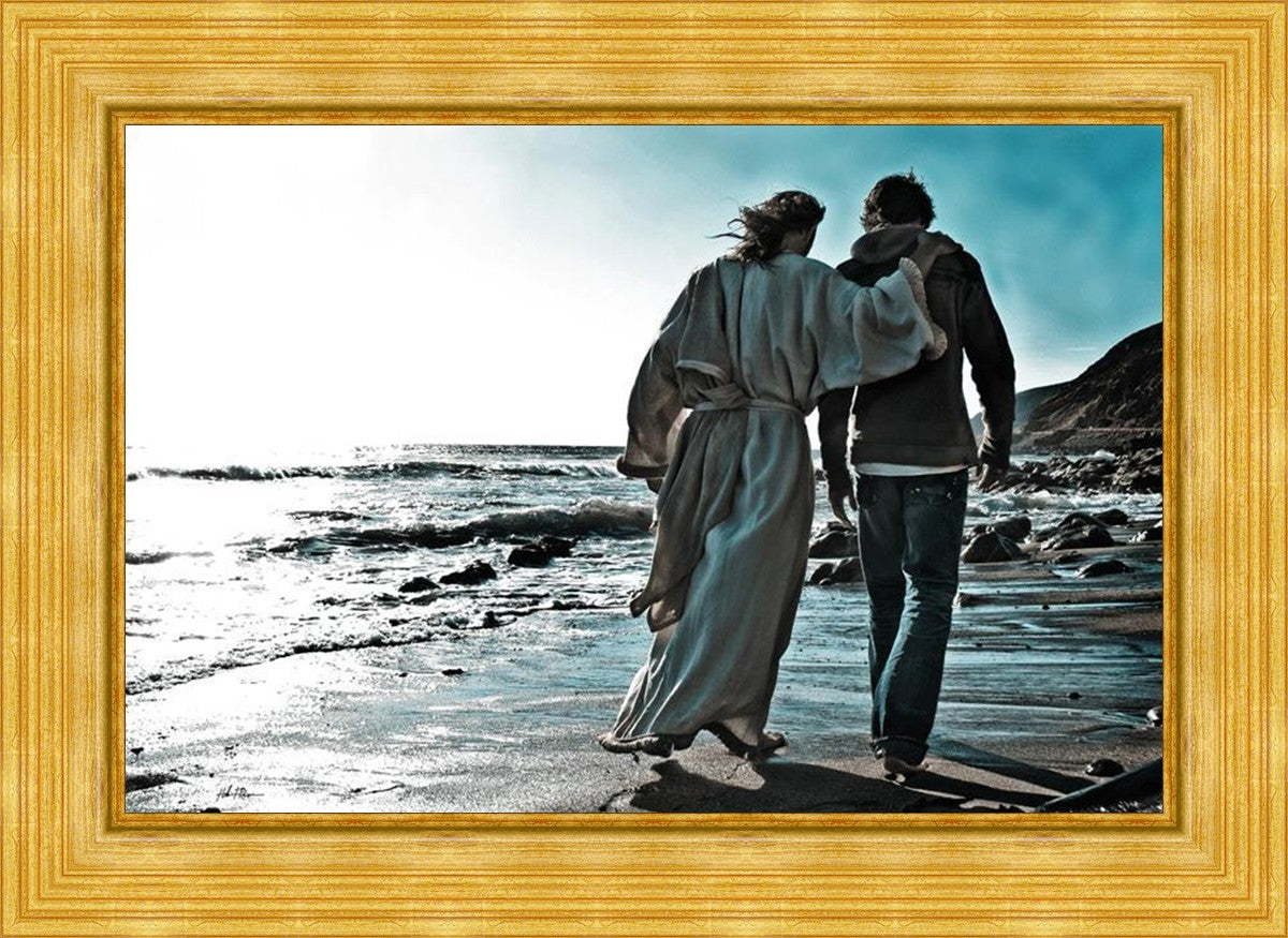 "My Friend" by Helen Thomas Robinson is a captivating photograph portraying Jesus Christ dressed in a robe, walking on the beach with his arm on the shoulder of a friend. This heartwarming image captures the essence of Jesus as our friend.