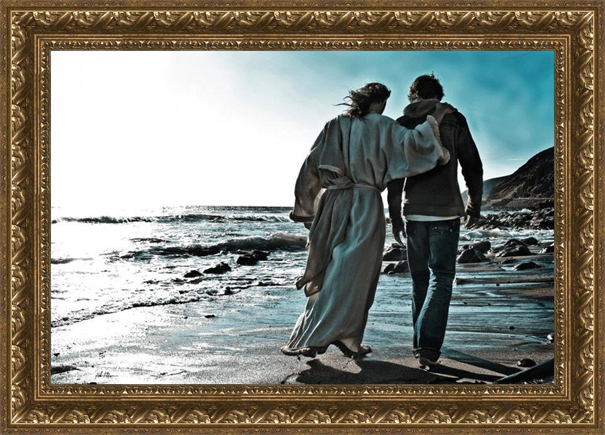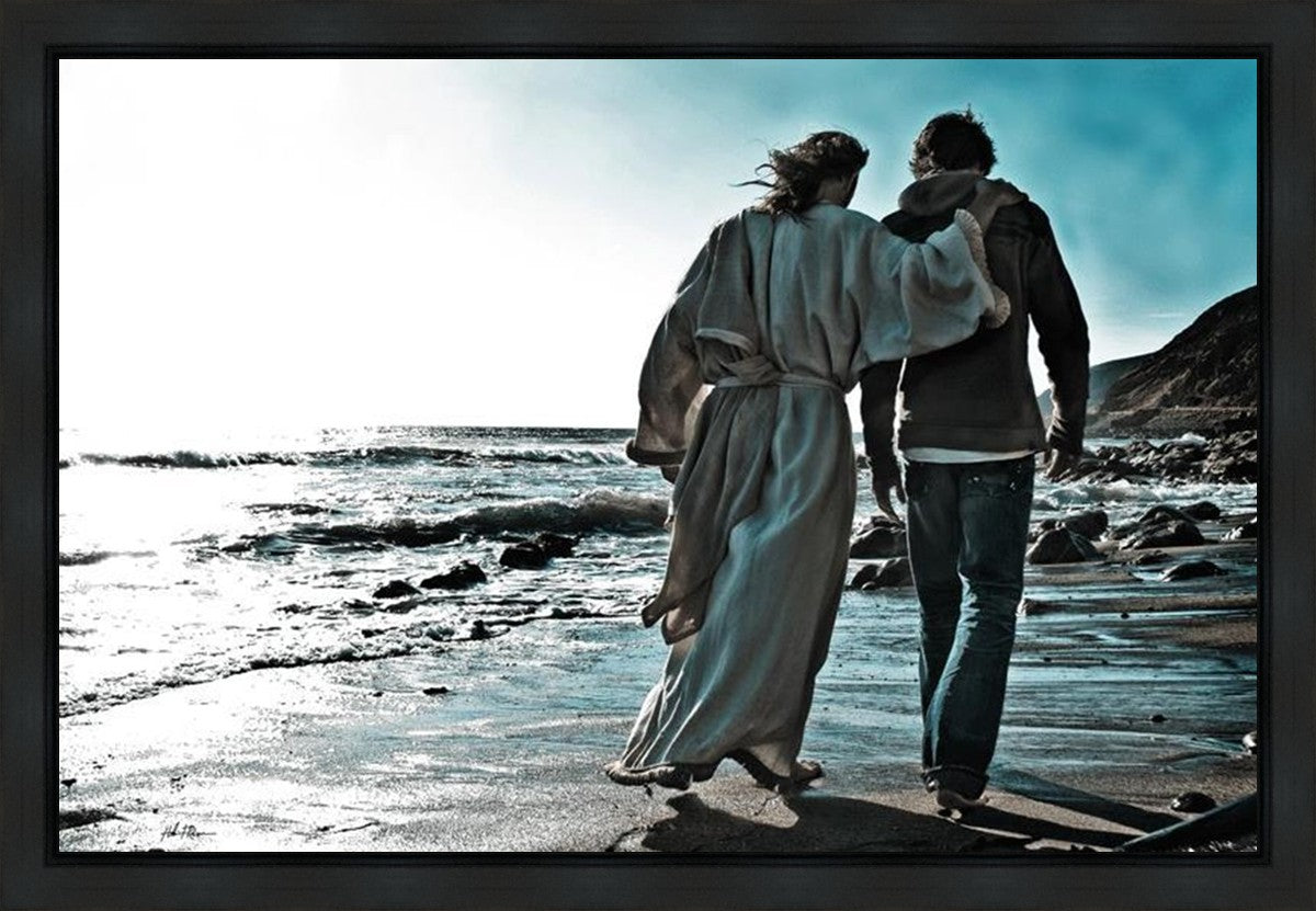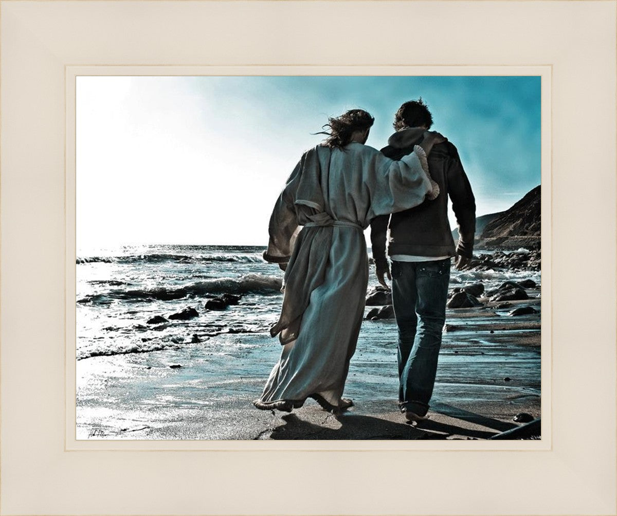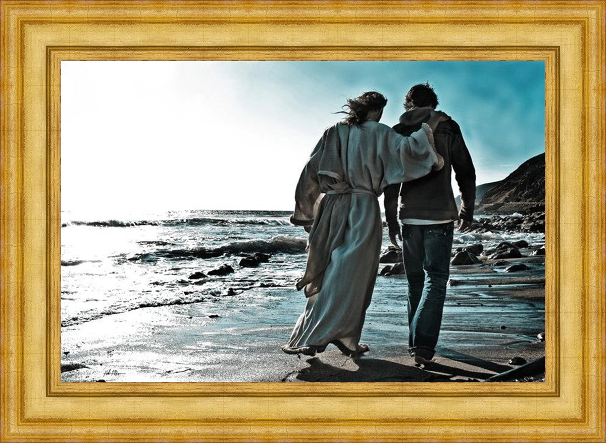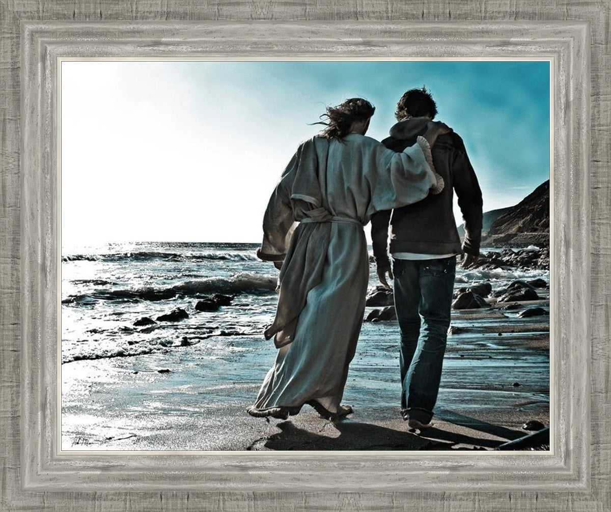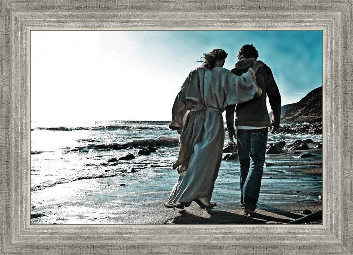 "My Friend" by Helen Thomas Robinson is a captivating photograph portraying Jesus Christ dressed in a robe, walking on the beach with his arm on the shoulder of a friend. This heartwarming image captures the essence of Jesus as our friend.