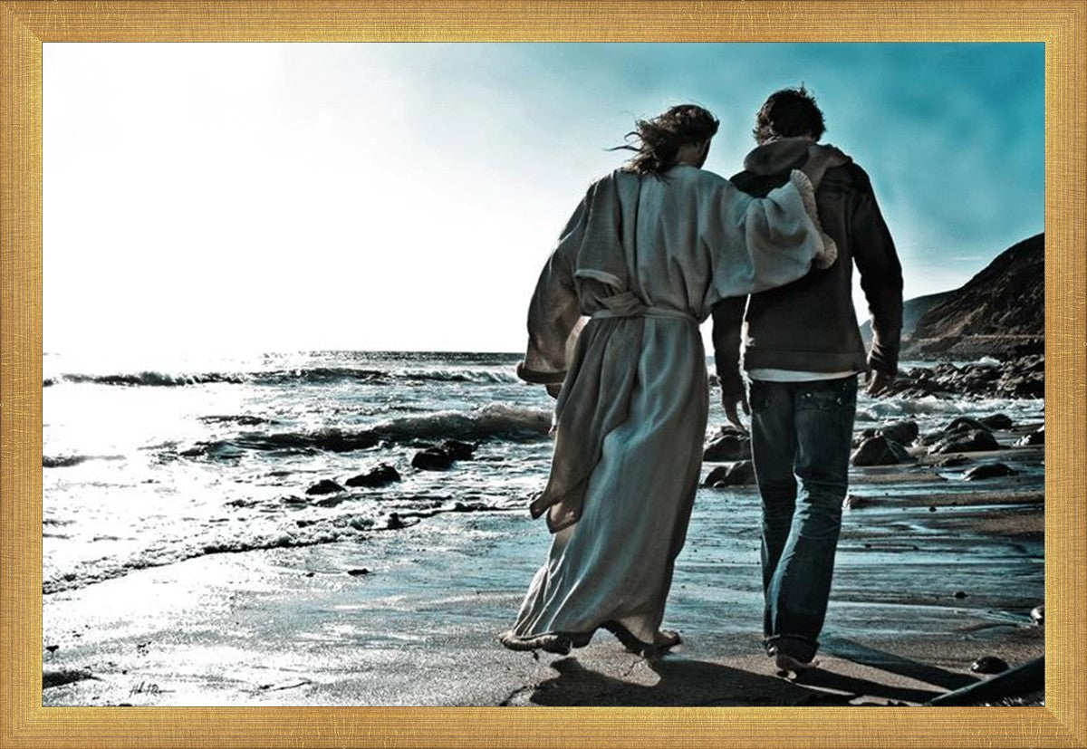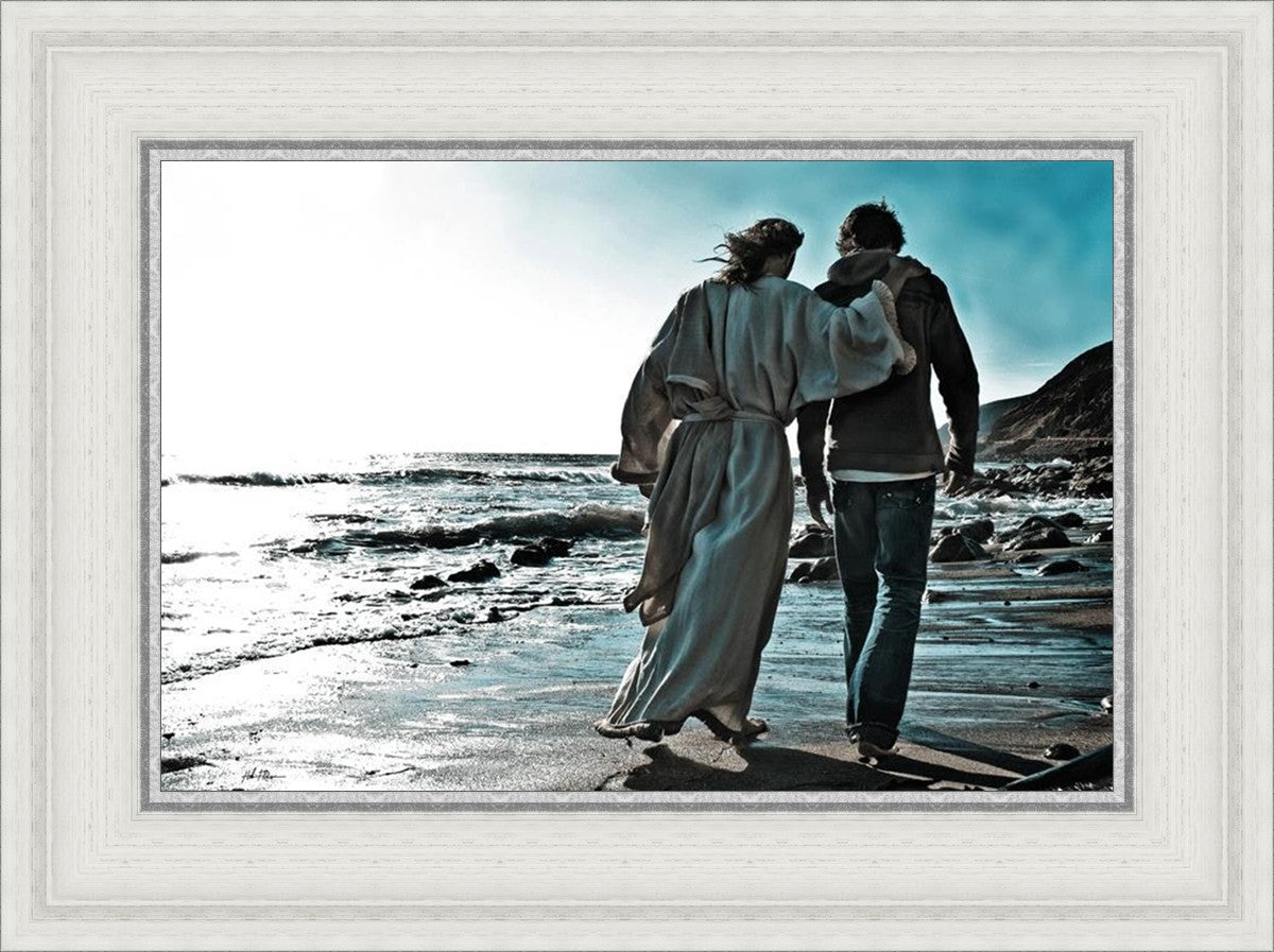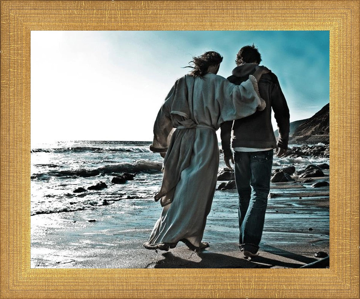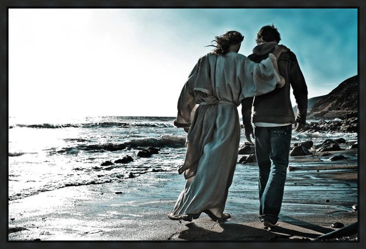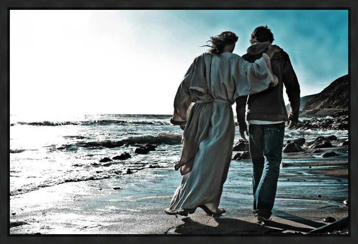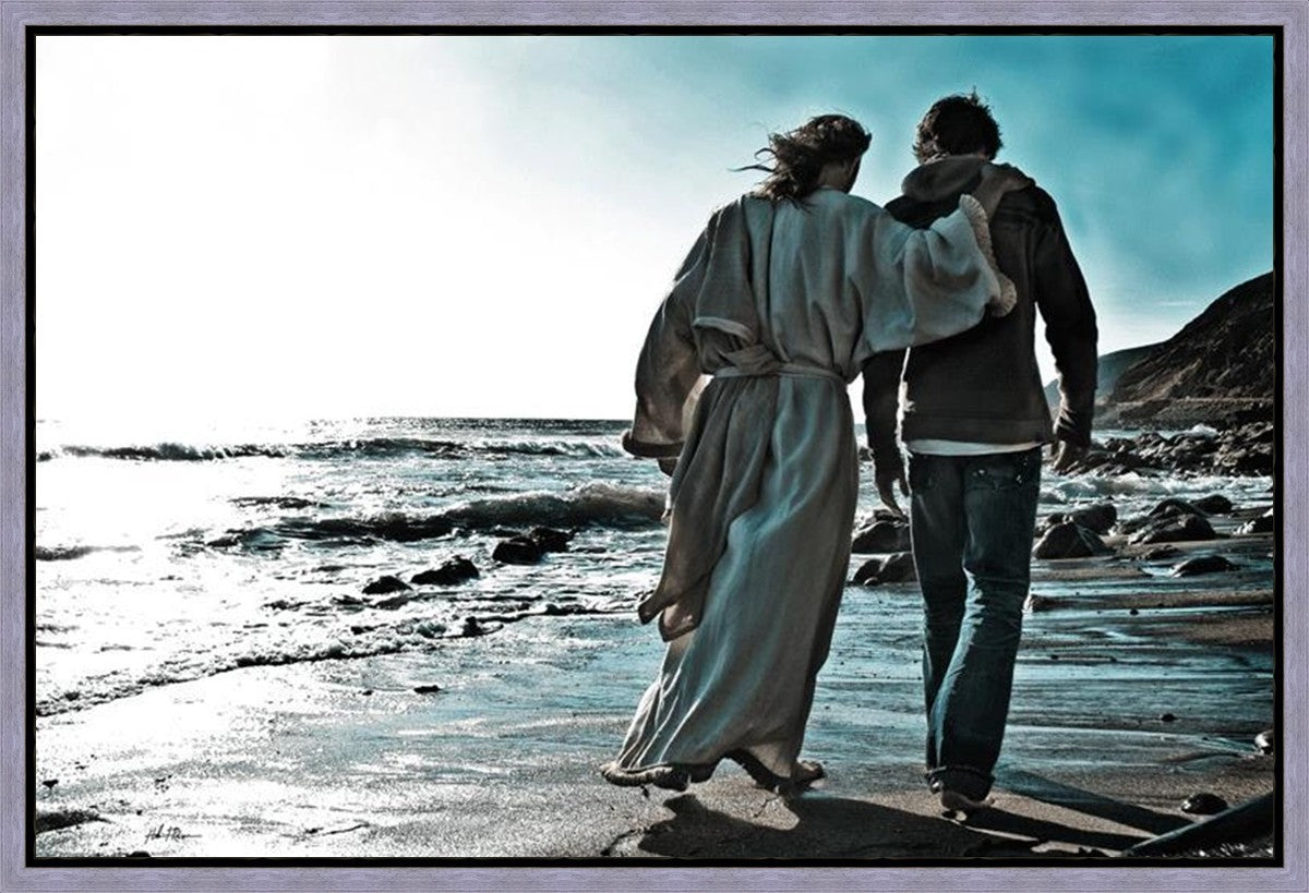 "My Friend" by Helen Thomas Robinson is a captivating photograph portraying Jesus Christ dressed in a robe, walking on the beach with his arm on the shoulder of a friend. This heartwarming image captures the essence of Jesus as our friend.