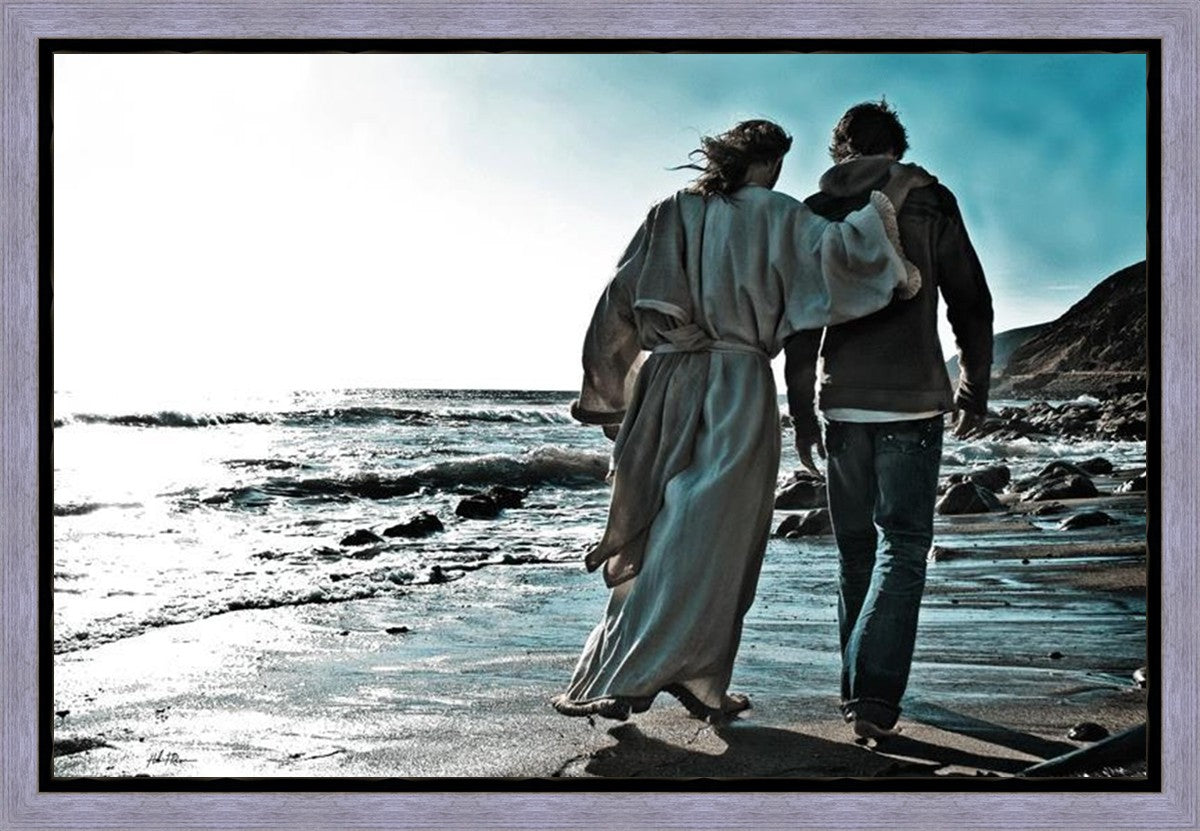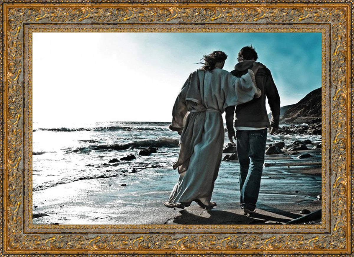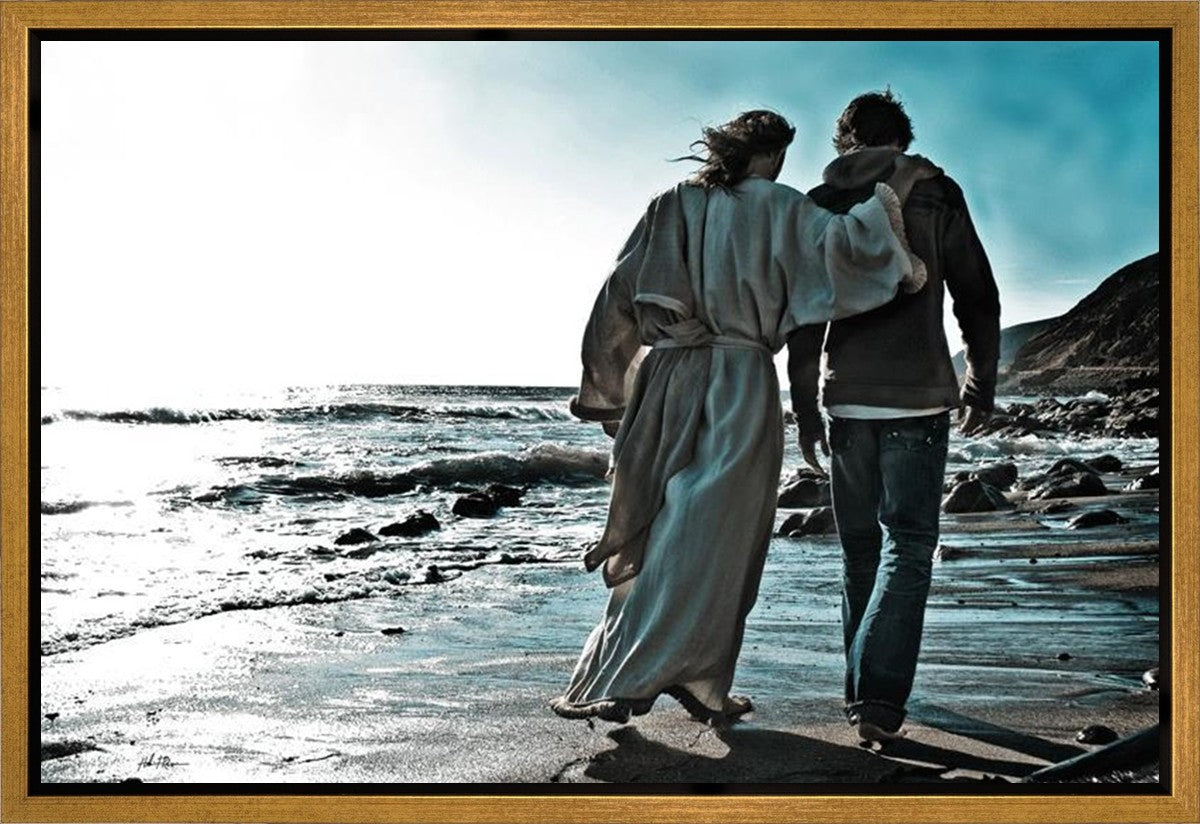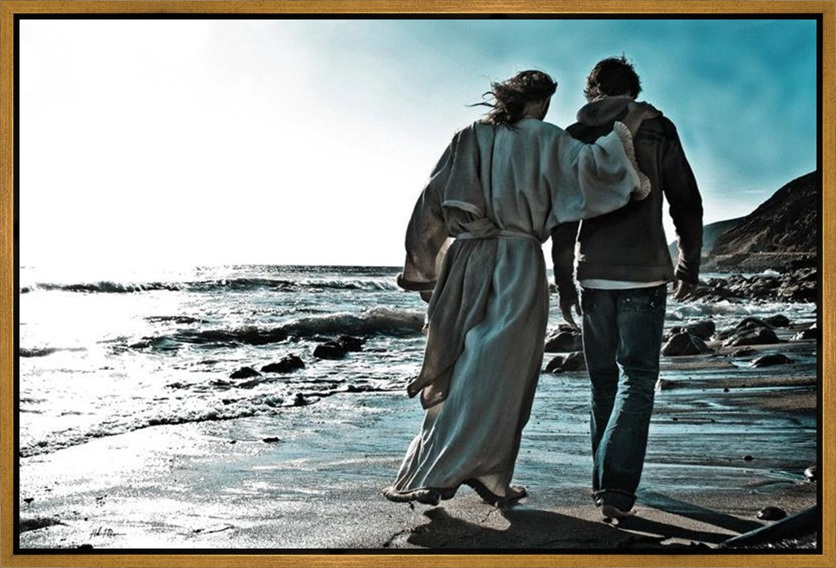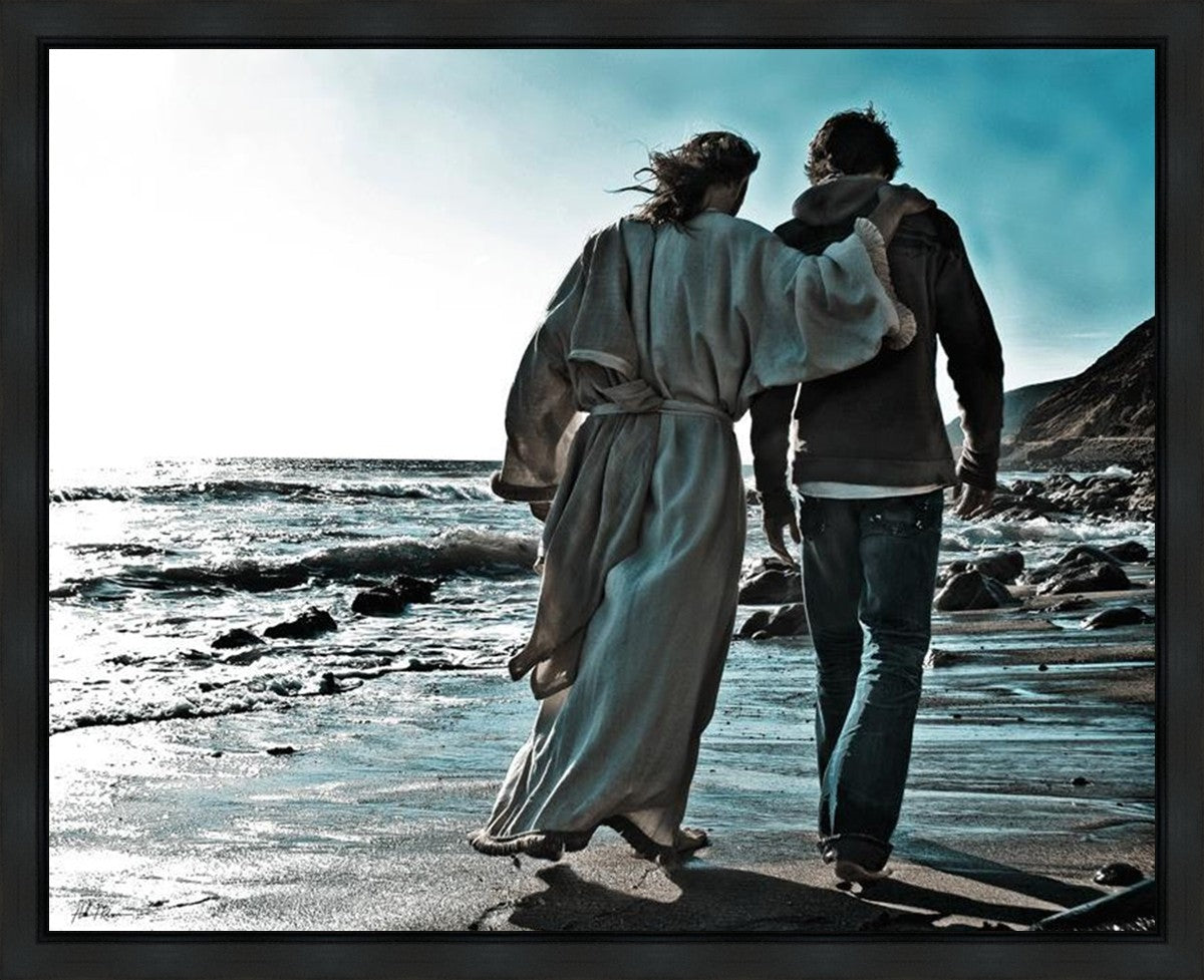 "My Friend" by Helen Thomas Robinson is a captivating photograph portraying Jesus Christ dressed in a robe, walking on the beach with his arm on the shoulder of a friend. This heartwarming image captures the essence of Jesus as our friend.