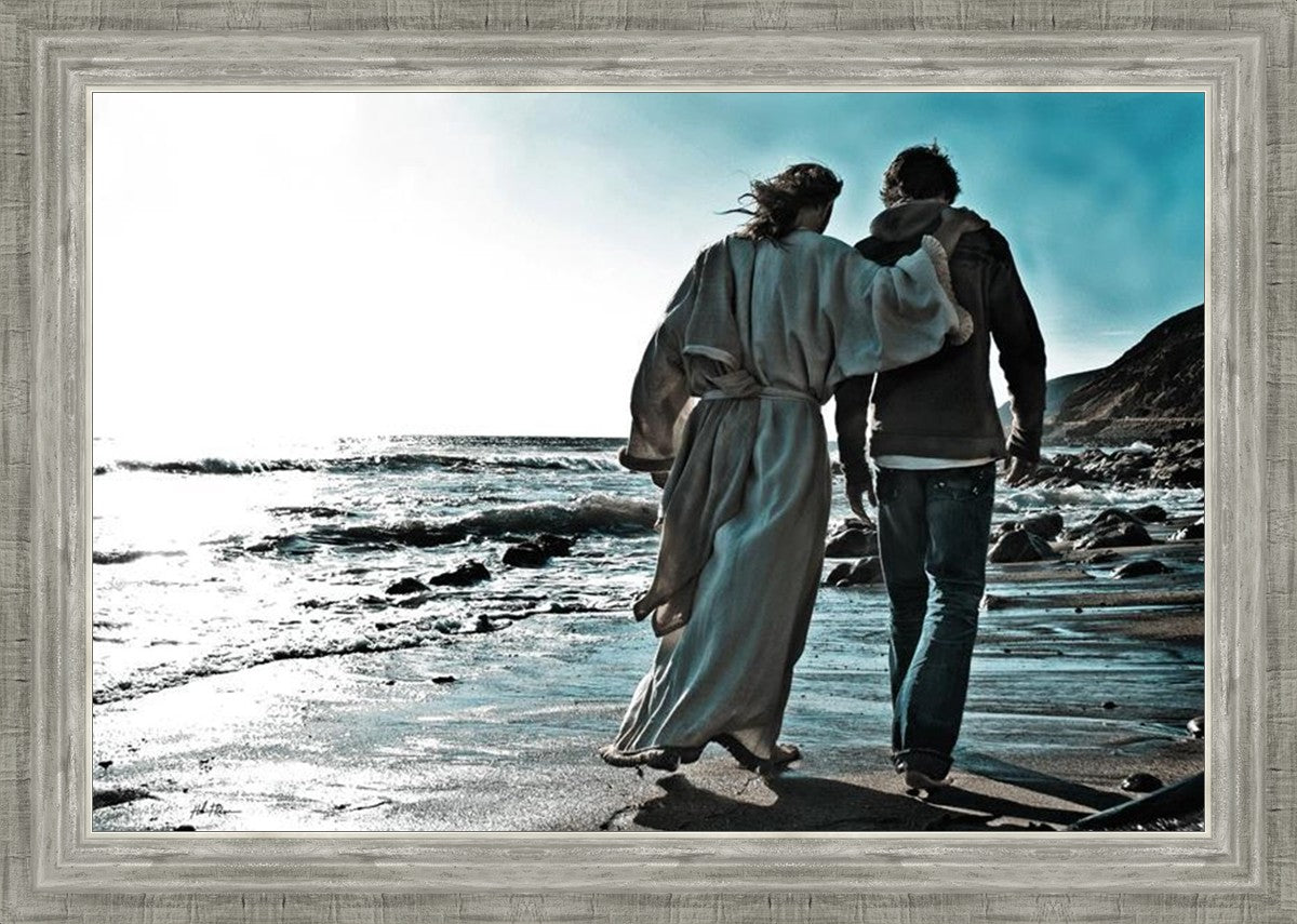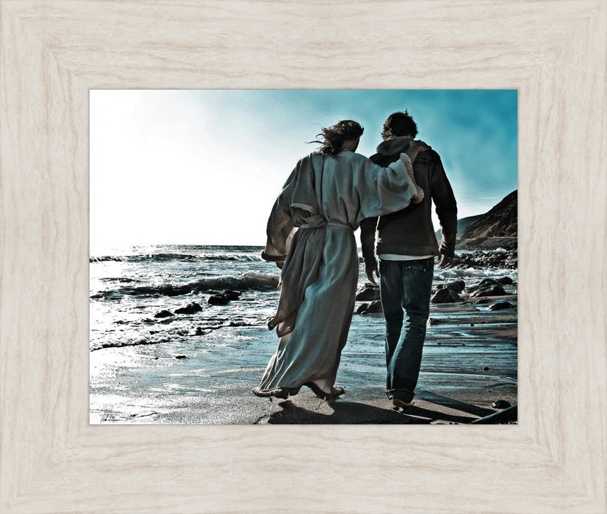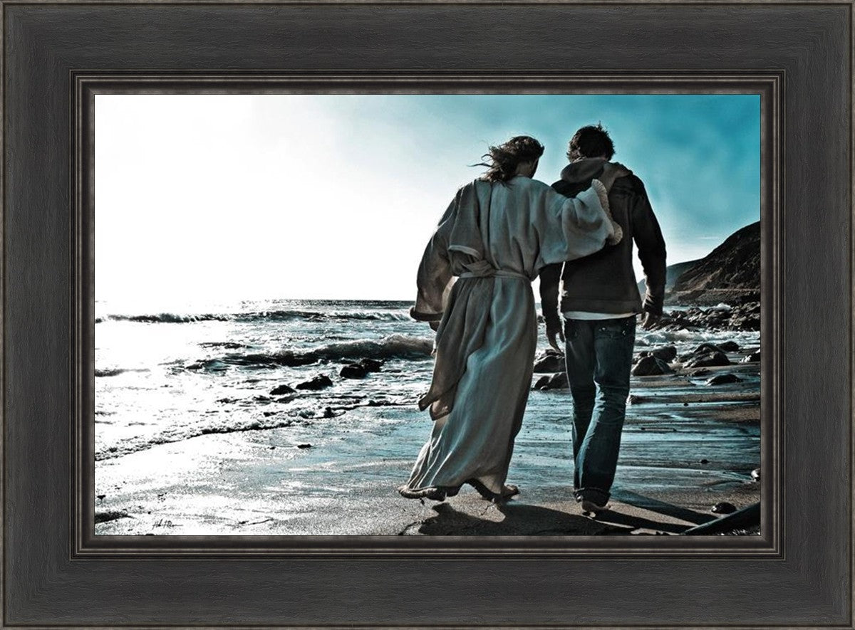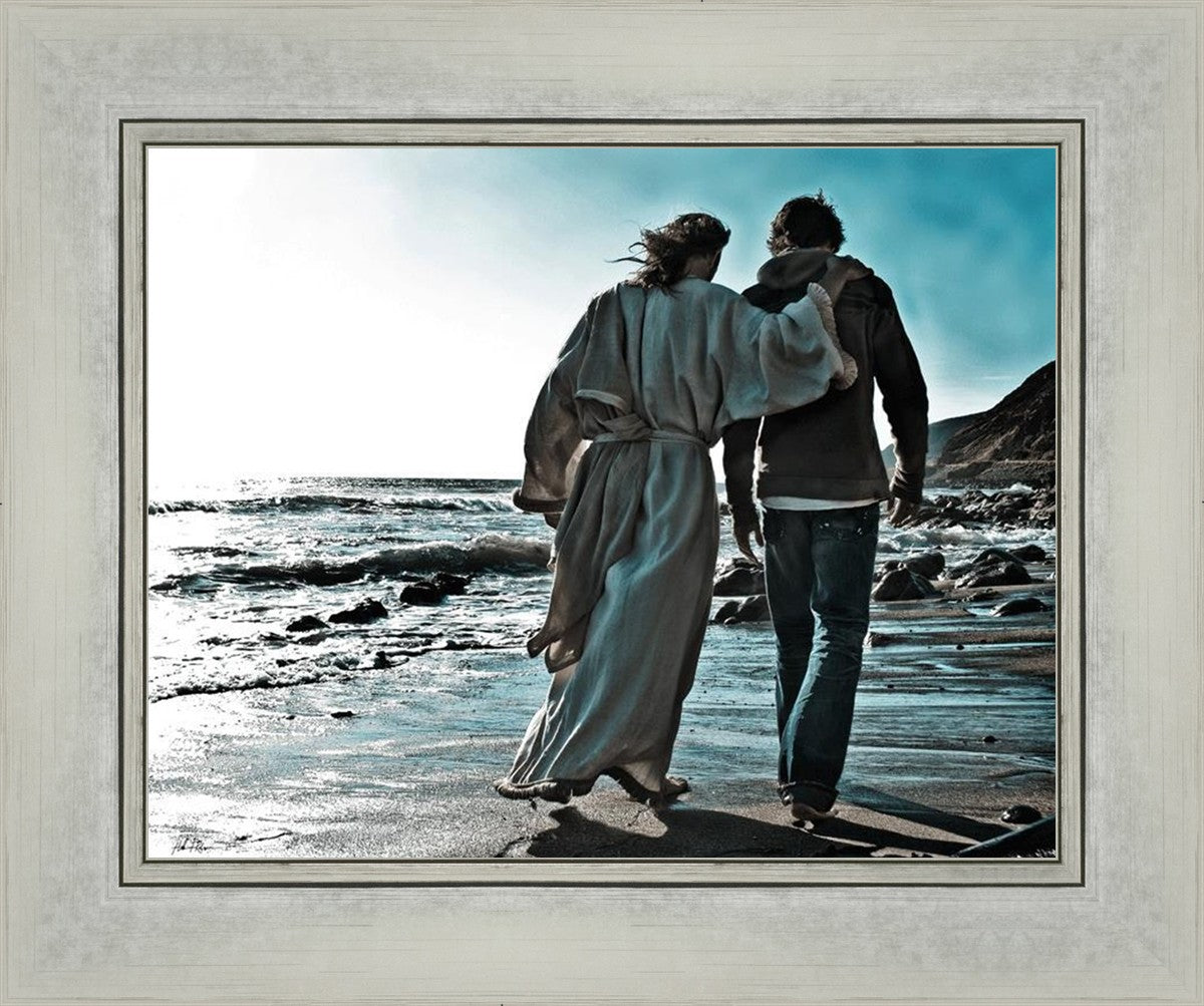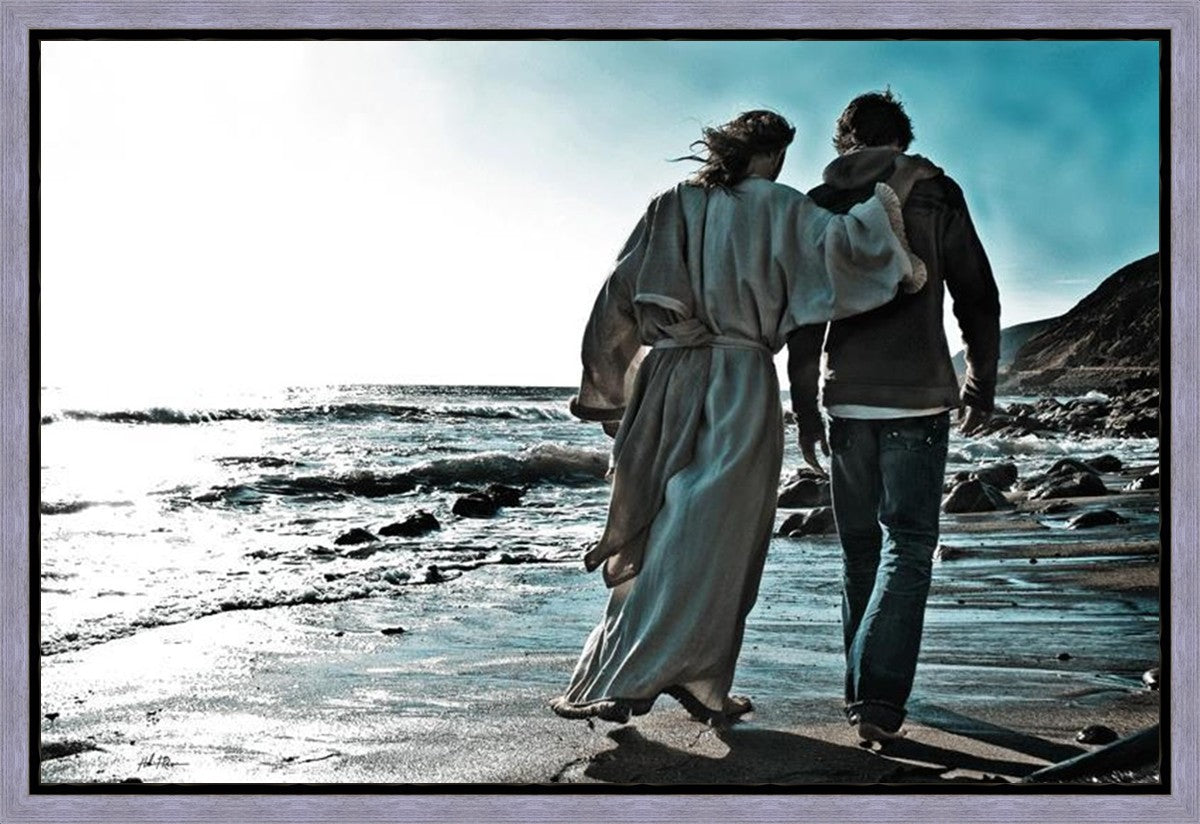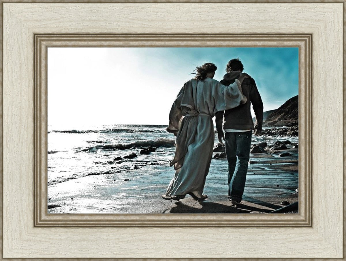 "My Friend" by Helen Thomas Robinson is a captivating photograph portraying Jesus Christ dressed in a robe, walking on the beach with his arm on the shoulder of a friend. This heartwarming image captures the essence of Jesus as our friend.