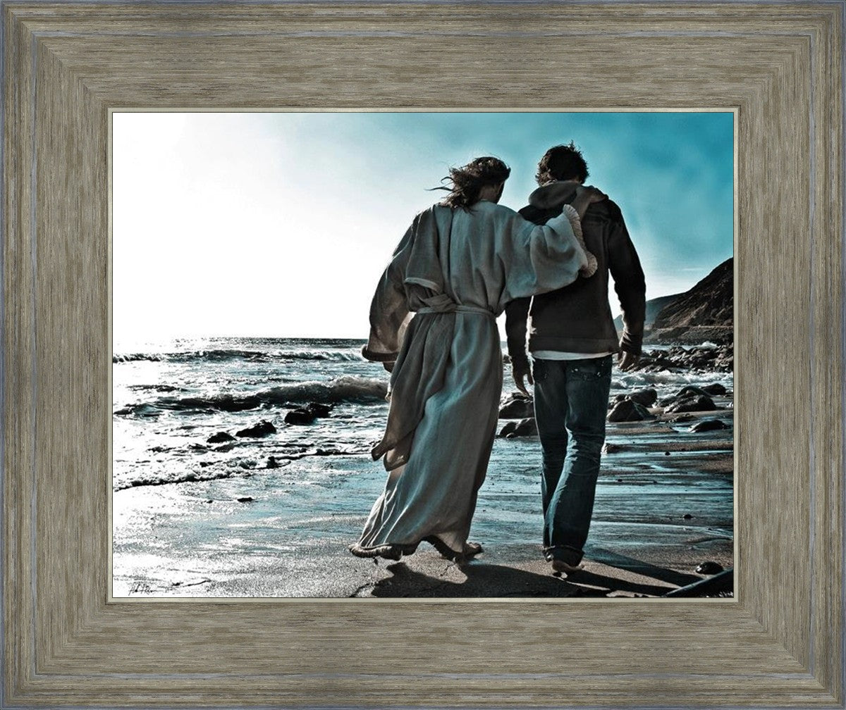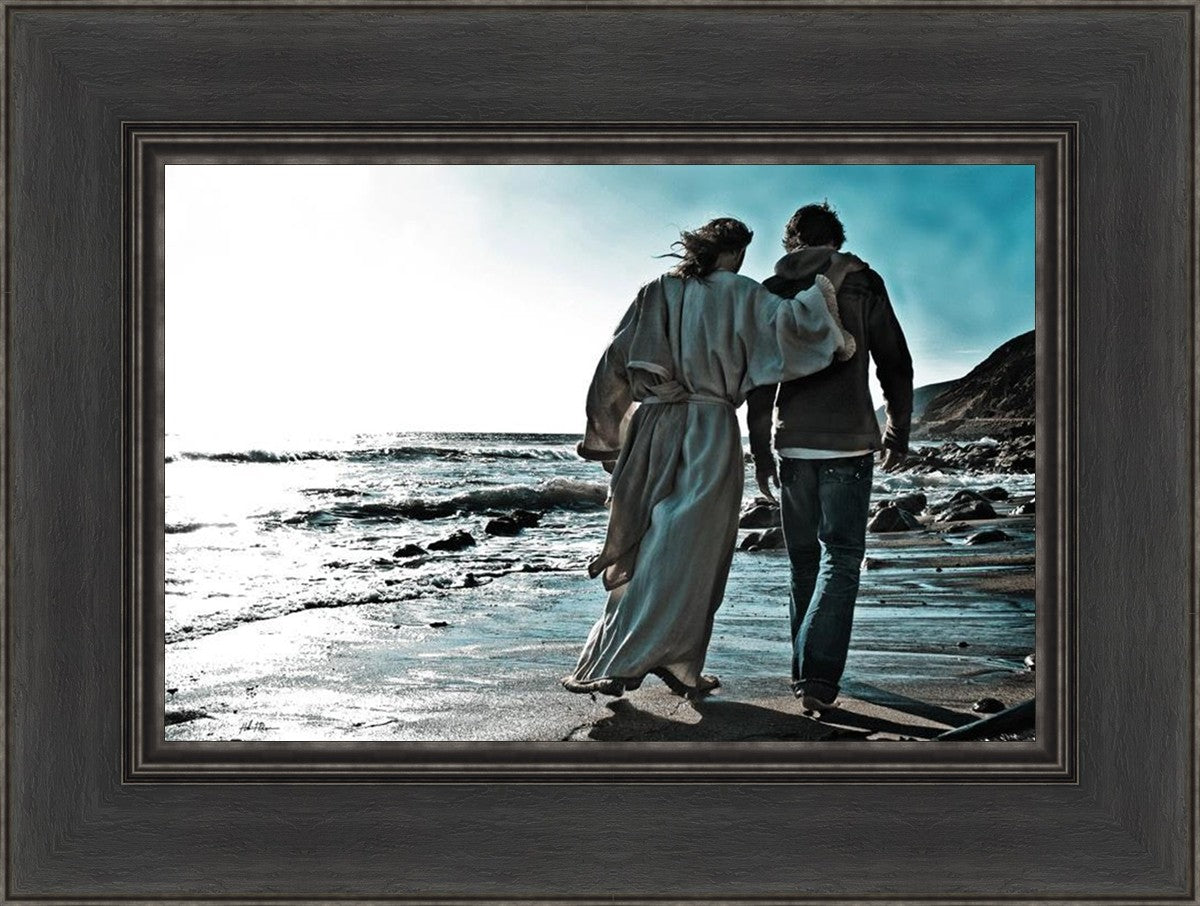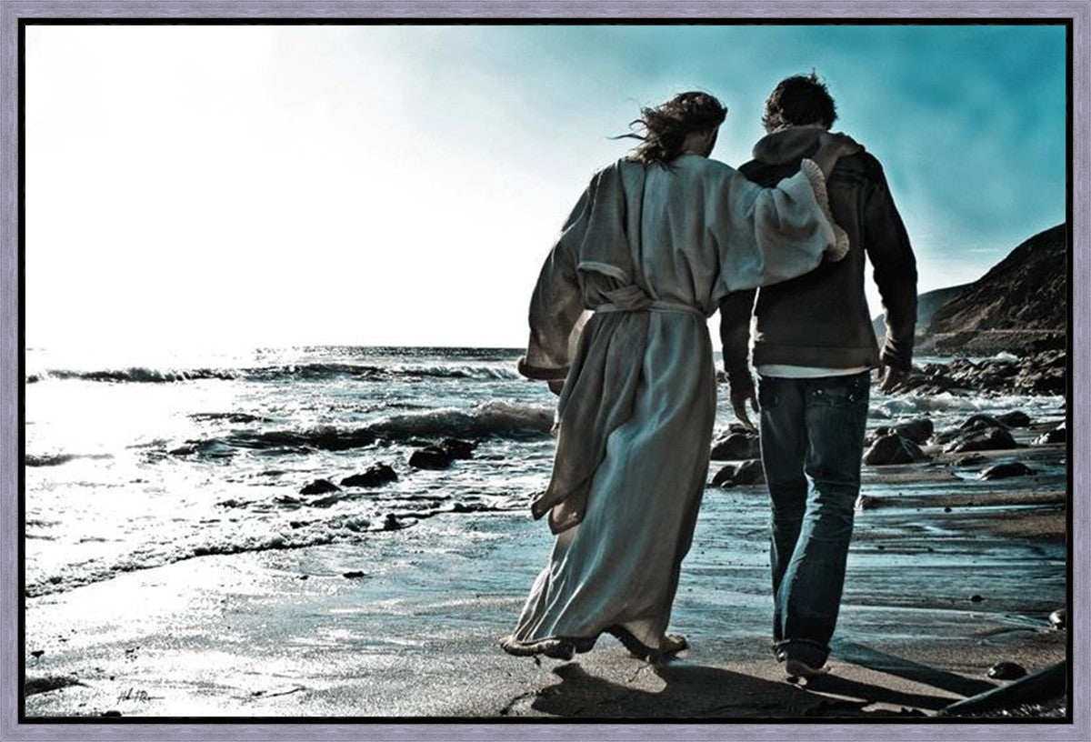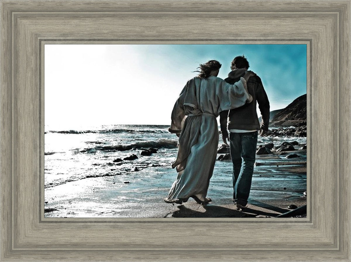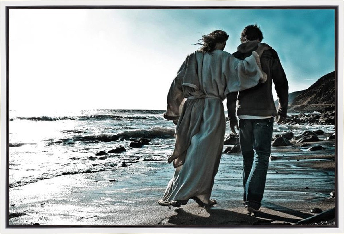 "My Friend" by Helen Thomas Robinson is a captivating photograph portraying Jesus Christ dressed in a robe, walking on the beach with his arm on the shoulder of a friend. This heartwarming image captures the essence of Jesus as our friend.