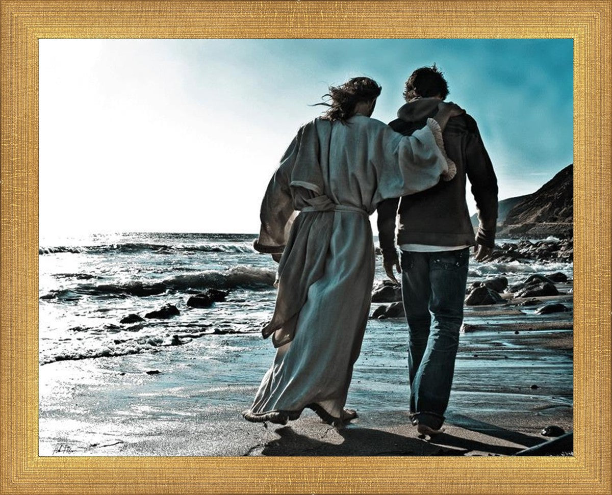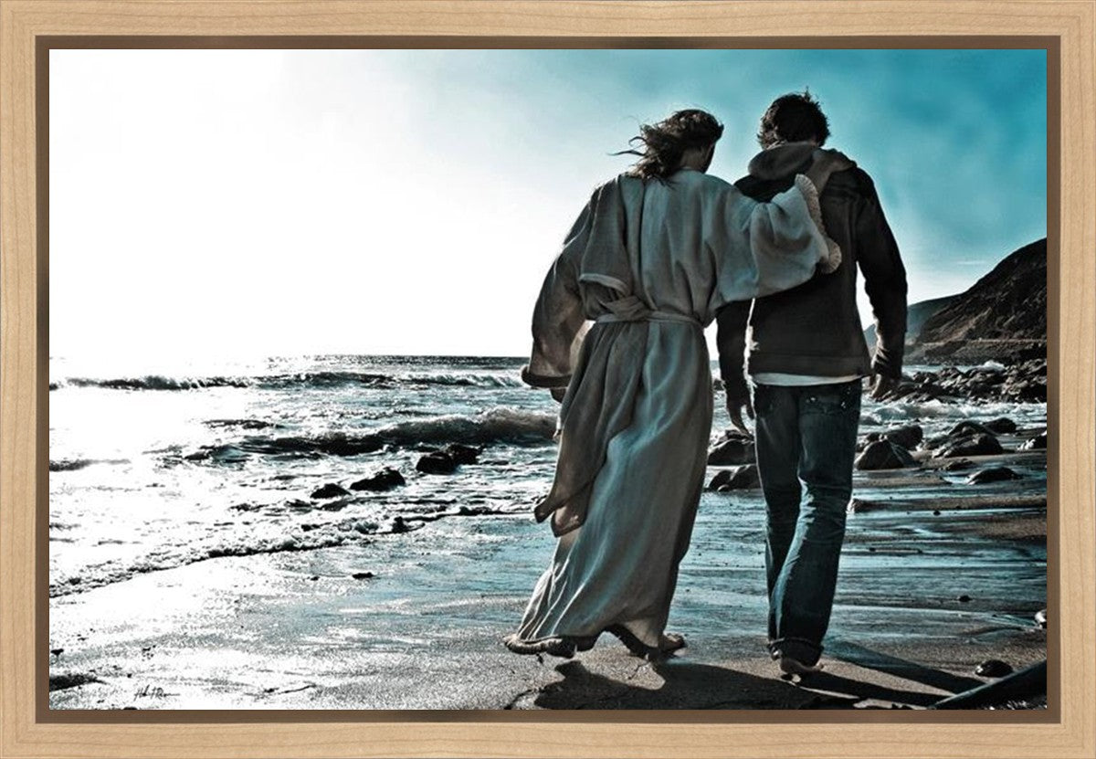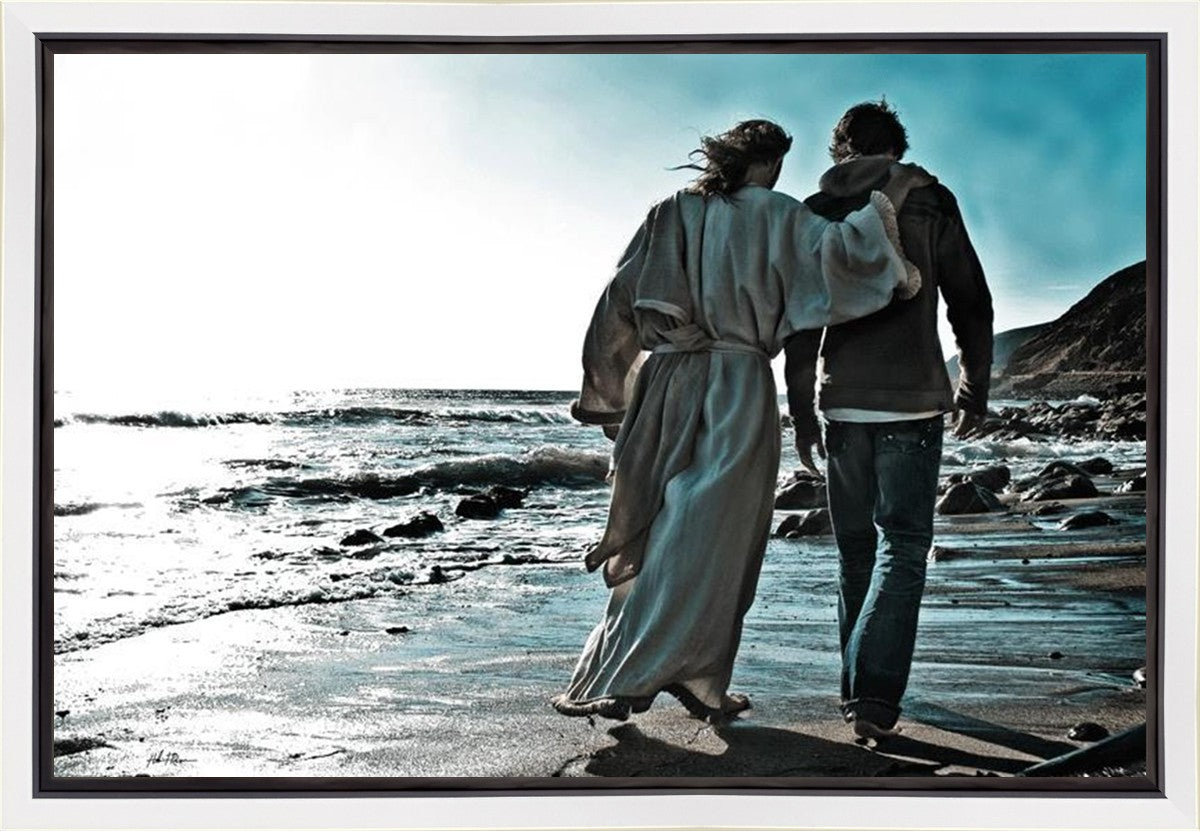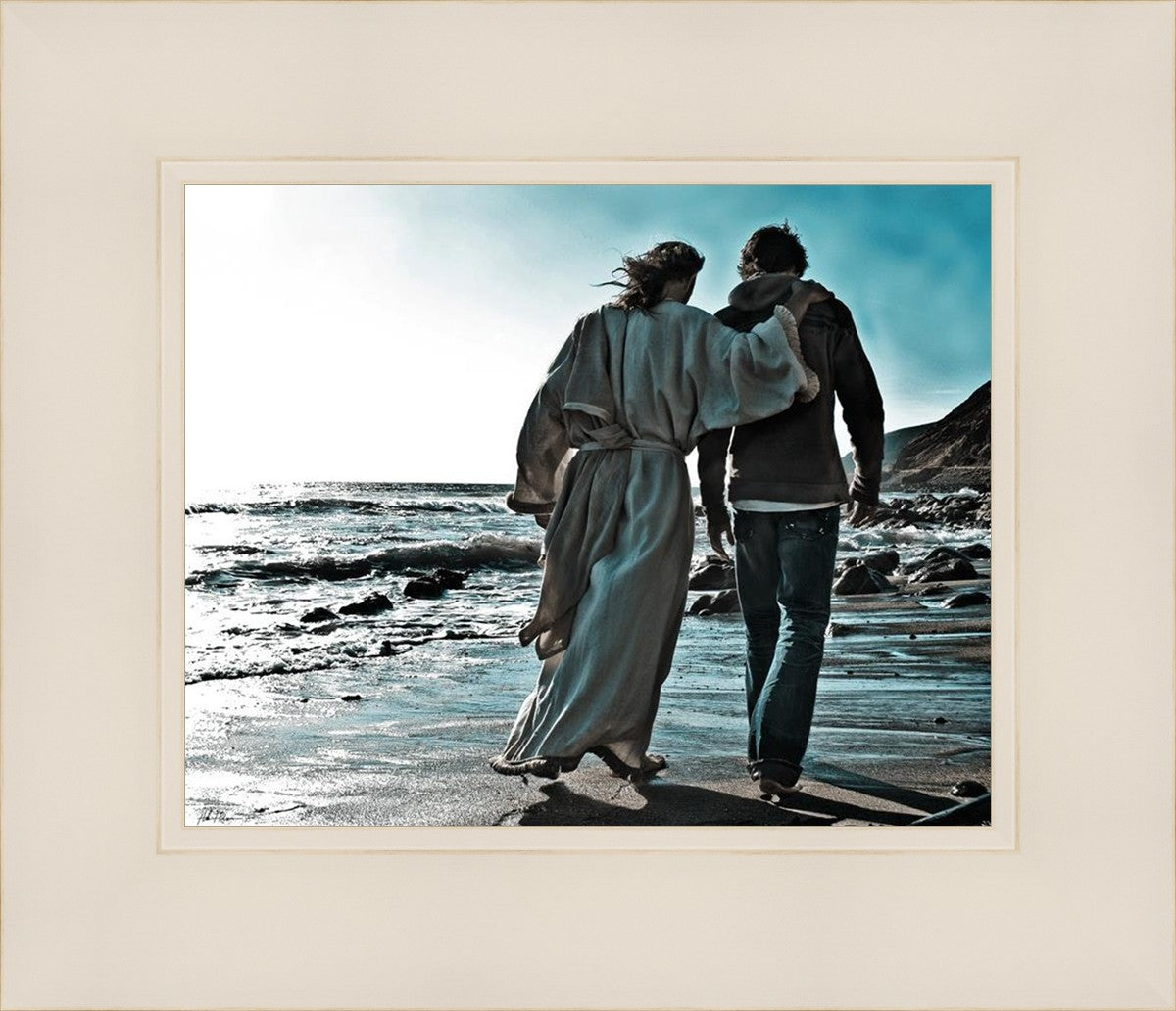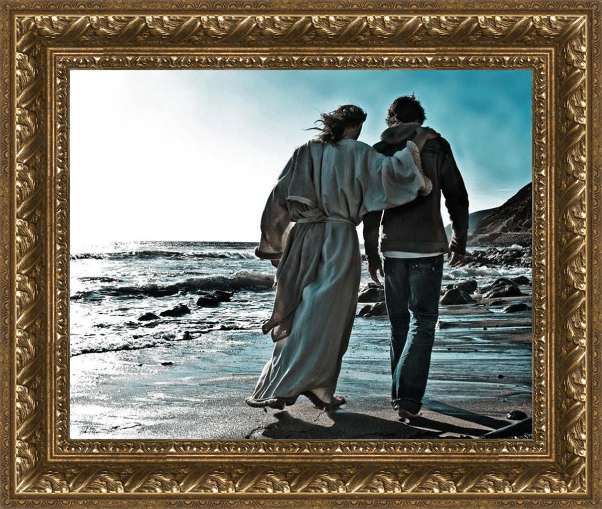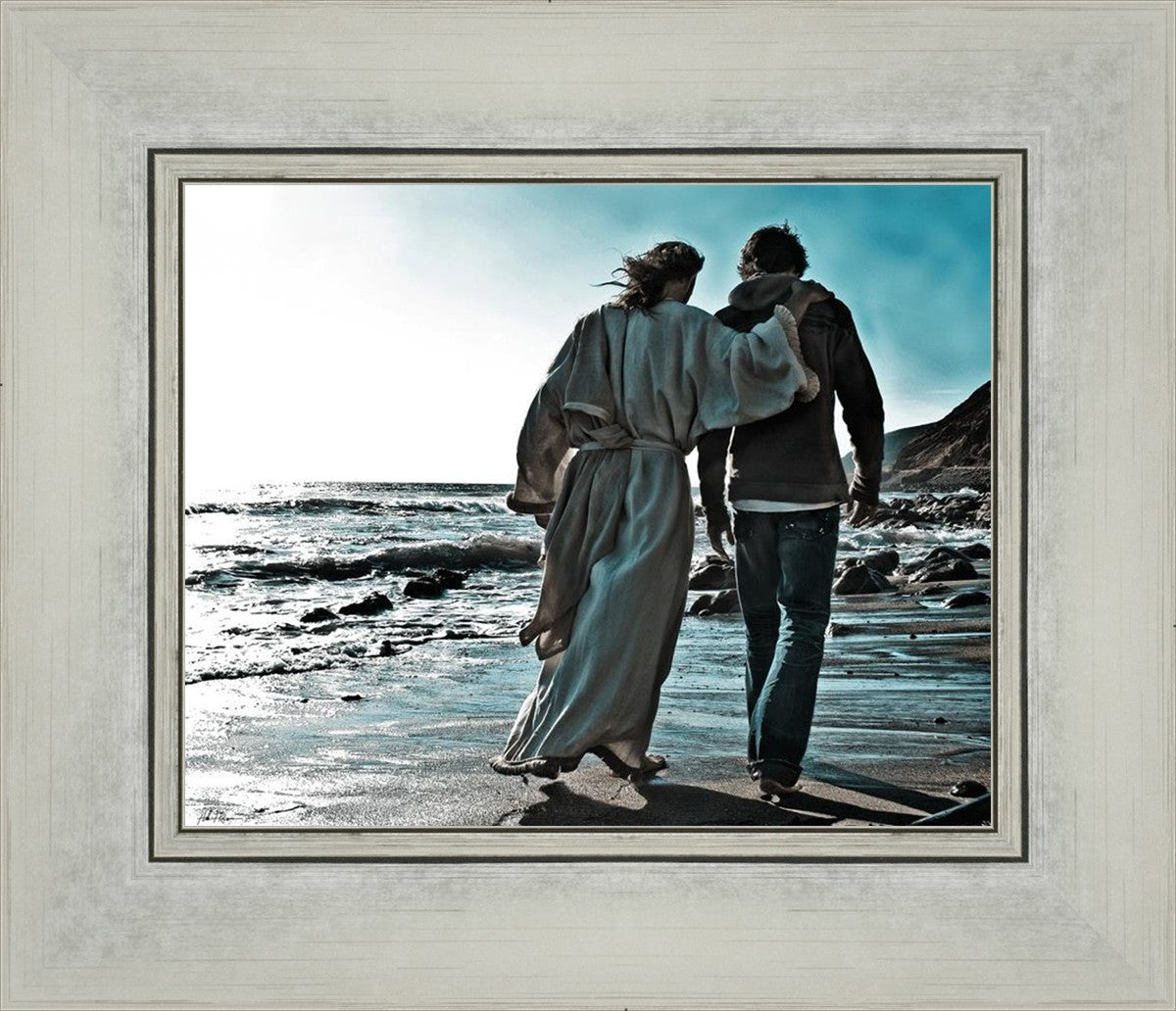 "My Friend" by Helen Thomas Robinson is a captivating photograph portraying Jesus Christ dressed in a robe, walking on the beach with his arm on the shoulder of a friend. This heartwarming image captures the essence of Jesus as our friend.