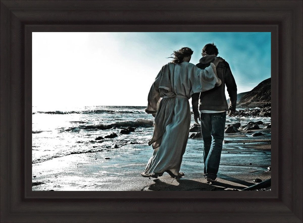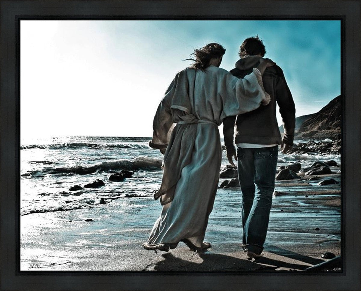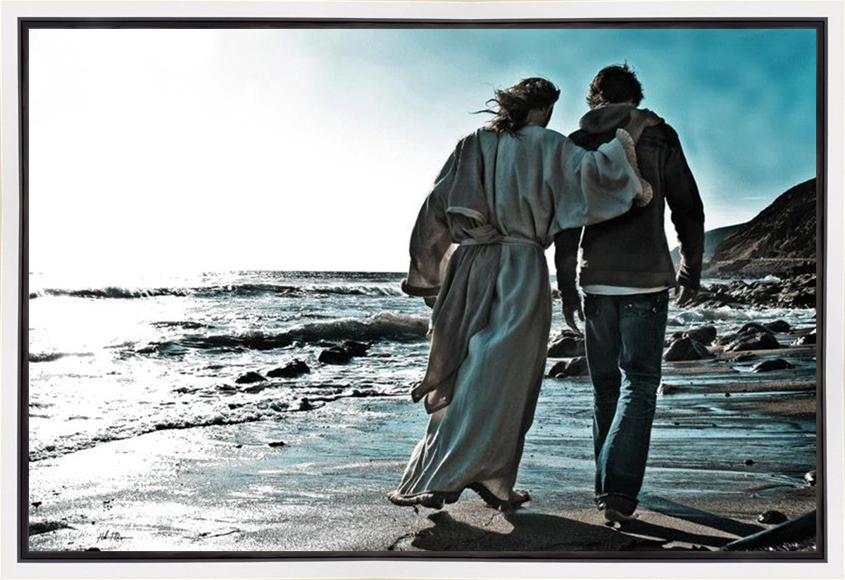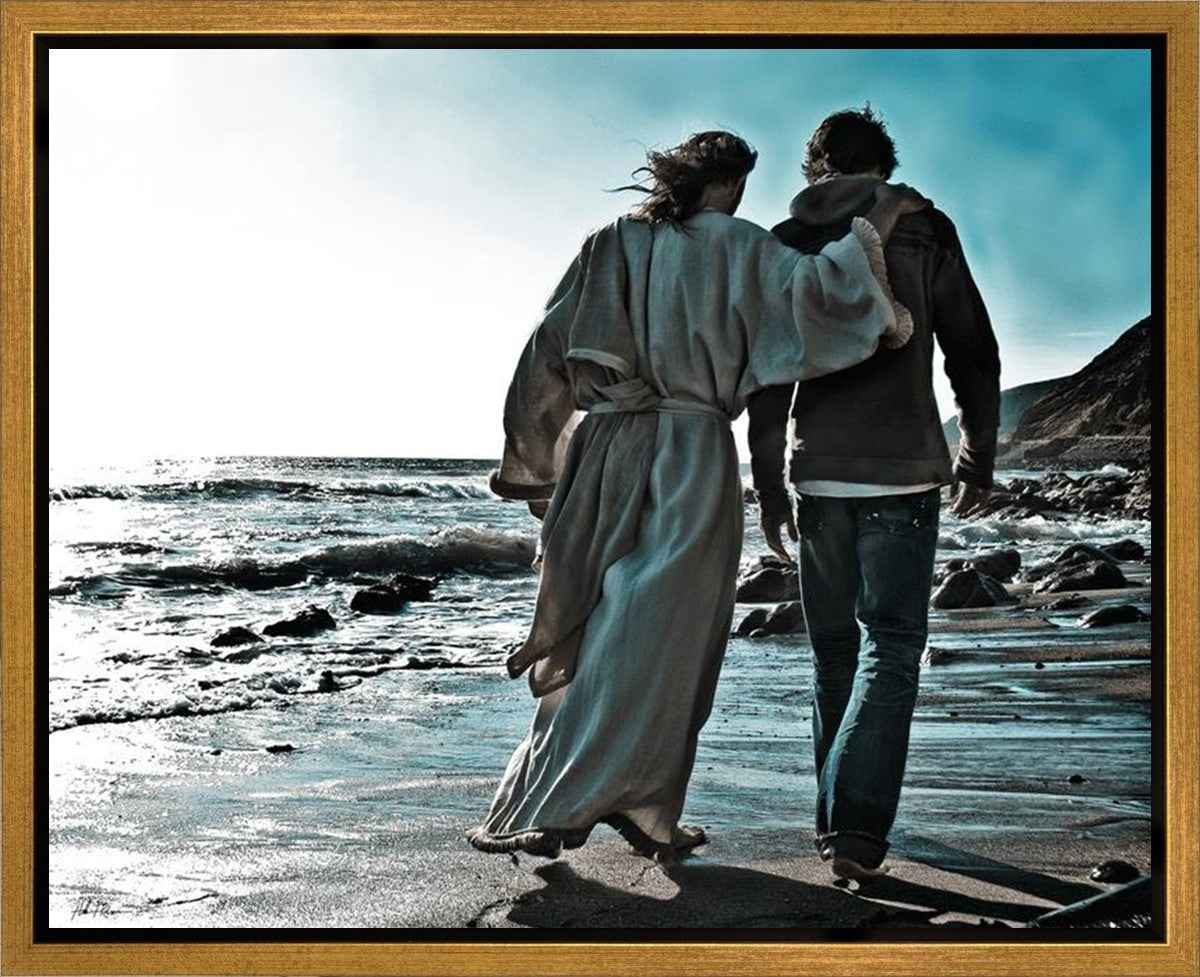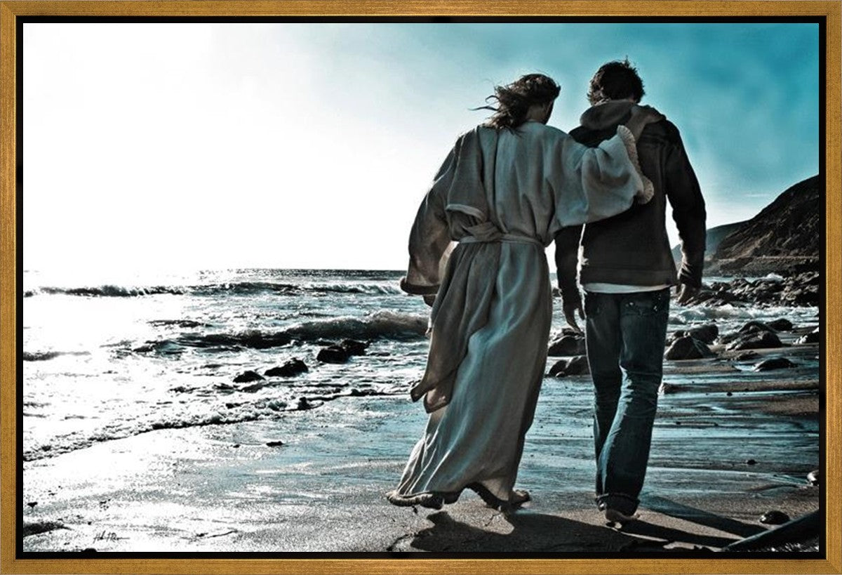 "My Friend" by Helen Thomas Robinson is a captivating photograph portraying Jesus Christ dressed in a robe, walking on the beach with his arm on the shoulder of a friend. This heartwarming image captures the essence of Jesus as our friend.