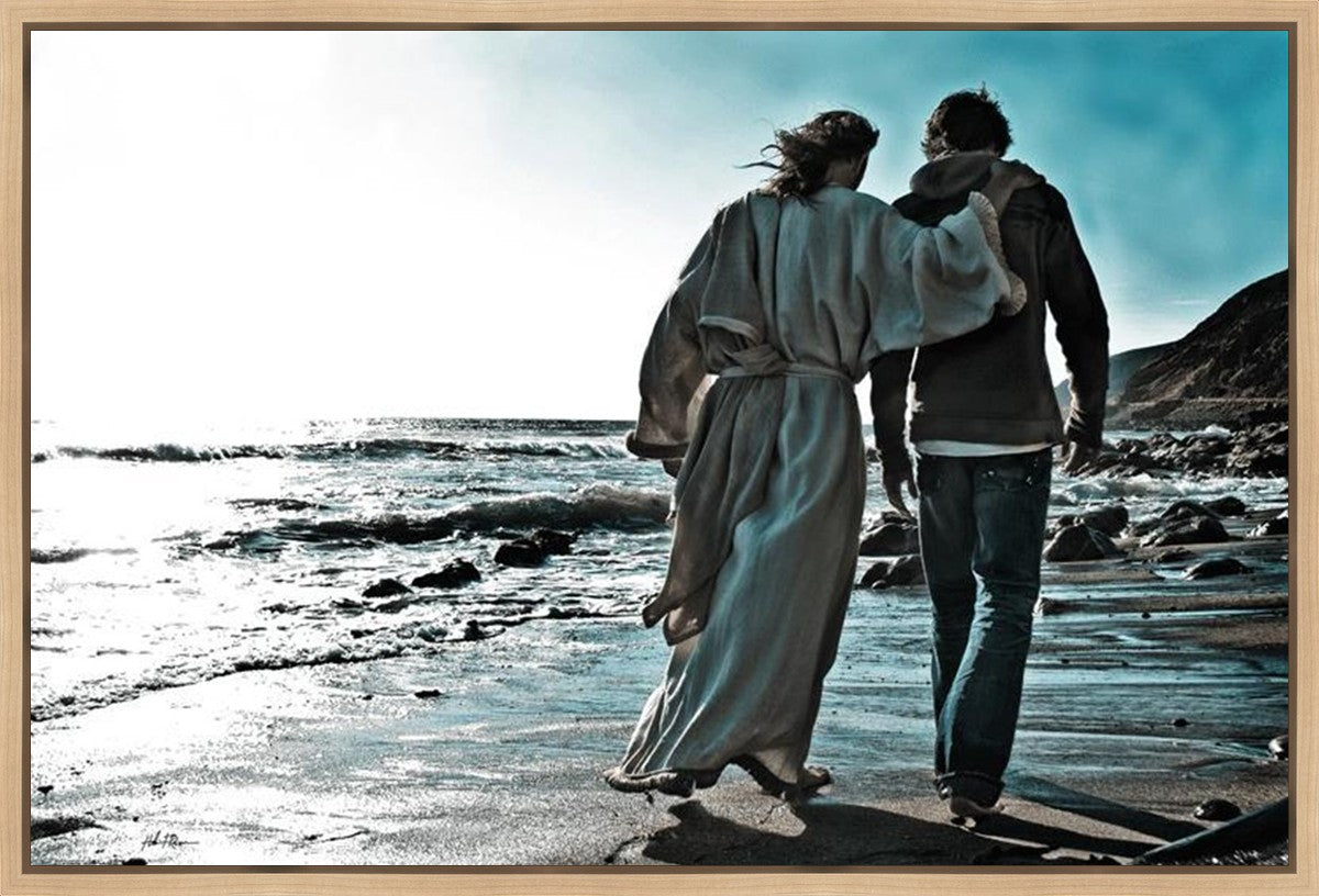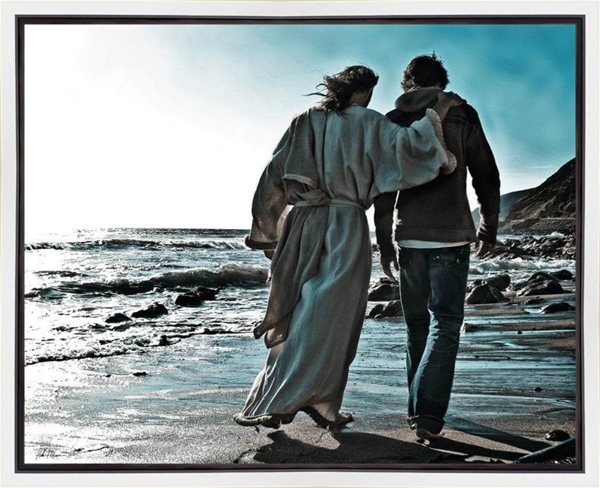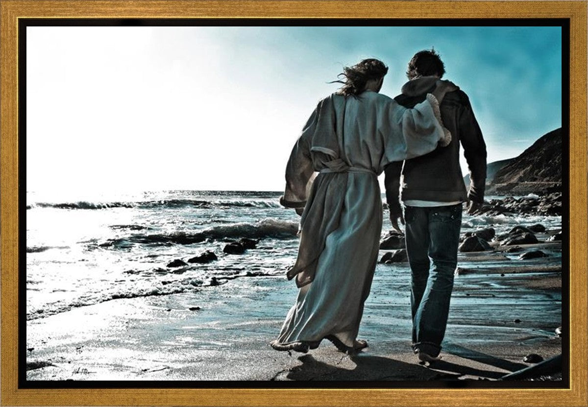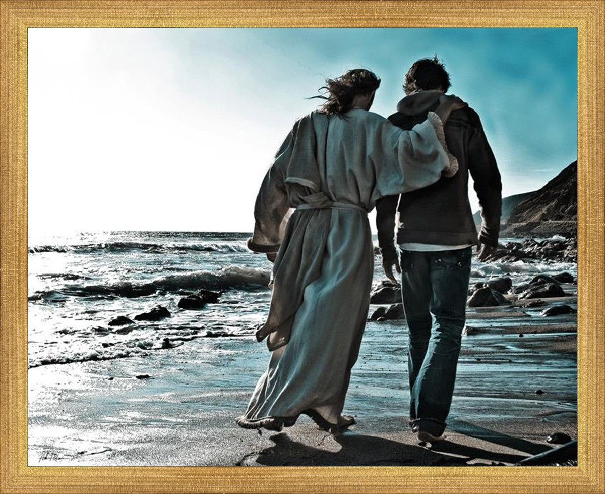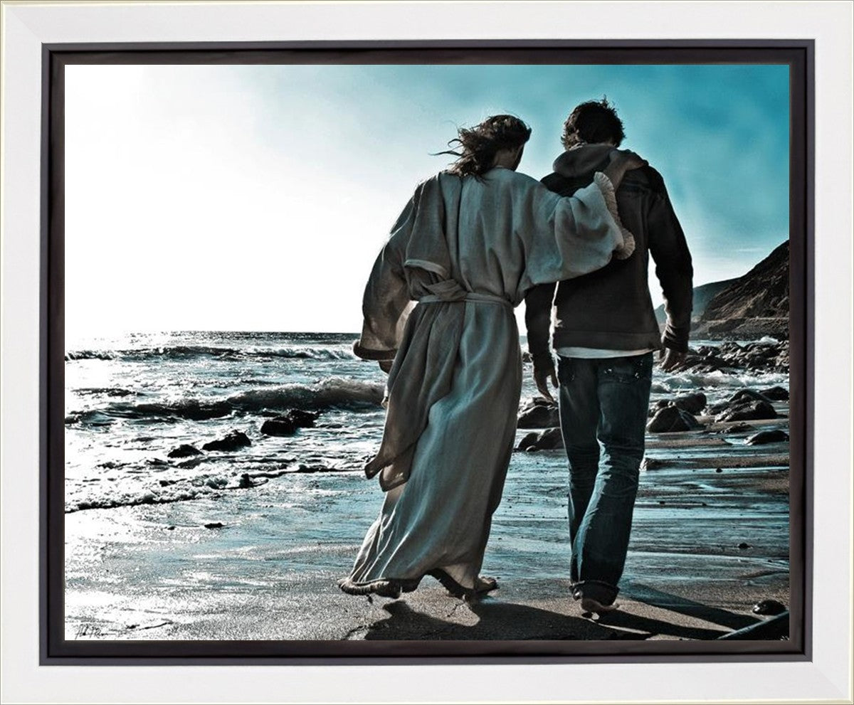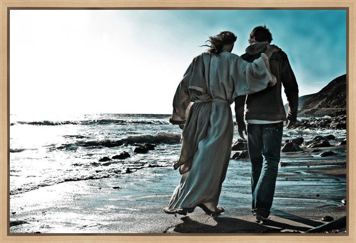 "My Friend" by Helen Thomas Robinson is a captivating photograph portraying Jesus Christ dressed in a robe, walking on the beach with his arm on the shoulder of a friend. This heartwarming image captures the essence of Jesus as our friend.