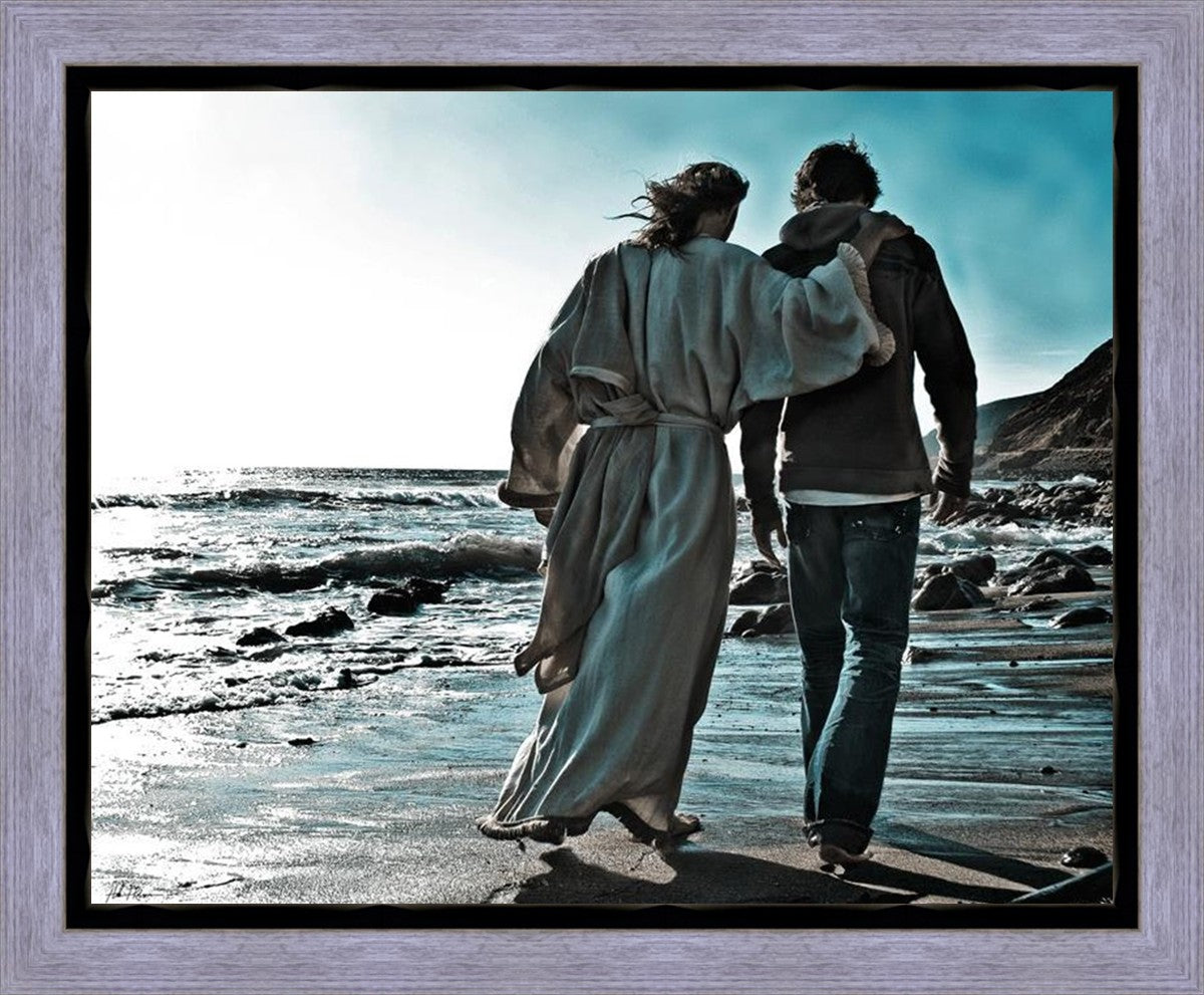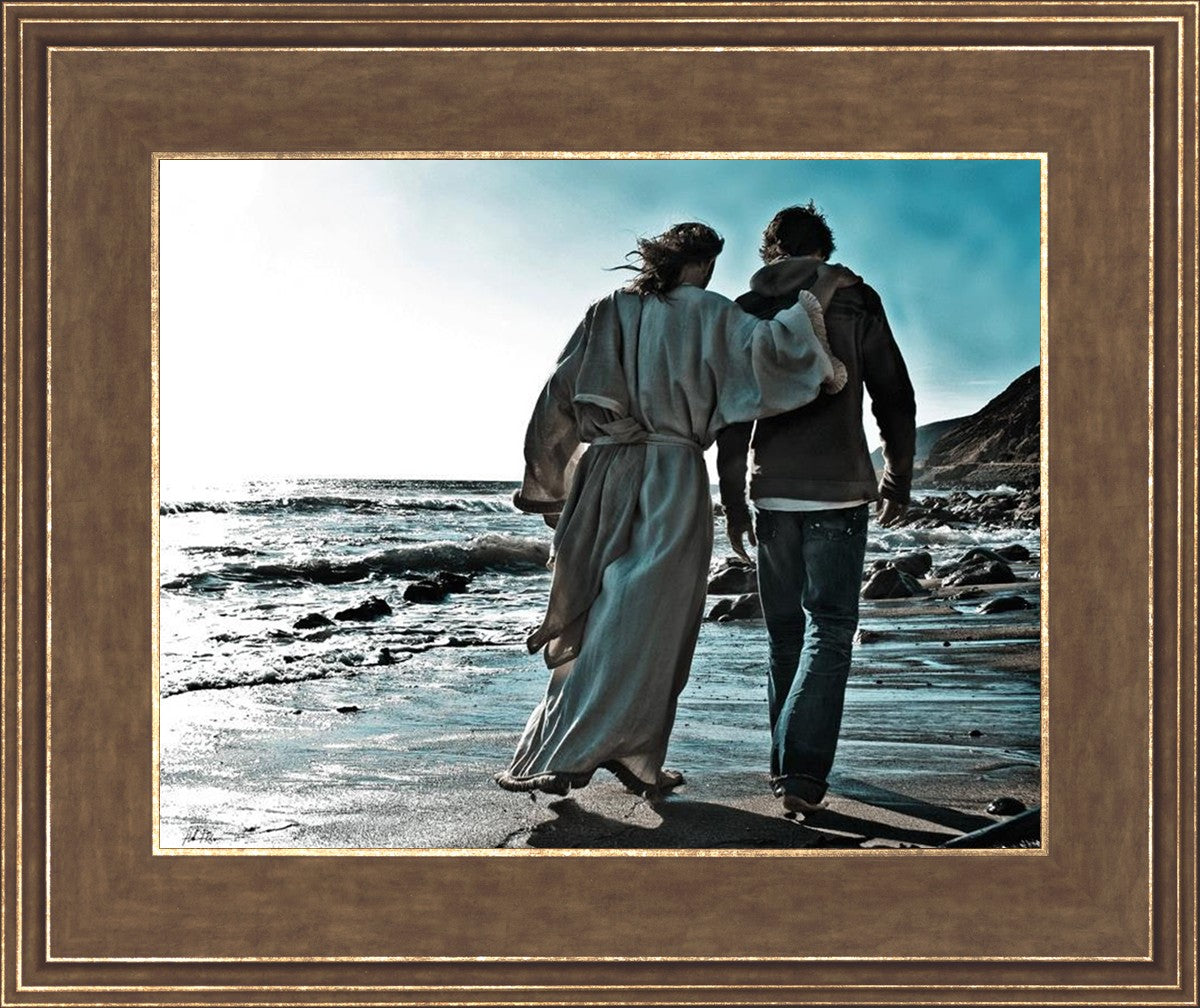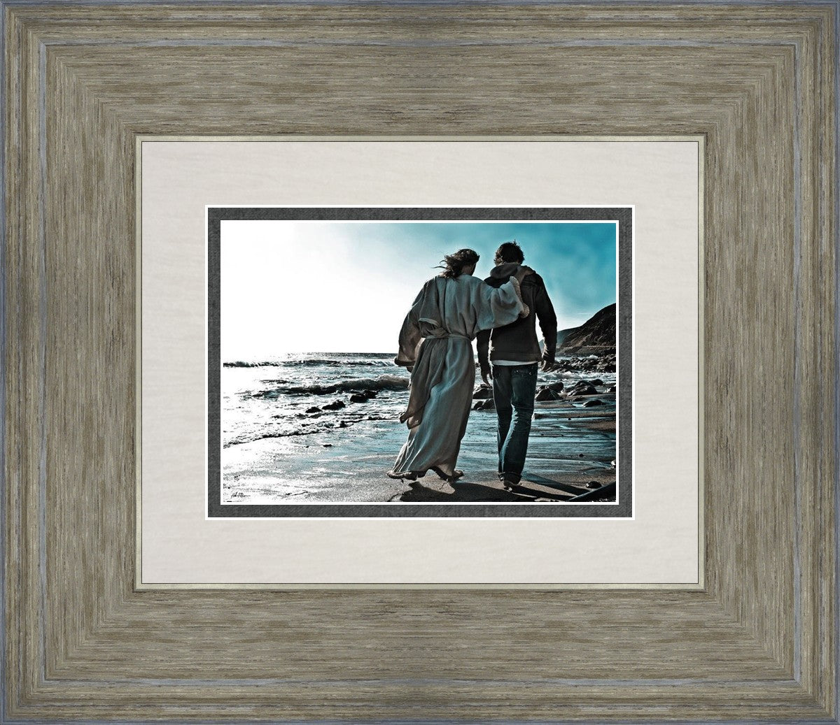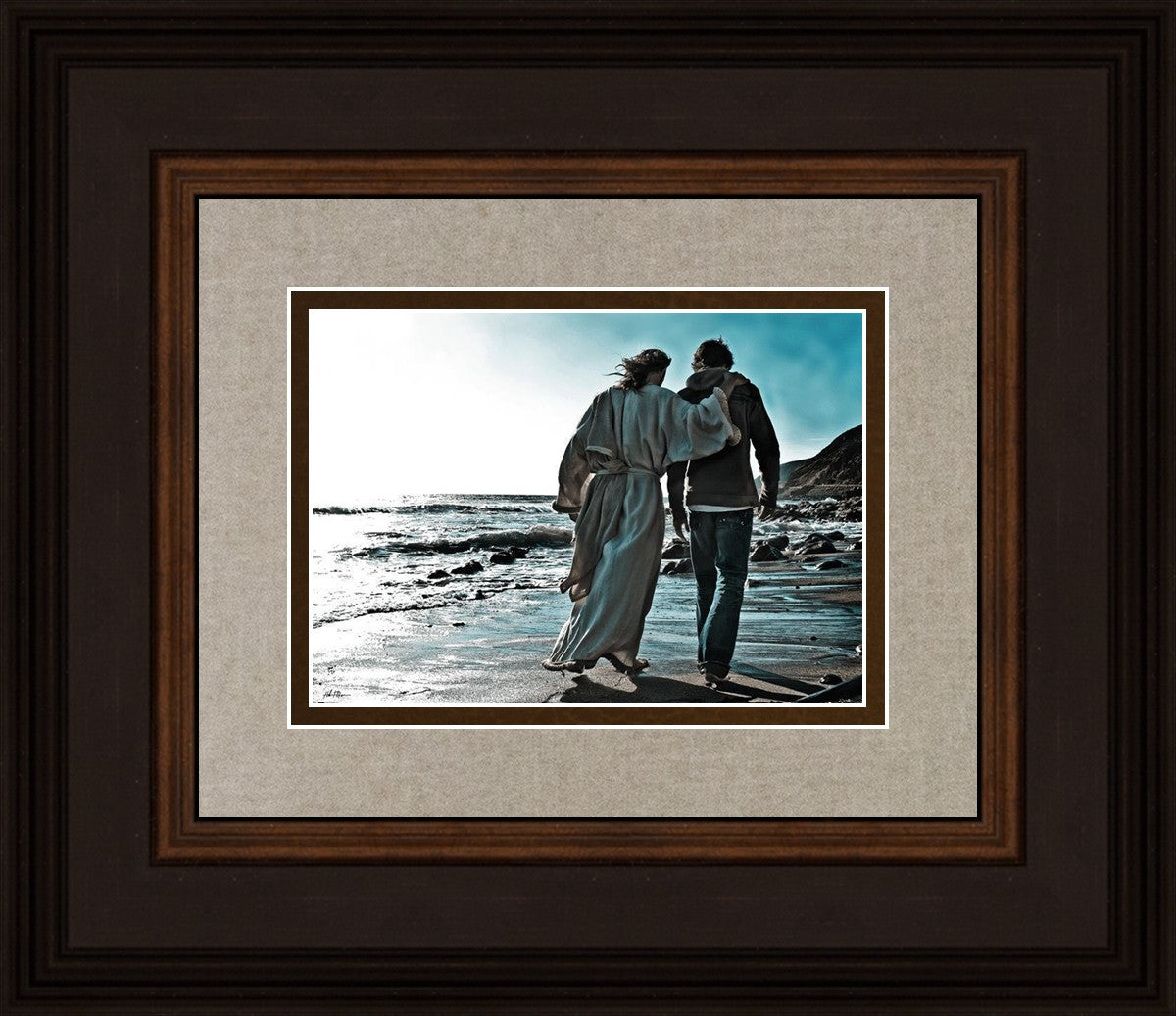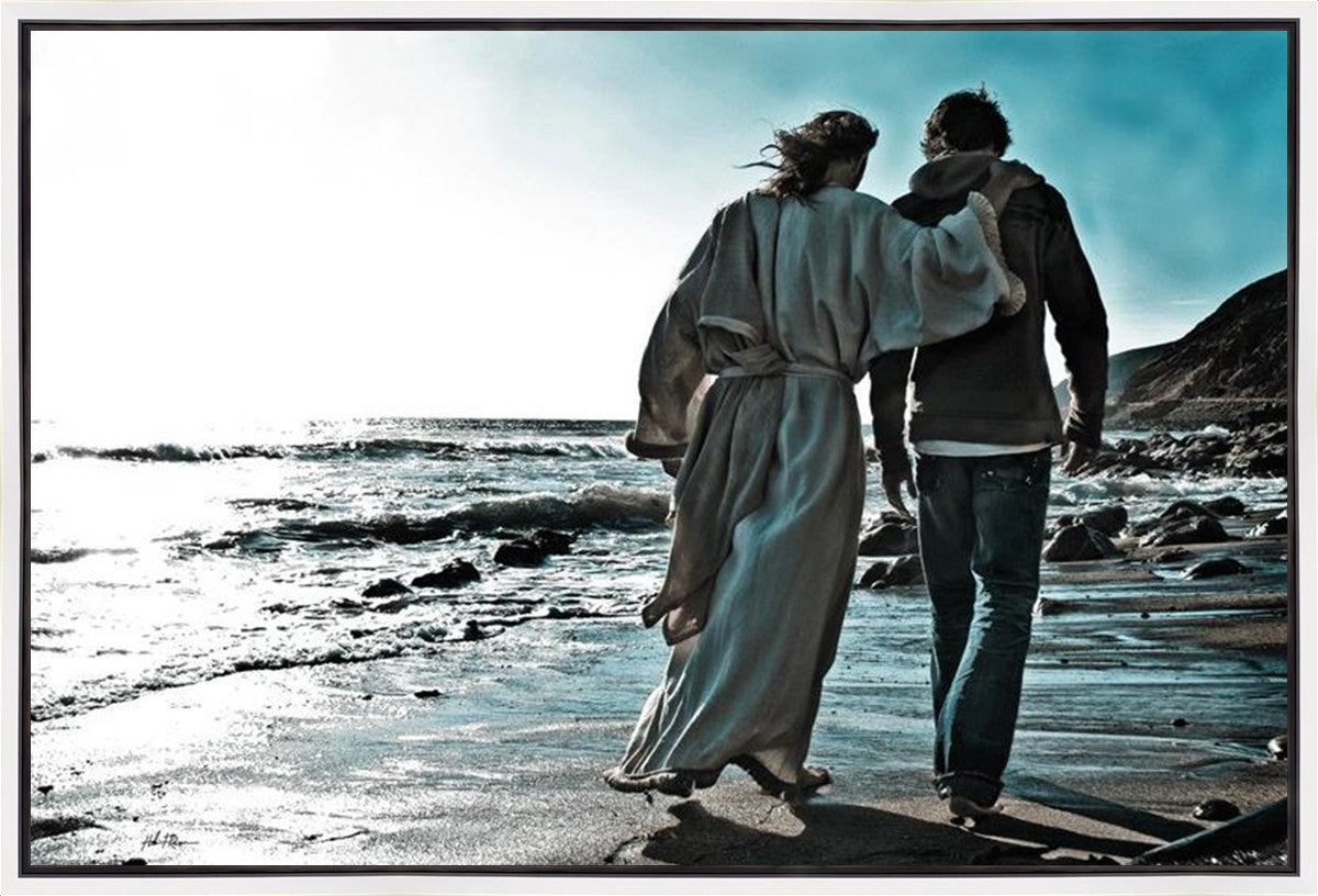 "My Friend" by Helen Thomas Robinson is a captivating photograph portraying Jesus Christ dressed in a robe, walking on the beach with his arm on the shoulder of a friend. This heartwarming image captures the essence of Jesus as our friend.