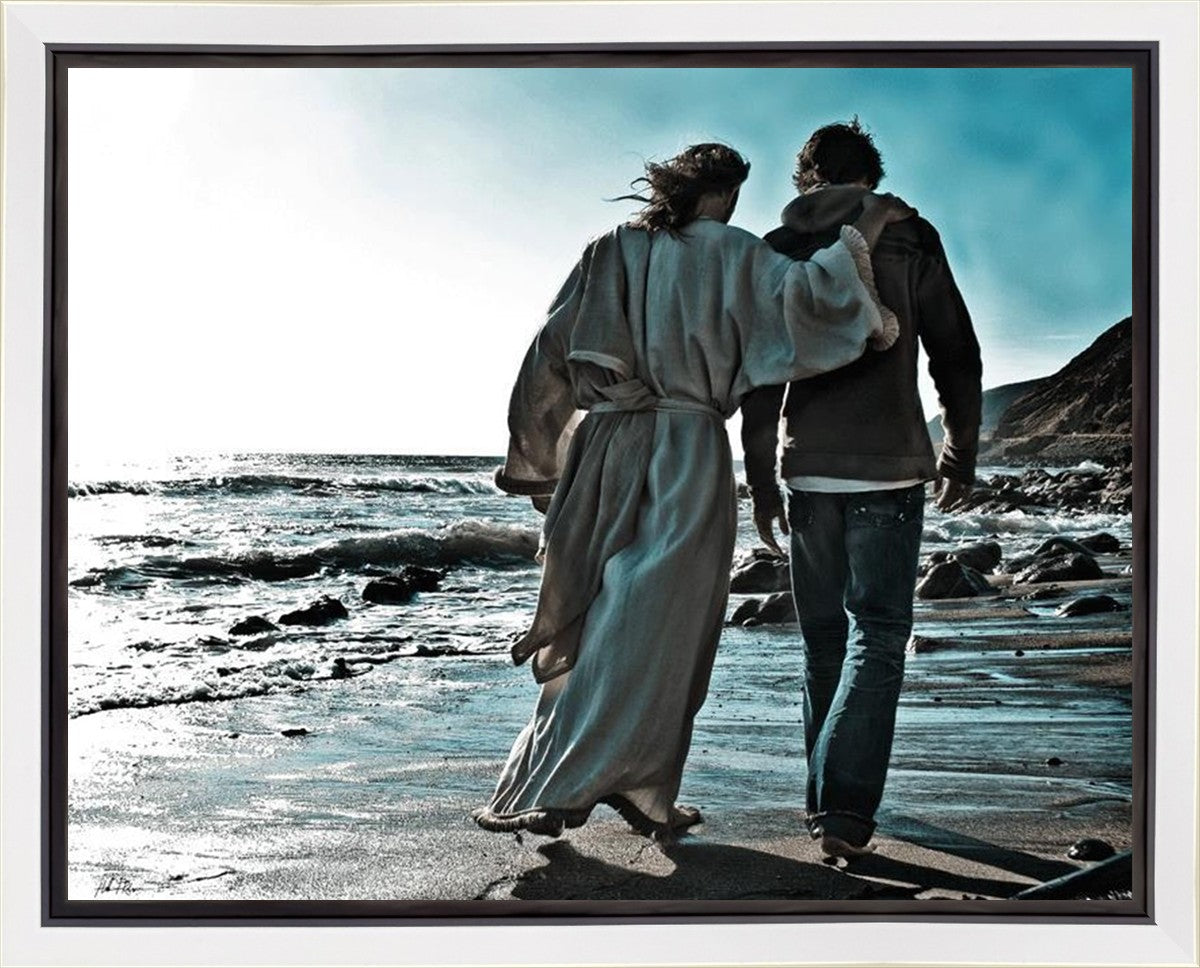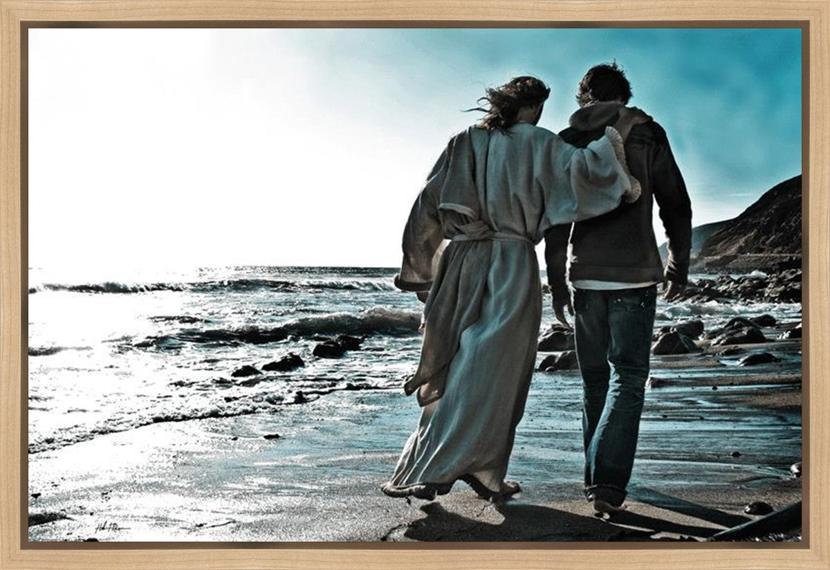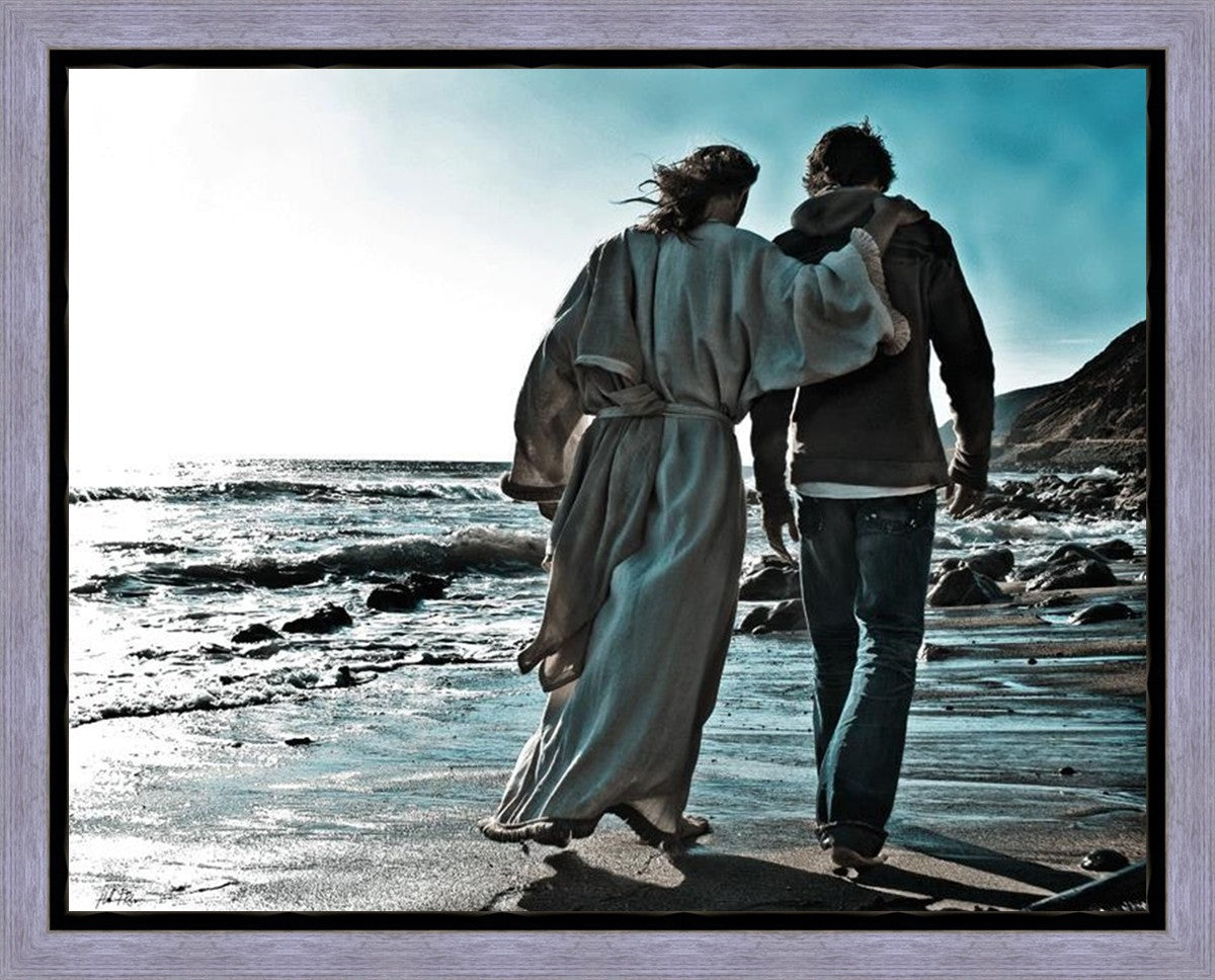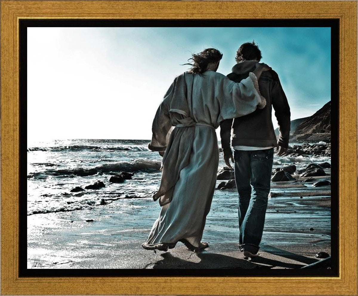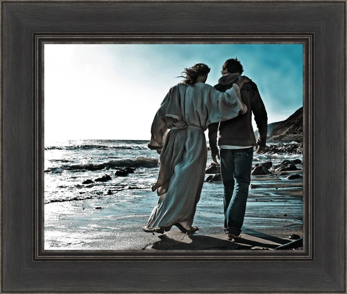 "My Friend" by Helen Thomas Robinson is a captivating photograph portraying Jesus Christ dressed in a robe, walking on the beach with his arm on the shoulder of a friend. This heartwarming image captures the essence of Jesus as our friend.