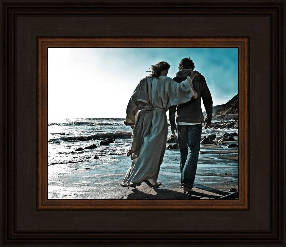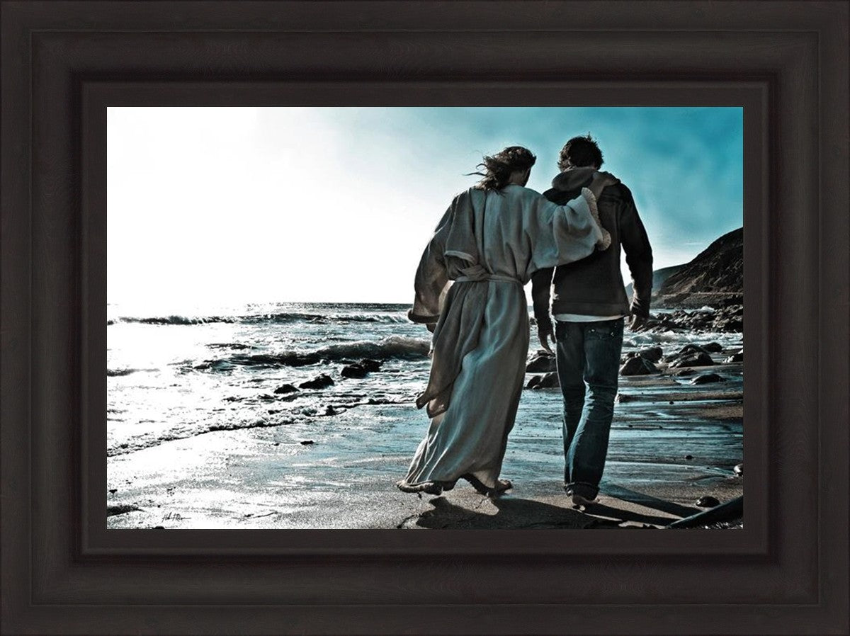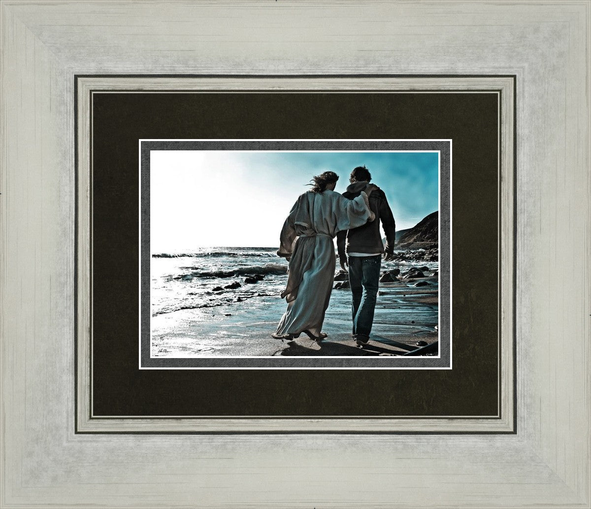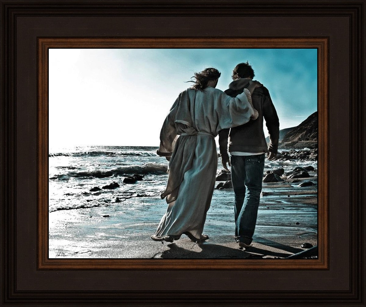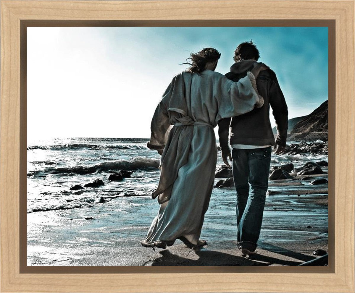 "My Friend" by Helen Thomas Robinson is a captivating photograph portraying Jesus Christ dressed in a robe, walking on the beach with his arm on the shoulder of a friend. This heartwarming image captures the essence of Jesus as our friend.