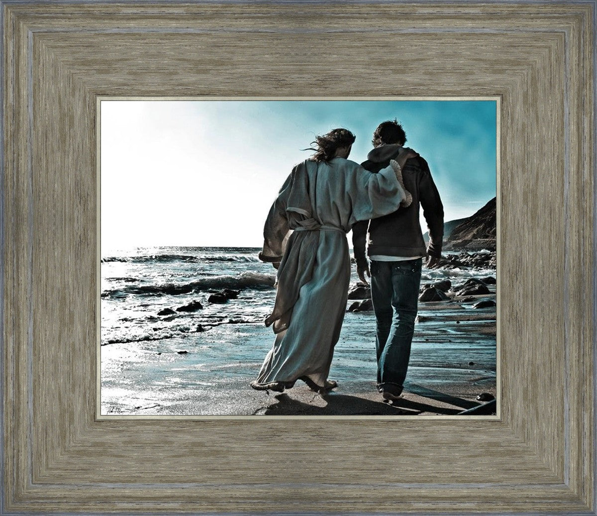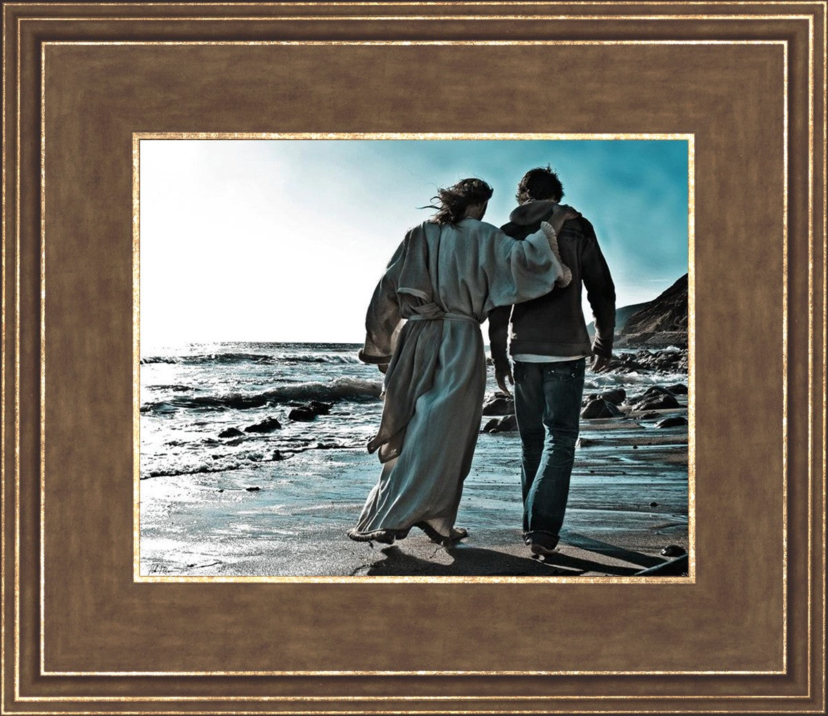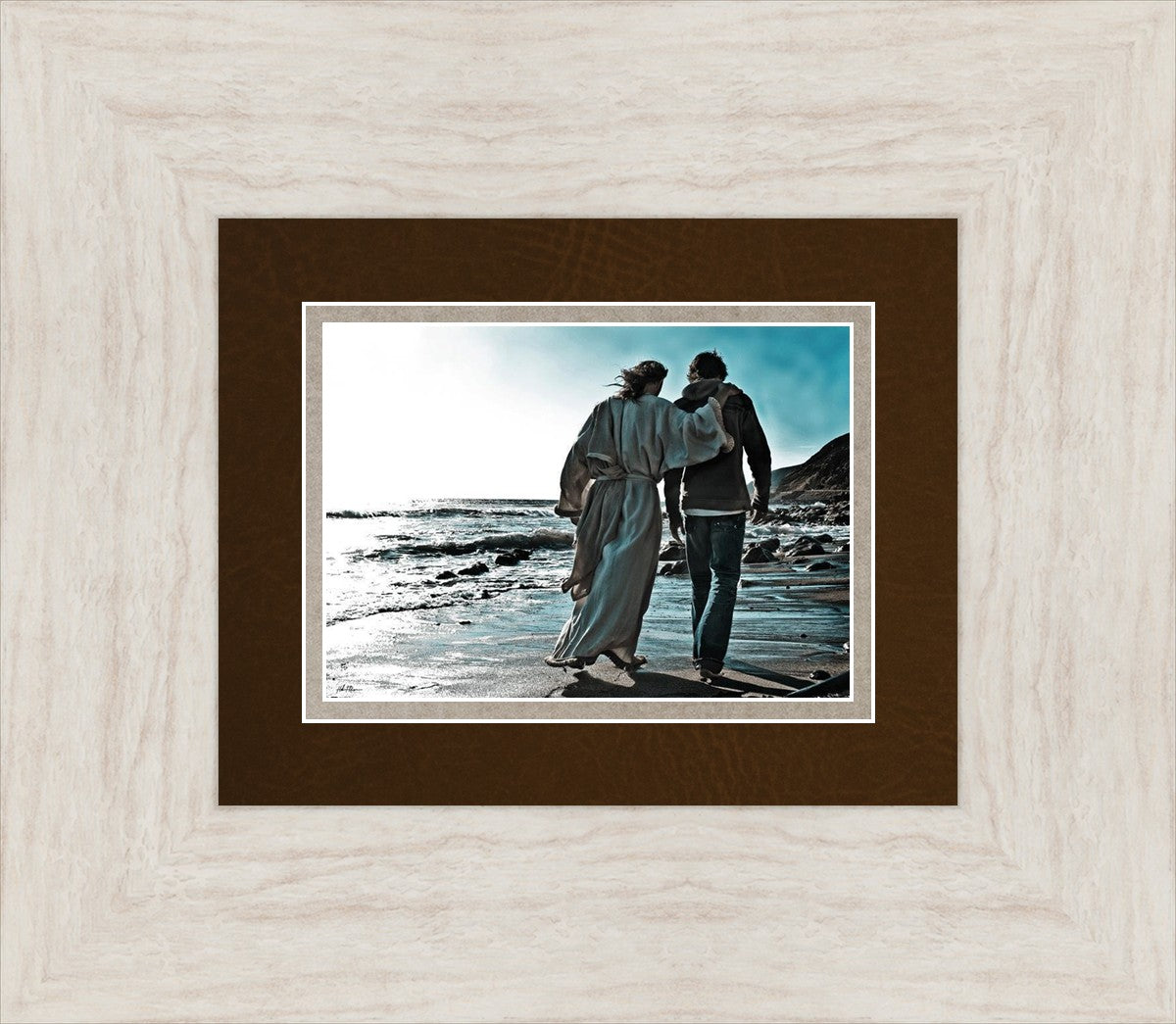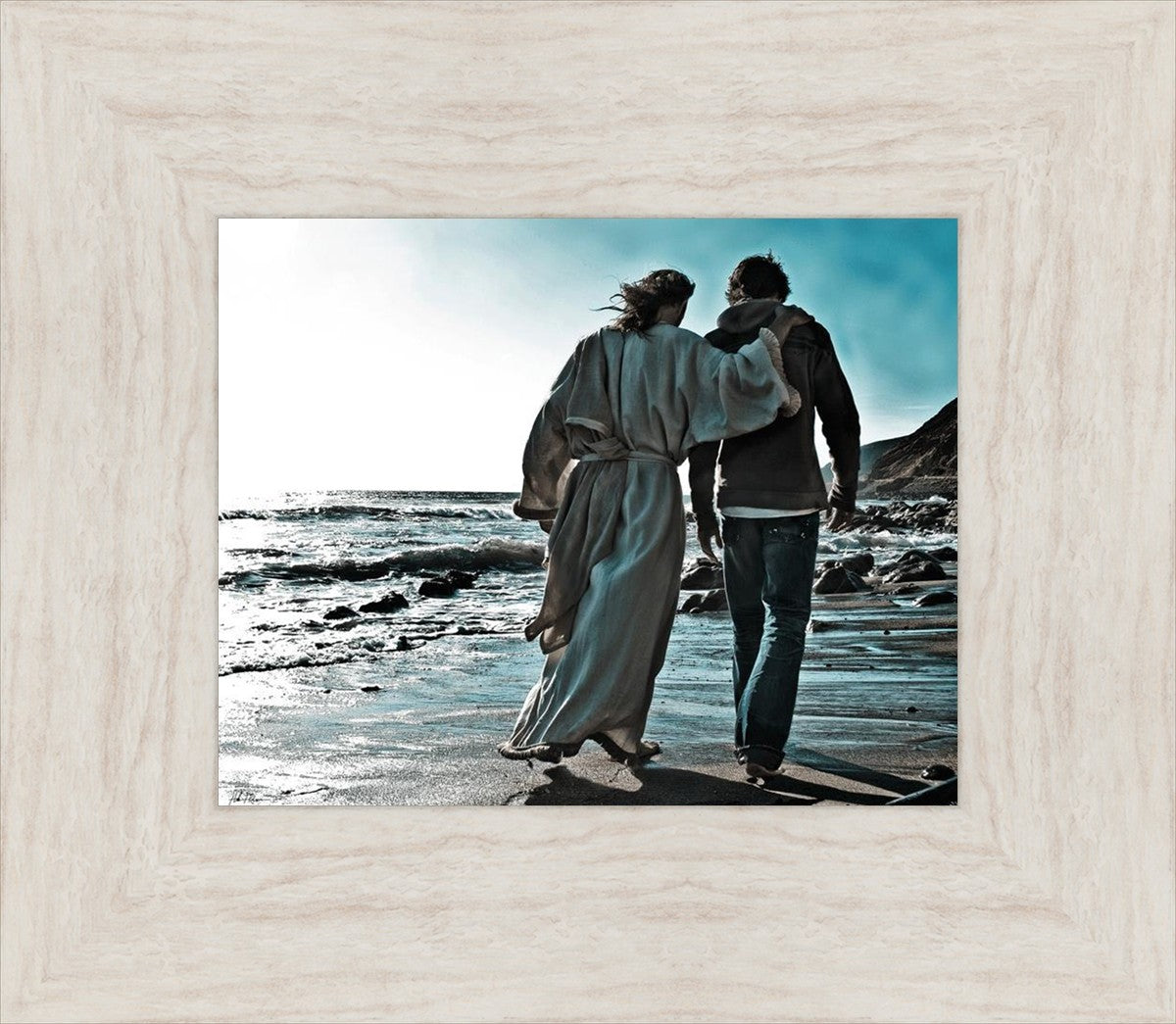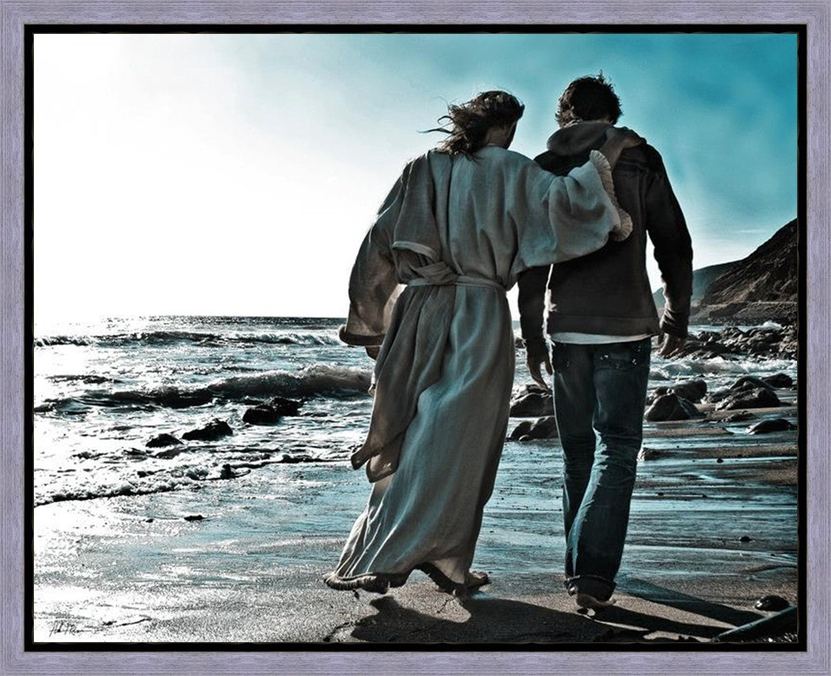 "My Friend" by Helen Thomas Robinson is a captivating photograph portraying Jesus Christ dressed in a robe, walking on the beach with his arm on the shoulder of a friend. This heartwarming image captures the essence of Jesus as our friend.
