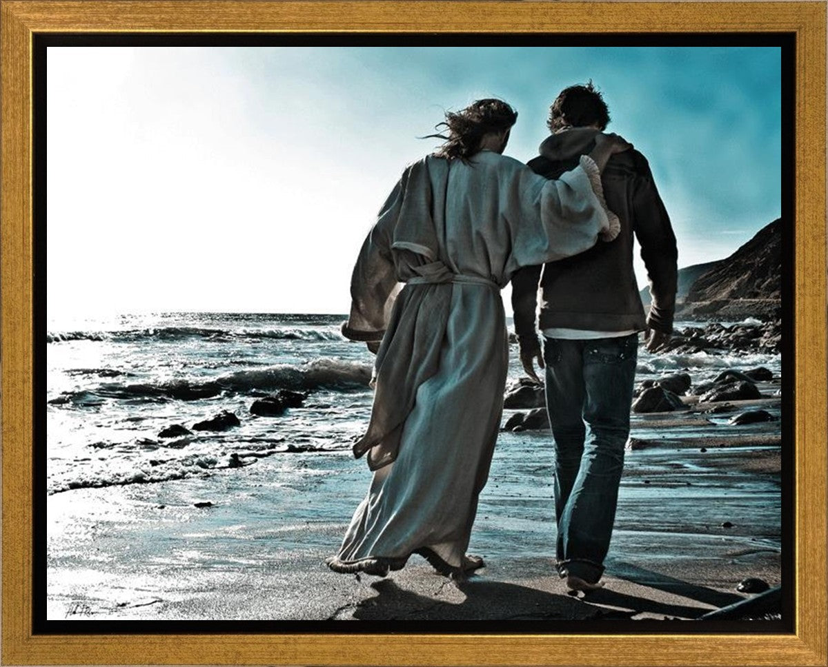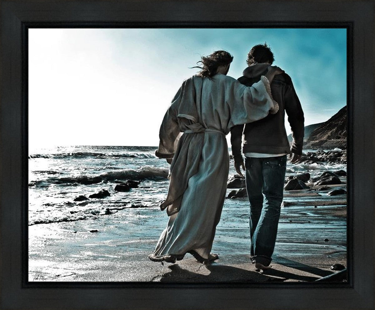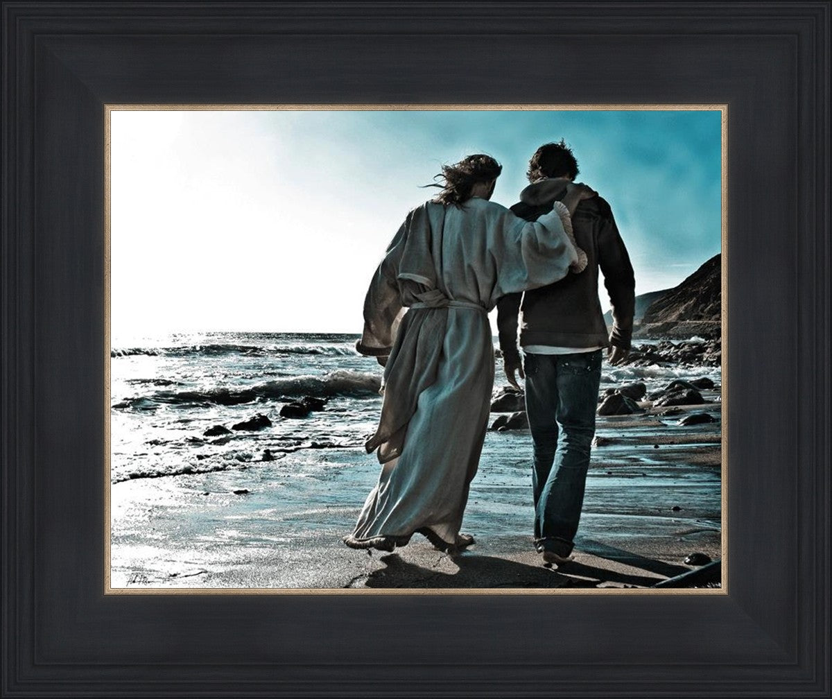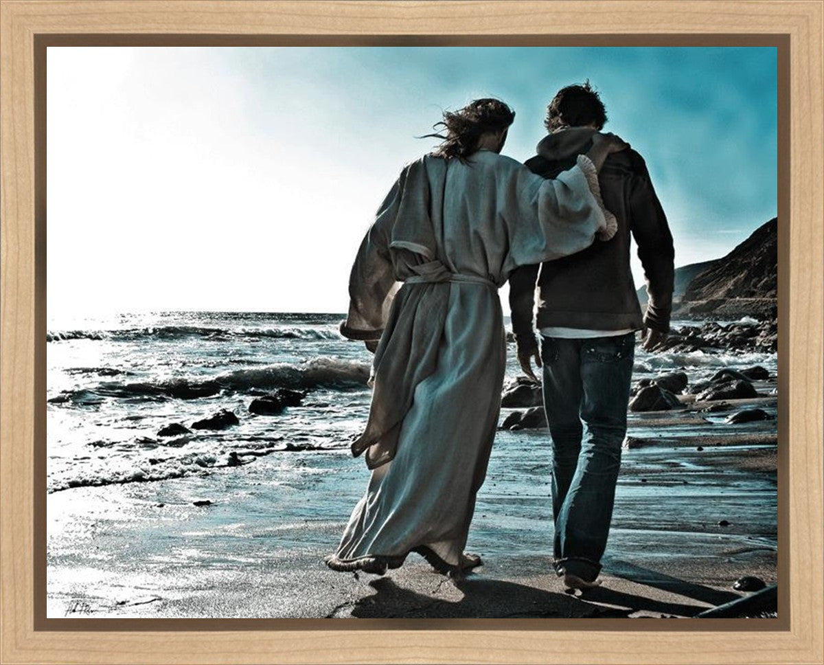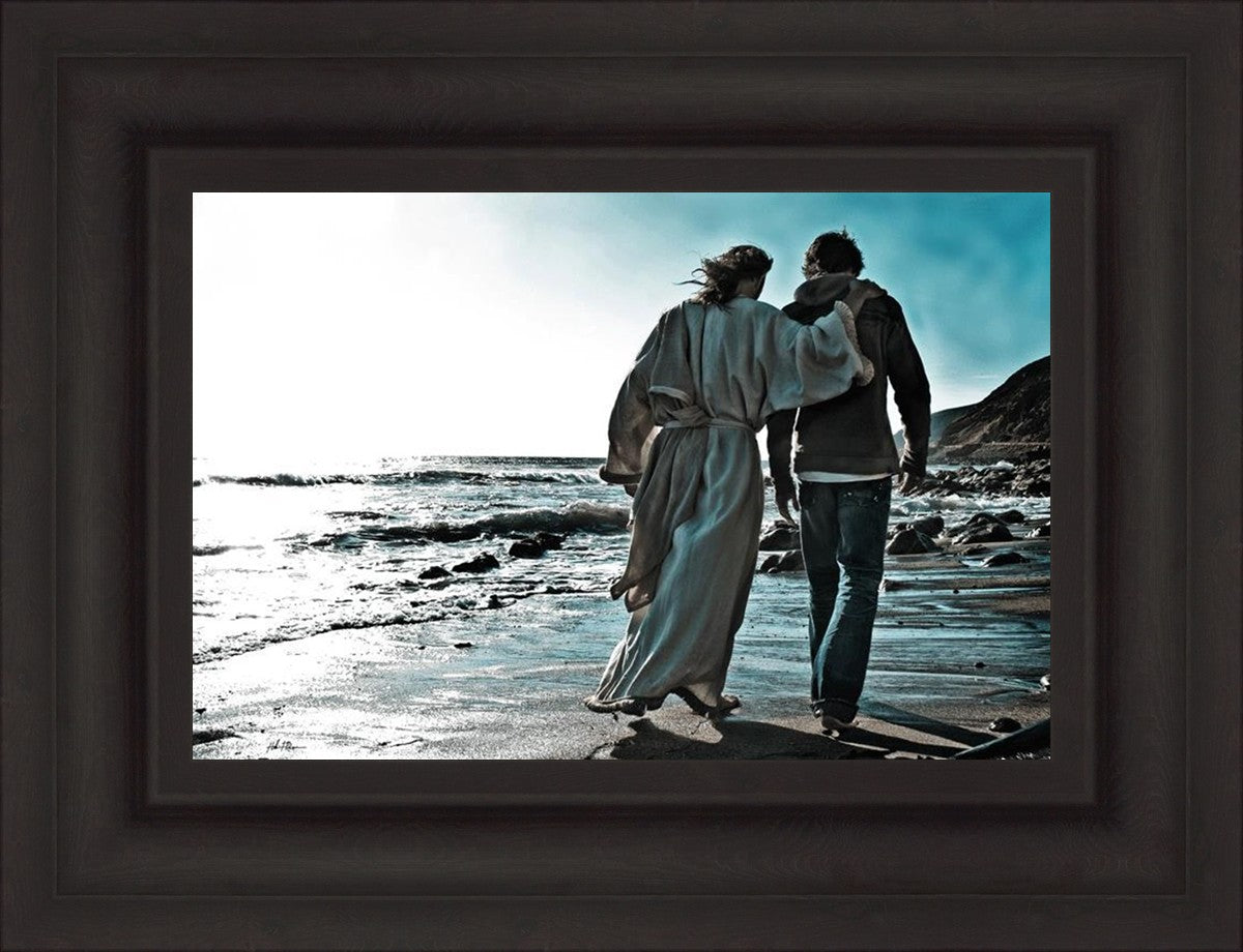 "My Friend" by Helen Thomas Robinson is a captivating photograph portraying Jesus Christ dressed in a robe, walking on the beach with his arm on the shoulder of a friend. This heartwarming image captures the essence of Jesus as our friend.